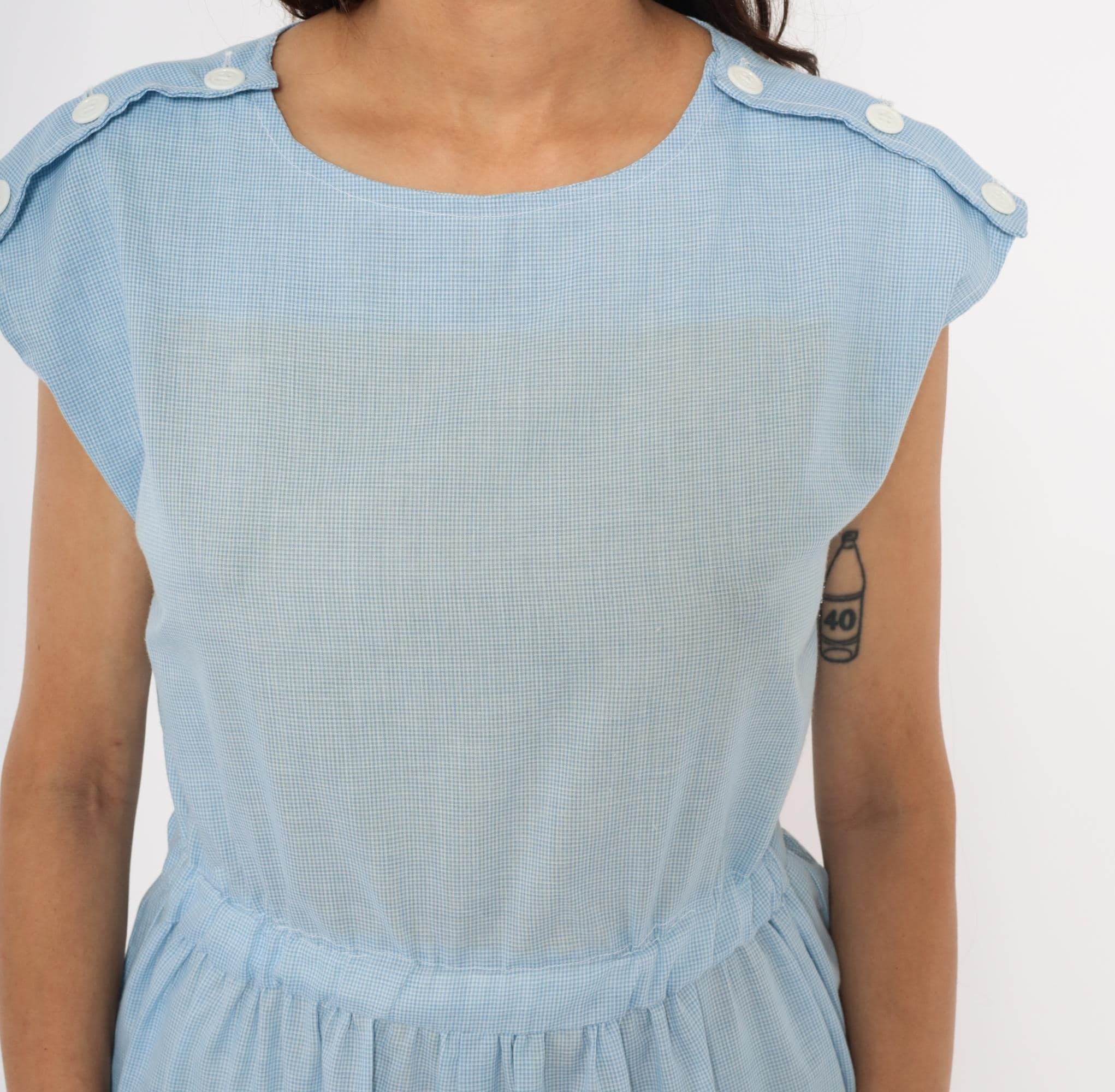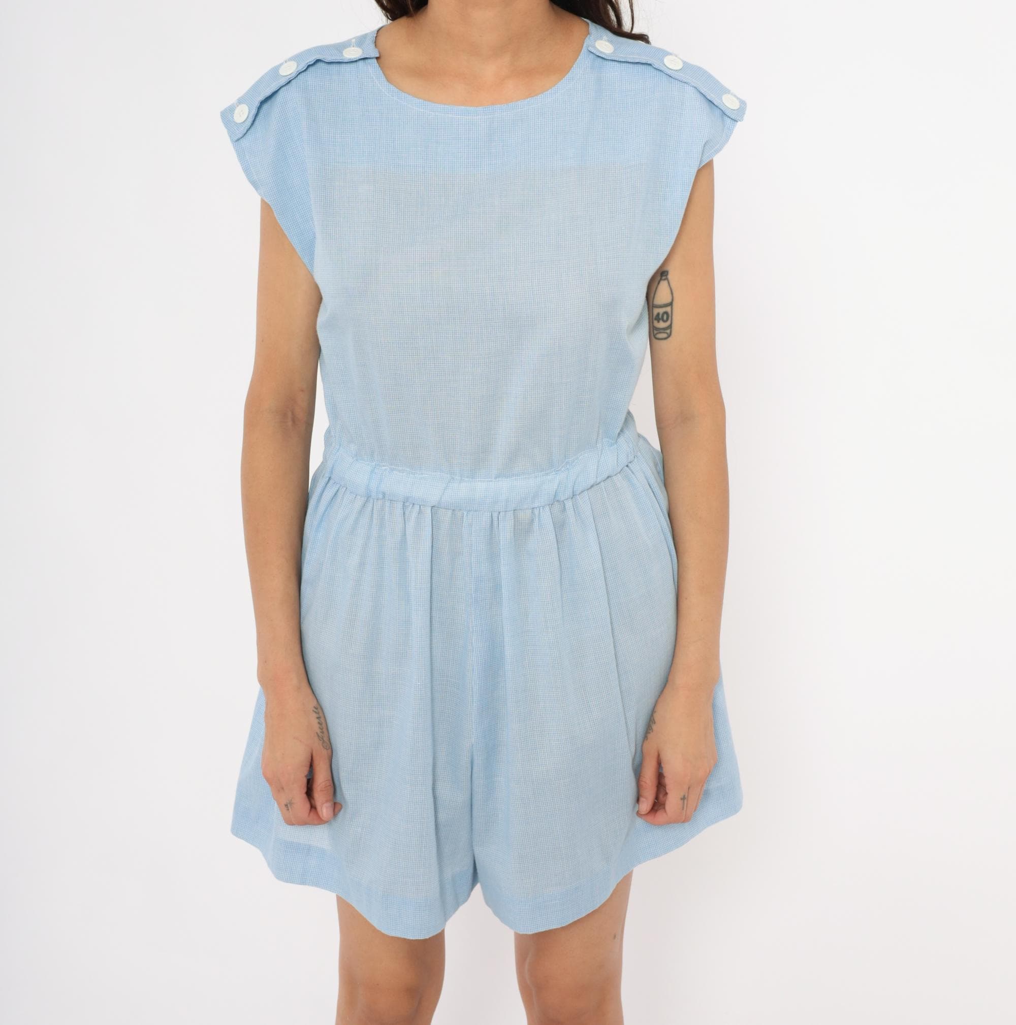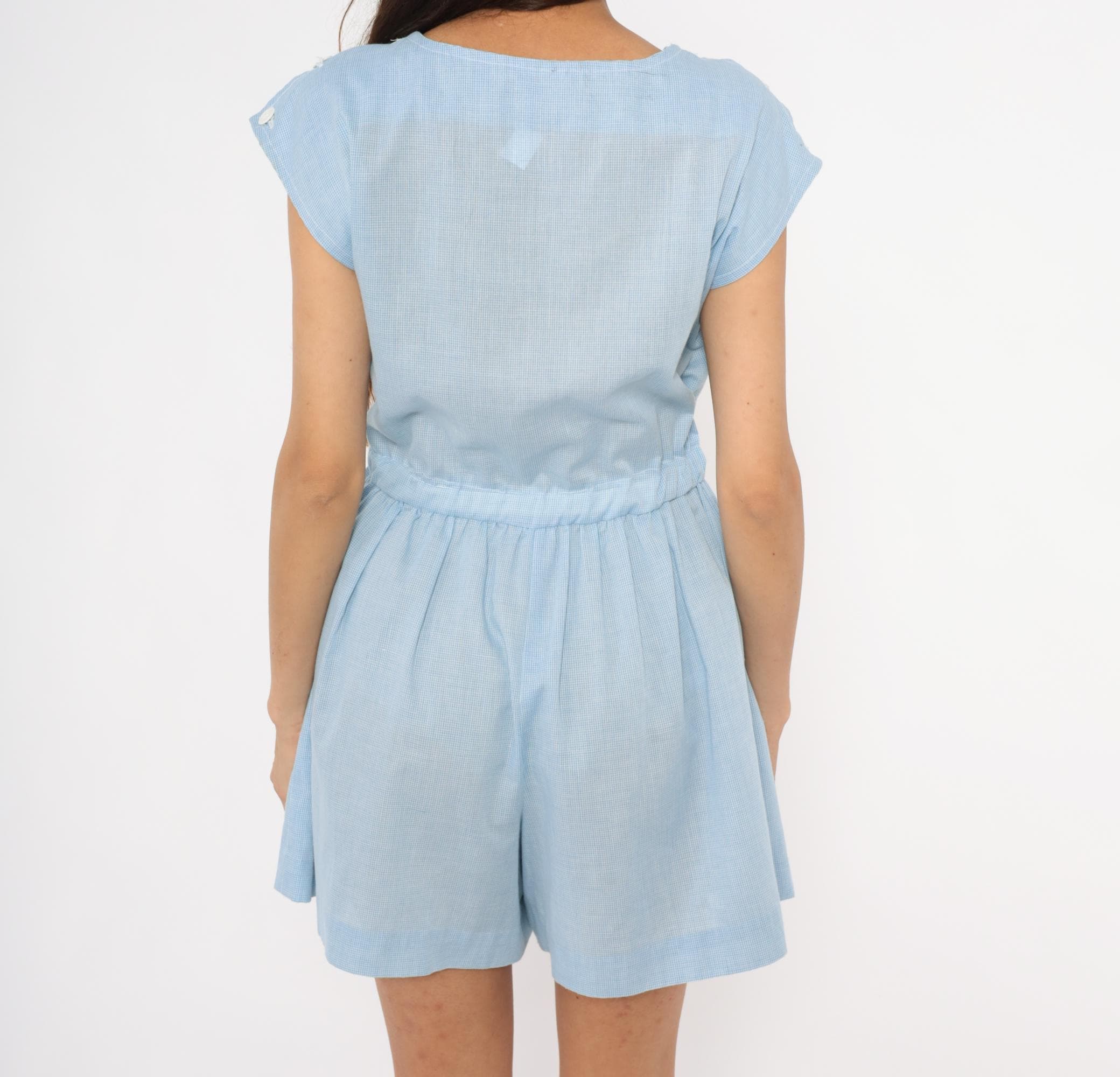 70s sky blue and white micro gingham romper with a scoop neckline and cap sleeves secured by white decorative buttons at each shoulder. Elastic gathered waist with wide-leg flared shorts and a one-piece construction. The fabric has a fine checkered pattern visible up close, with a pullover entry and the shoulder button detail on both sides.