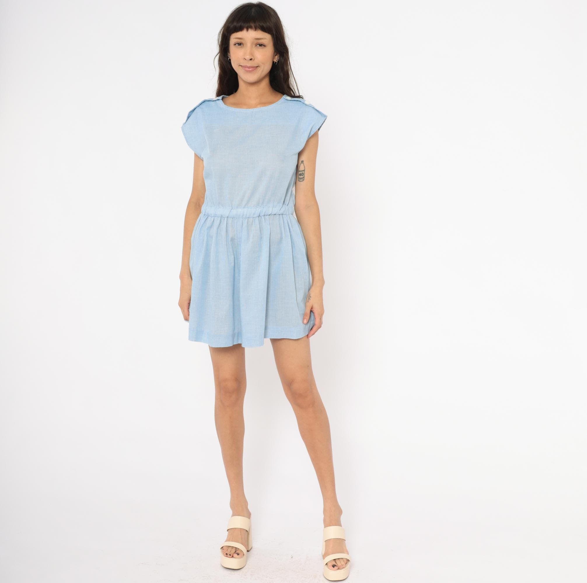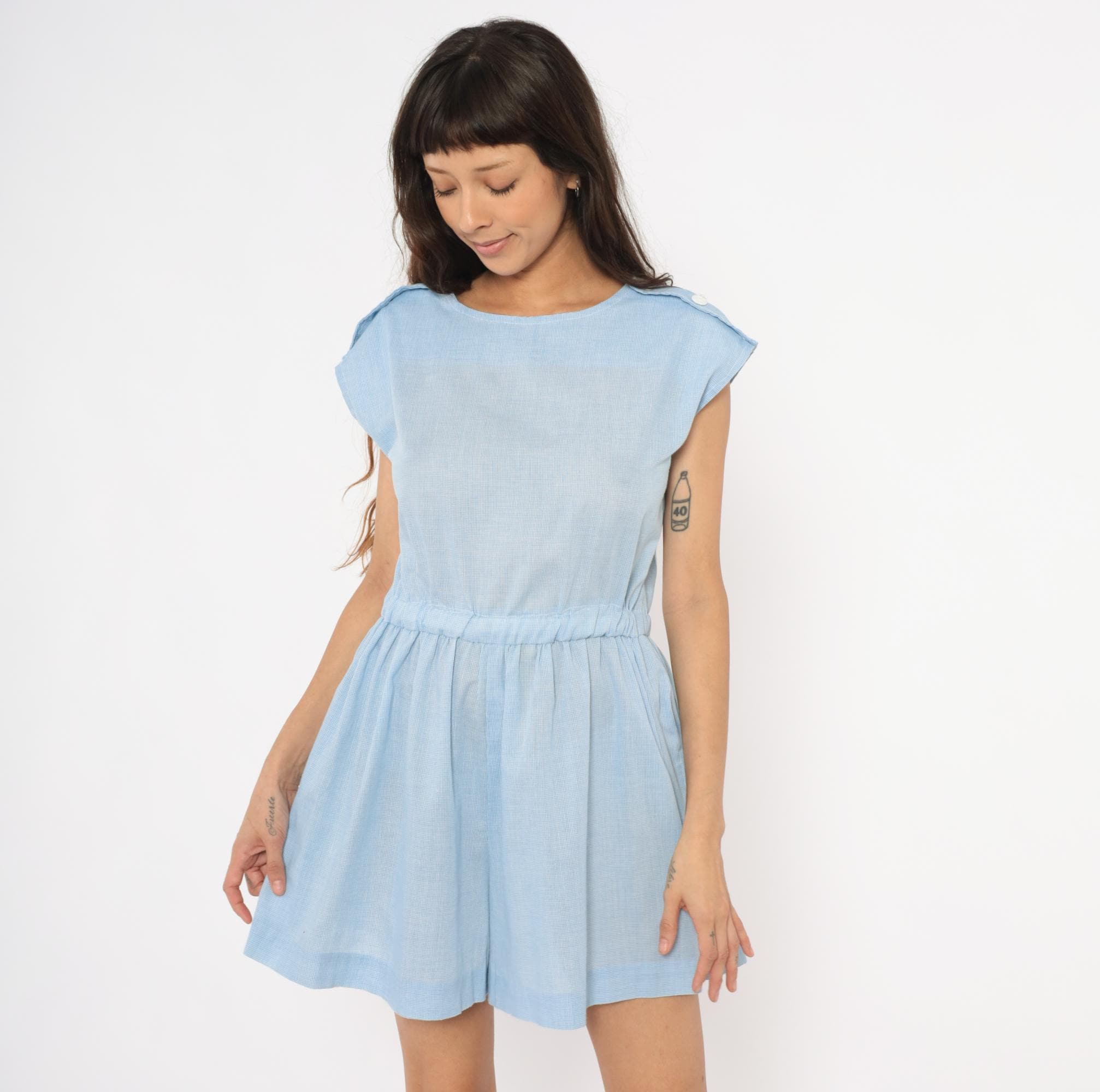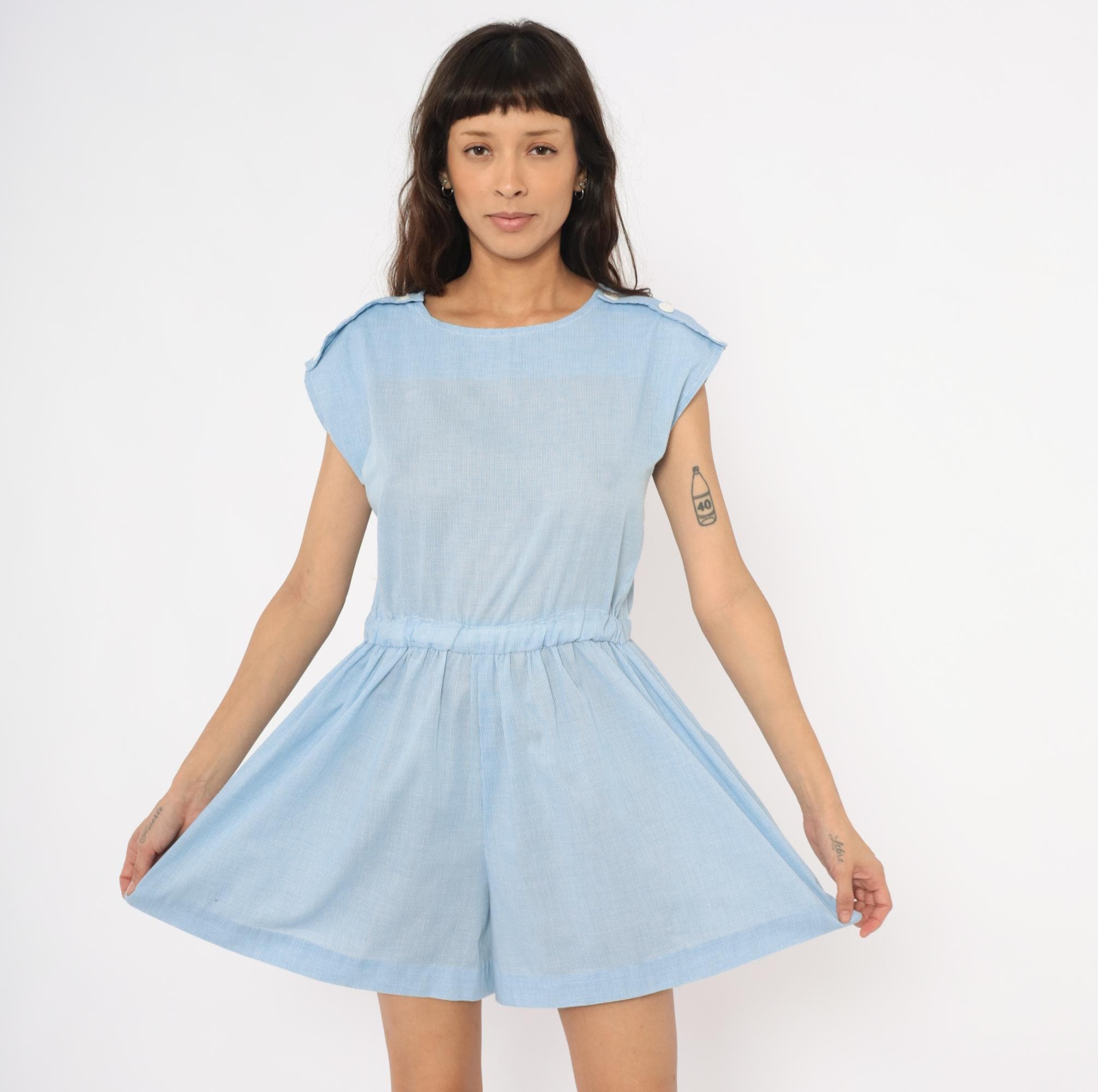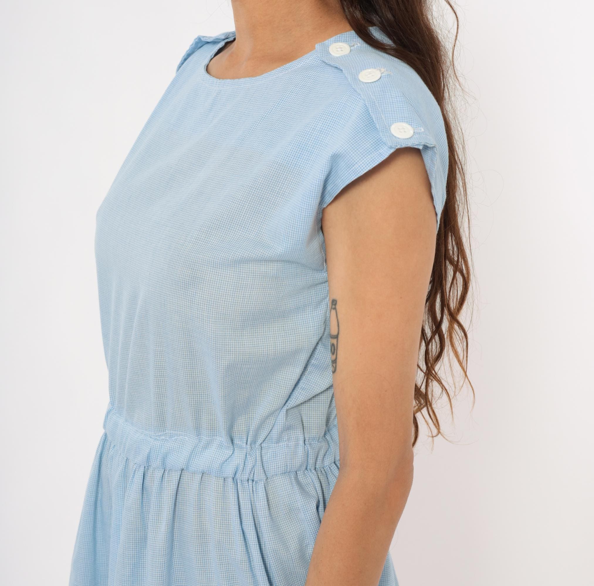 70s sky blue and white micro gingham romper with a scoop neckline and cap sleeves secured by white decorative buttons at each shoulder. Elastic gathered waist with wide-leg flared shorts and a one-piece construction. The fabric has a fine checkered pattern visible up close, with a pullover entry and the shoulder button detail on both sides.