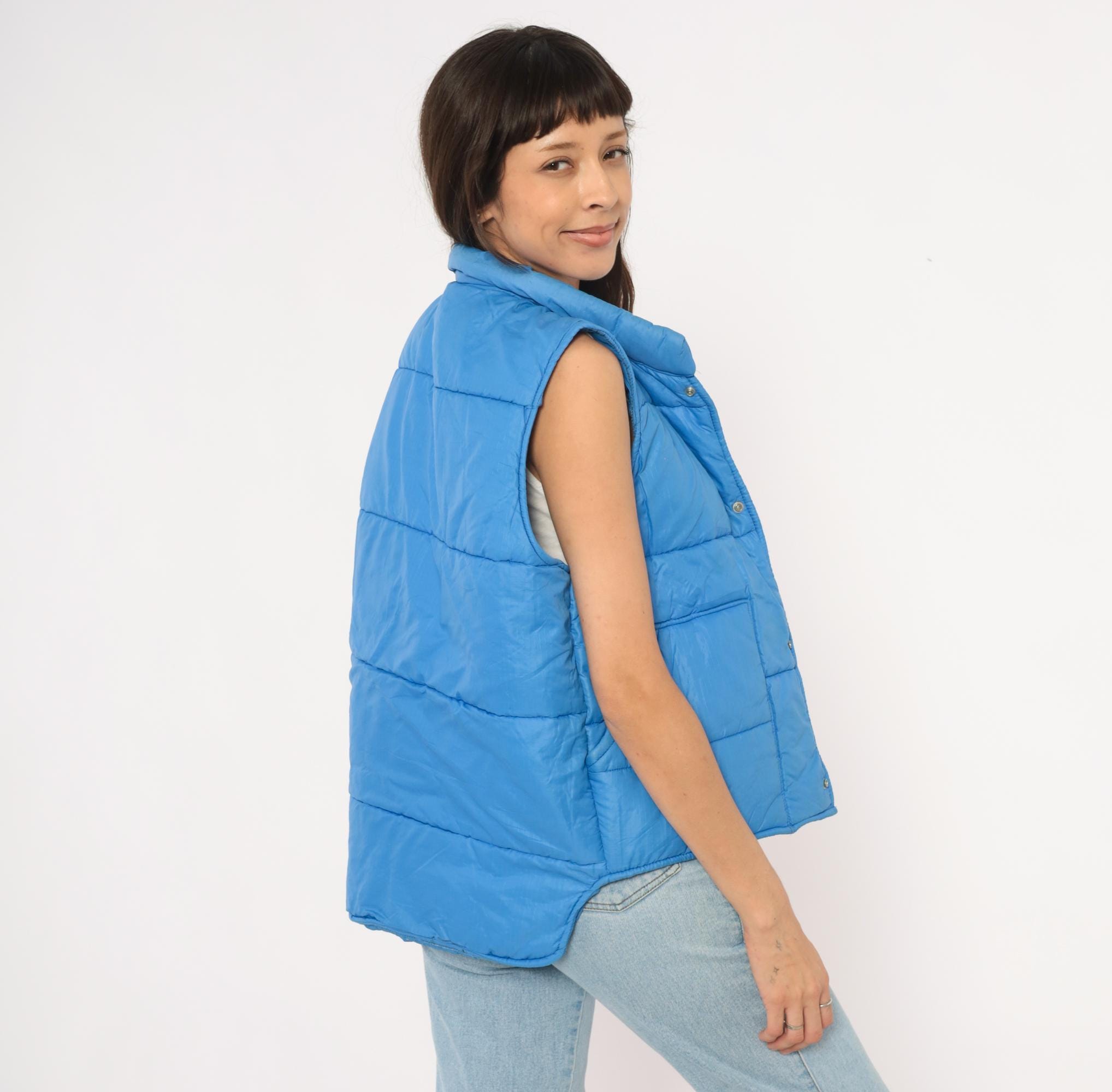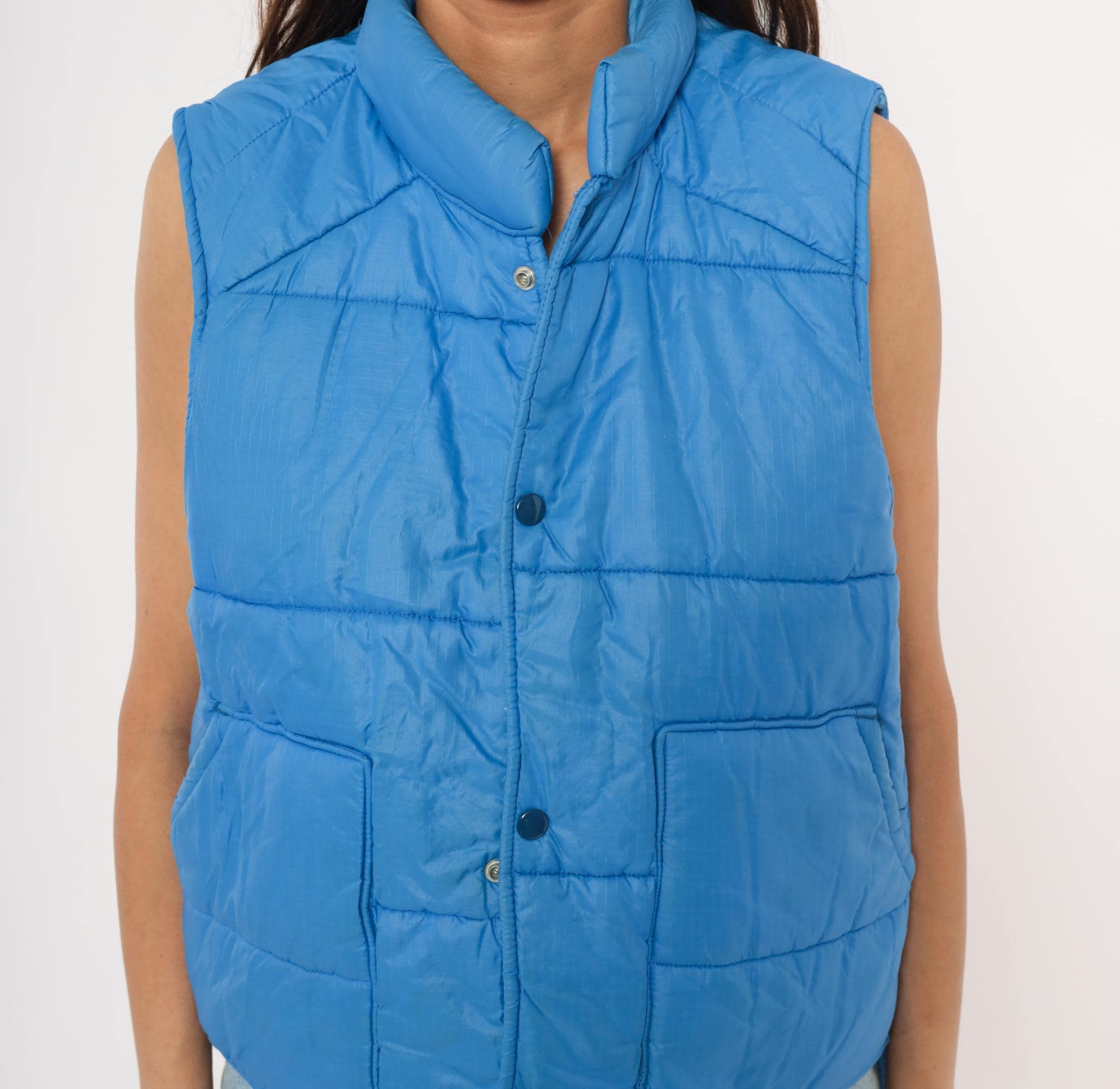 80s cobalt blue puffer vest from Sir Jac with snap button front closure and fold-down pointed collar. Horizontal quilted baffles across the body, two open waist pockets, and sleeveless cut with wide armholes. Royal blue shell with matching snap closures throughout.
