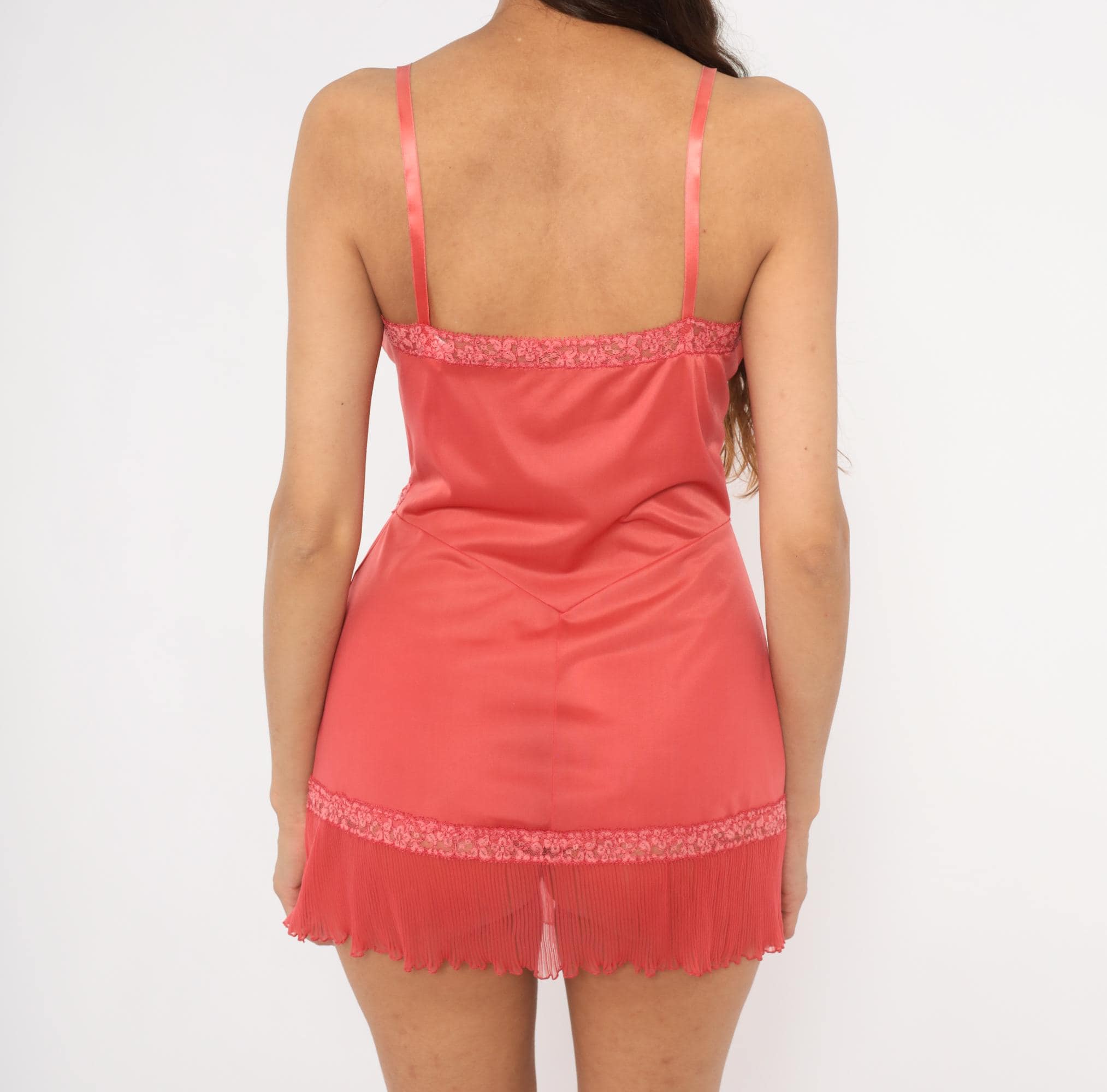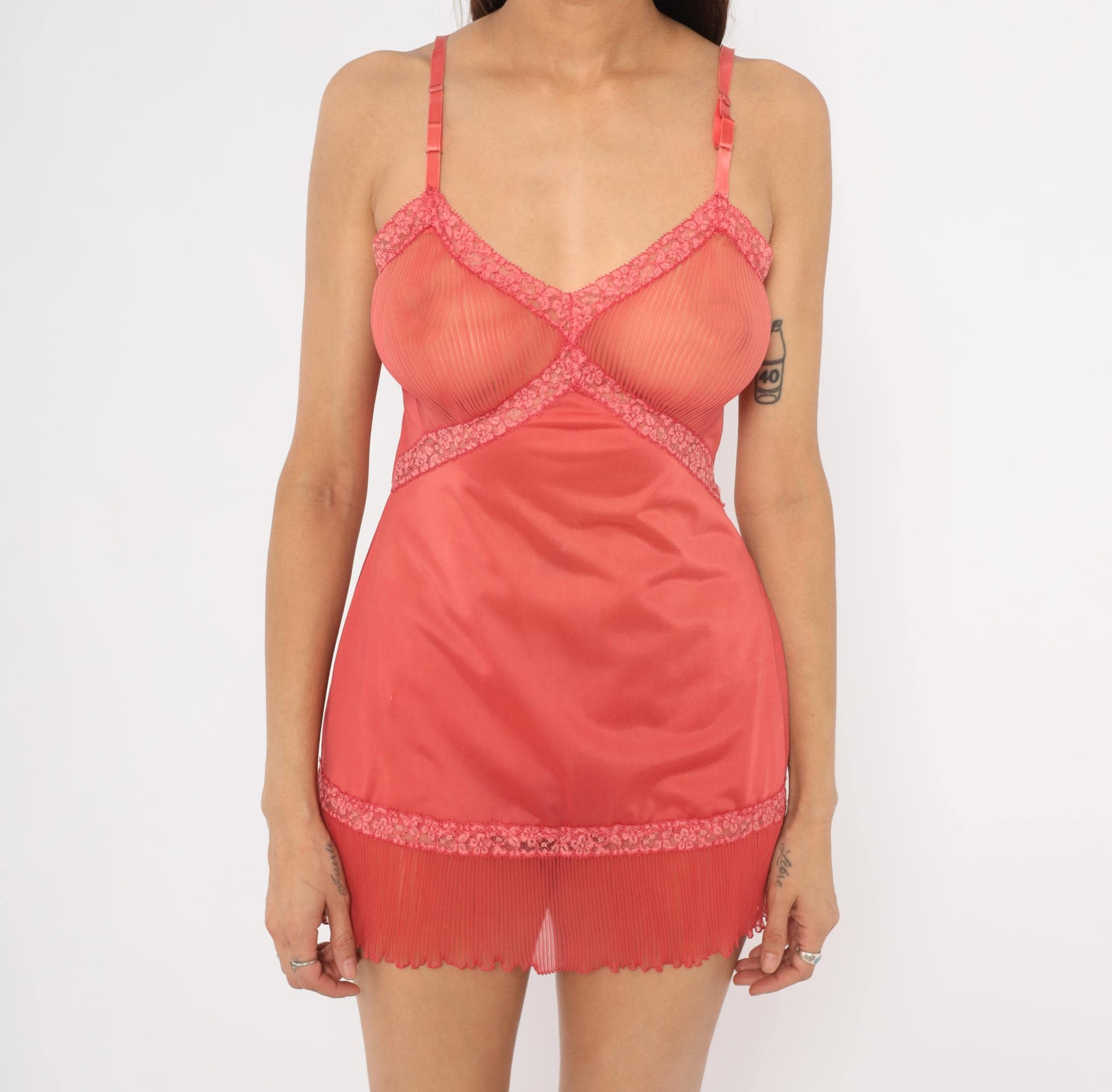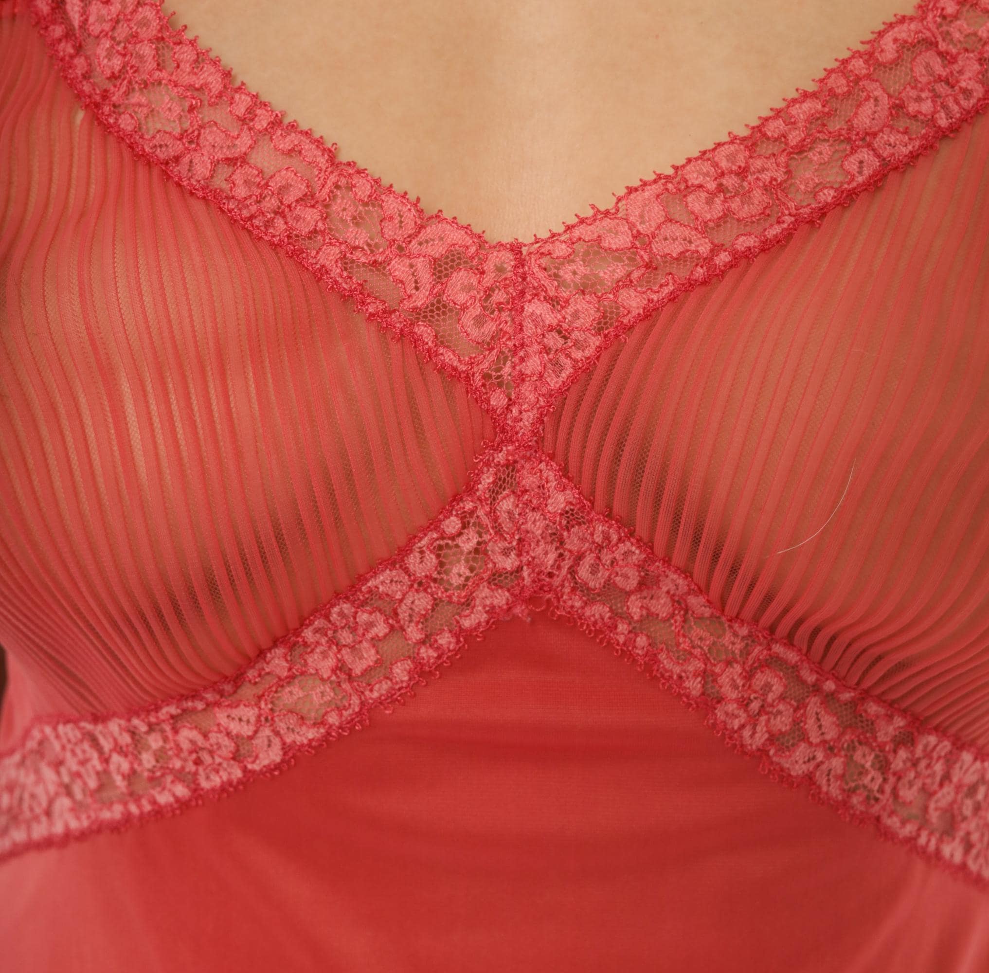 70s coral slip from Vanity Fair with sheer pleated mesh bust panels framed by floral lace trim in a crossover design. Satin spaghetti straps with adjustable hardware, smooth opaque body, and a pleated chiffon hem with lettuce edge. Lace accents run diagonally from the bust through the waist and along the hemline.