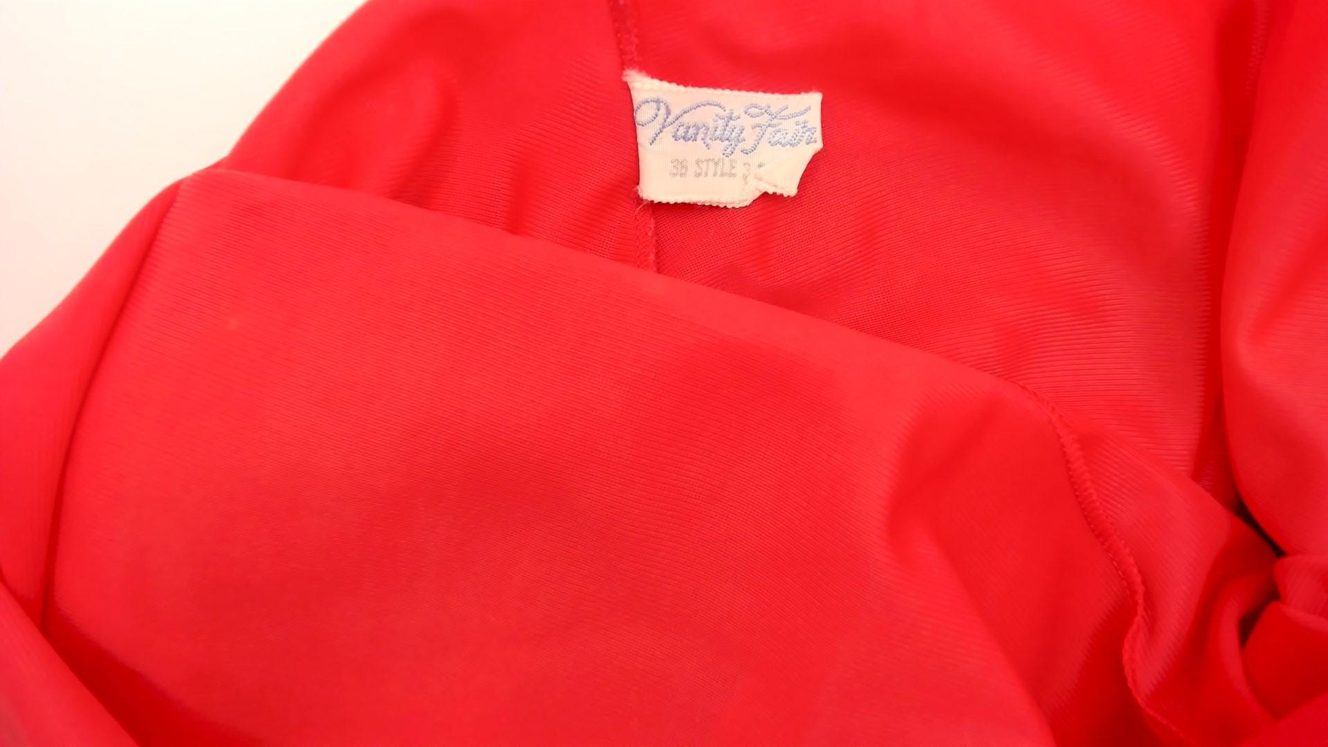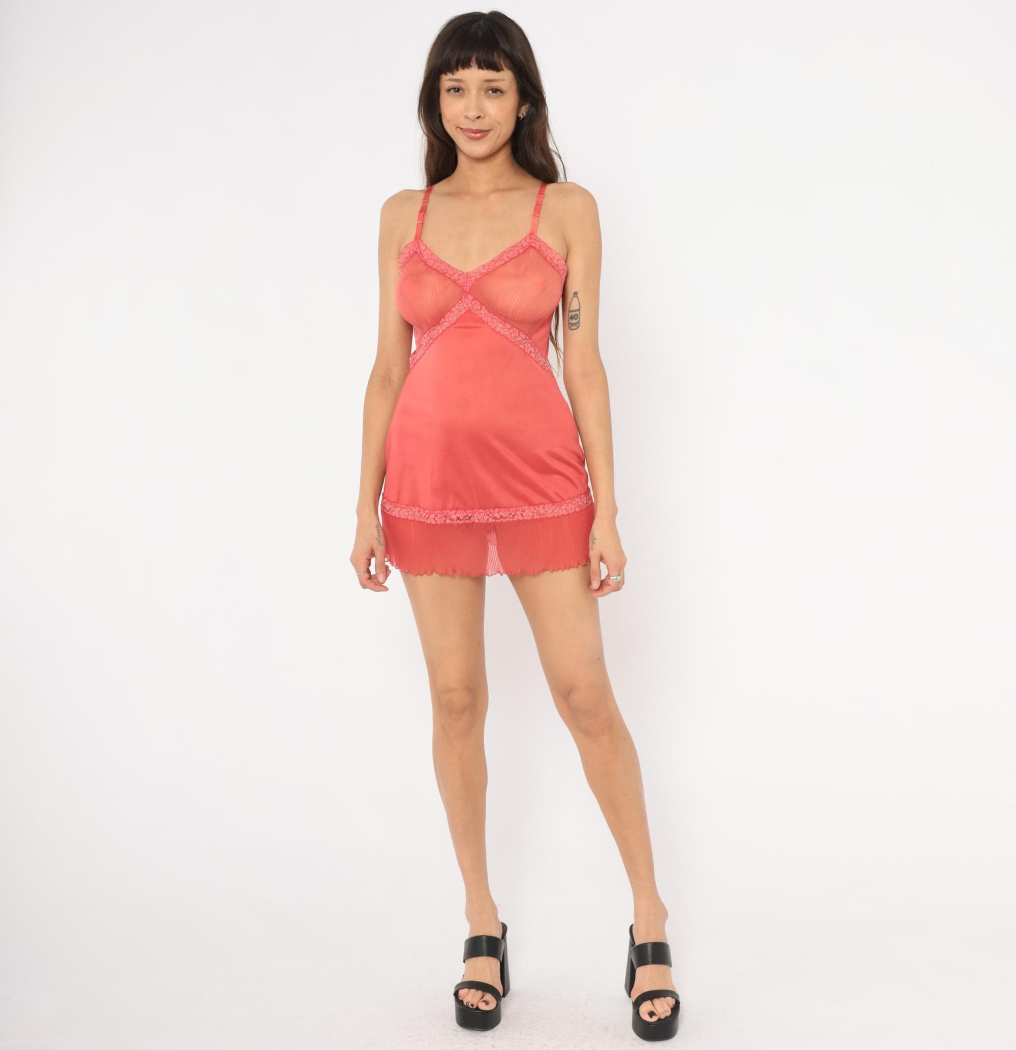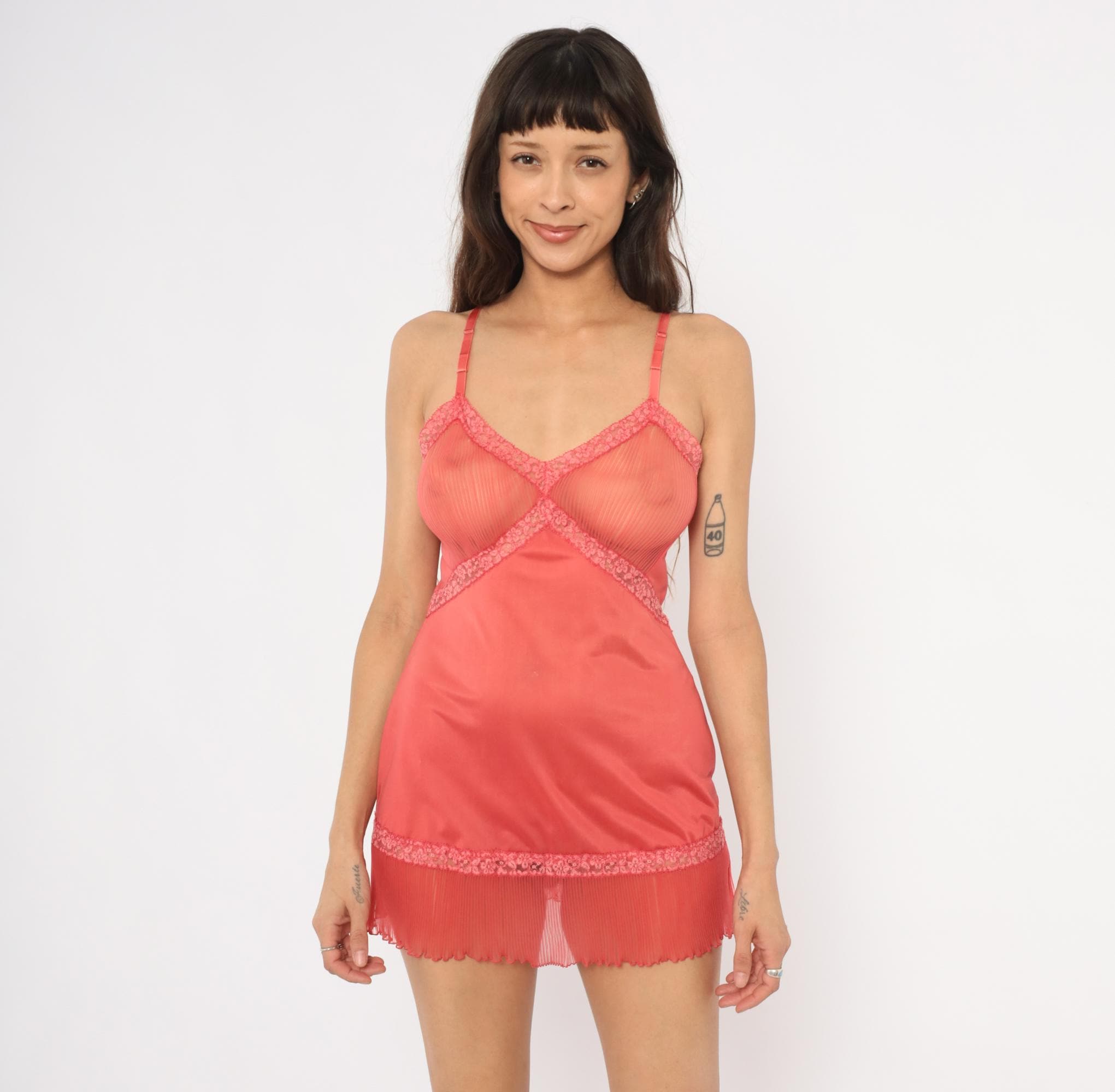 70s coral slip from Vanity Fair with sheer pleated mesh bust panels framed by floral lace trim in a crossover design. Satin spaghetti straps with adjustable hardware, smooth opaque body, and a pleated chiffon hem with lettuce edge. Lace accents run diagonally from the bust through the waist and along the hemline.