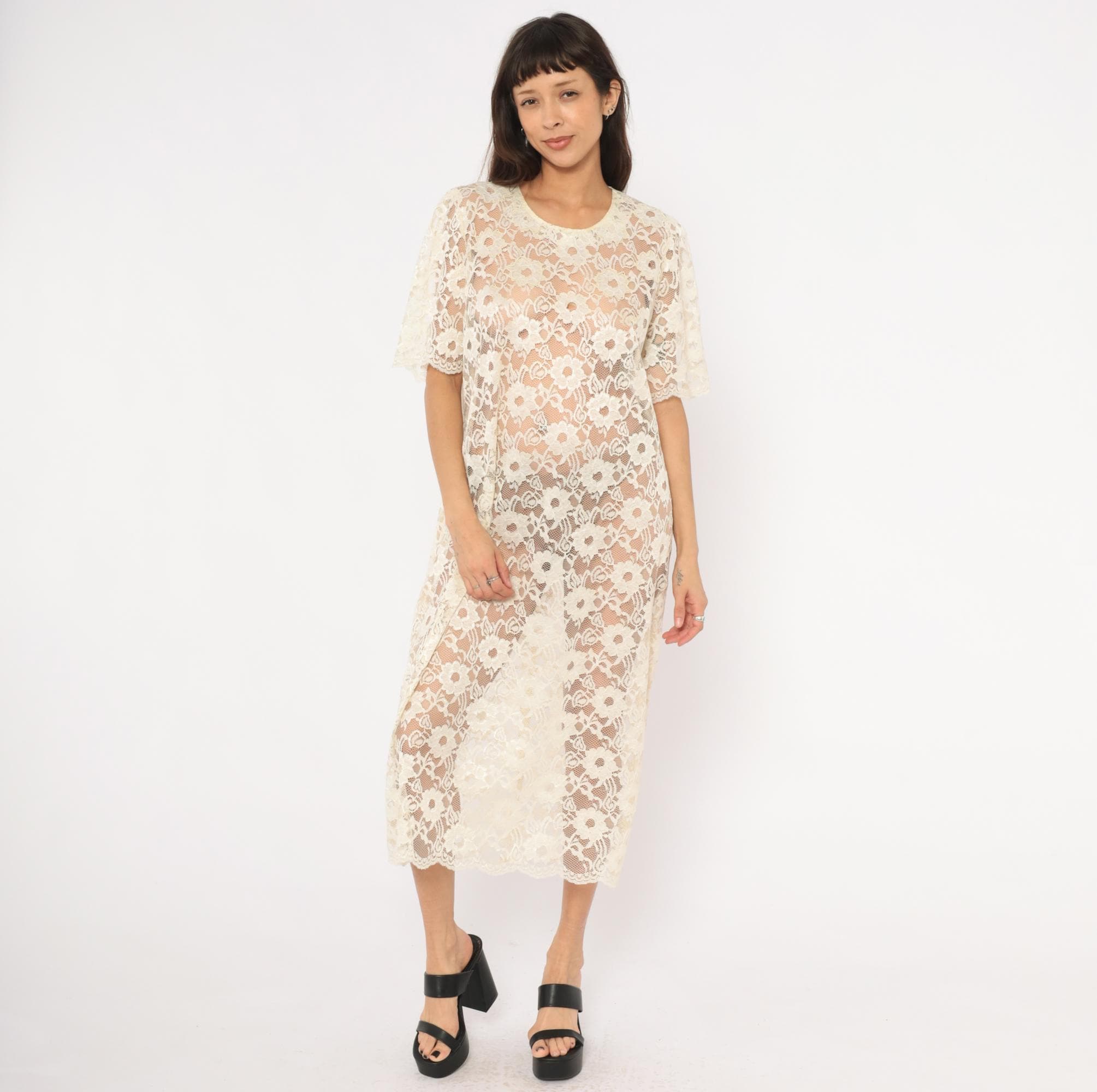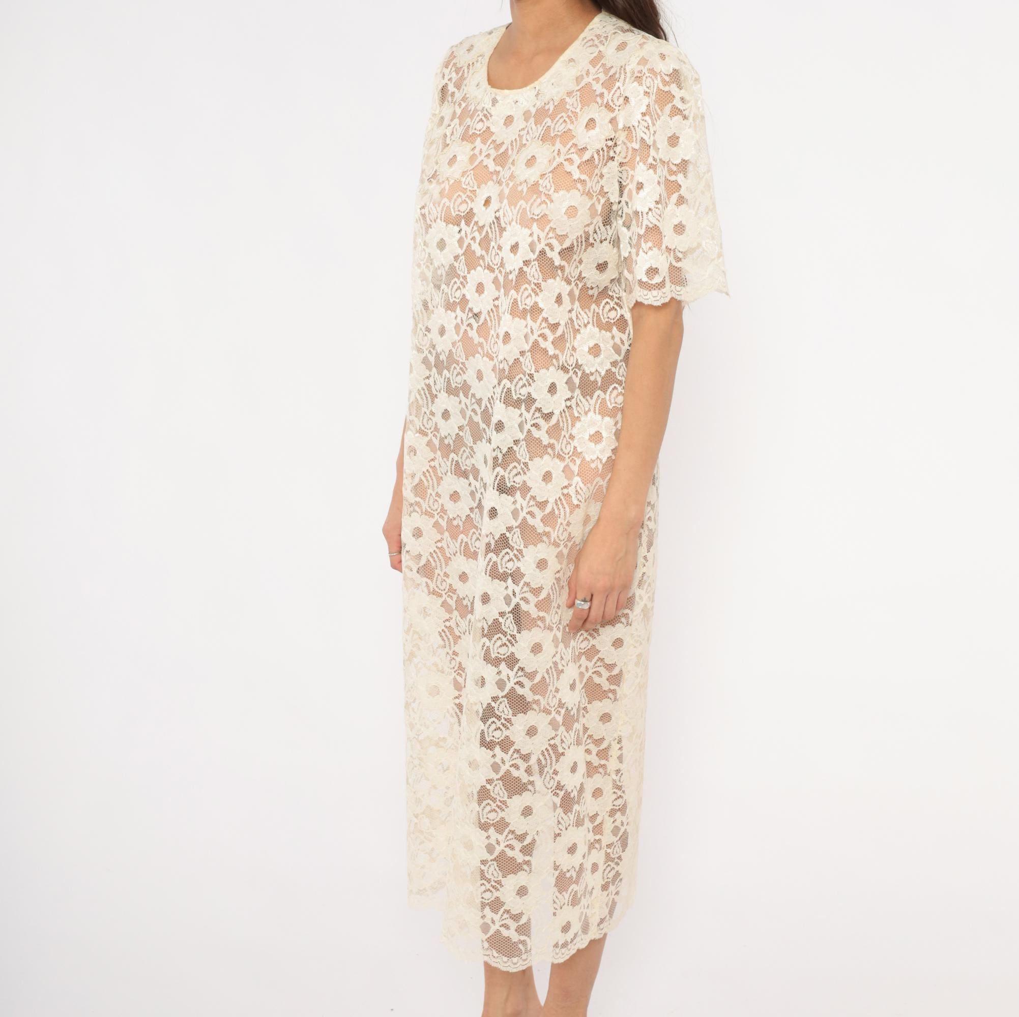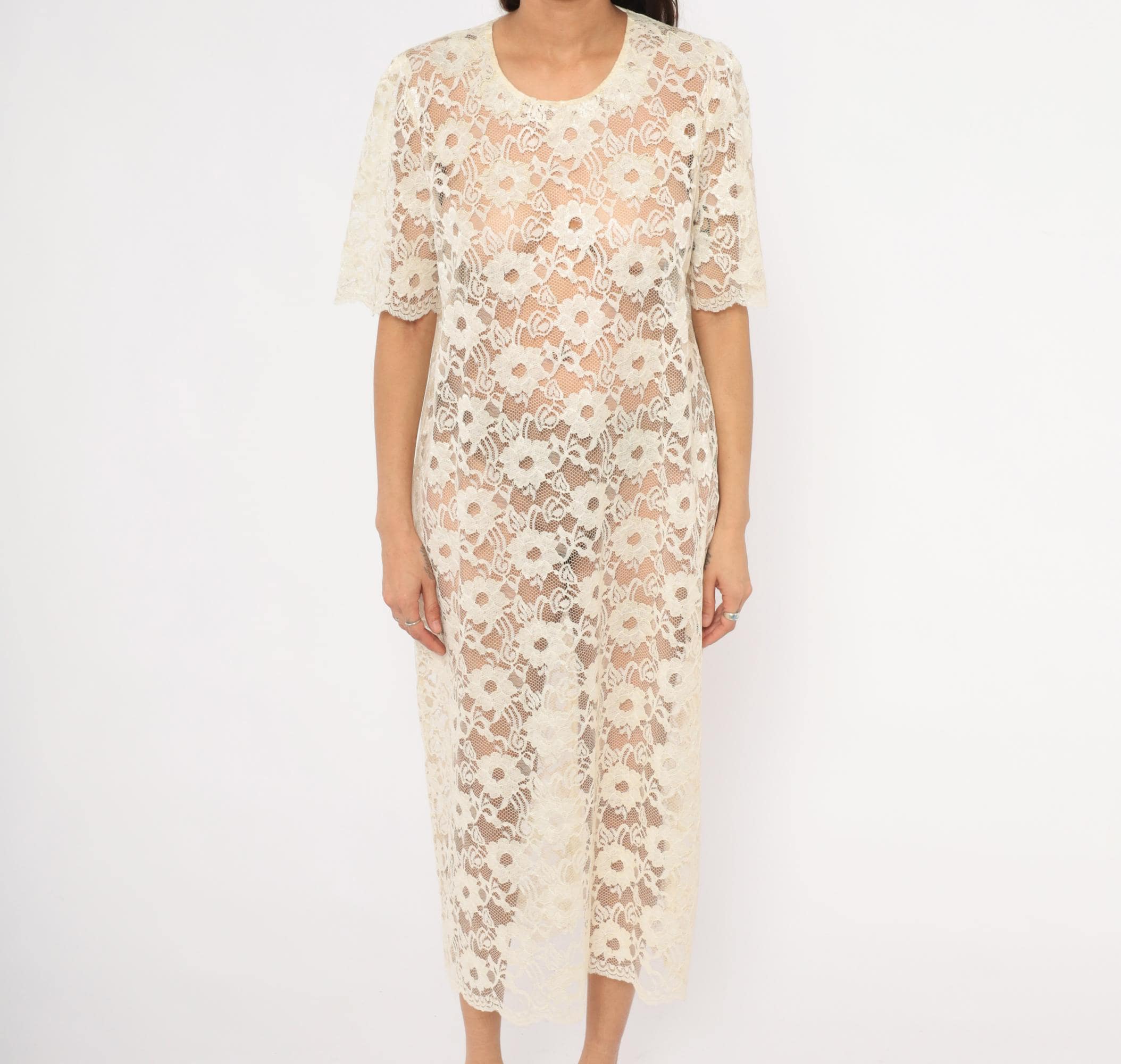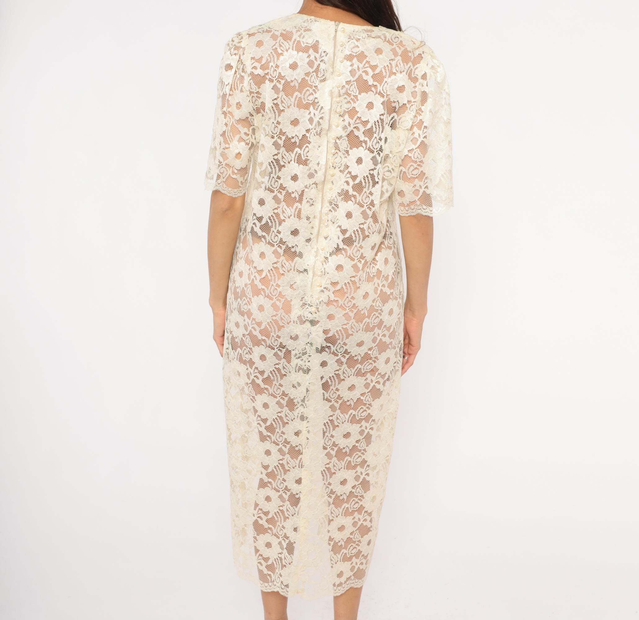 90s cream floral lace midi dress with an allover sheer construction and scalloped edges at the sleeves and hem. Scoop neckline, short sleeves, and a straight relaxed silhouette falling to mid-calf. Back closure with a zipper and a row of decorative pearl-style buttons running from neckline to hem.
