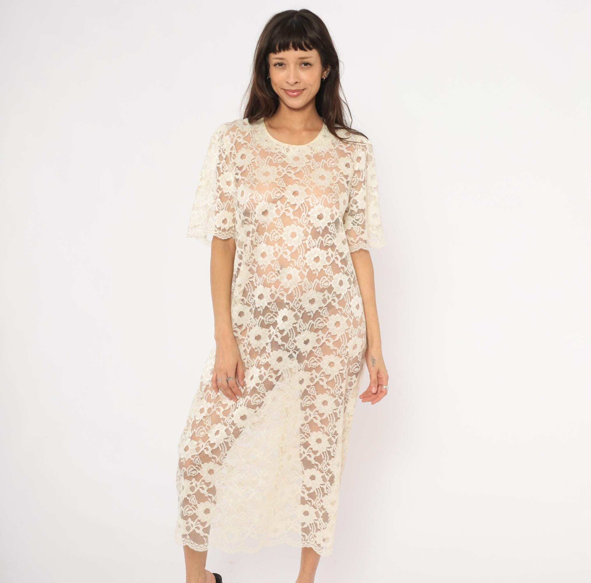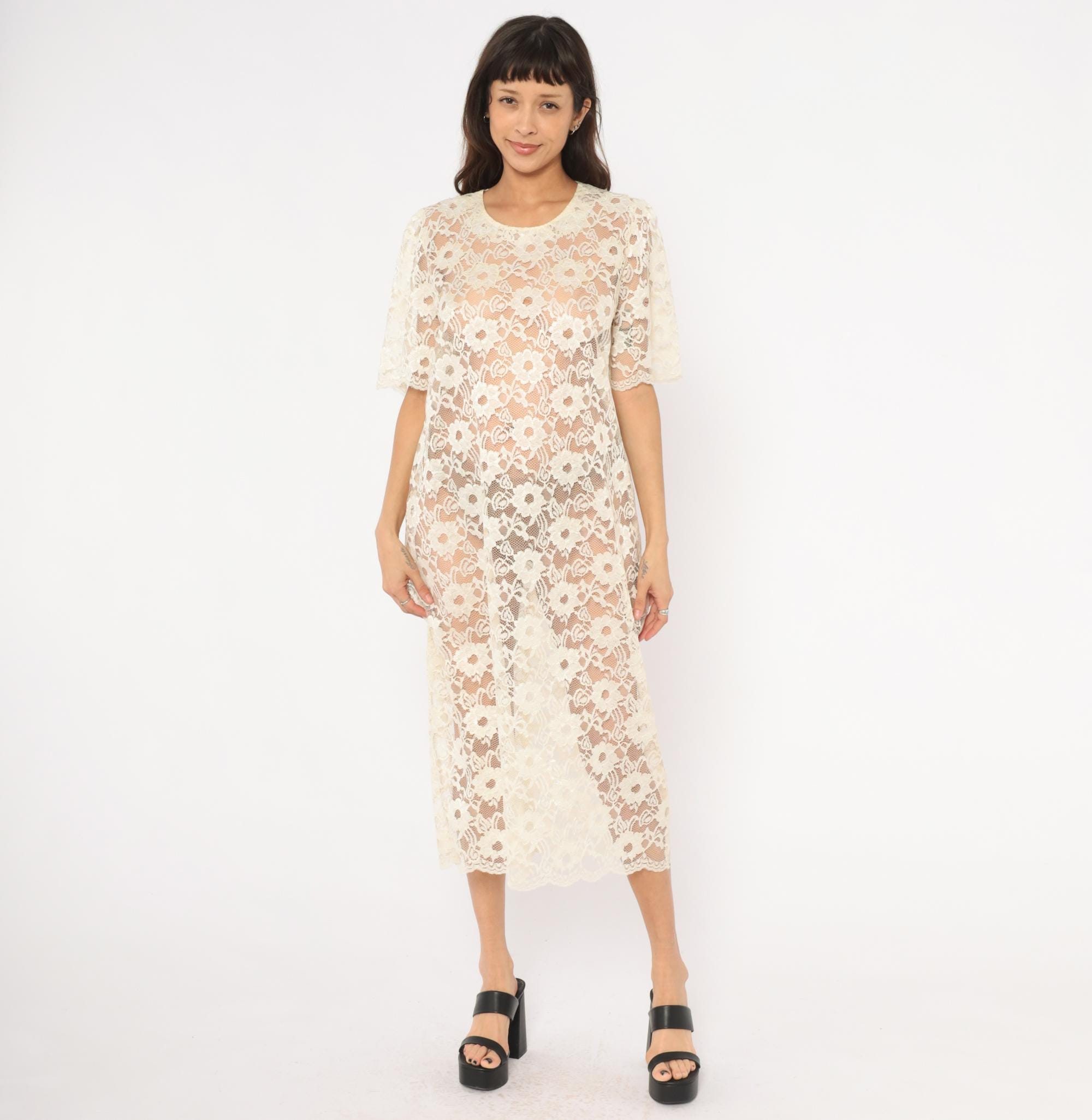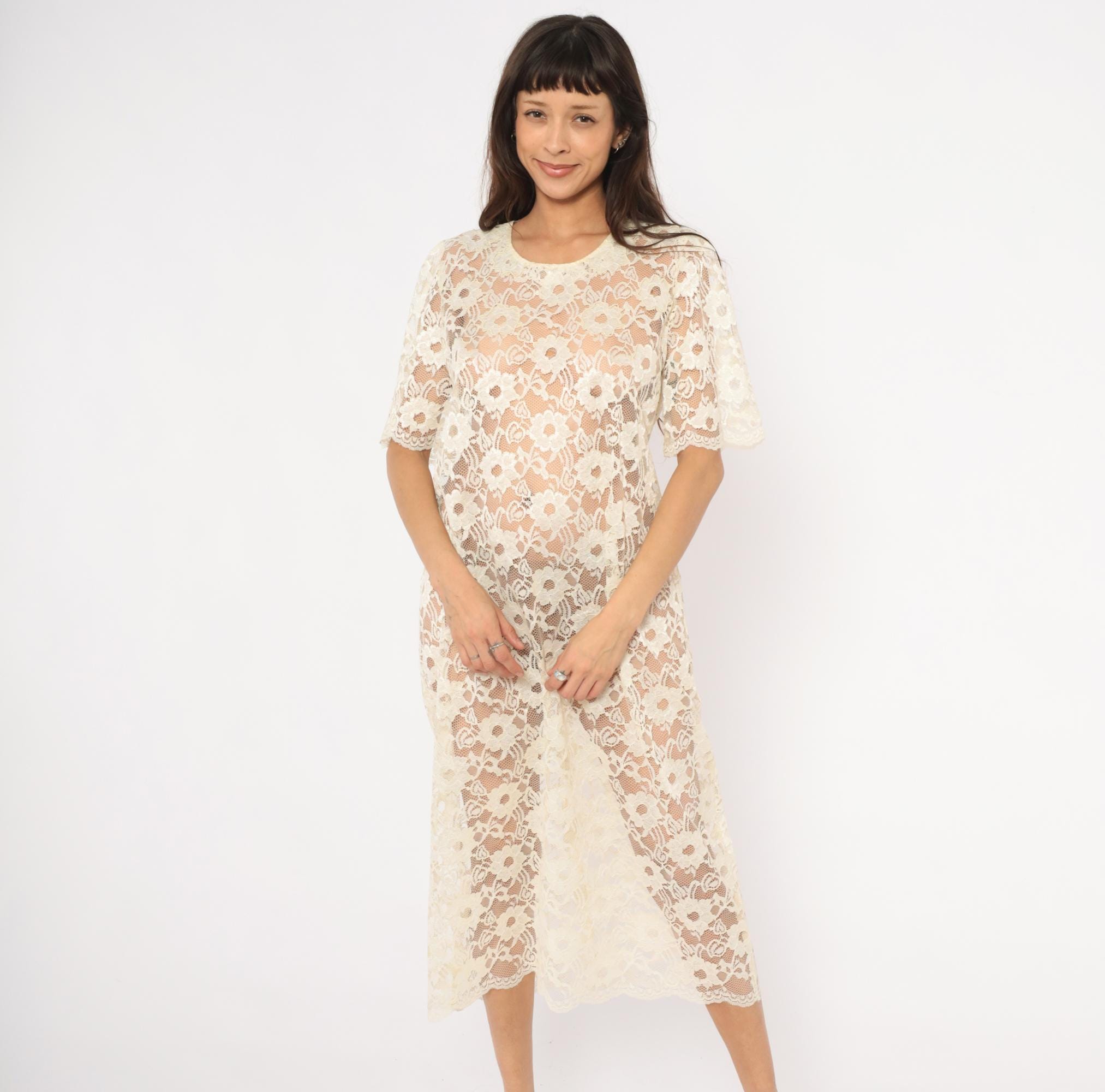 90s cream floral lace midi dress with an allover sheer construction and scalloped edges at the sleeves and hem. Scoop neckline, short sleeves, and a straight relaxed silhouette falling to mid-calf. Back closure with a zipper and a row of decorative pearl-style buttons running from neckline to hem.