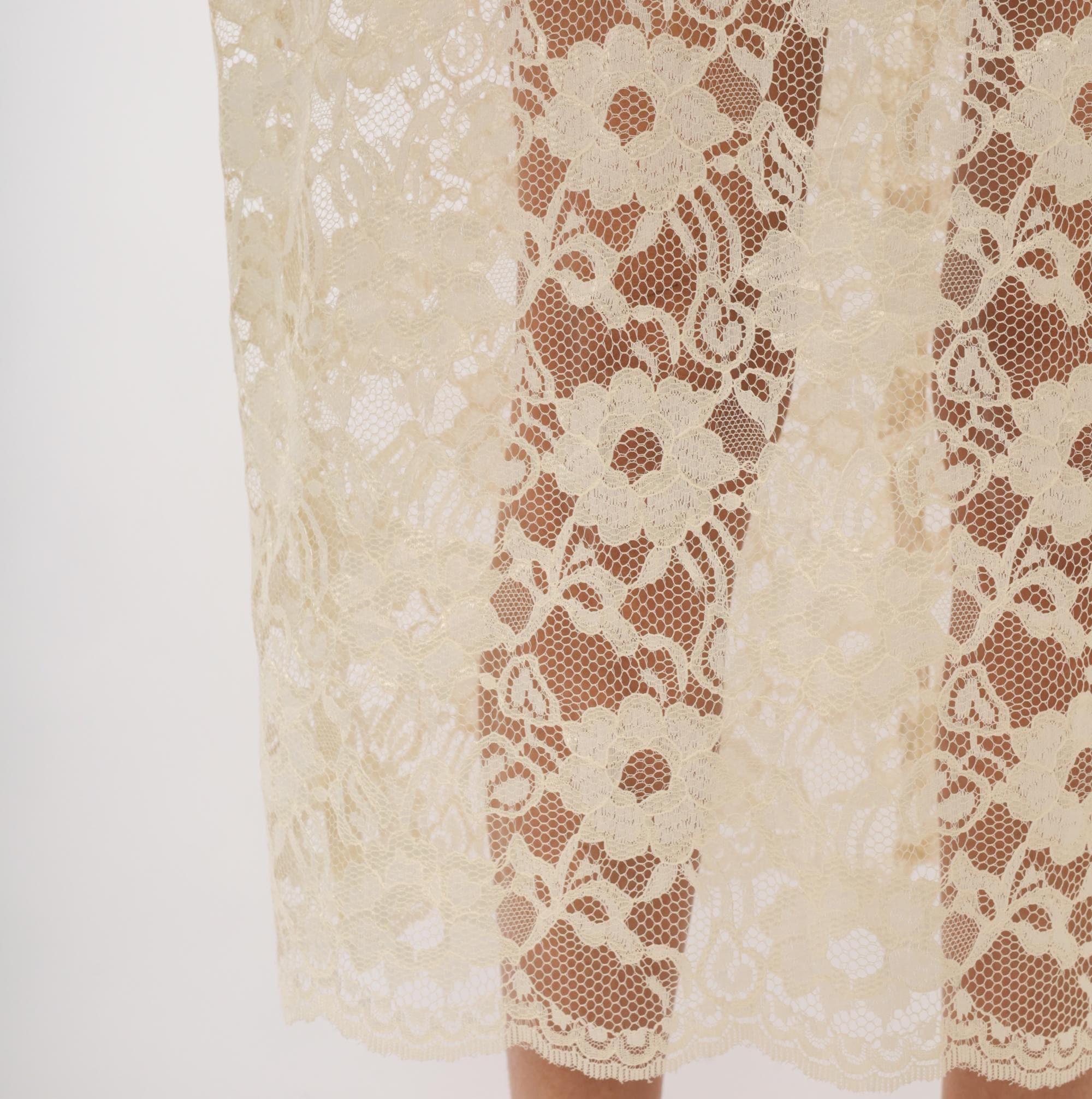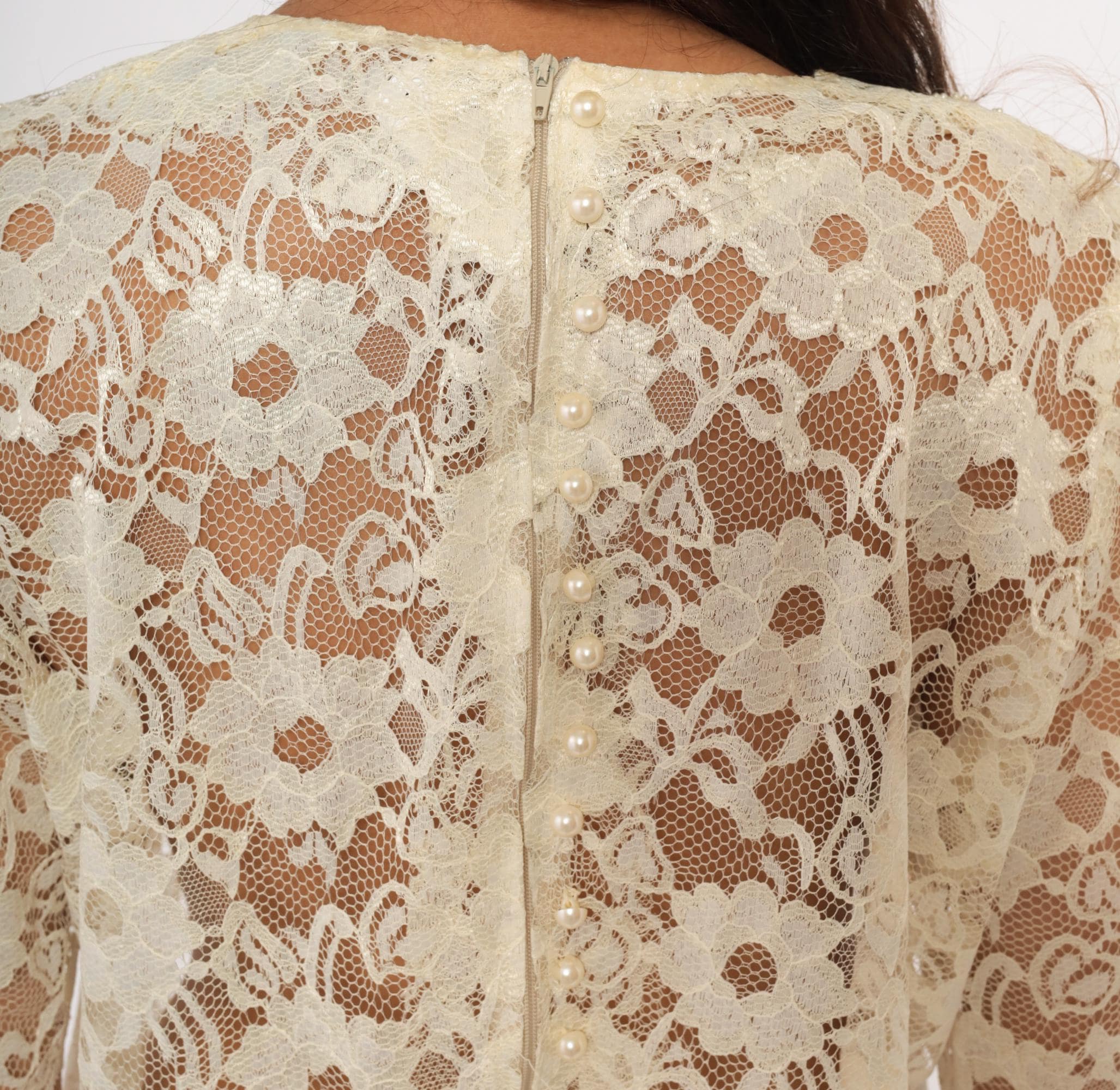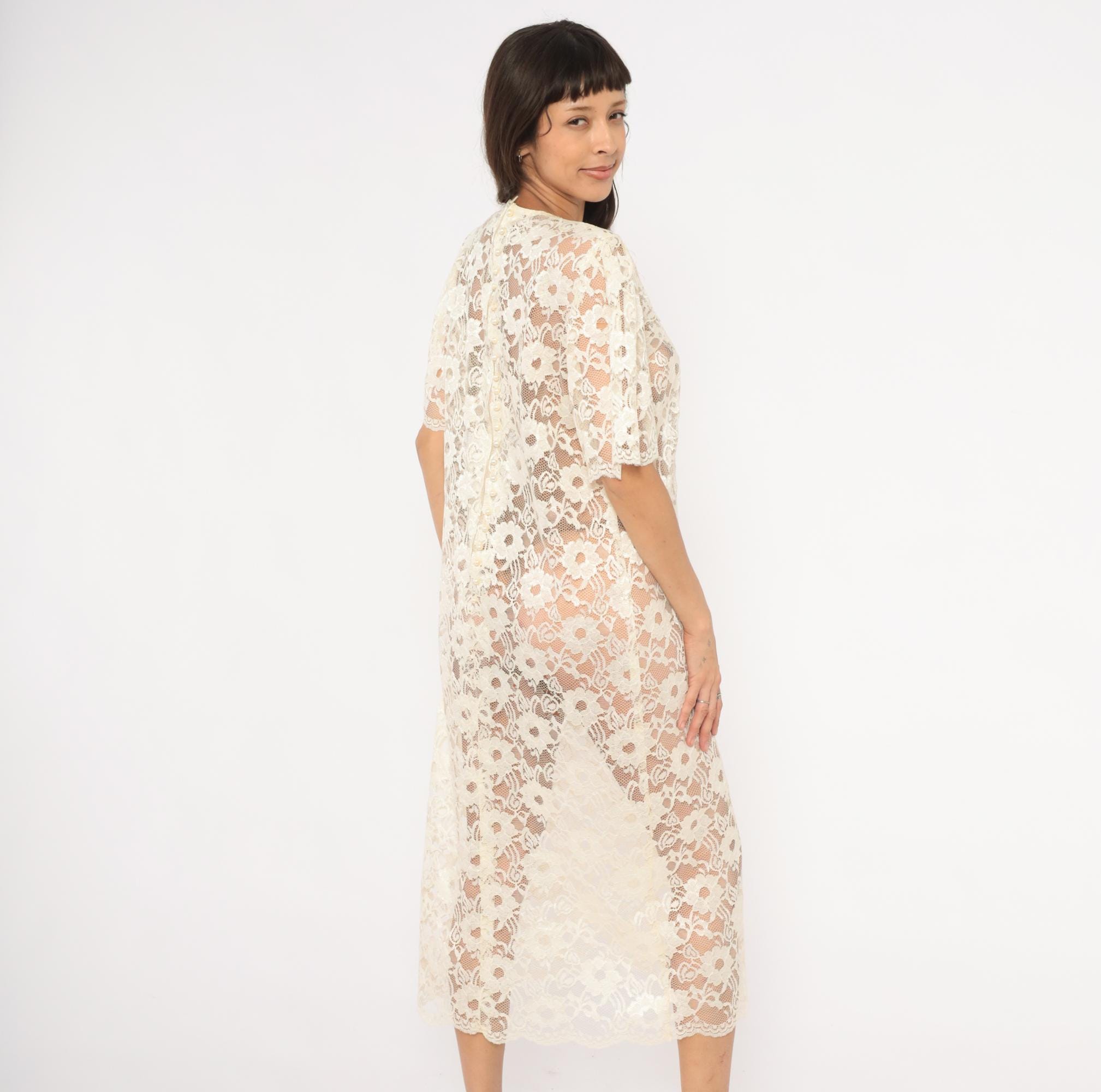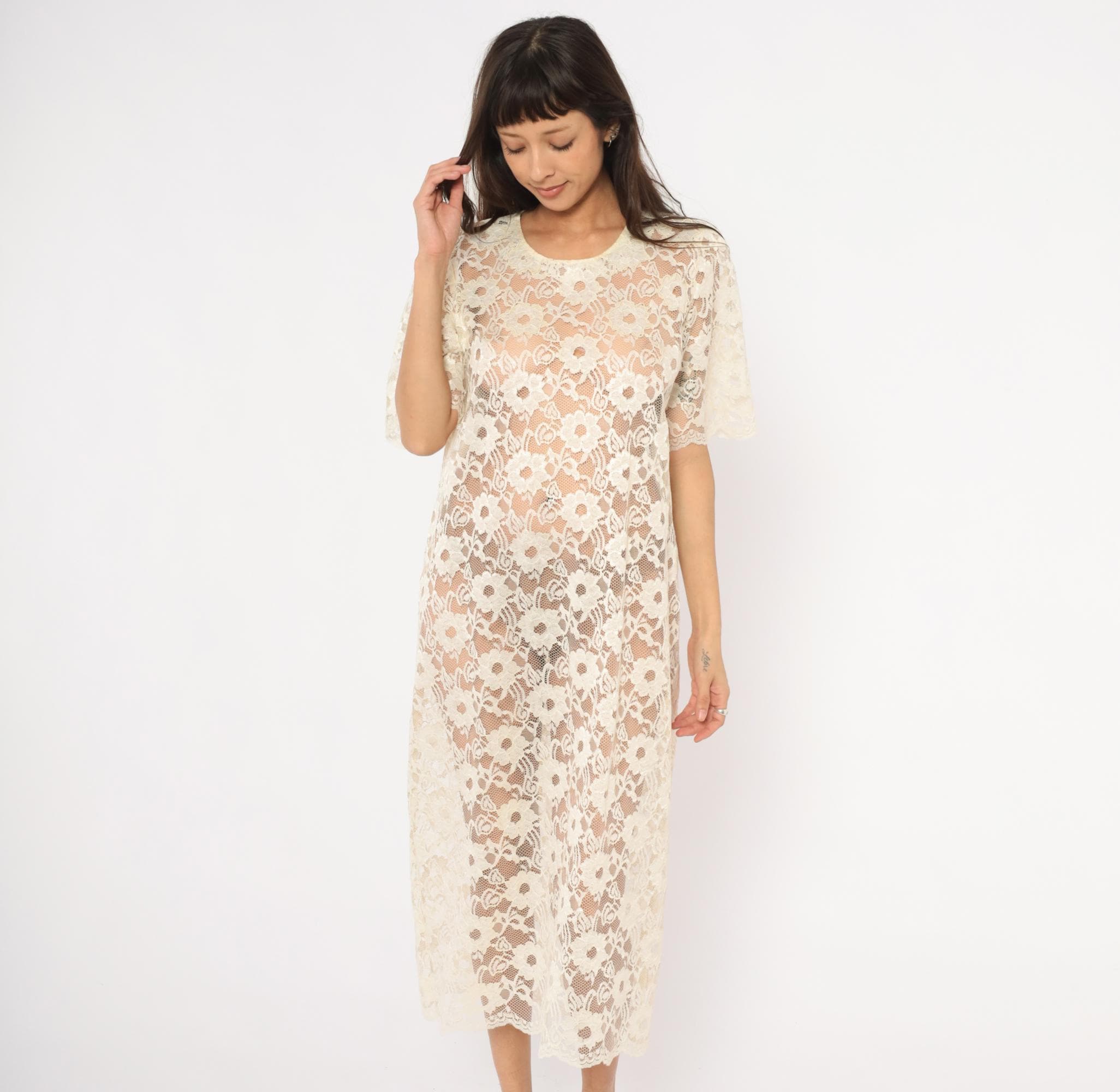 90s cream floral lace midi dress with an allover sheer construction and scalloped edges at the sleeves and hem. Scoop neckline, short sleeves, and a straight relaxed silhouette falling to mid-calf. Back closure with a zipper and a row of decorative pearl-style buttons running from neckline to hem.