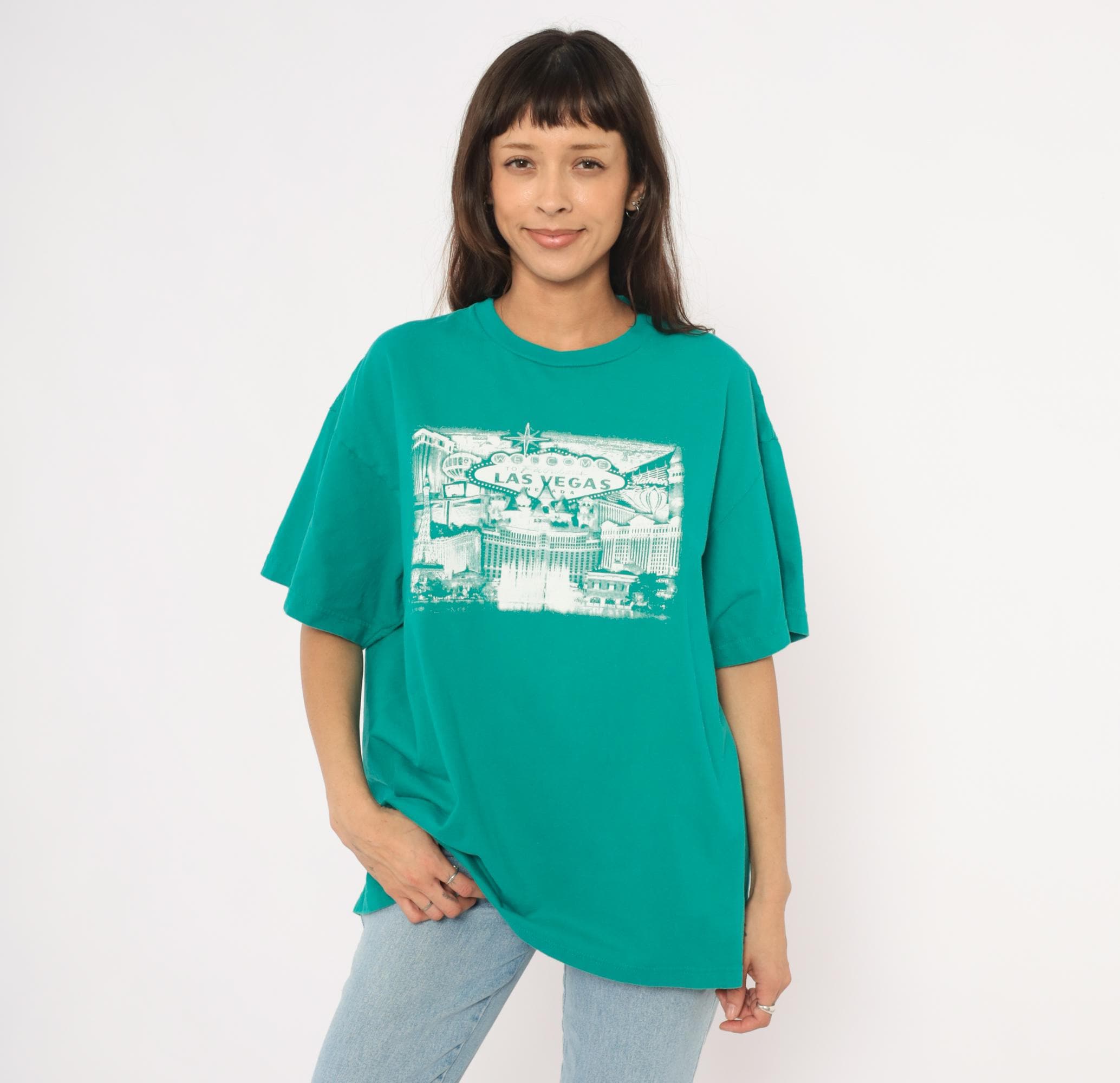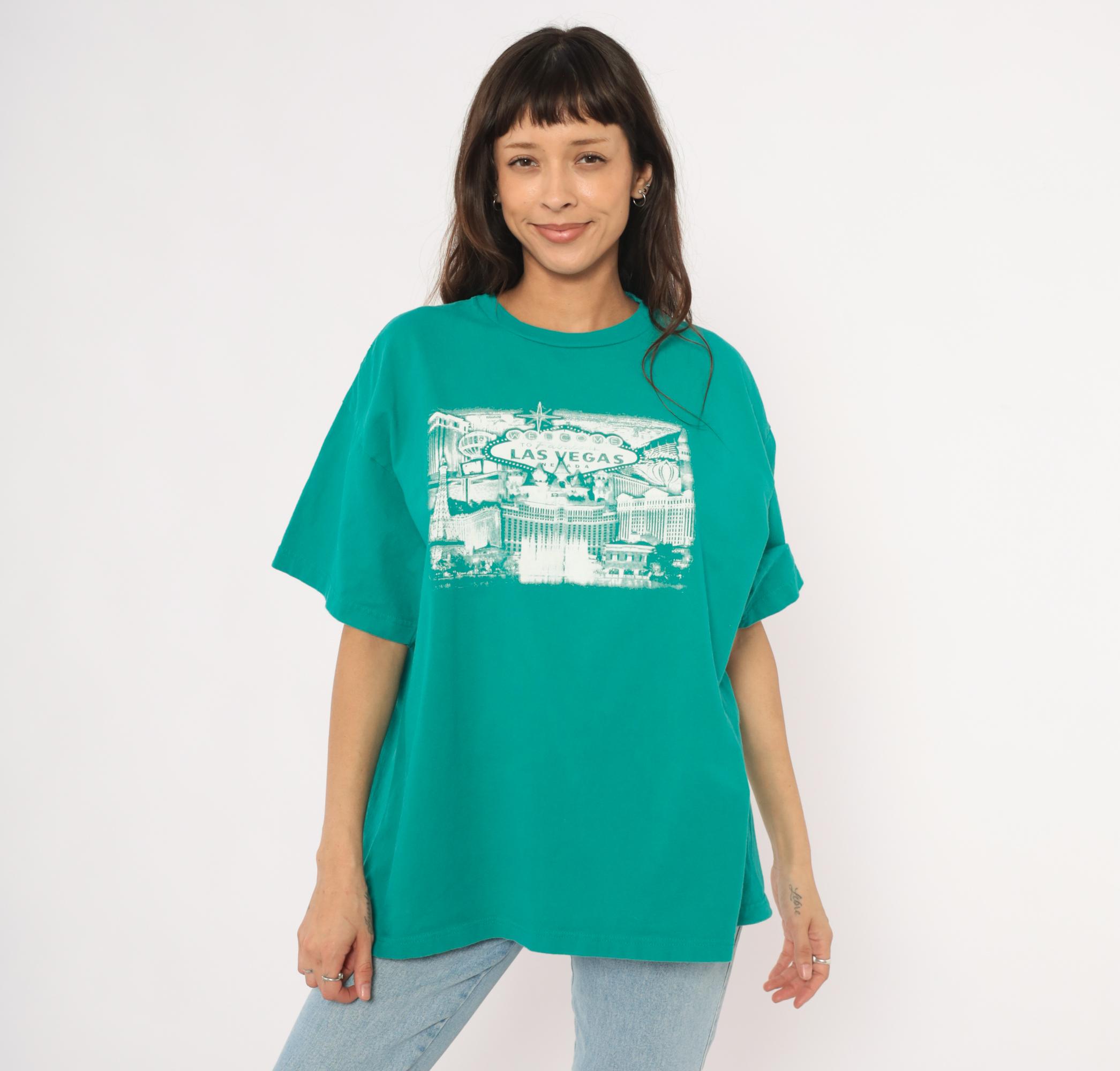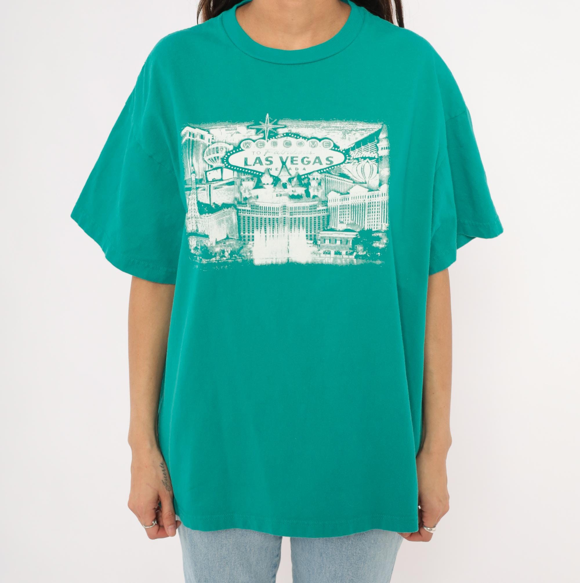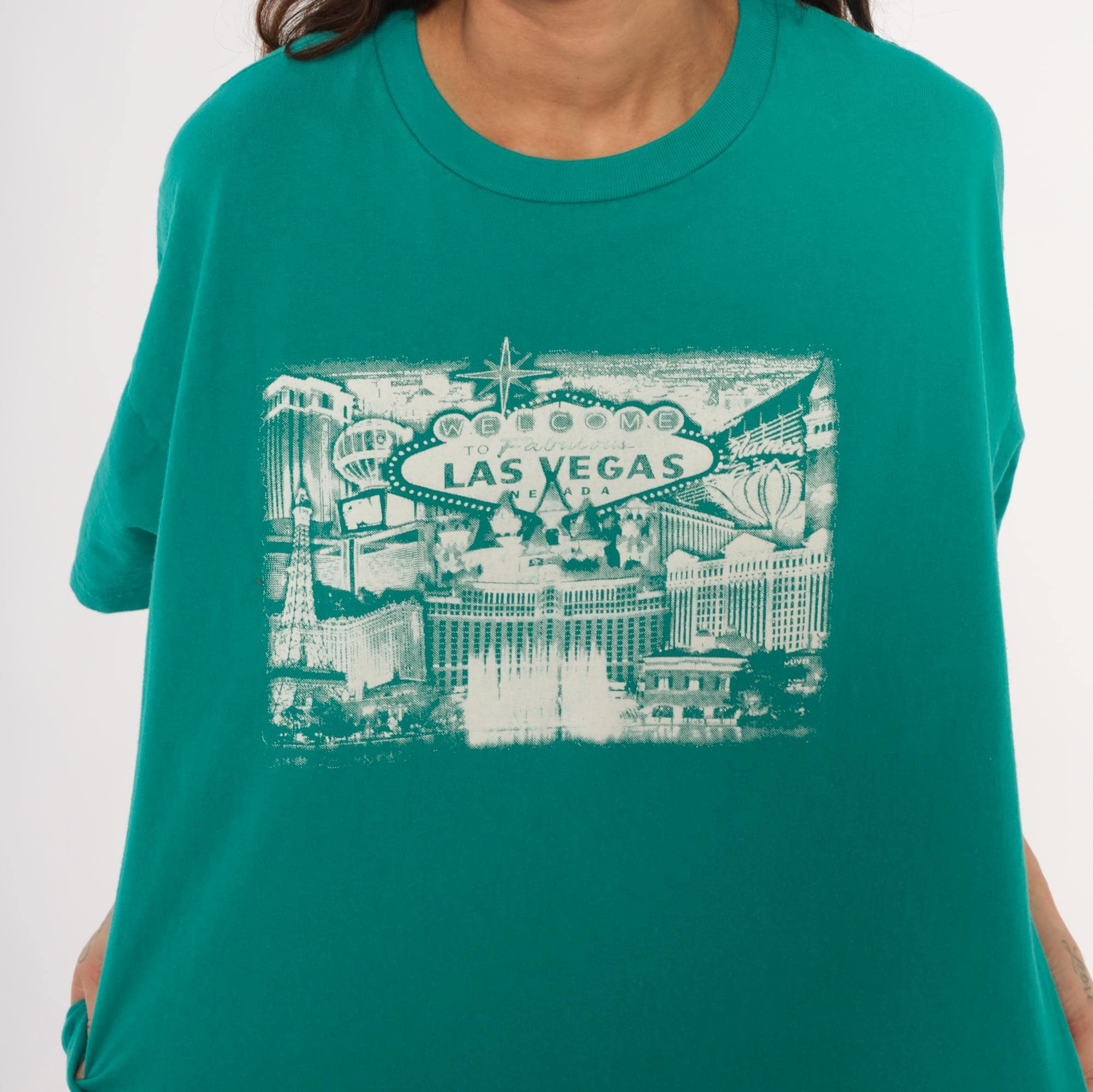 90s teal crew neck tee from Suna with a white screen-printed Las Vegas cityscape across the chest, depicting the iconic "Welcome to Fabulous Las Vegas Nevada" sign, the Bellagio fountains, Paris Las Vegas Eiffel Tower replica, and surrounding Strip hotels. Boxy, relaxed silhouette with short sleeves and a ribbed collar. Plain back with no graphics.