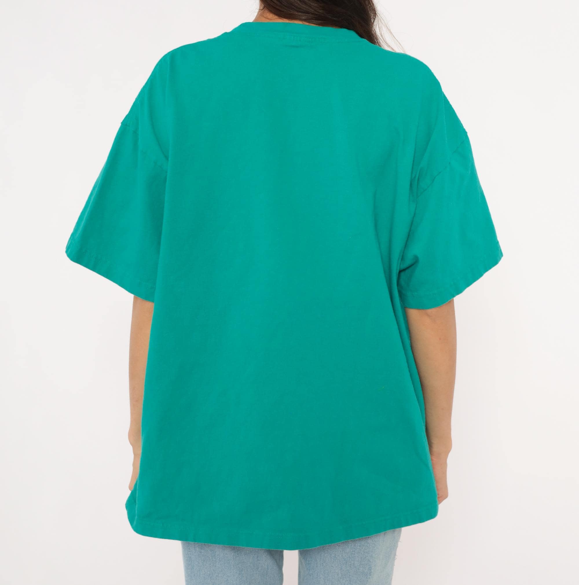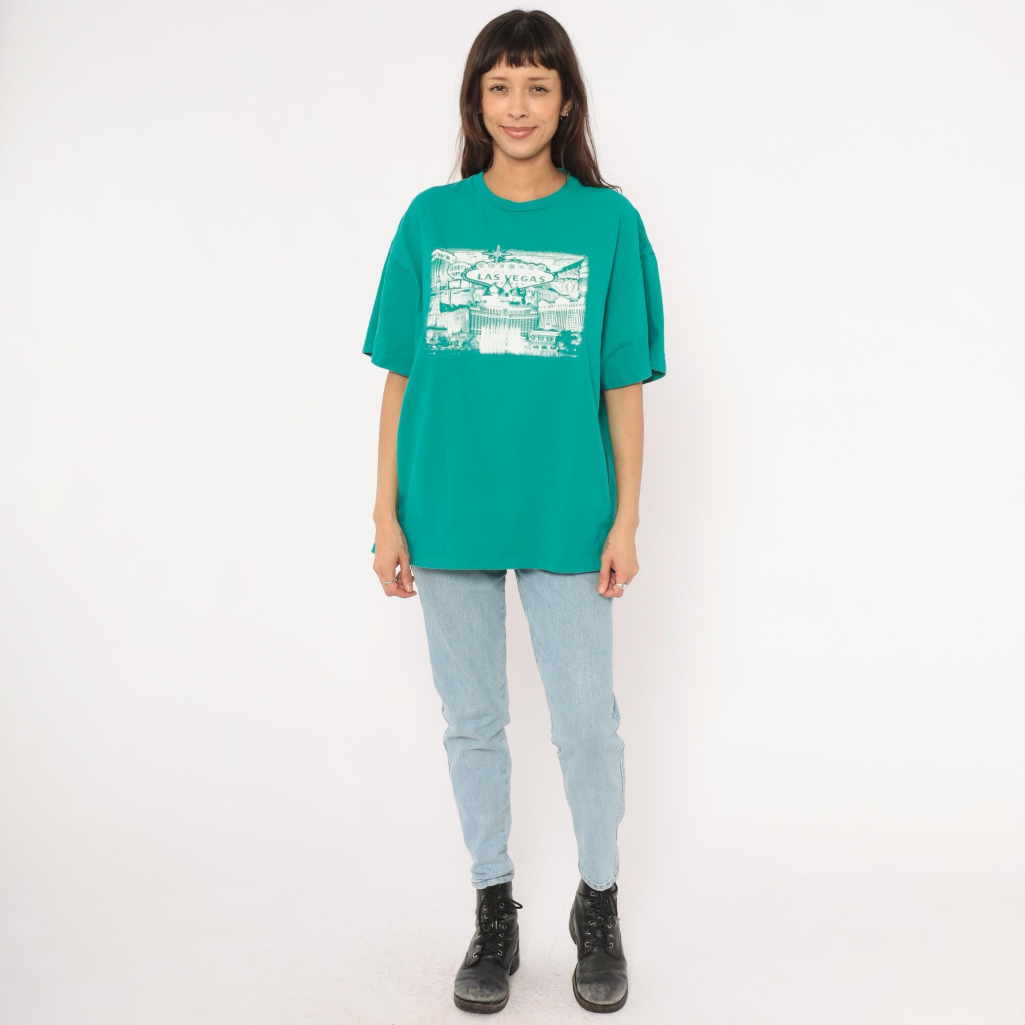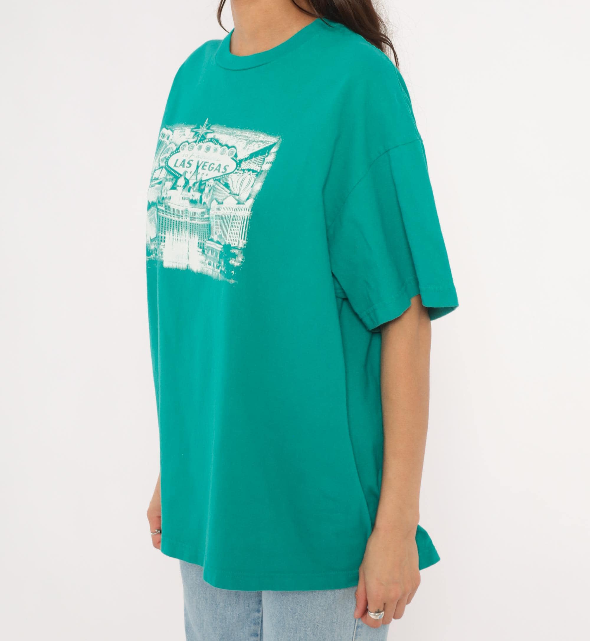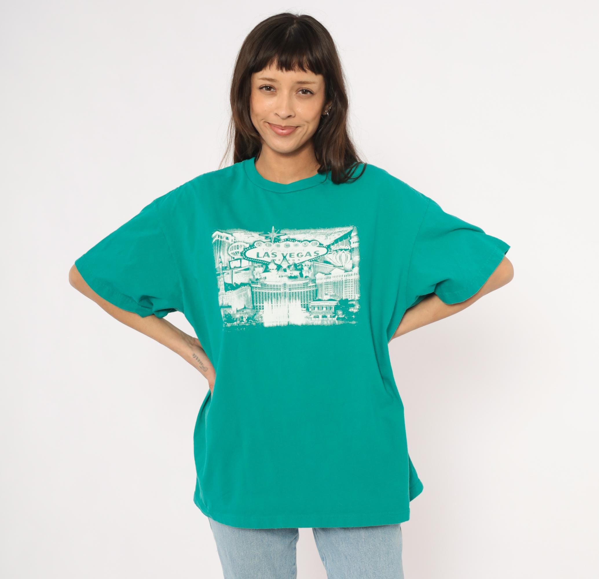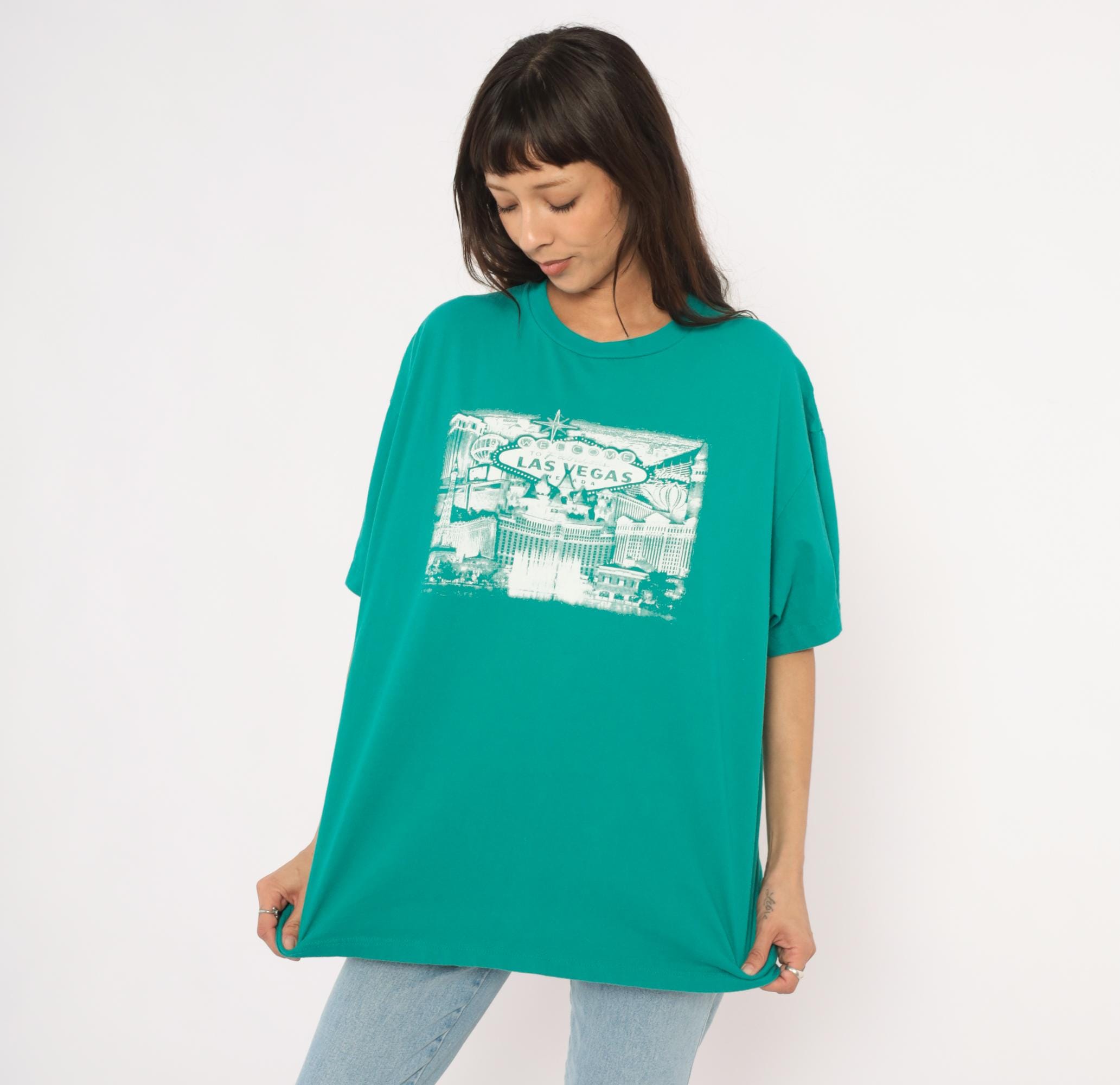 90s teal crew neck tee from Suna with a white screen-printed Las Vegas cityscape across the chest, depicting the iconic "Welcome to Fabulous Las Vegas Nevada" sign, the Bellagio fountains, Paris Las Vegas Eiffel Tower replica, and surrounding Strip hotels. Boxy, relaxed silhouette with short sleeves and a ribbed collar. Plain back with no graphics.