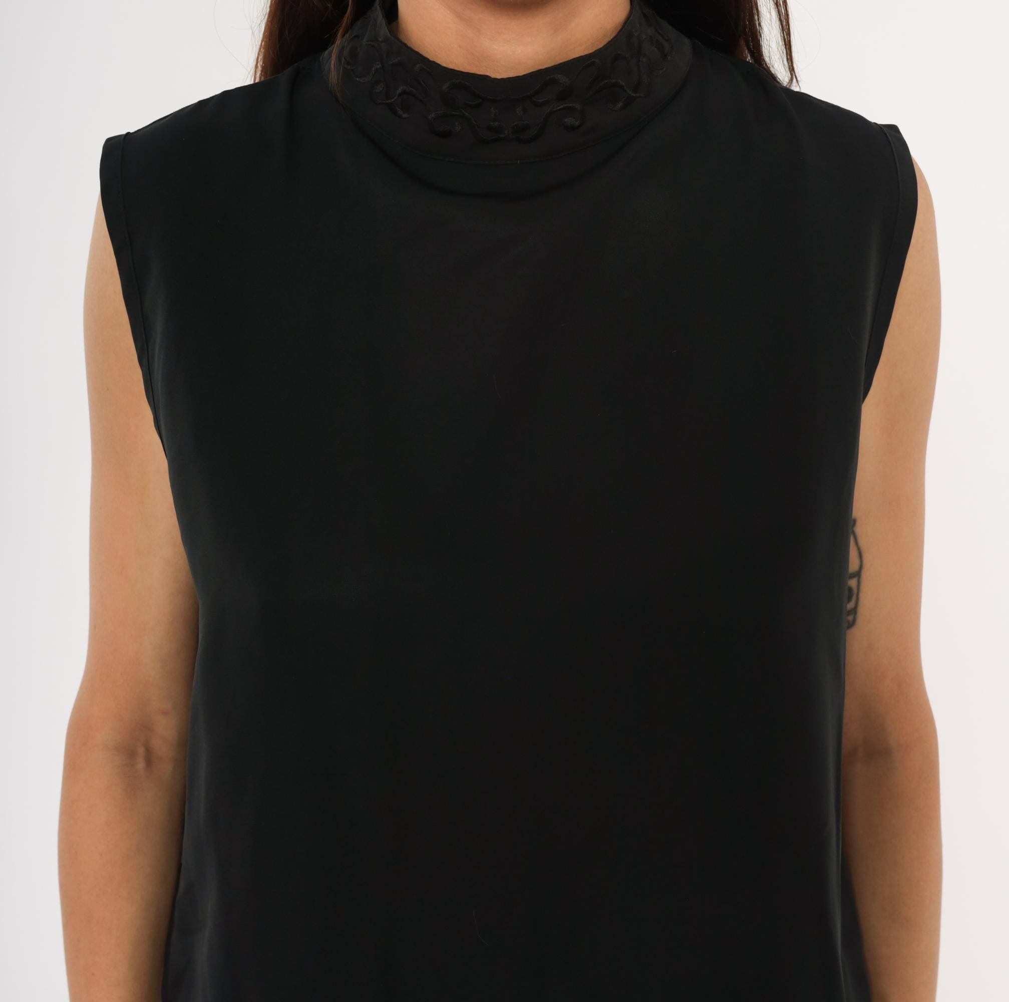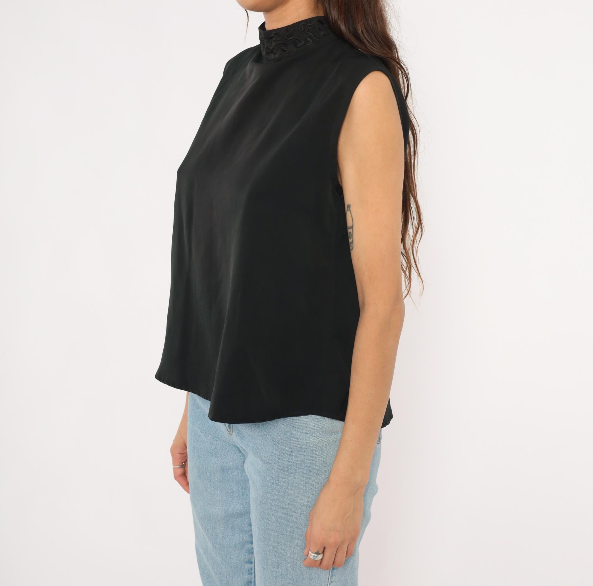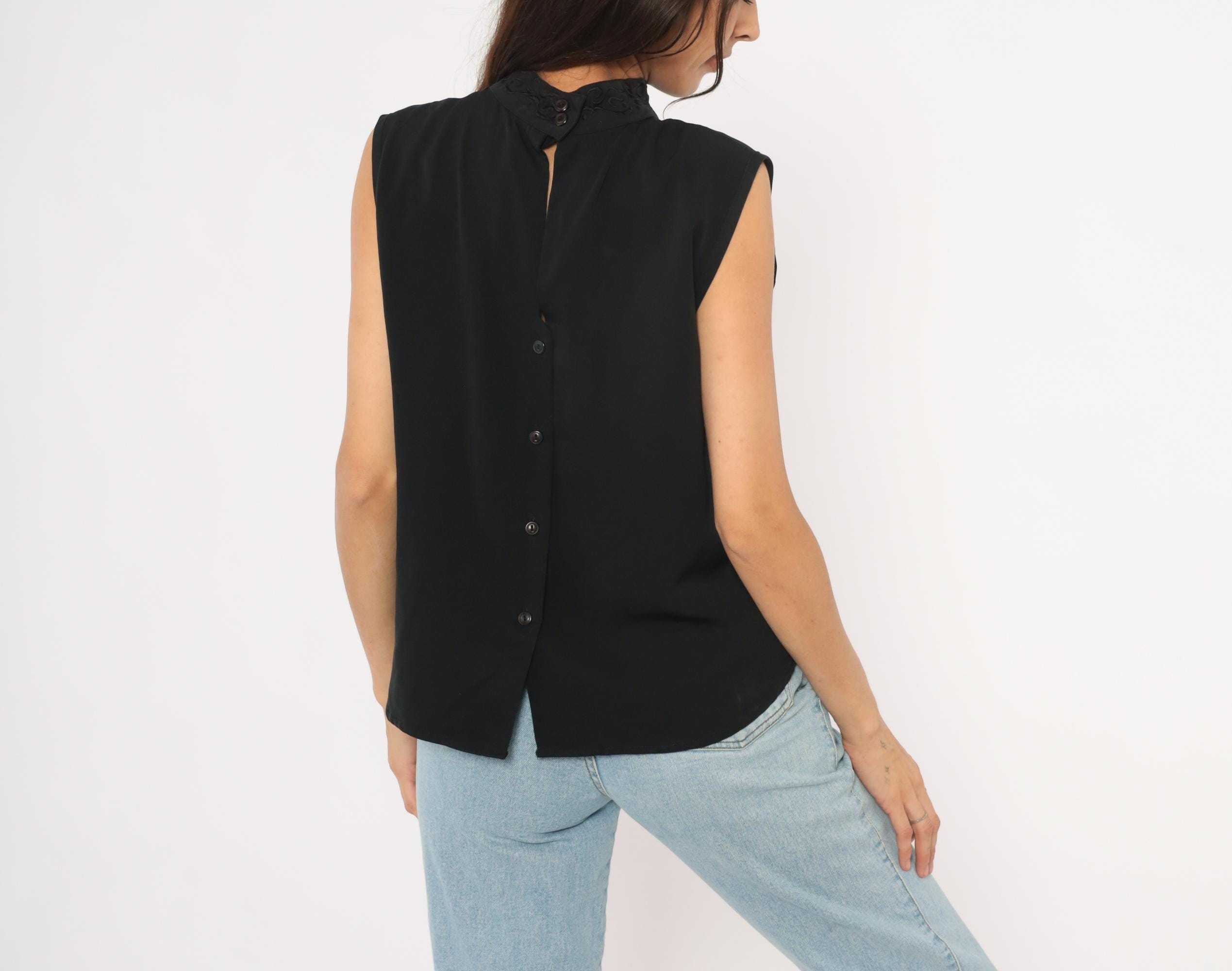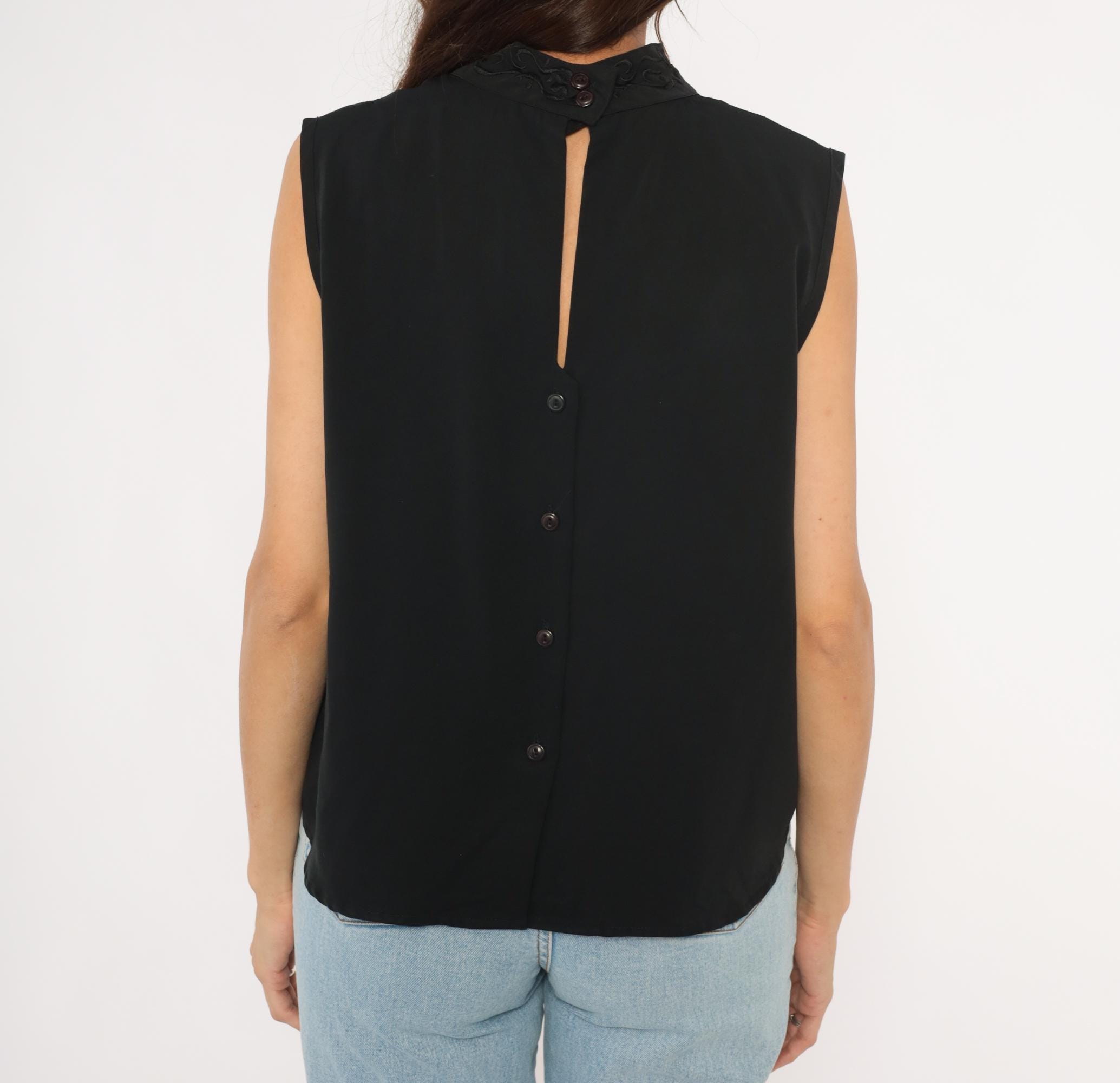 90s black sleeveless shell blouse from Che Studio with a mock neck and embroidered collar detail. Back closure with a keyhole opening at the upper back and a row of buttons running down the center. Clean, straight silhouette with finished armholes and no darts.