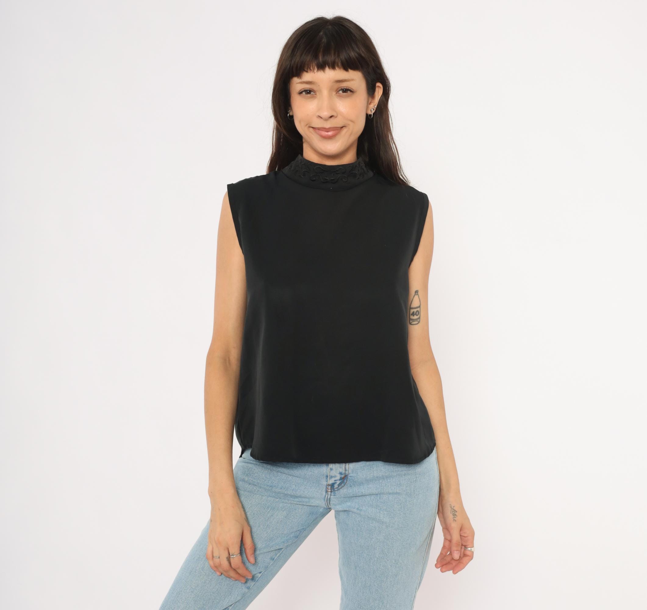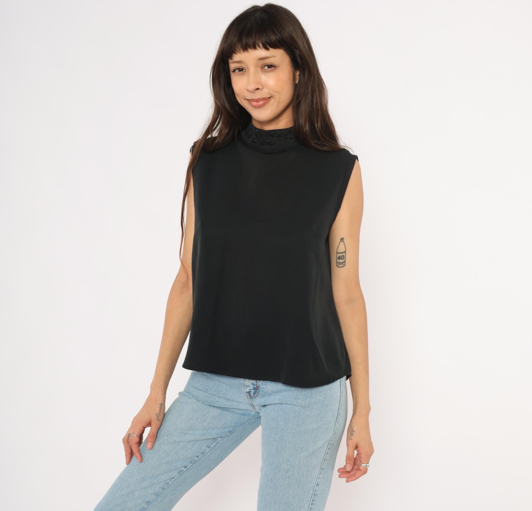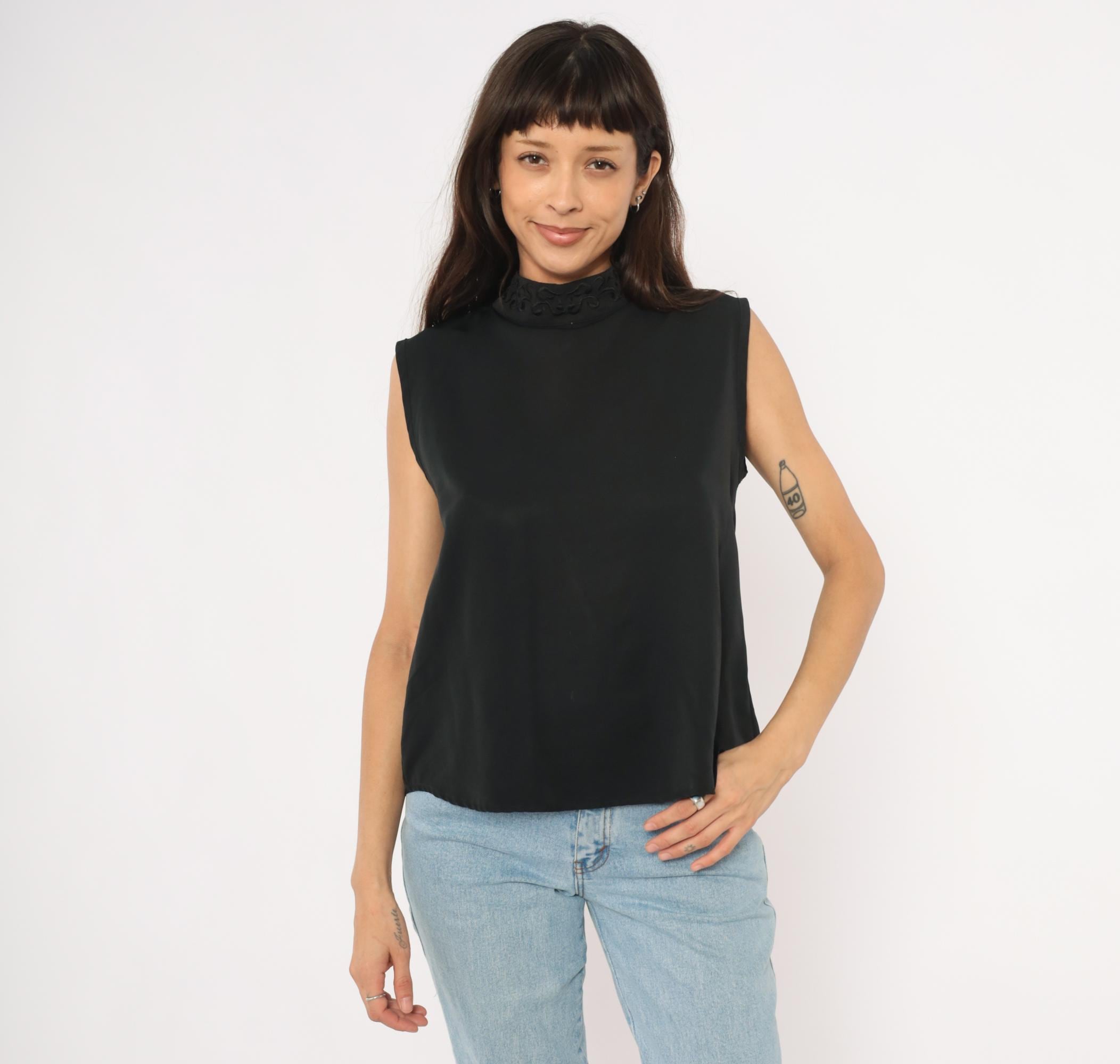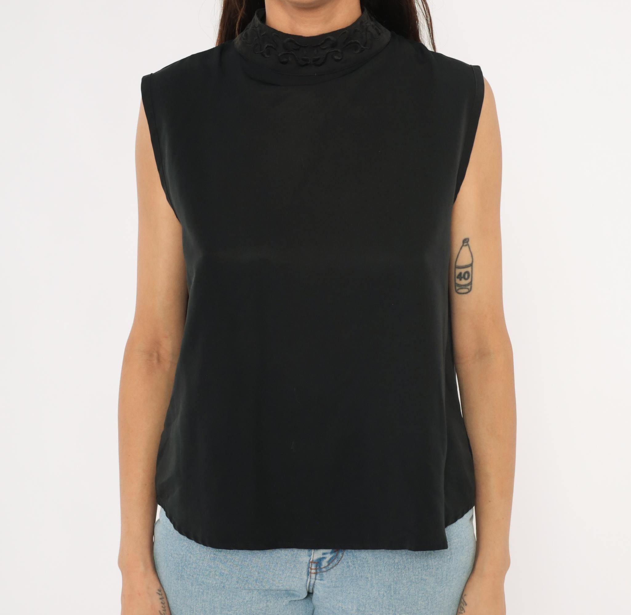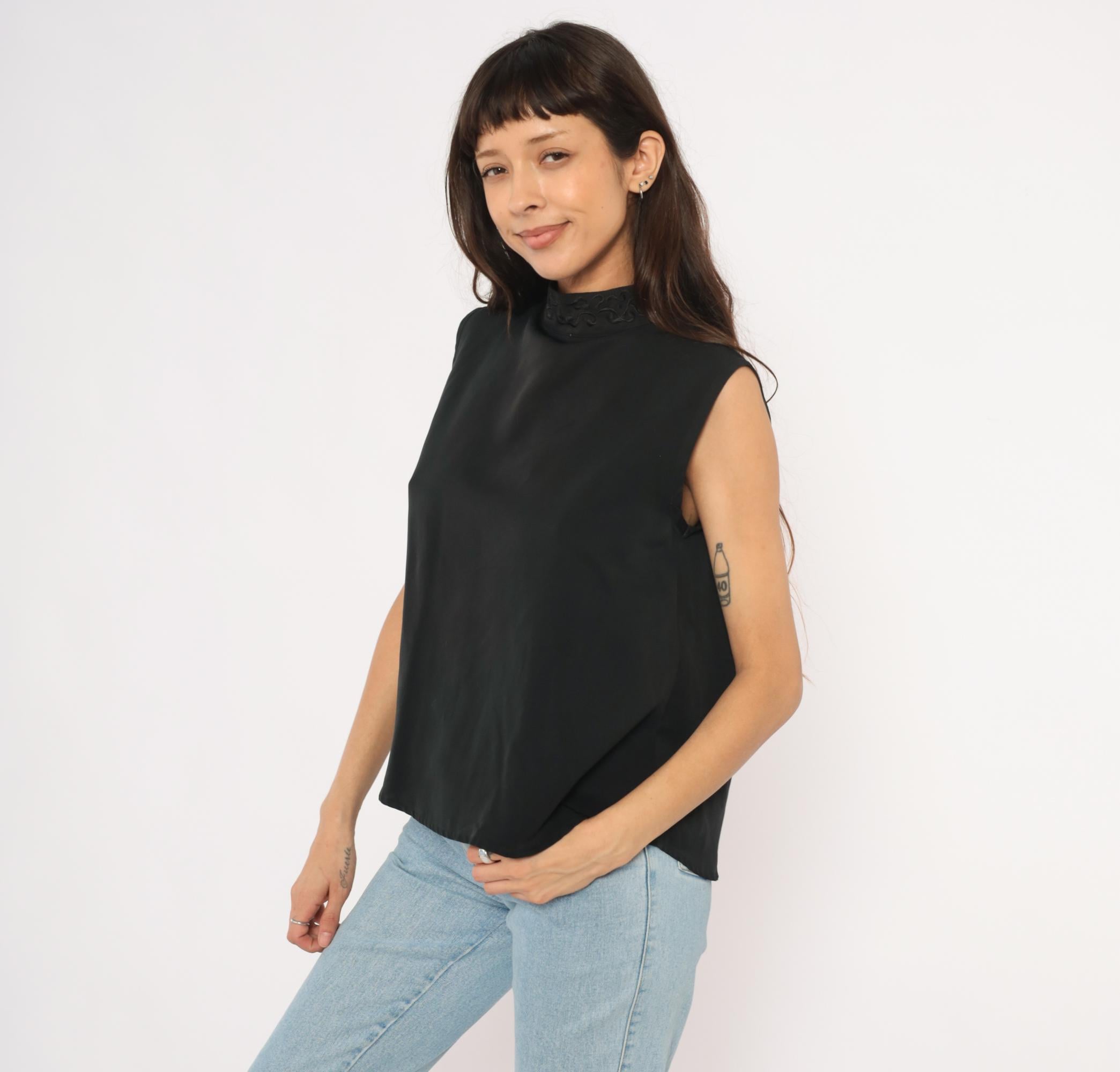 90s black sleeveless shell blouse from Che Studio with a mock neck and embroidered collar detail. Back closure with a keyhole opening at the upper back and a row of buttons running down the center. Clean, straight silhouette with finished armholes and no darts.