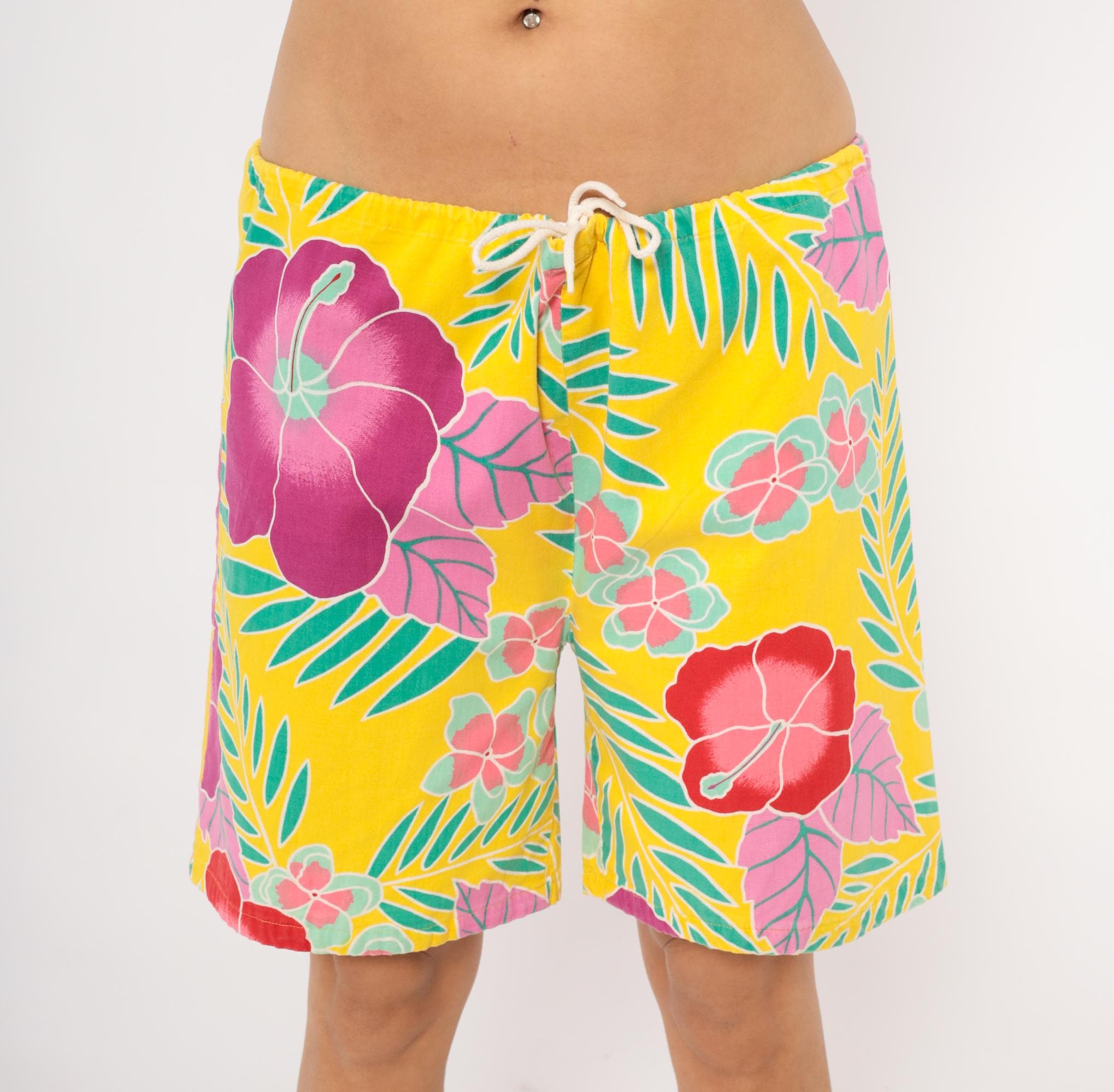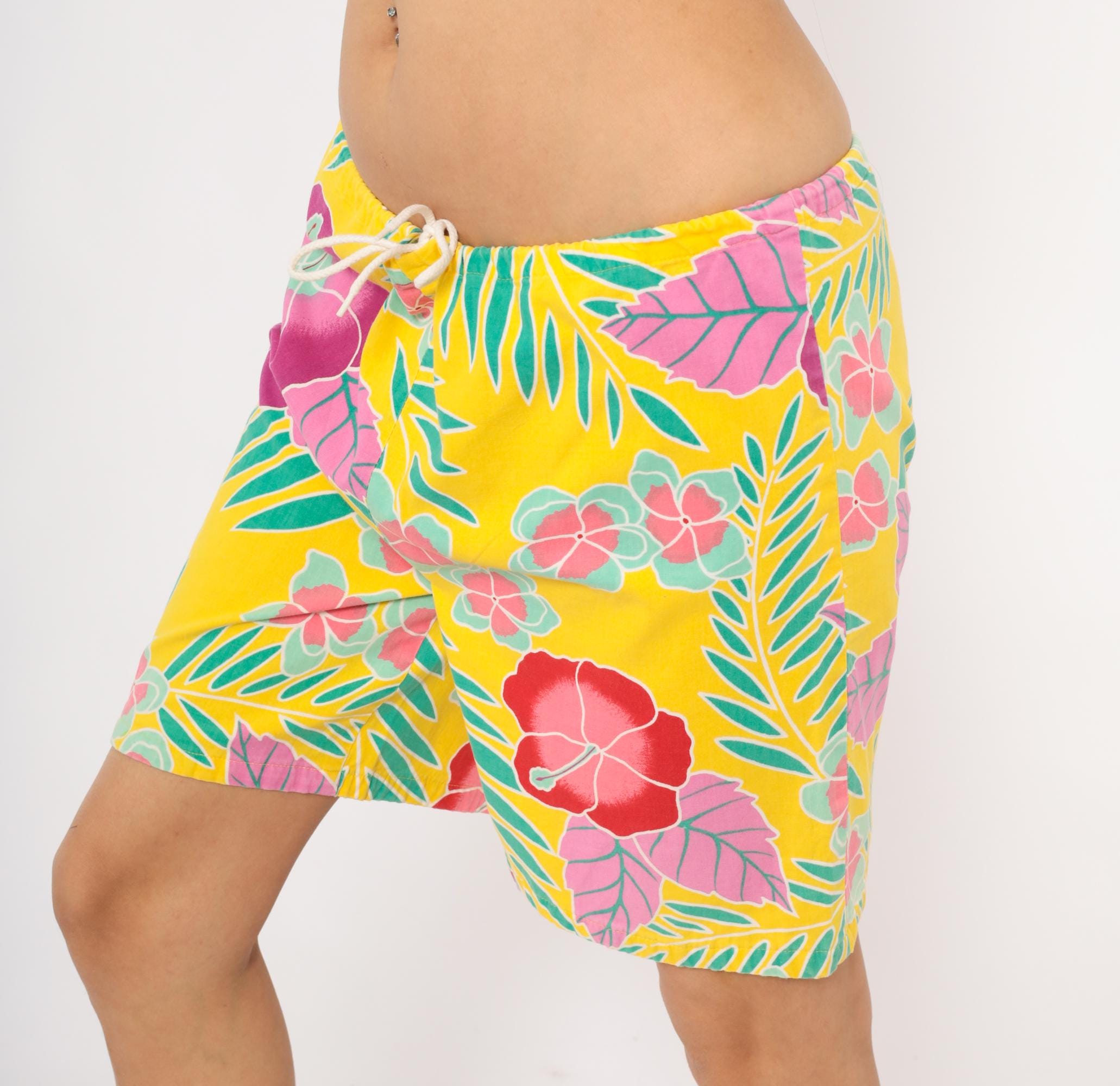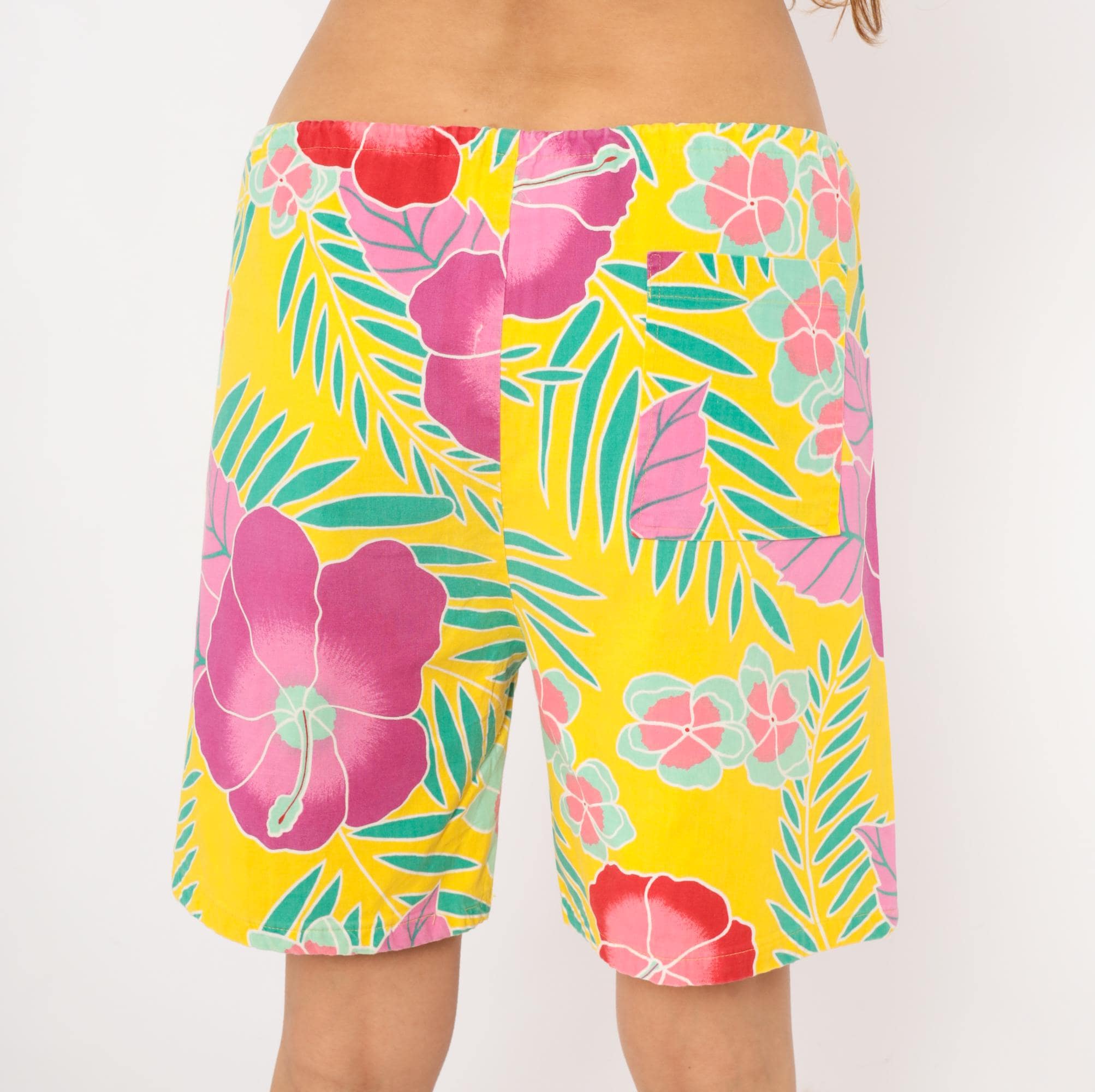 90s Hawaiian-style board shorts from Beach Scene with a yellow base and allover tropical print of hibiscus flowers, palm fronds, and plumeria clusters in magenta, pink, red, and teal. Elastic drawstring waist with white cord tie, relaxed straight leg, and single patch pocket on the back right side.