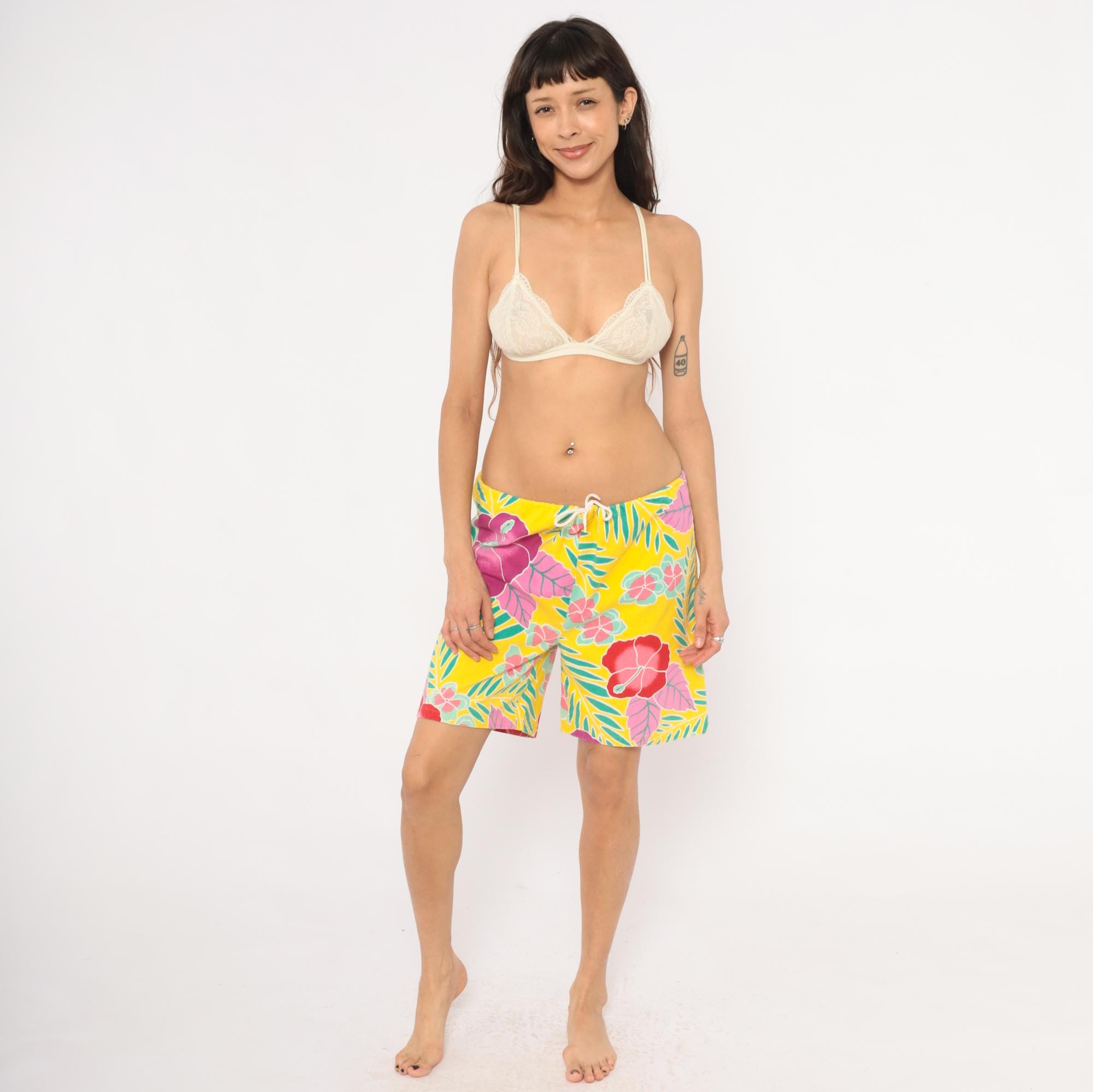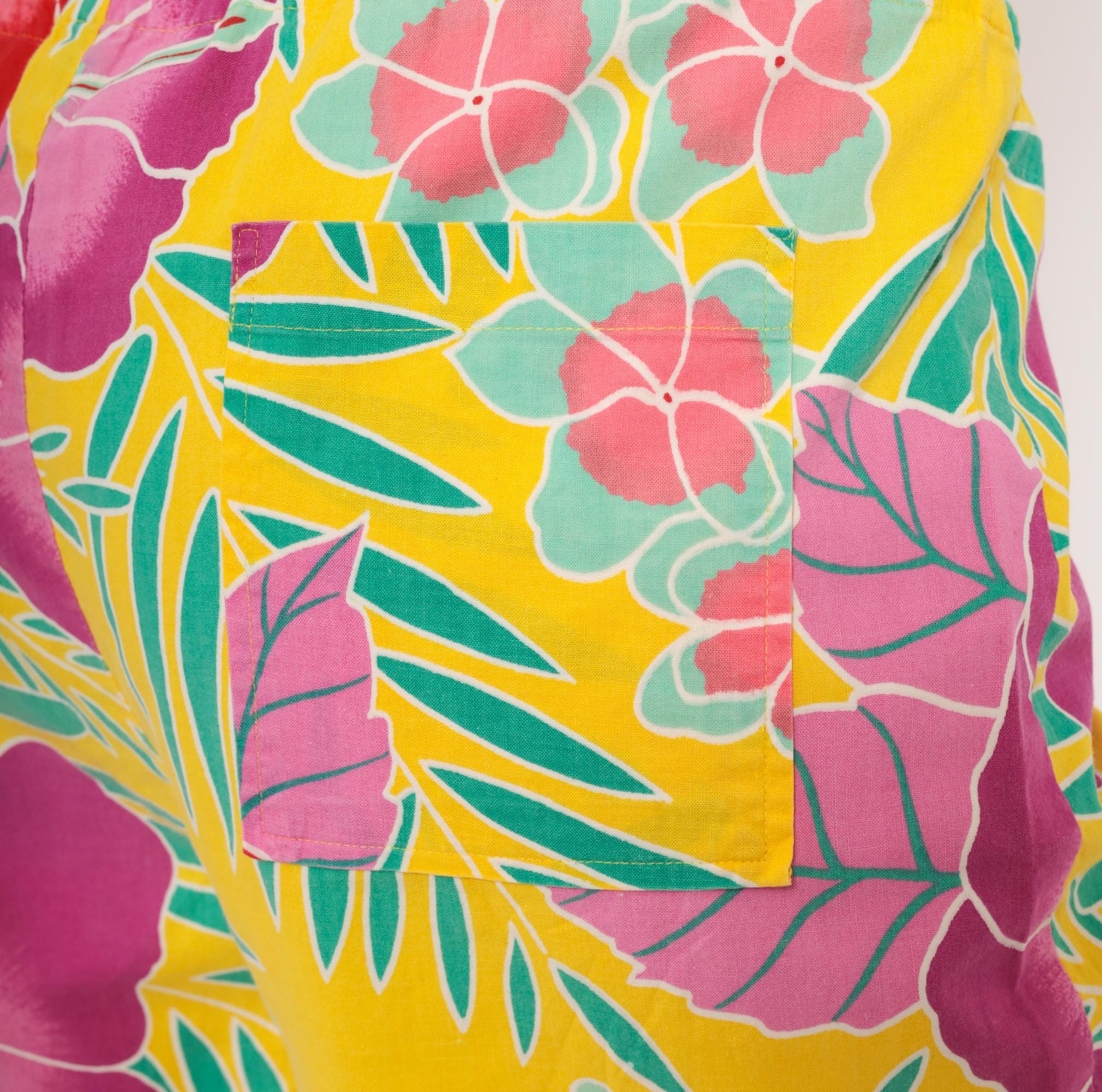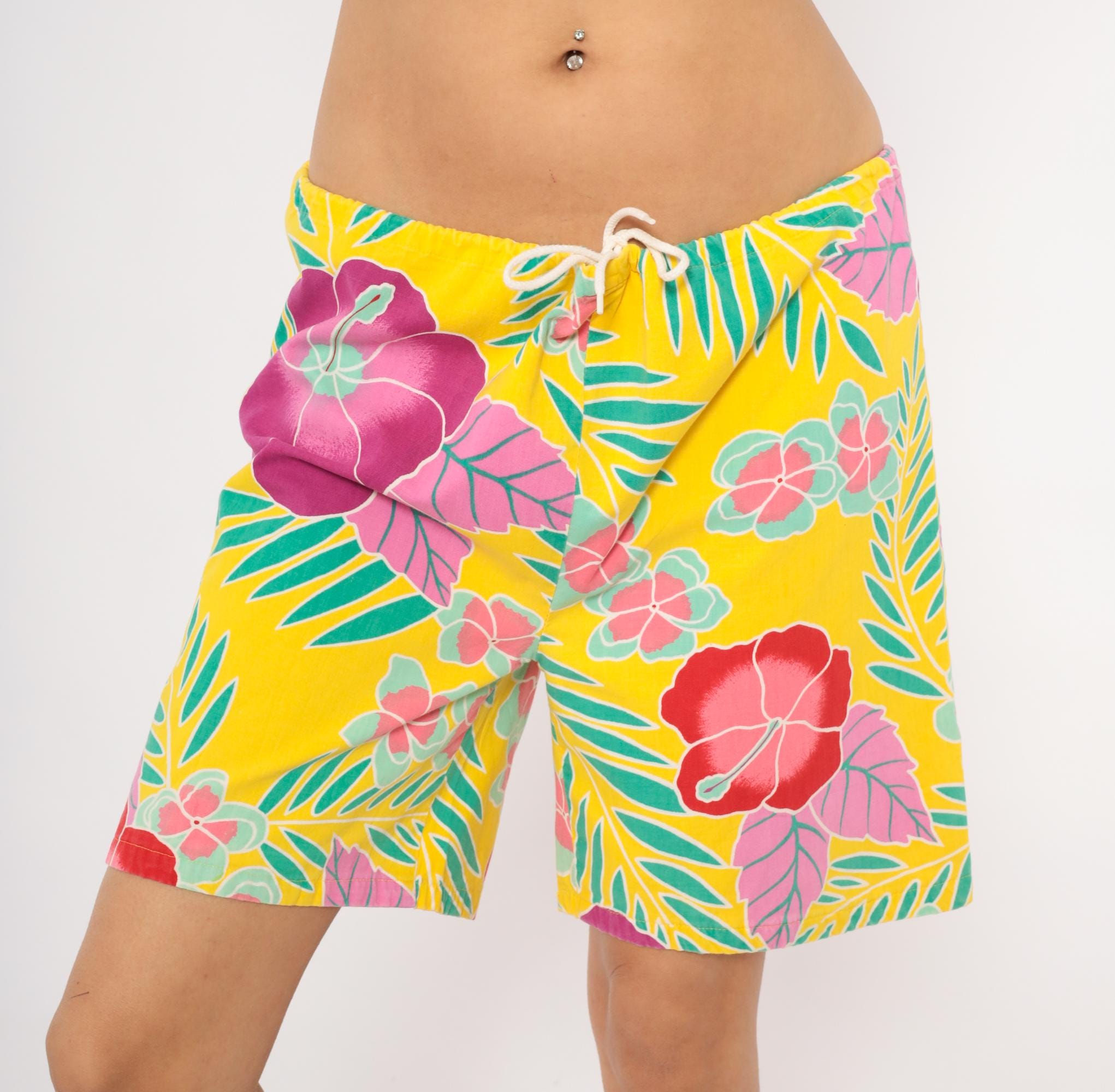 90s Hawaiian-style board shorts from Beach Scene with a yellow base and allover tropical print of hibiscus flowers, palm fronds, and plumeria clusters in magenta, pink, red, and teal. Elastic drawstring waist with white cord tie, relaxed straight leg, and single patch pocket on the back right side.