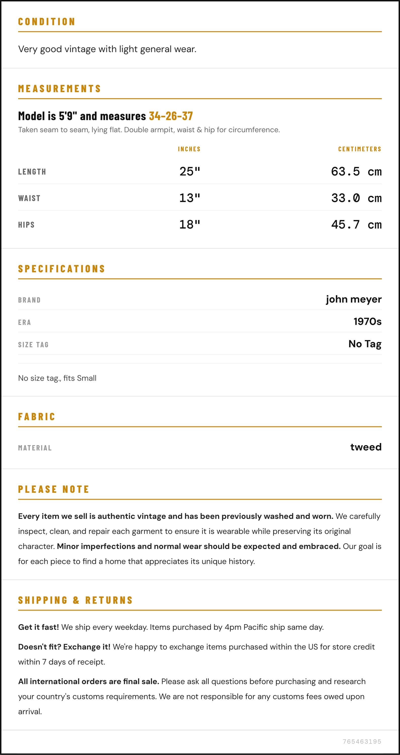 Vintage denim was usually made without any stretch, unlike modern jeans. Check the measurements to ensure proper fit, and remember to give yourself a little wiggle room in the waist and hips, depending on your preferred fit.