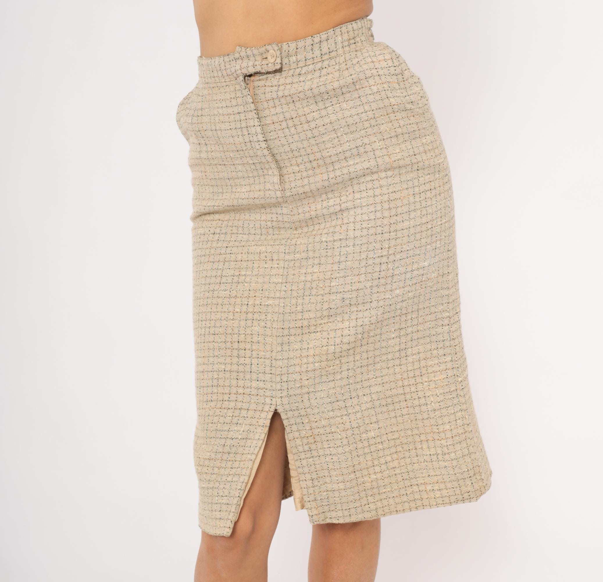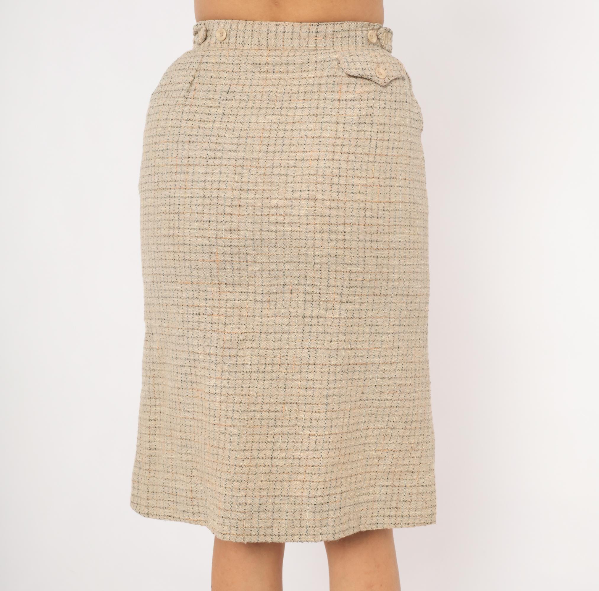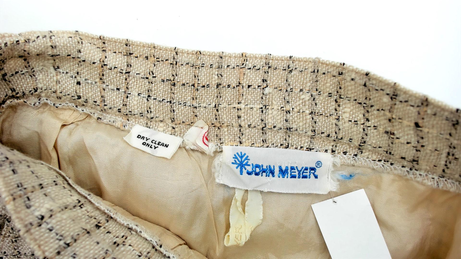 70s tweed pencil skirt from John Meyer in a tan and black woven check pattern with subtle warm-toned flecks throughout. Fitted waist with button tab detail and decorative buttons at the back waistband, front zipper closure, and side seam pockets. Front center slit at the hem, knee length, with a straight silhouette that tapers slightly through the hips.