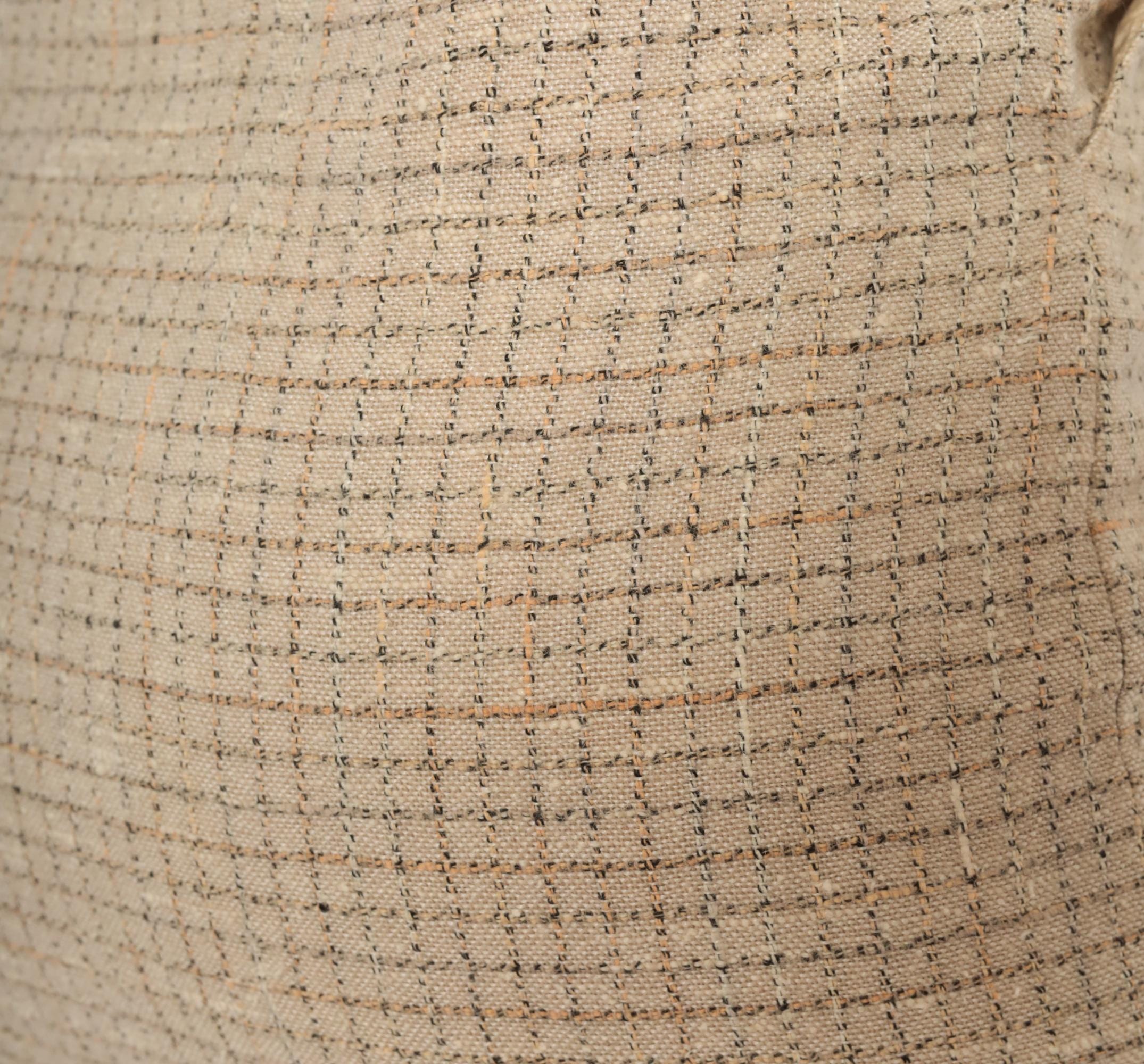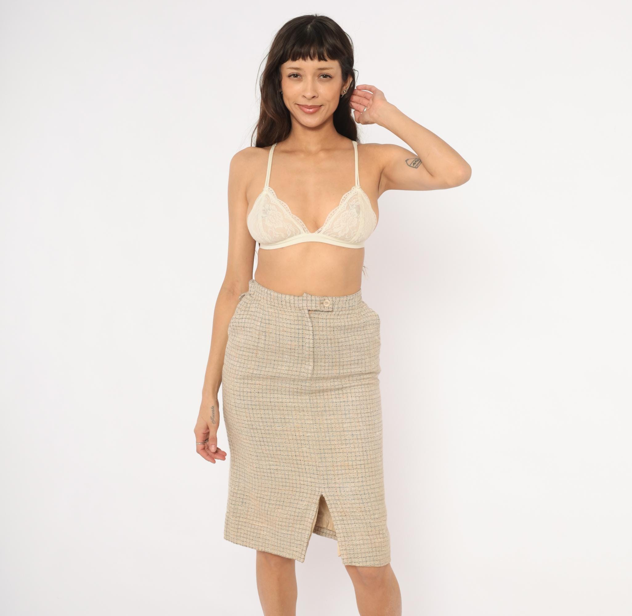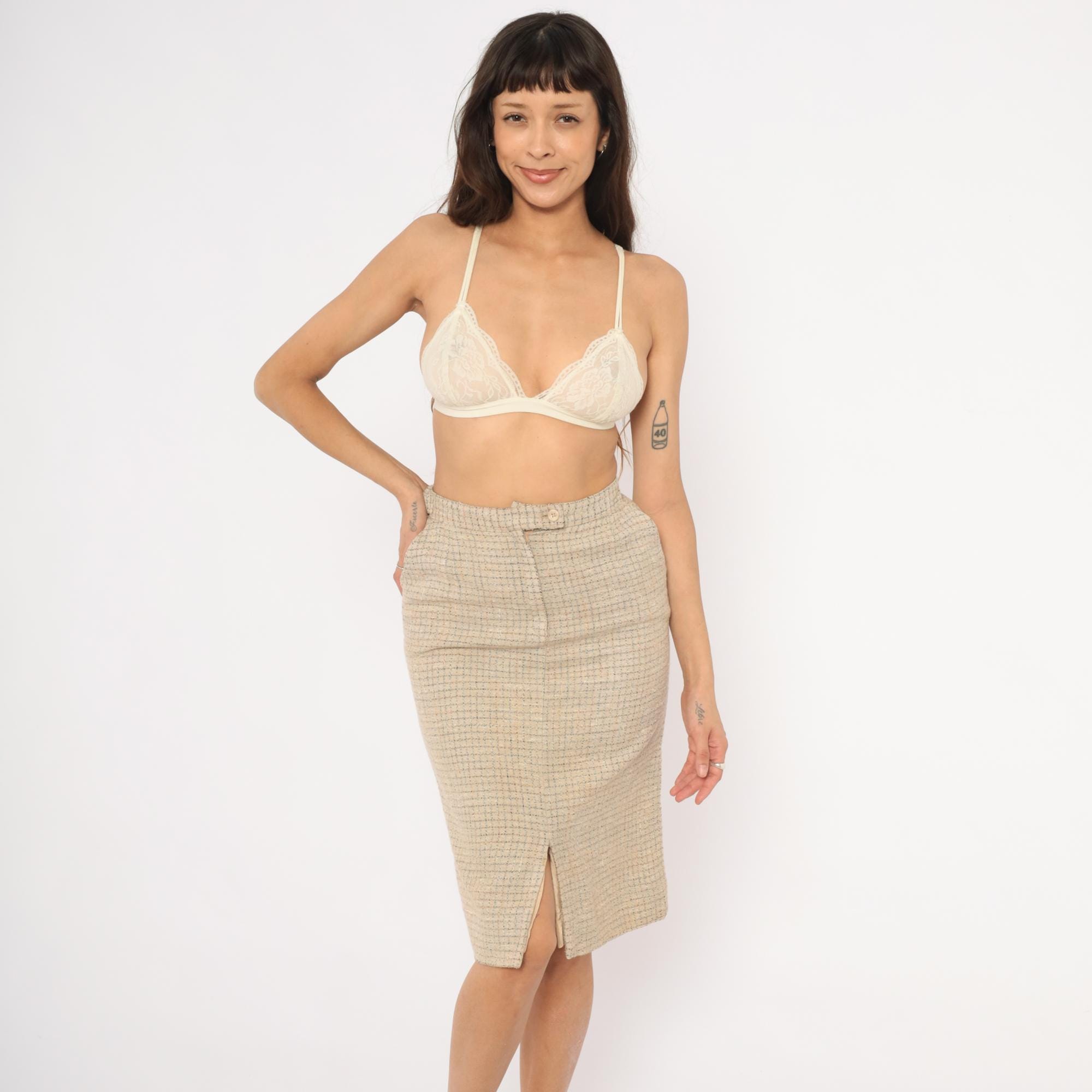 70s tweed pencil skirt from John Meyer in a tan and black woven check pattern with subtle warm-toned flecks throughout. Fitted waist with button tab detail and decorative buttons at the back waistband, front zipper closure, and side seam pockets. Front center slit at the hem, knee length, with a straight silhouette that tapers slightly through the hips.