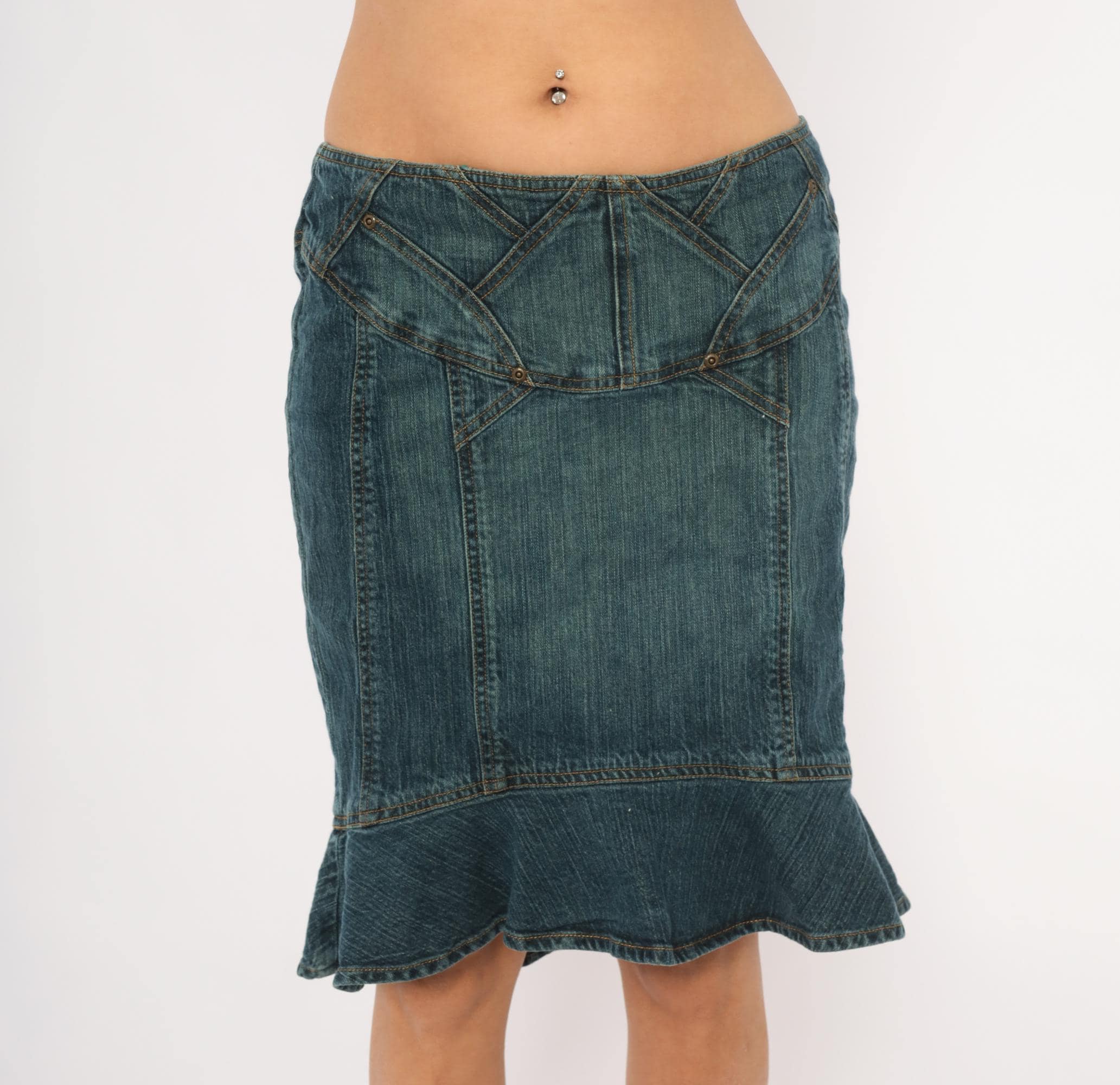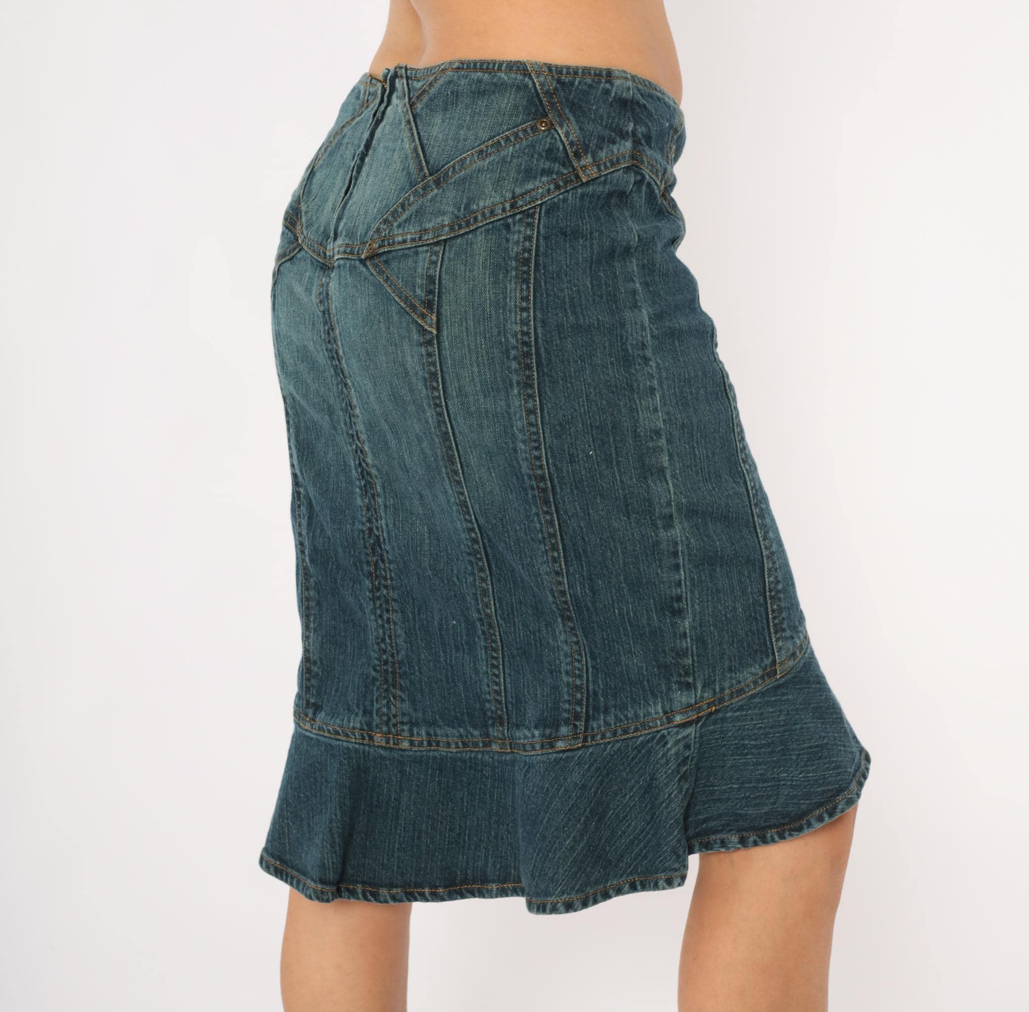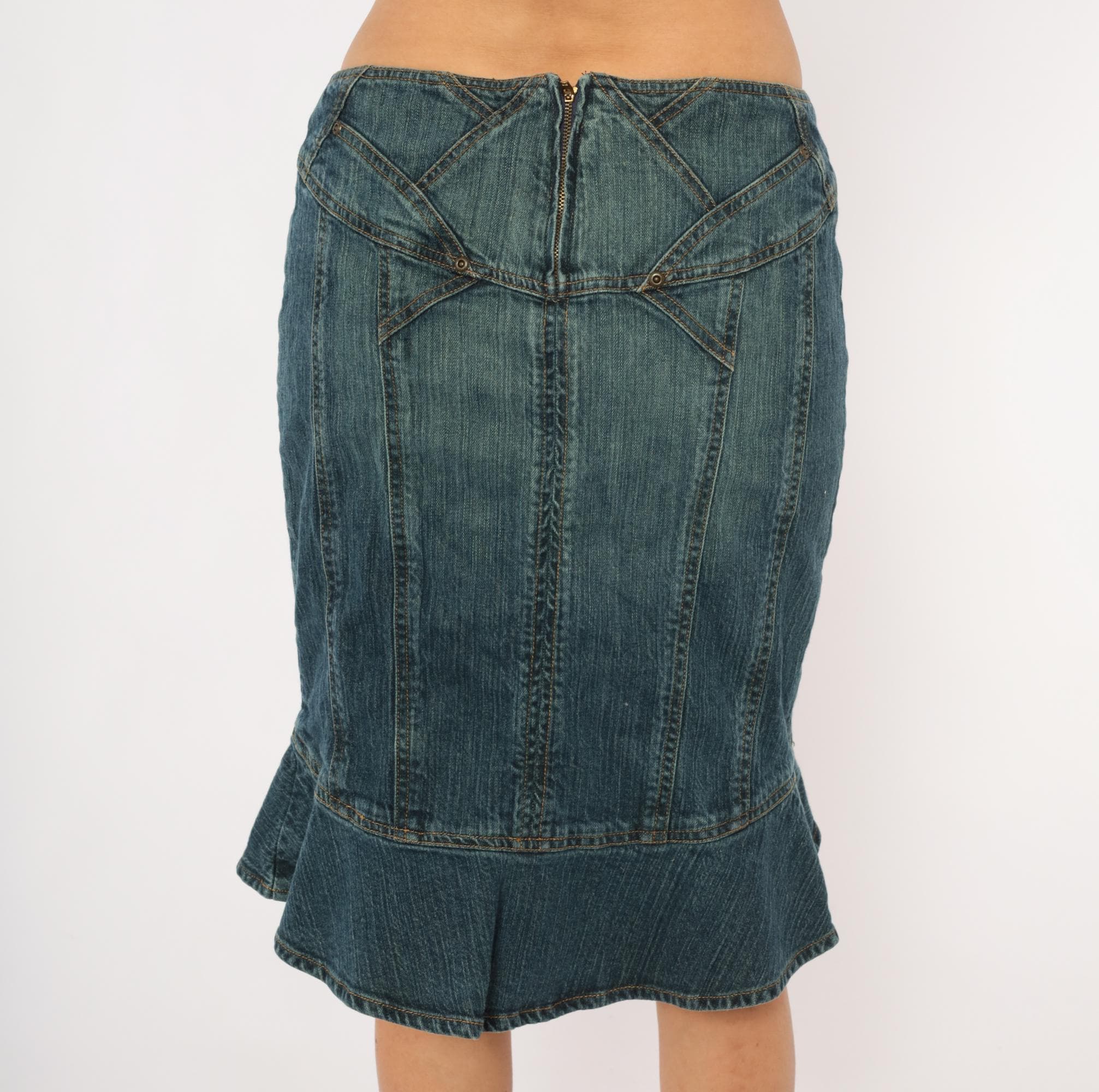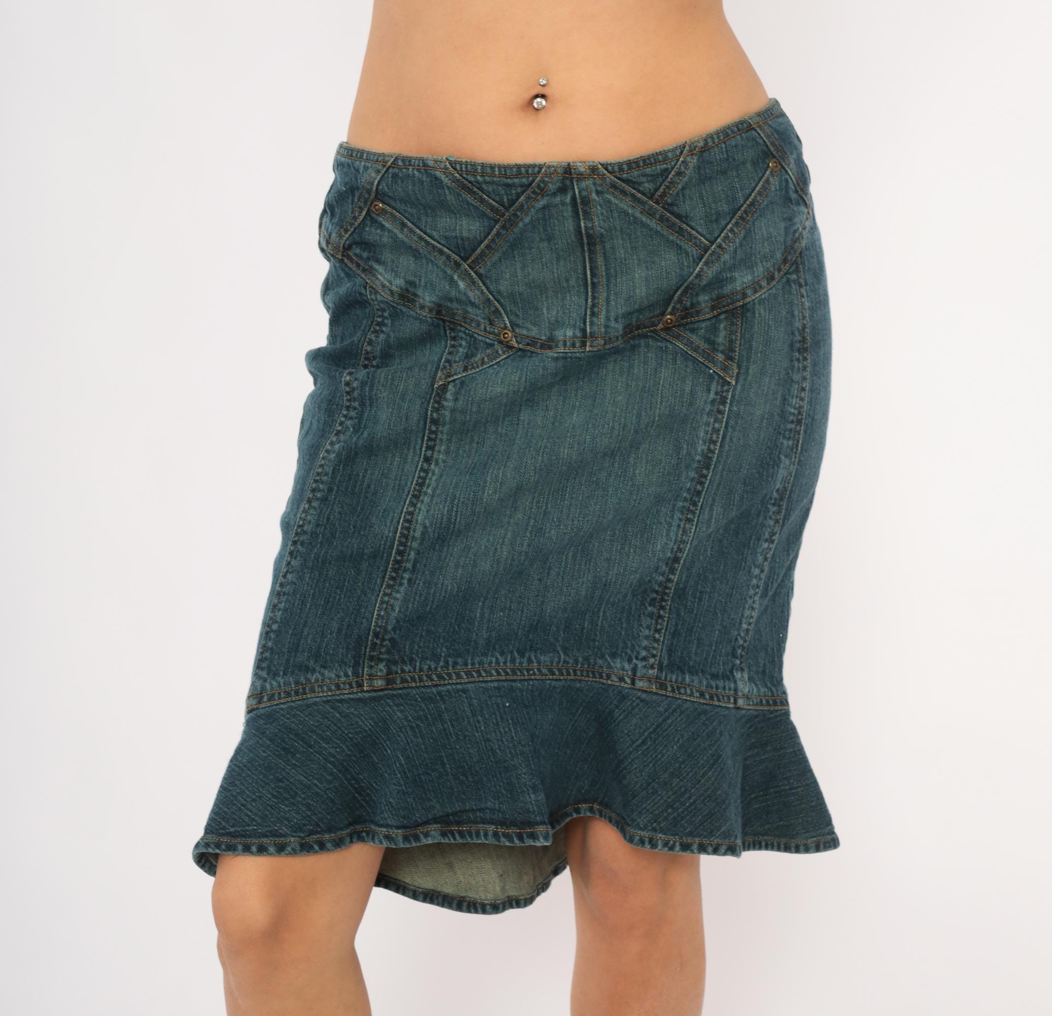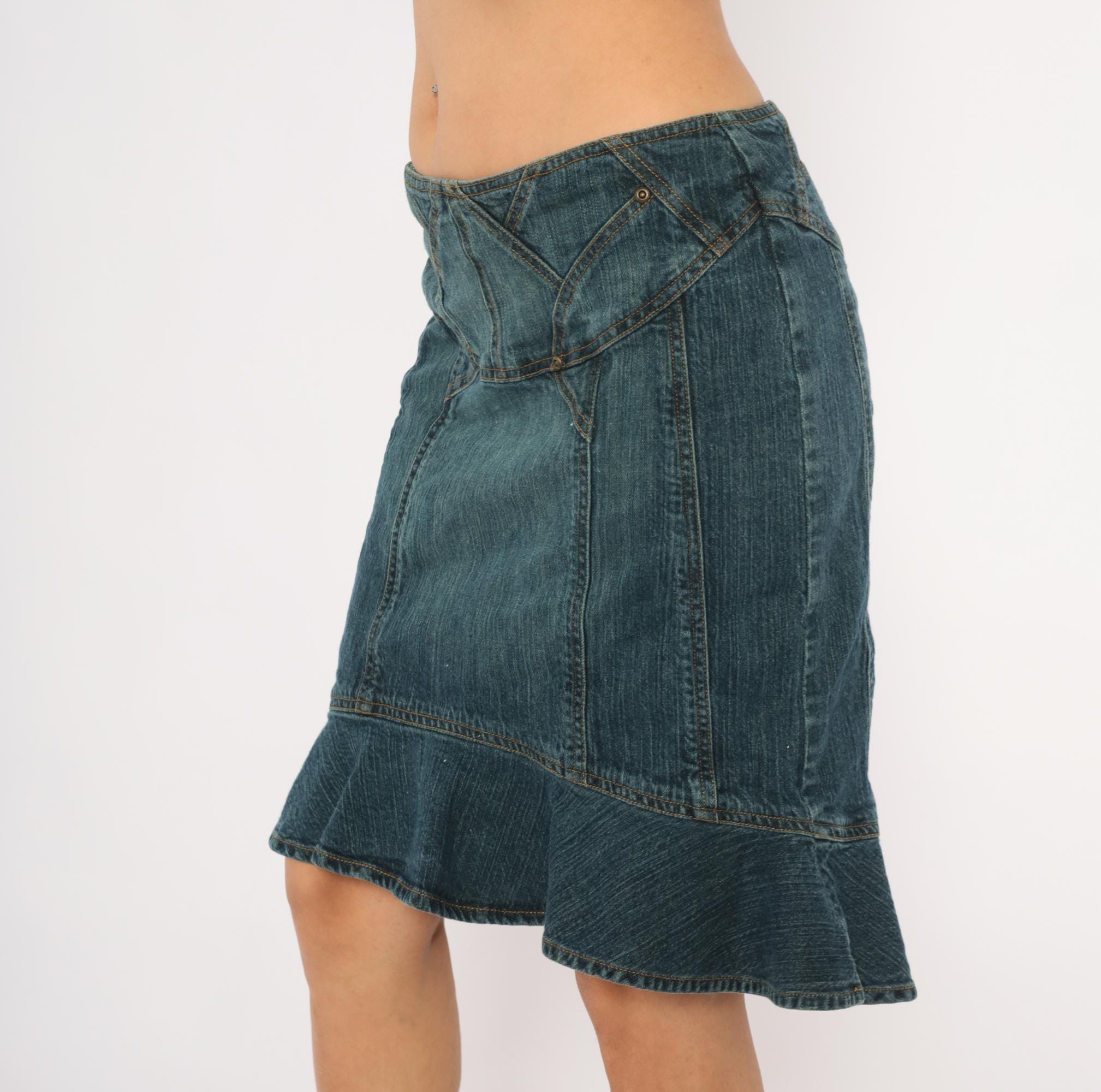 2000s denim skirt from Jones Wear Jeans with a fitted body and flounce ruffle hem at the bottom in a mermaid silhouette. Geometric paneled seam work across the yoke with decorative metal rivets and angular stitching lines. Back zipper closure, no pockets, and multiple vertical seaming throughout the body.