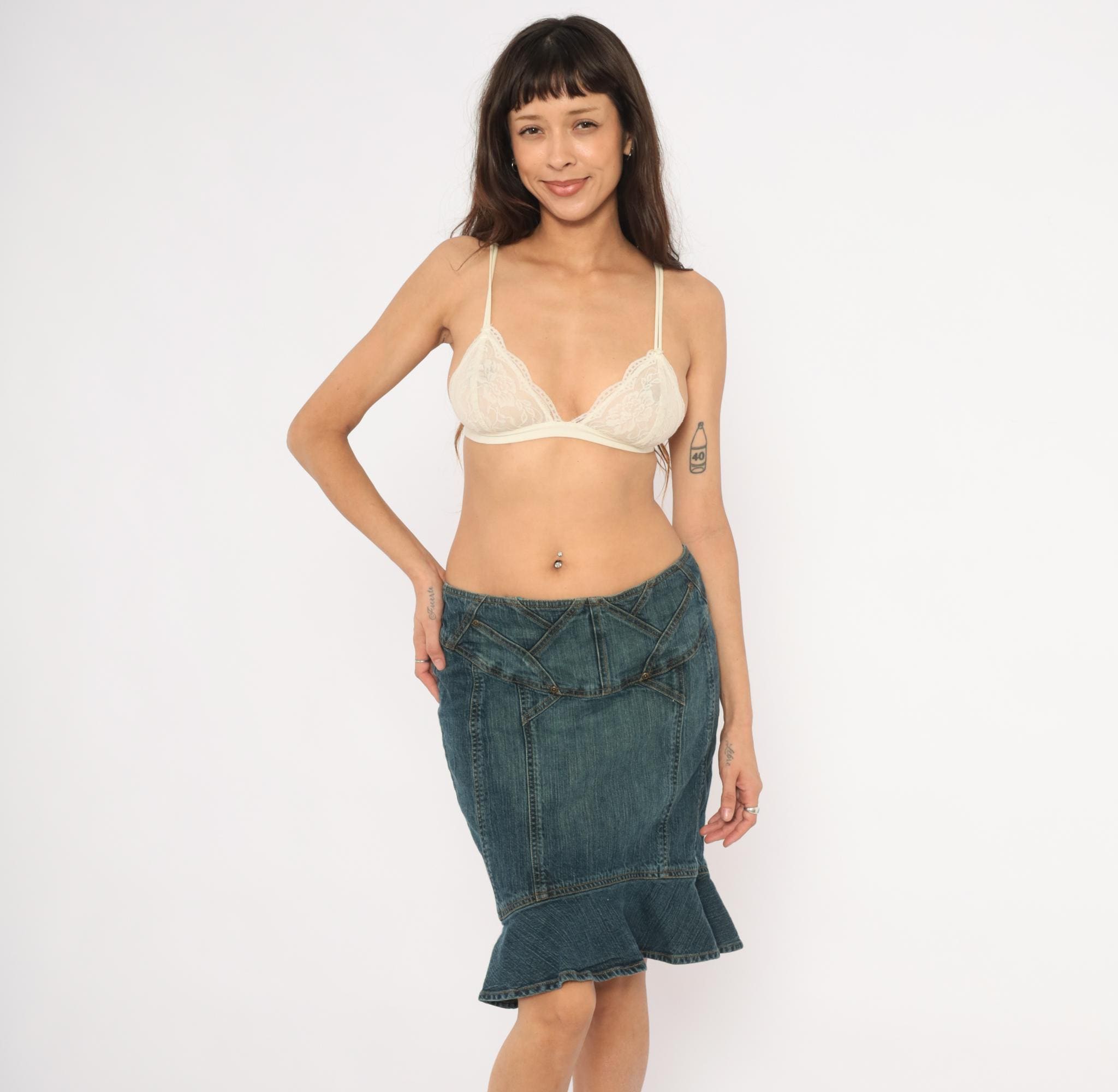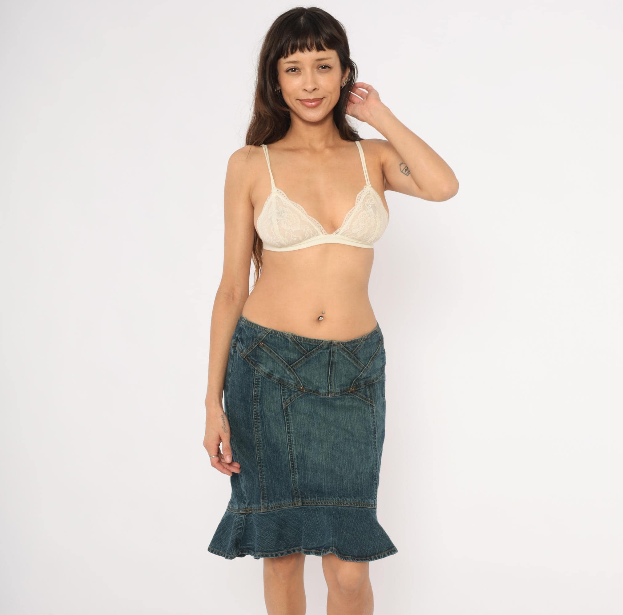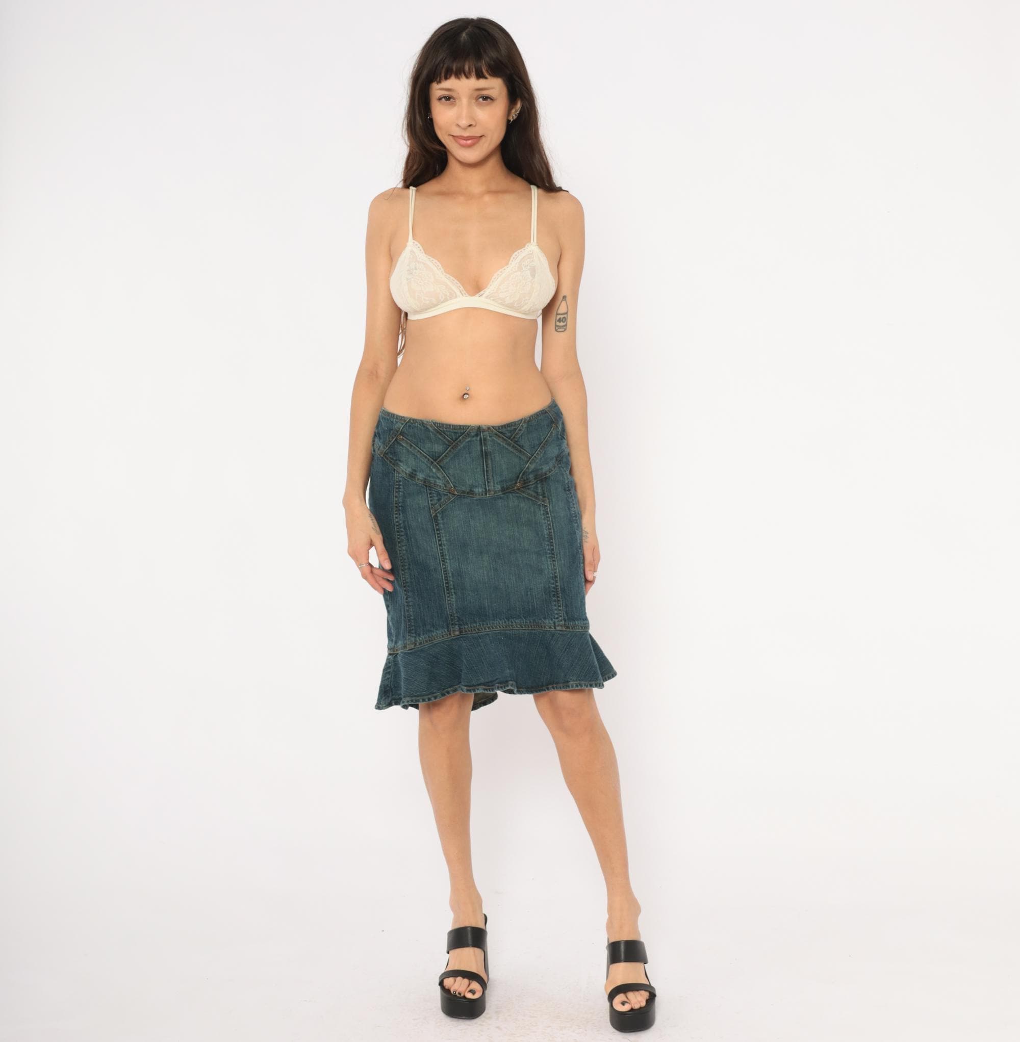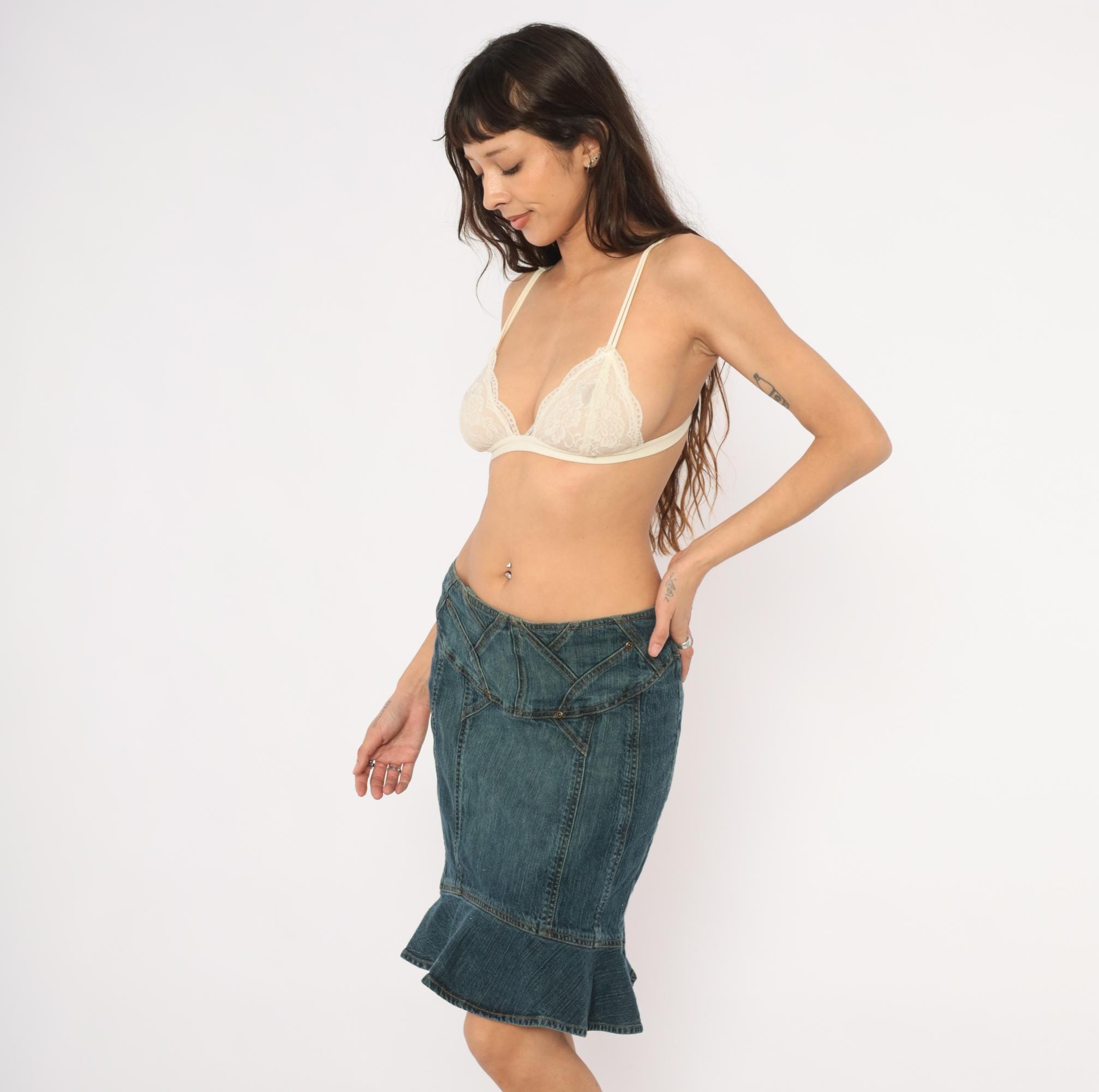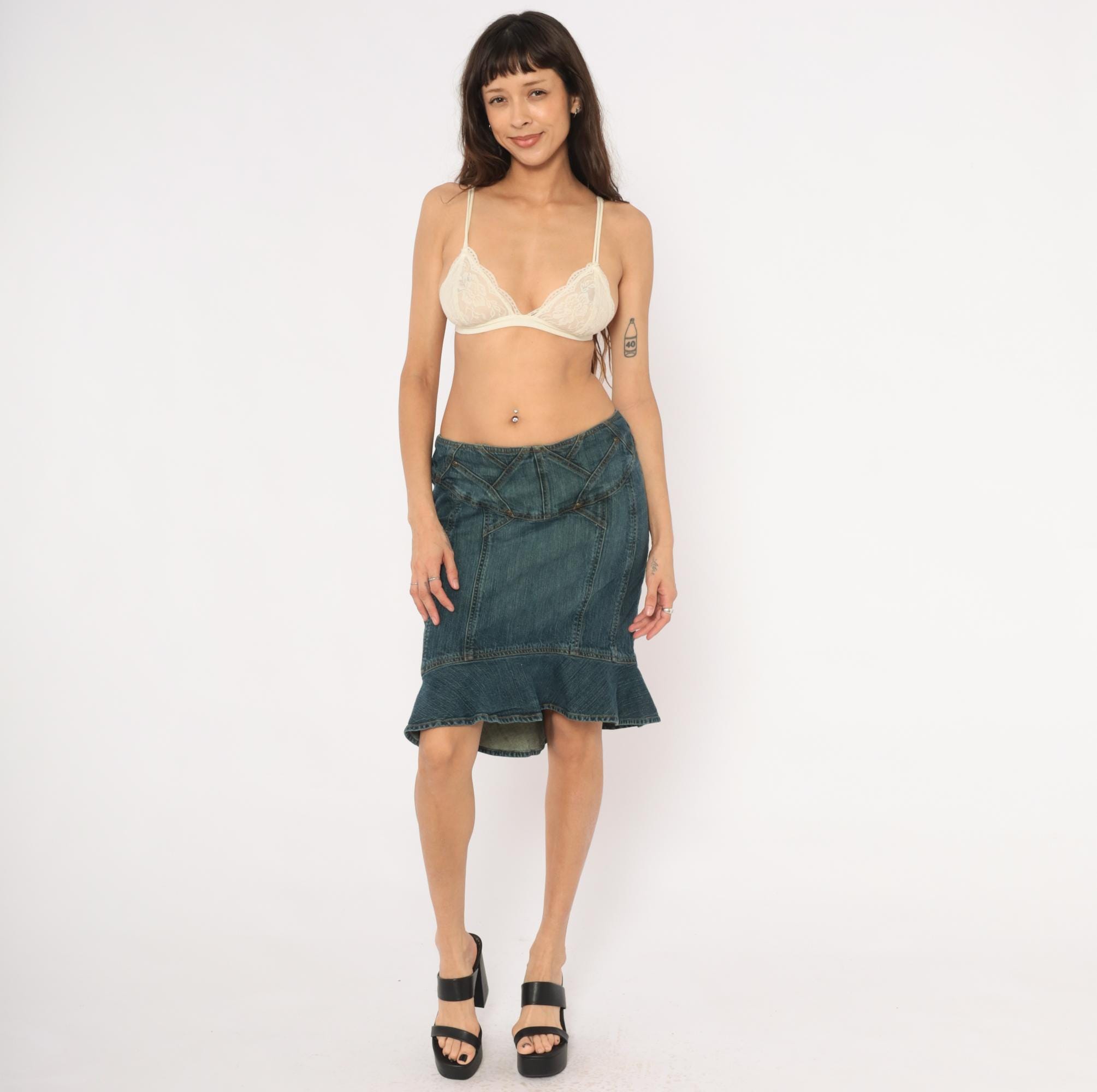 2000s denim skirt from Jones Wear Jeans with a fitted body and flounce ruffle hem at the bottom in a mermaid silhouette. Geometric paneled seam work across the yoke with decorative metal rivets and angular stitching lines. Back zipper closure, no pockets, and multiple vertical seaming throughout the body.