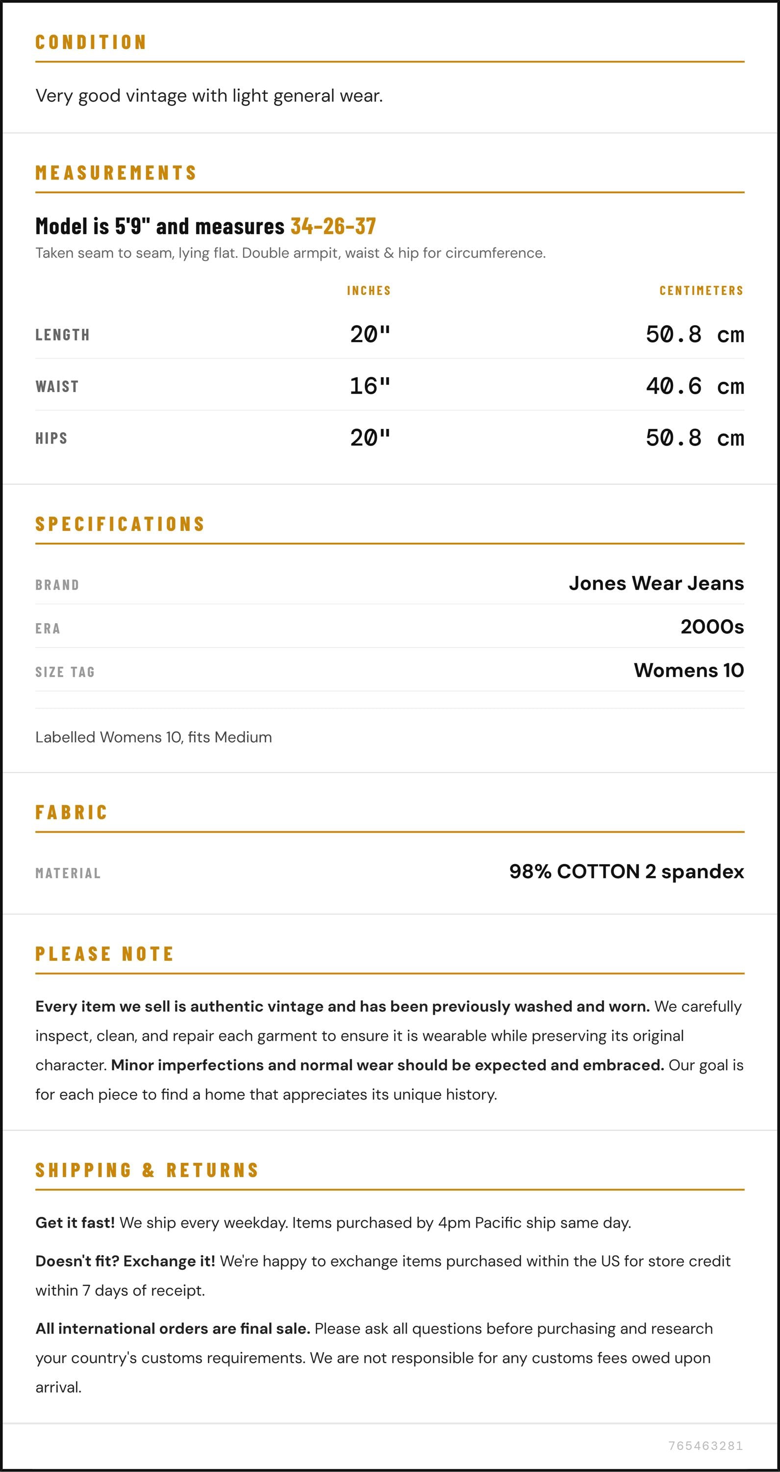 Vintage denim was usually made without any stretch, unlike modern jeans. Check the measurements to ensure proper fit, and remember to give yourself a little wiggle room in the waist and hips, depending on your preferred fit.