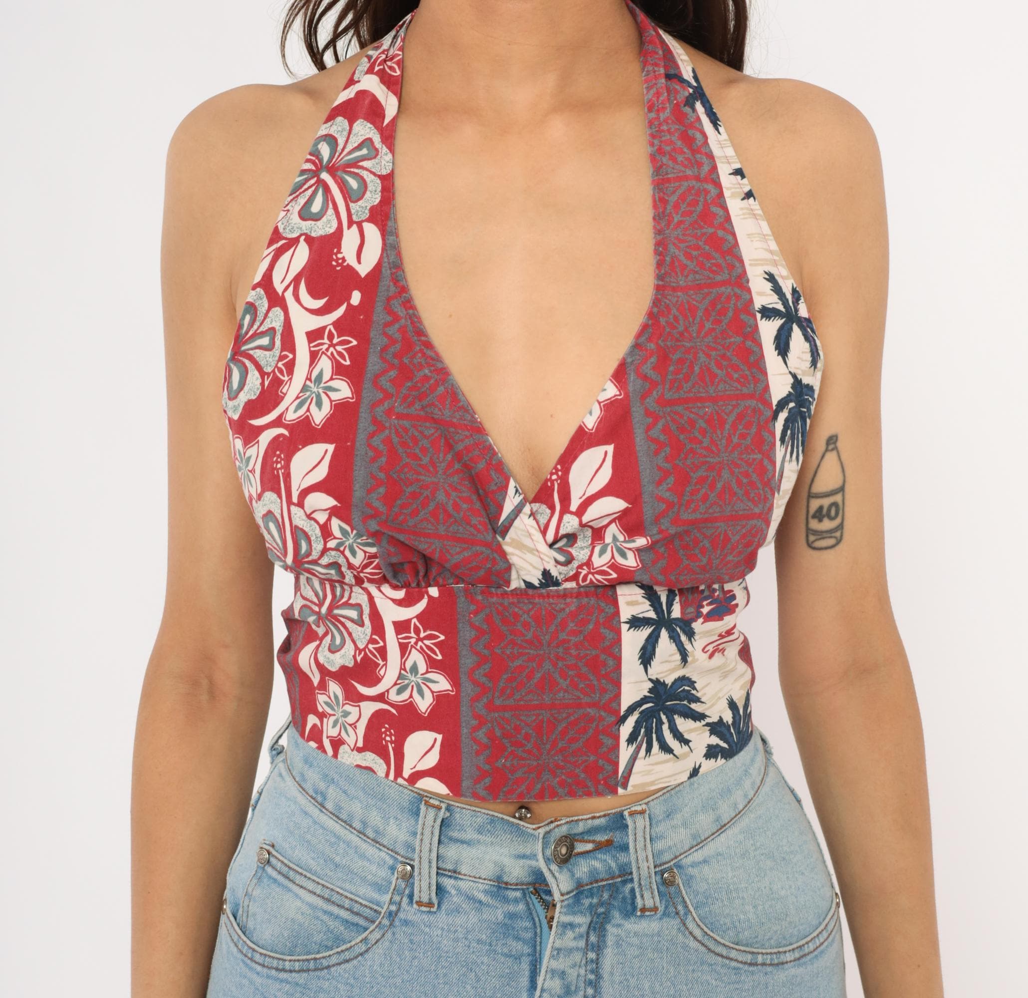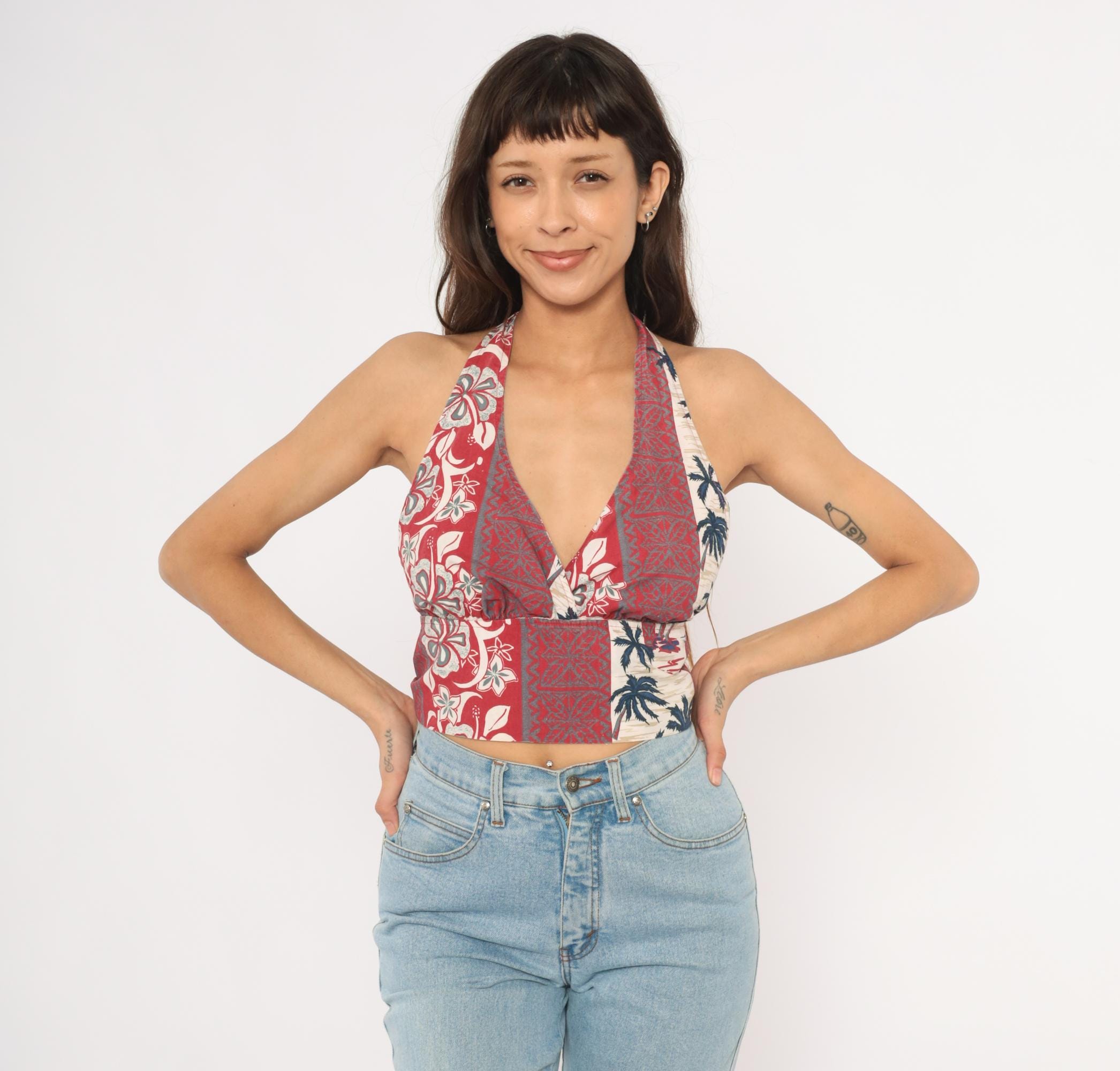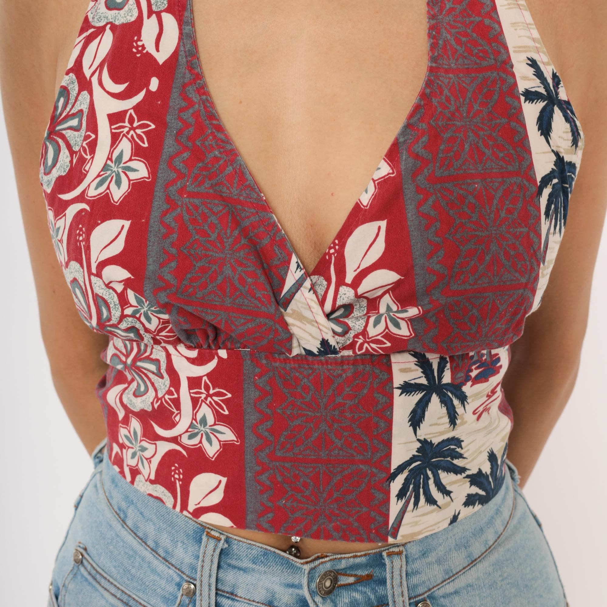 2000s Hawaiian halter crop top with a deep V plunge neckline and open back with rope tie closure at the neck and waist. Vertical panels of alternating tropical prints including hibiscus flowers, tiki-style geometric motifs, and palm tree silhouettes in red, navy, and cream.