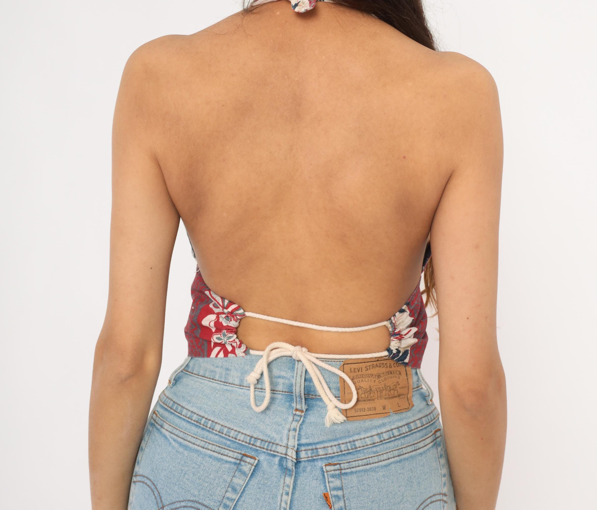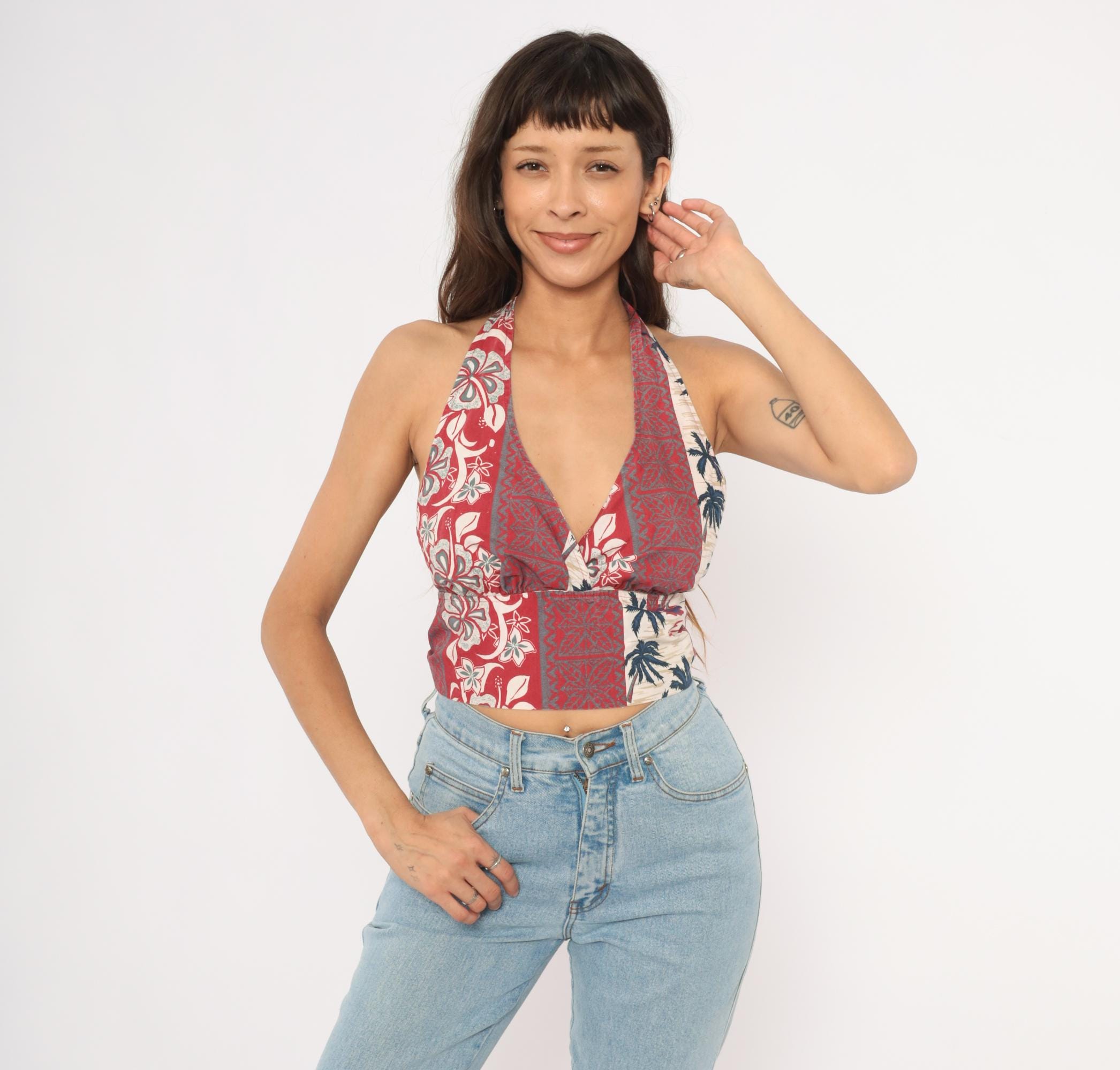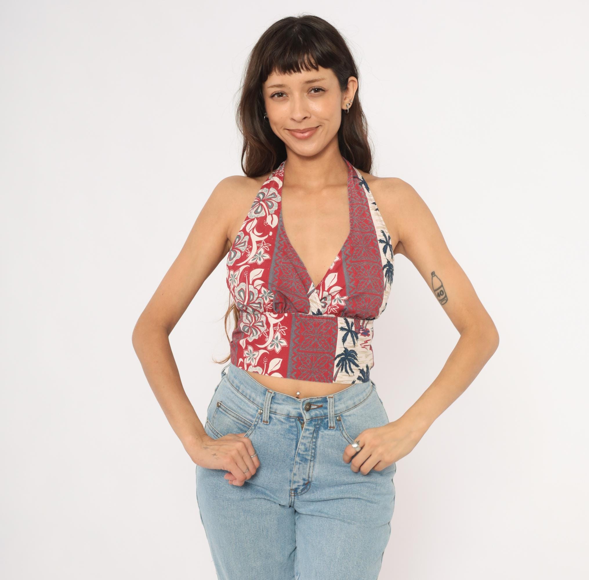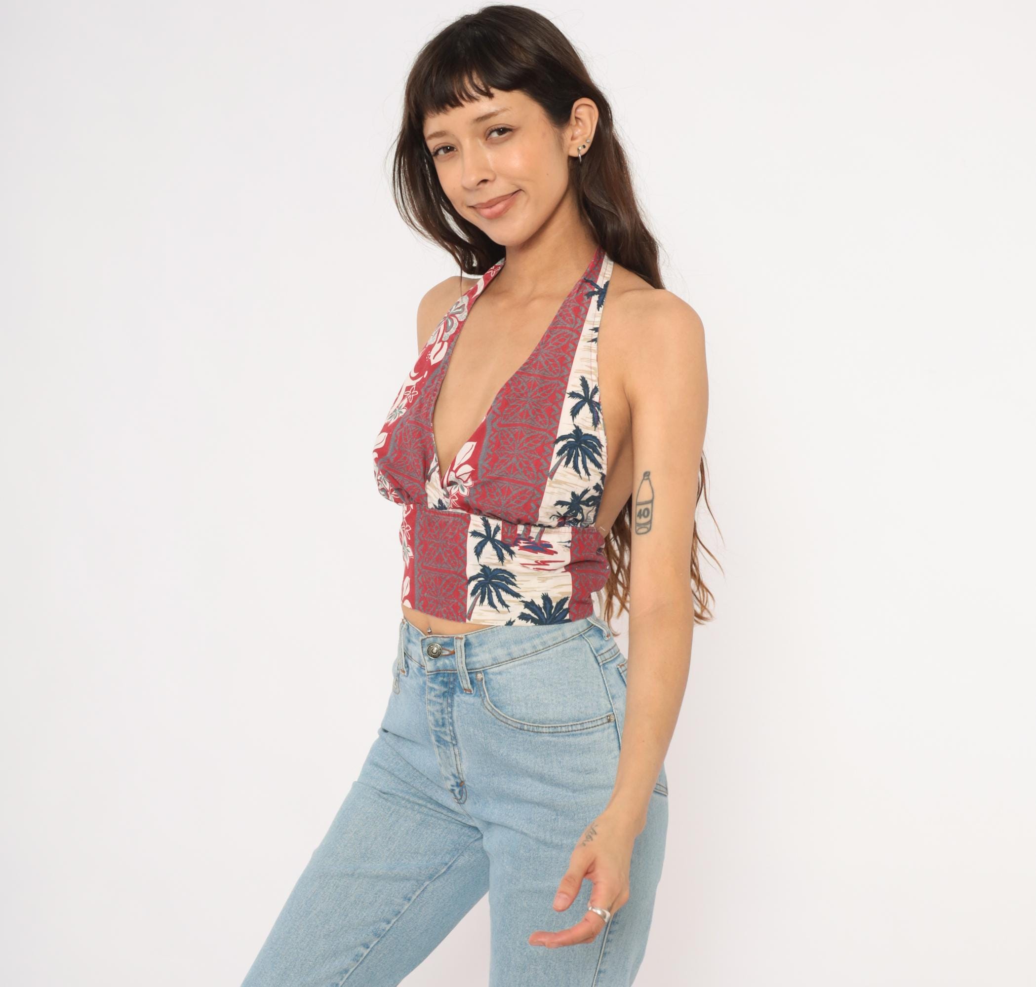 2000s Hawaiian halter crop top with a deep V plunge neckline and open back with rope tie closure at the neck and waist. Vertical panels of alternating tropical prints including hibiscus flowers, tiki-style geometric motifs, and palm tree silhouettes in red, navy, and cream.