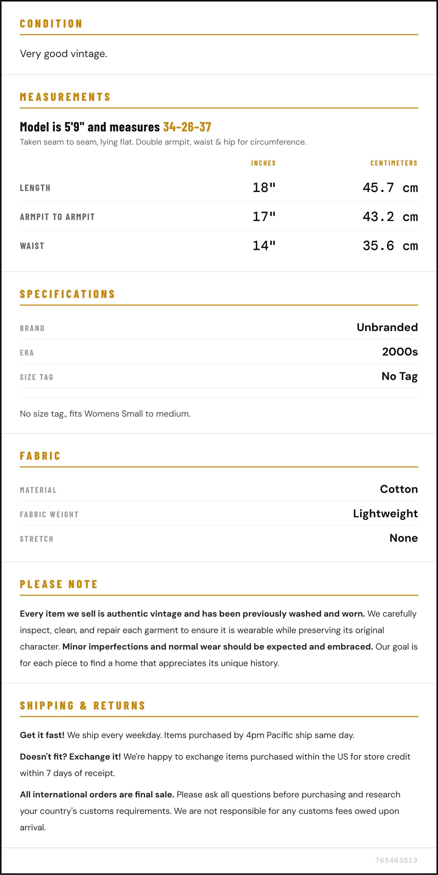 Vintage denim was usually made without any stretch, unlike modern jeans. Check the measurements to ensure proper fit, and remember to give yourself a little wiggle room in the waist and hips, depending on your preferred fit.
