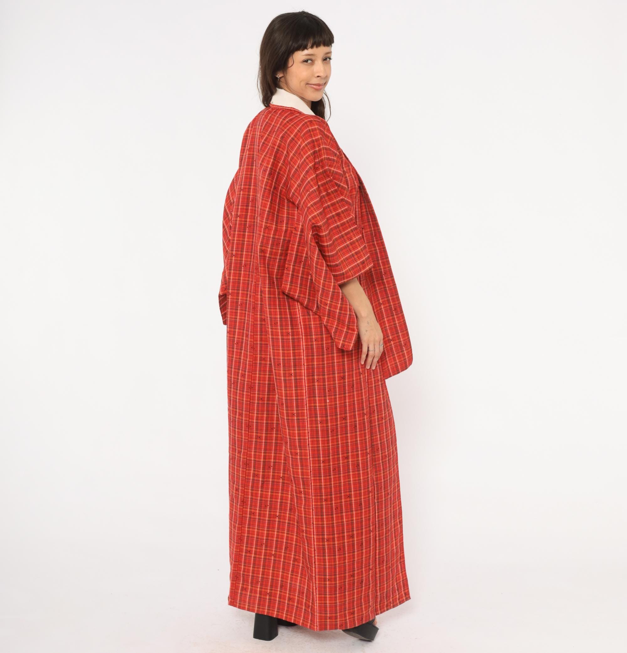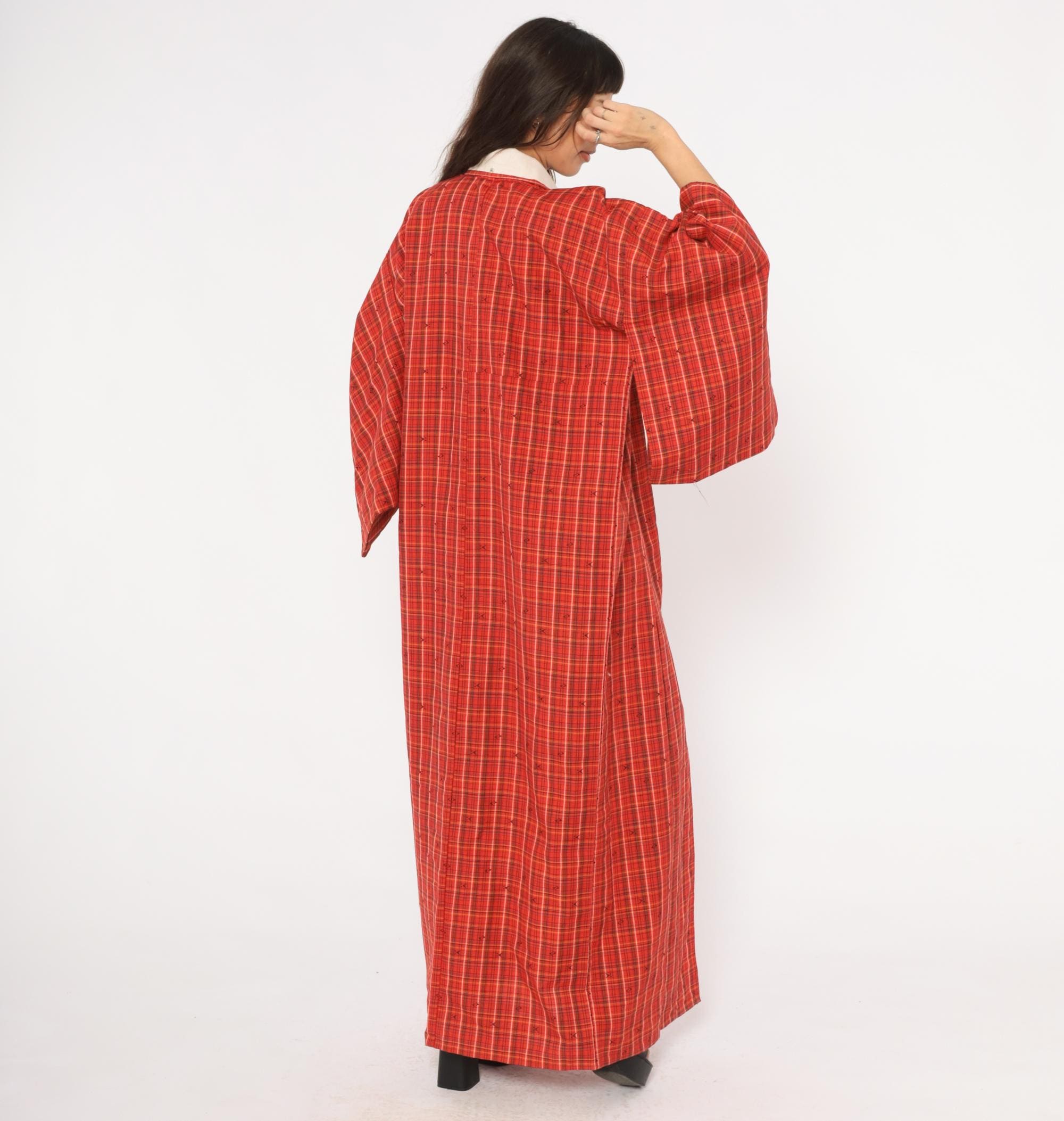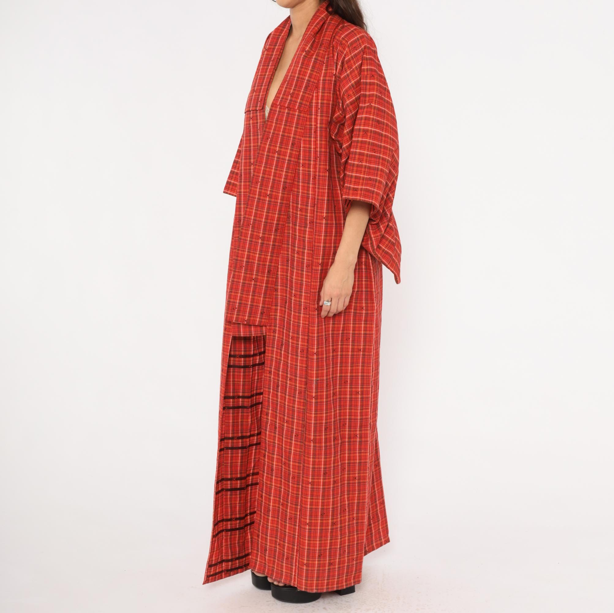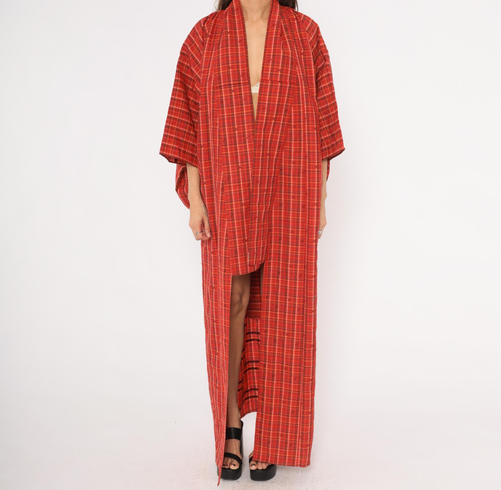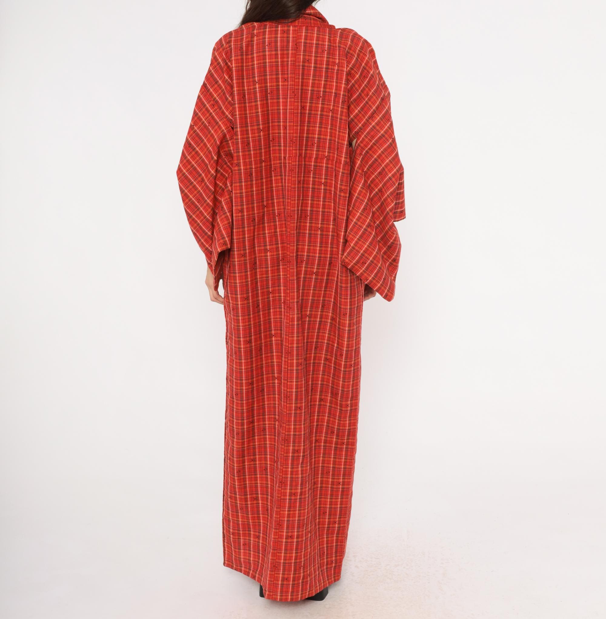 70s red plaid kimono robe in a tartan check pattern with olive, black, white, and yellow lines throughout. Open front with no closures, wide half-length sleeves, and a floor-length cut. Small woven arrow-like motifs are scattered across the fabric between the plaid lines. A contrasting darker striped panel sits at the lower side near the hem.