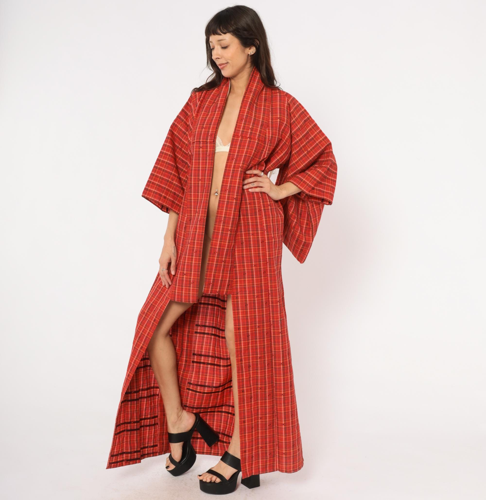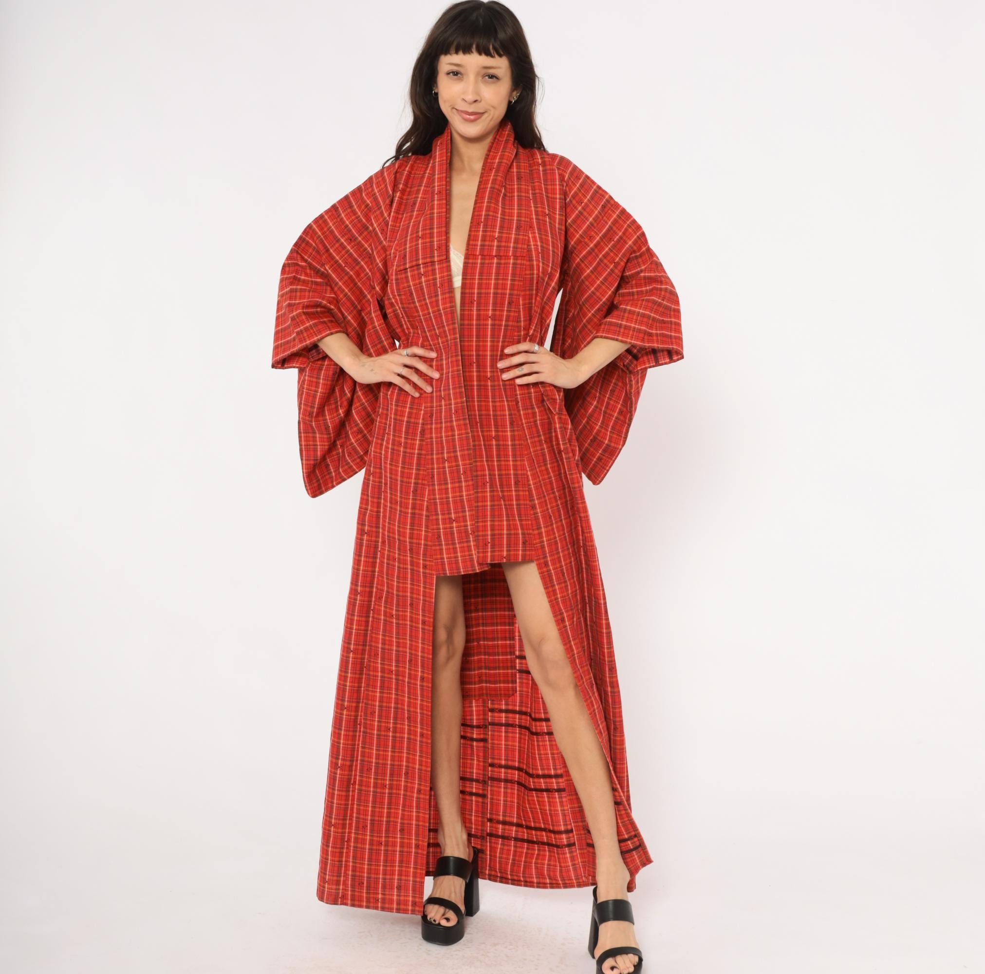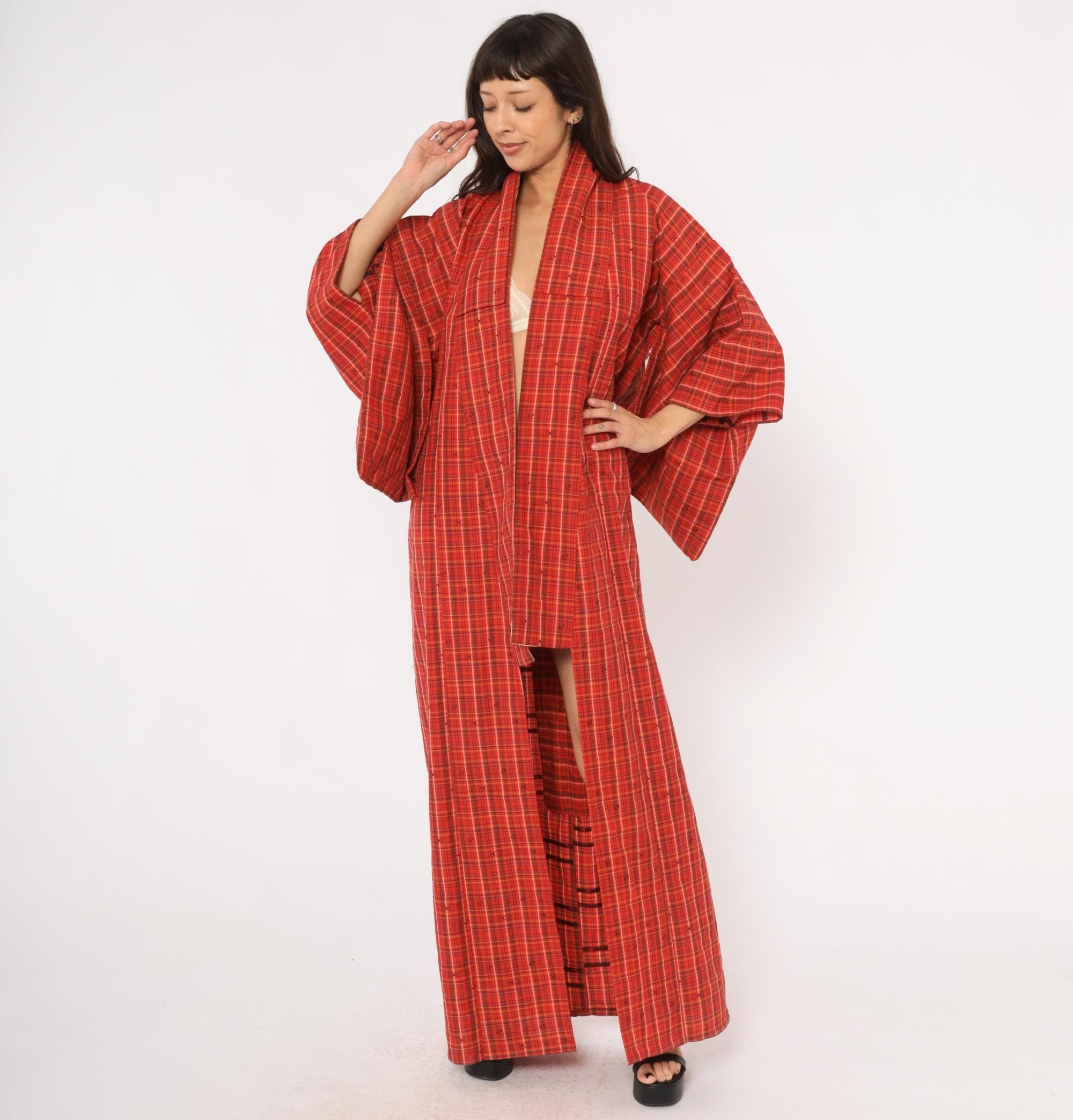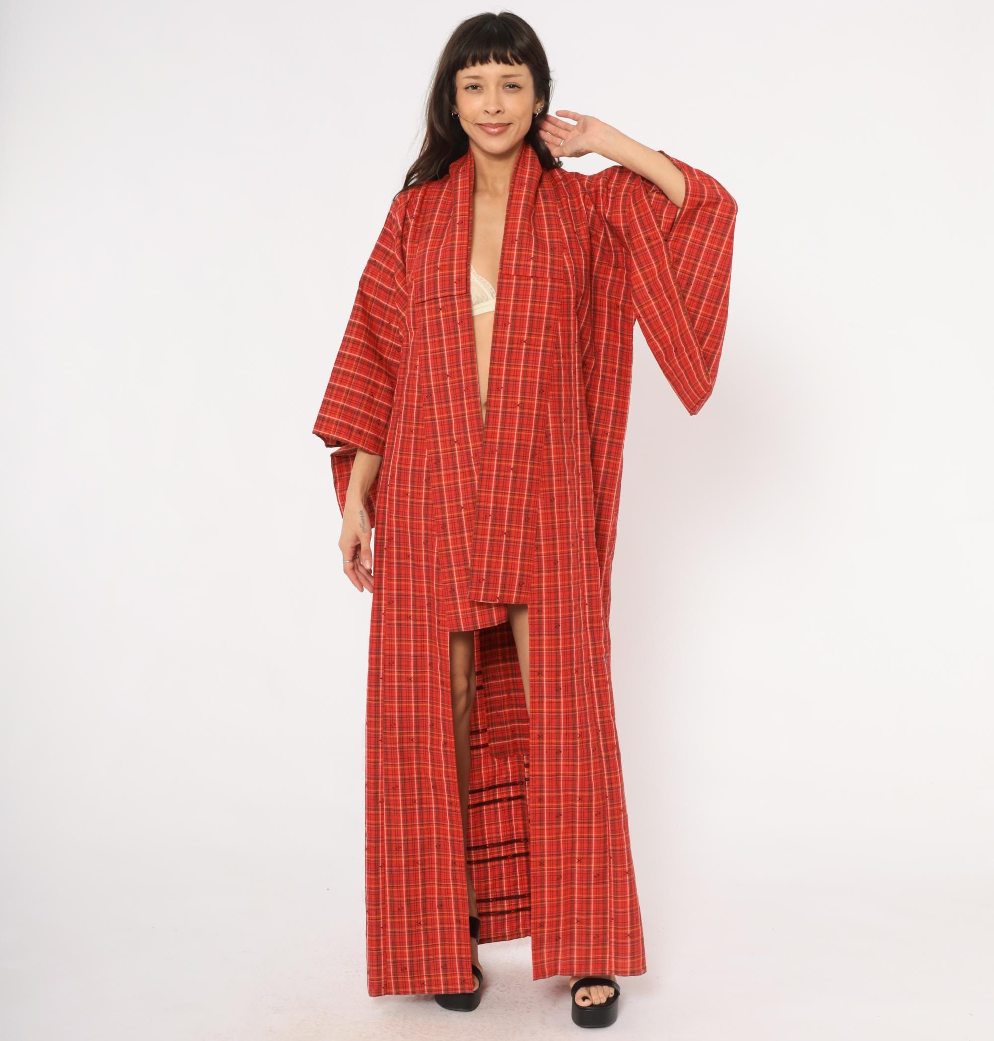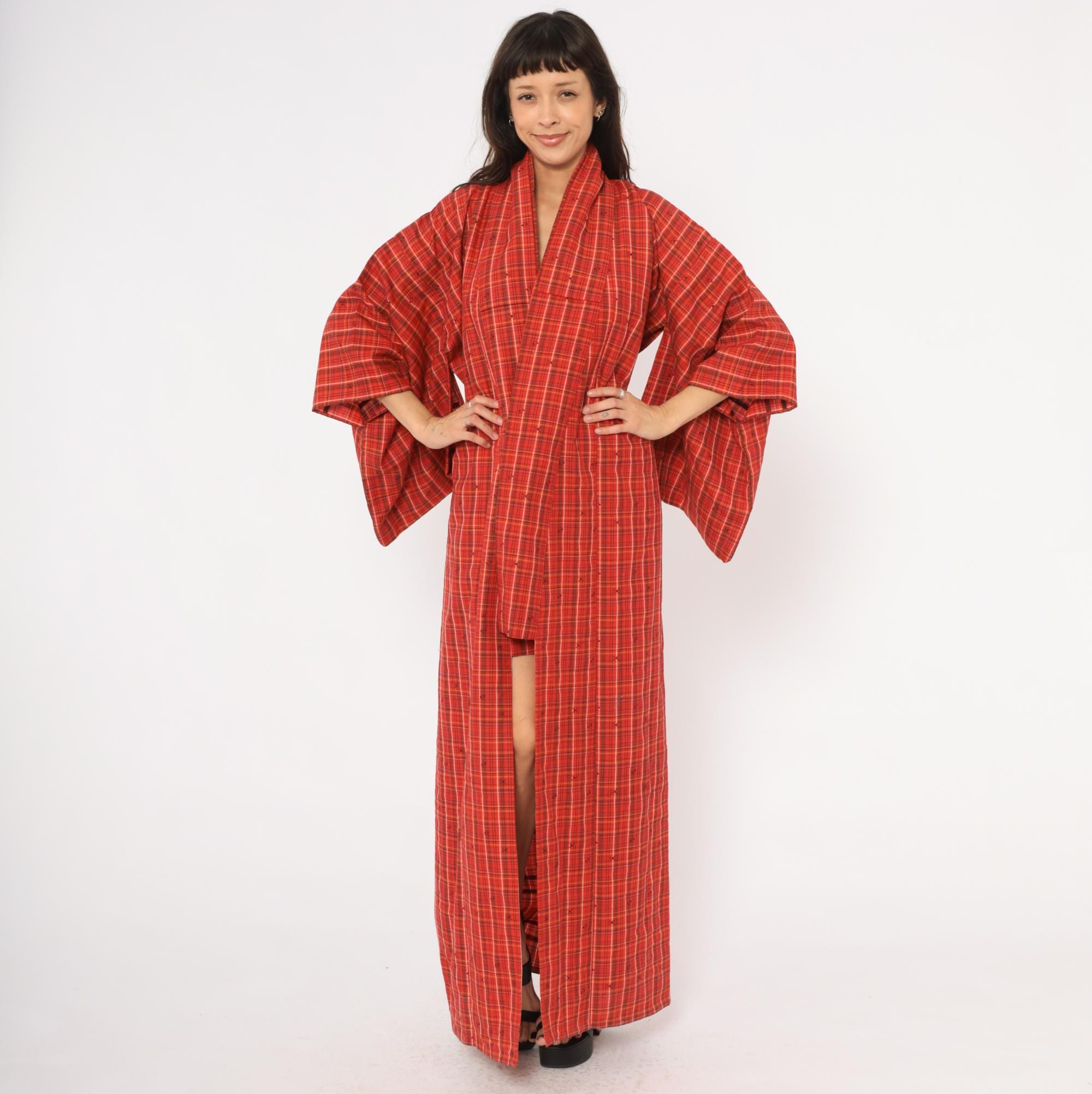 70s red plaid kimono robe in a tartan check pattern with olive, black, white, and yellow lines throughout. Open front with no closures, wide half-length sleeves, and a floor-length cut. Small woven arrow-like motifs are scattered across the fabric between the plaid lines. A contrasting darker striped panel sits at the lower side near the hem.