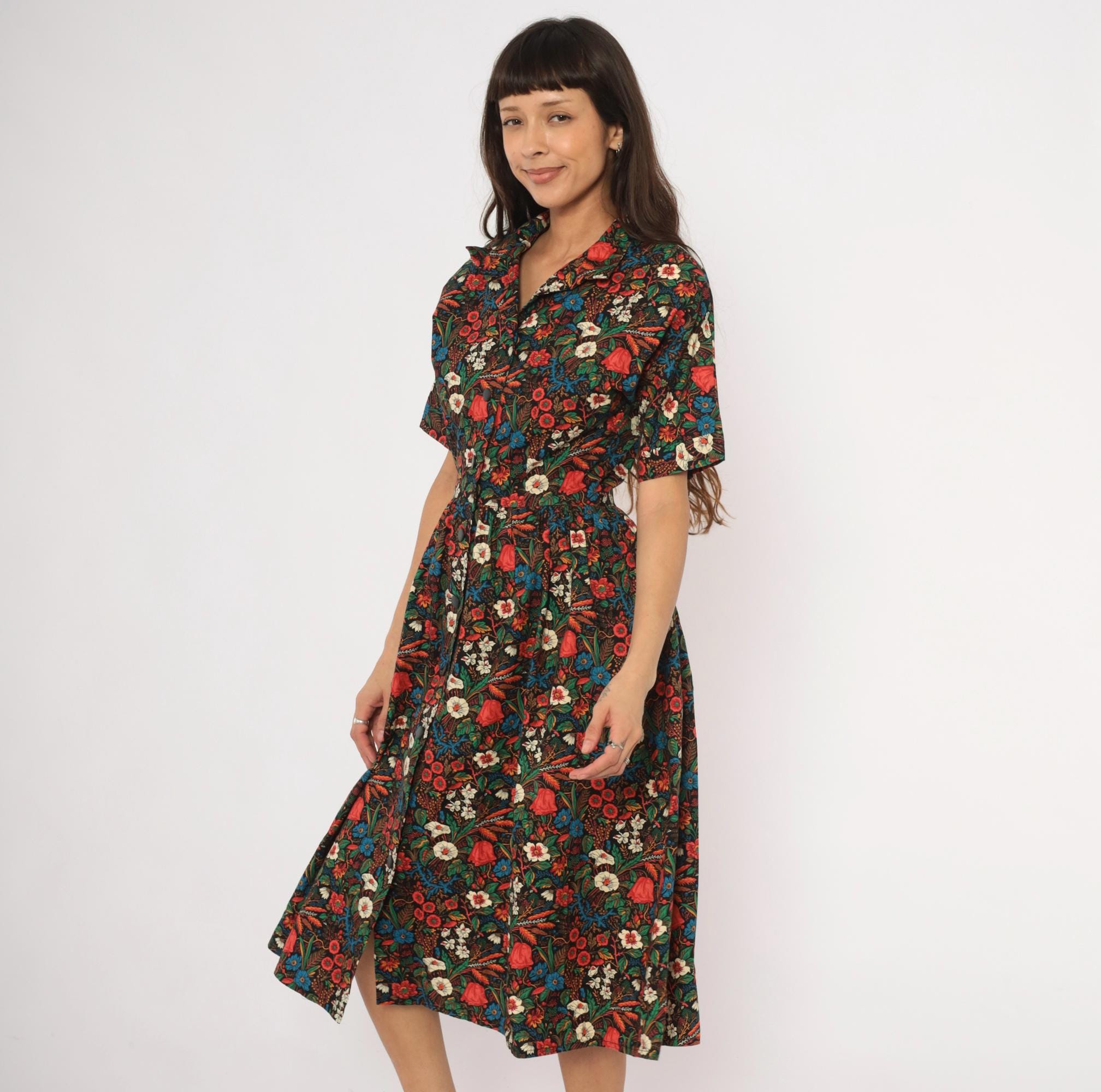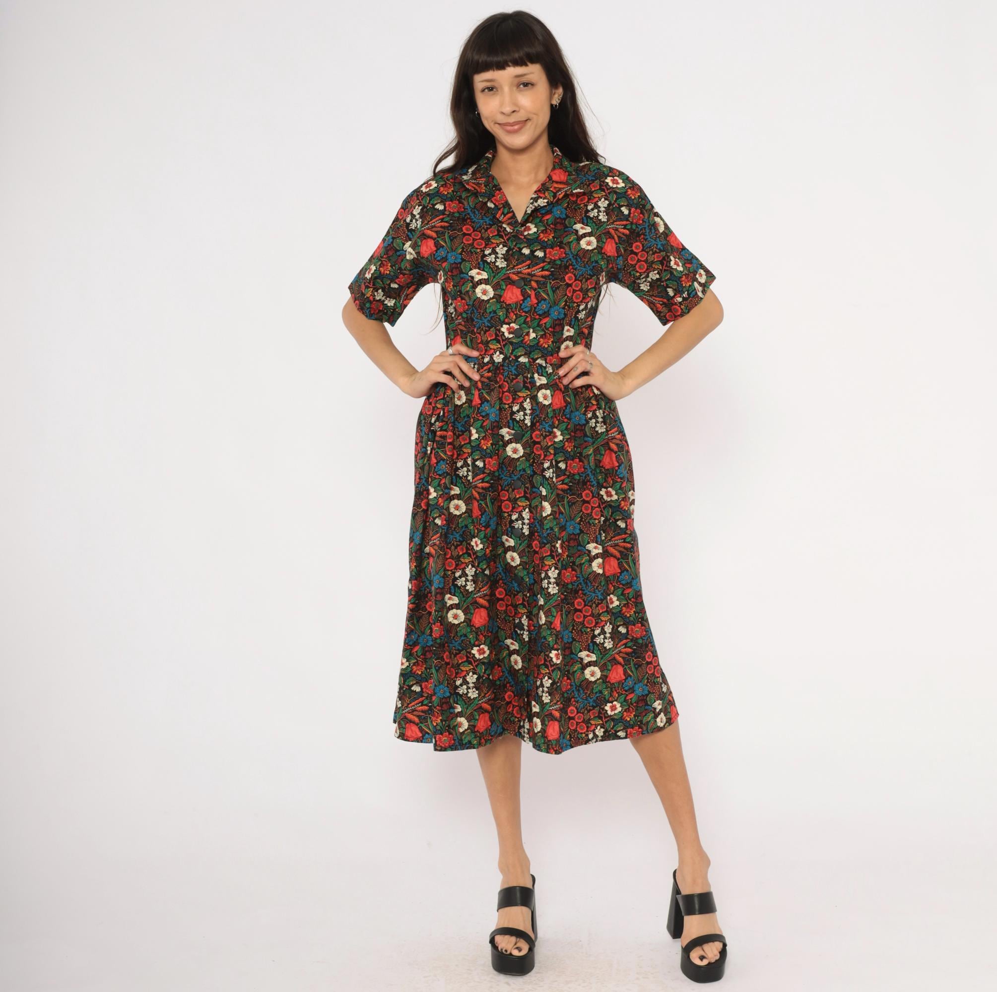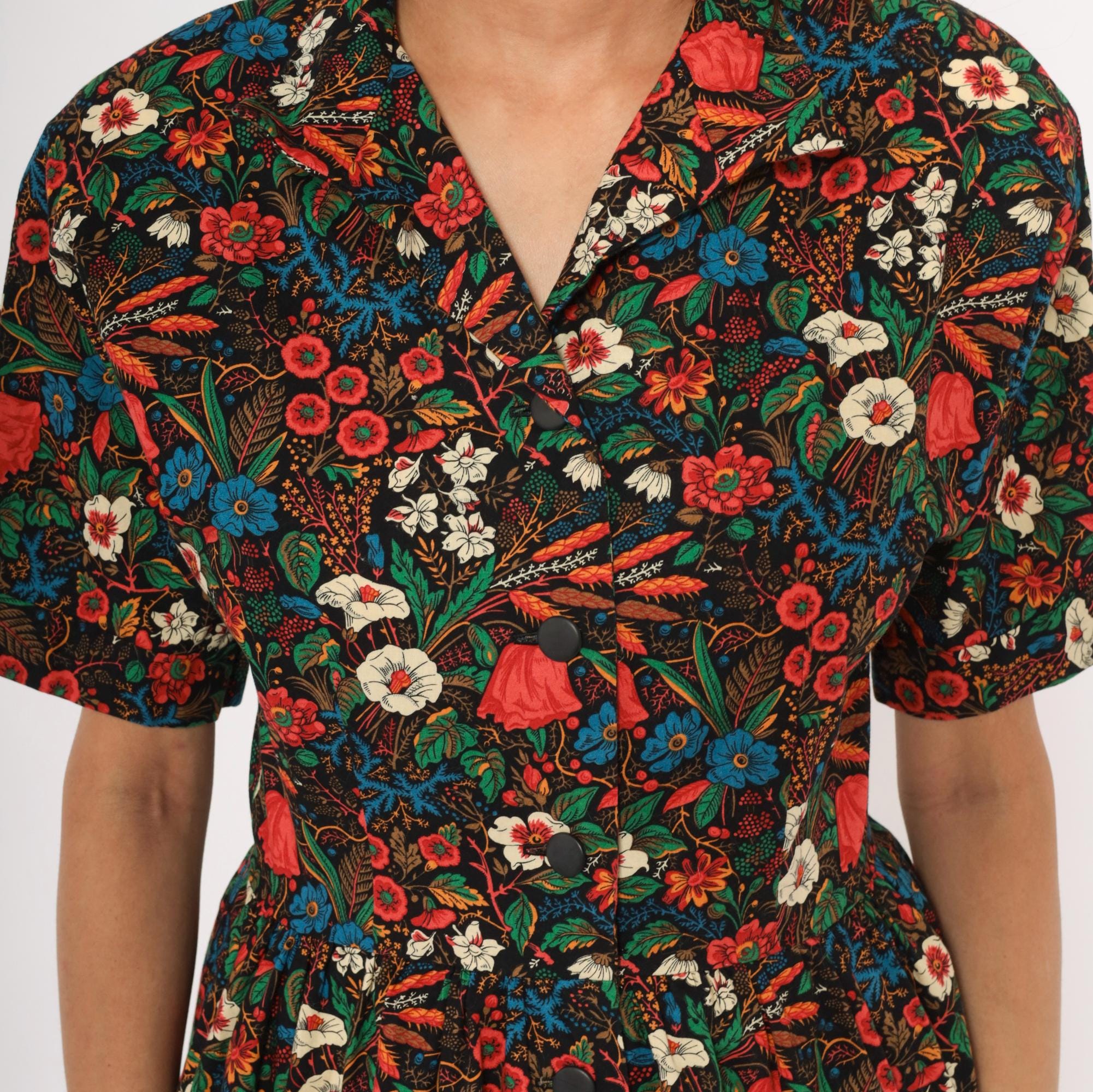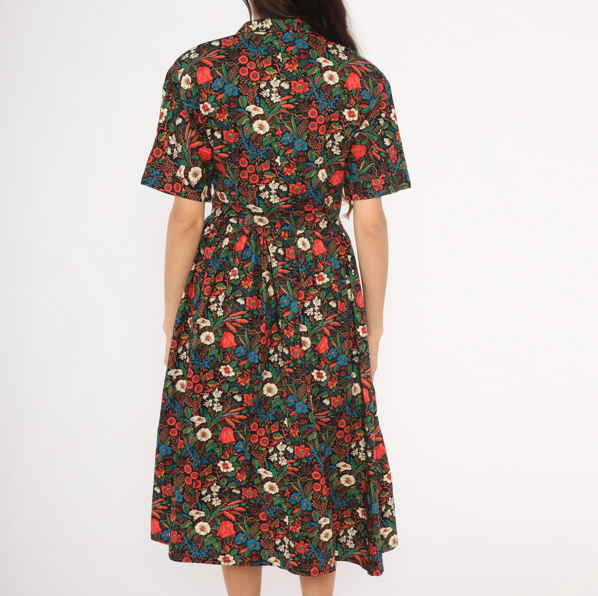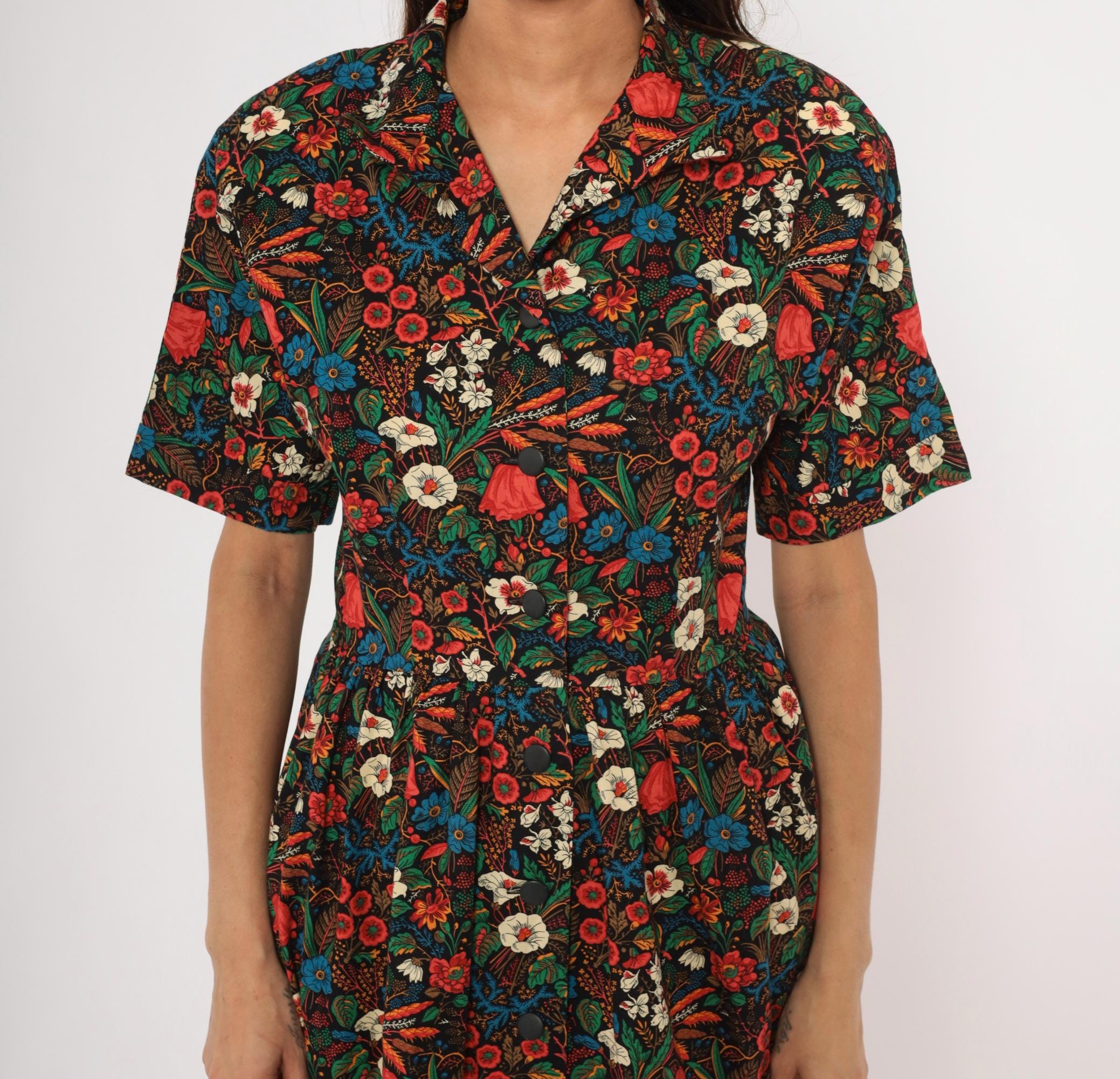 80s black floral shirtdress with a dense botanical print of red tulips, blue poppies, white blossoms, and green foliage across the entire garment. Notched lapel collar with V-neckline and dark button front closure down the bodice. Short sleeves, fitted waist with a full gathered skirt falling to mid-calf length, and side seam pockets.