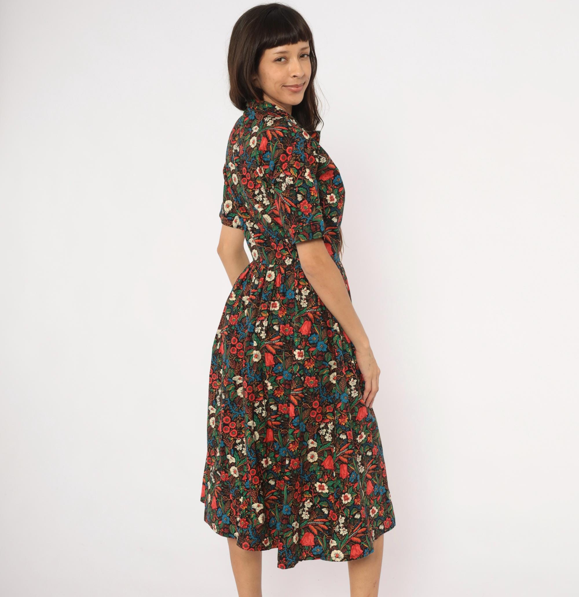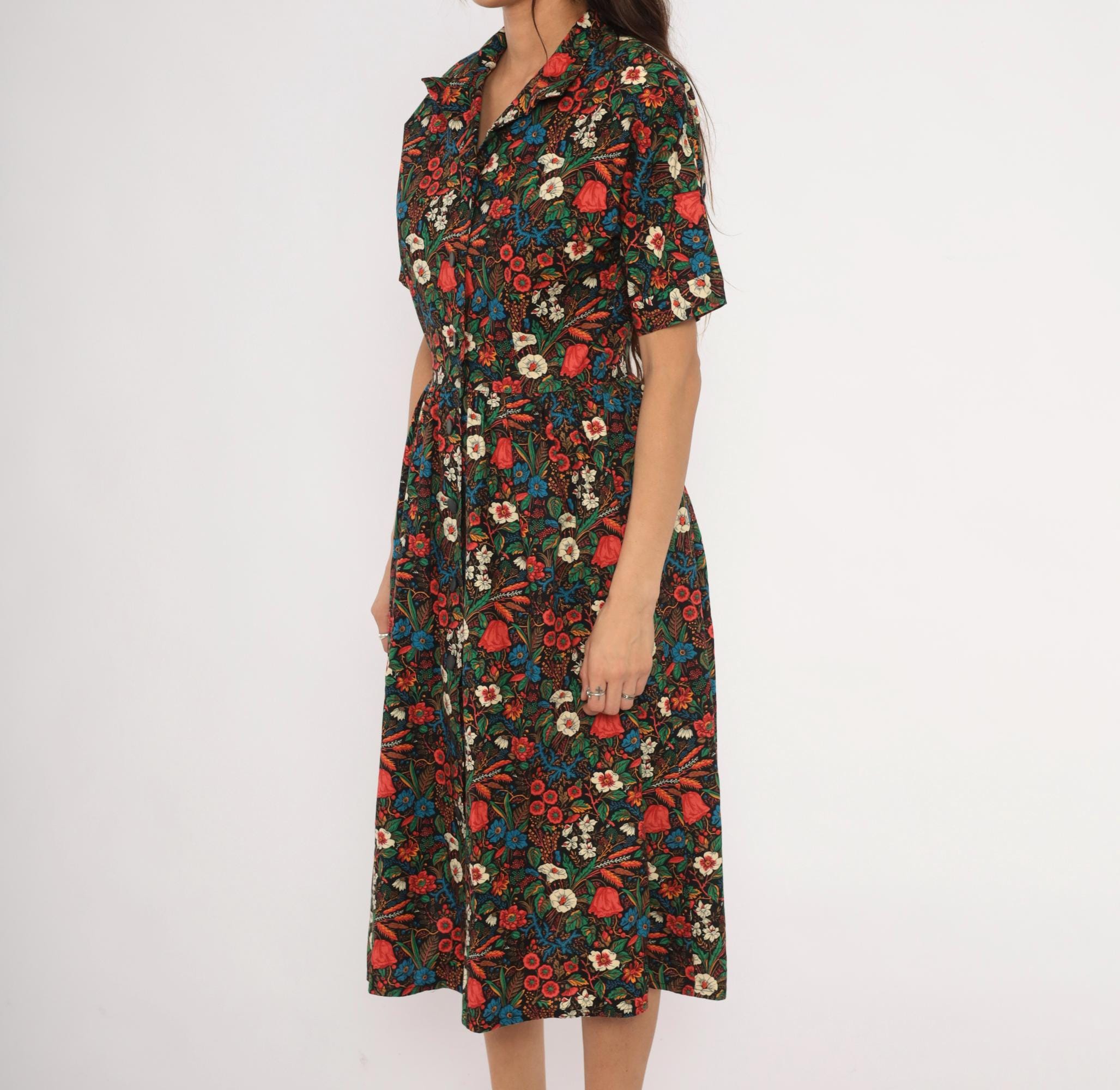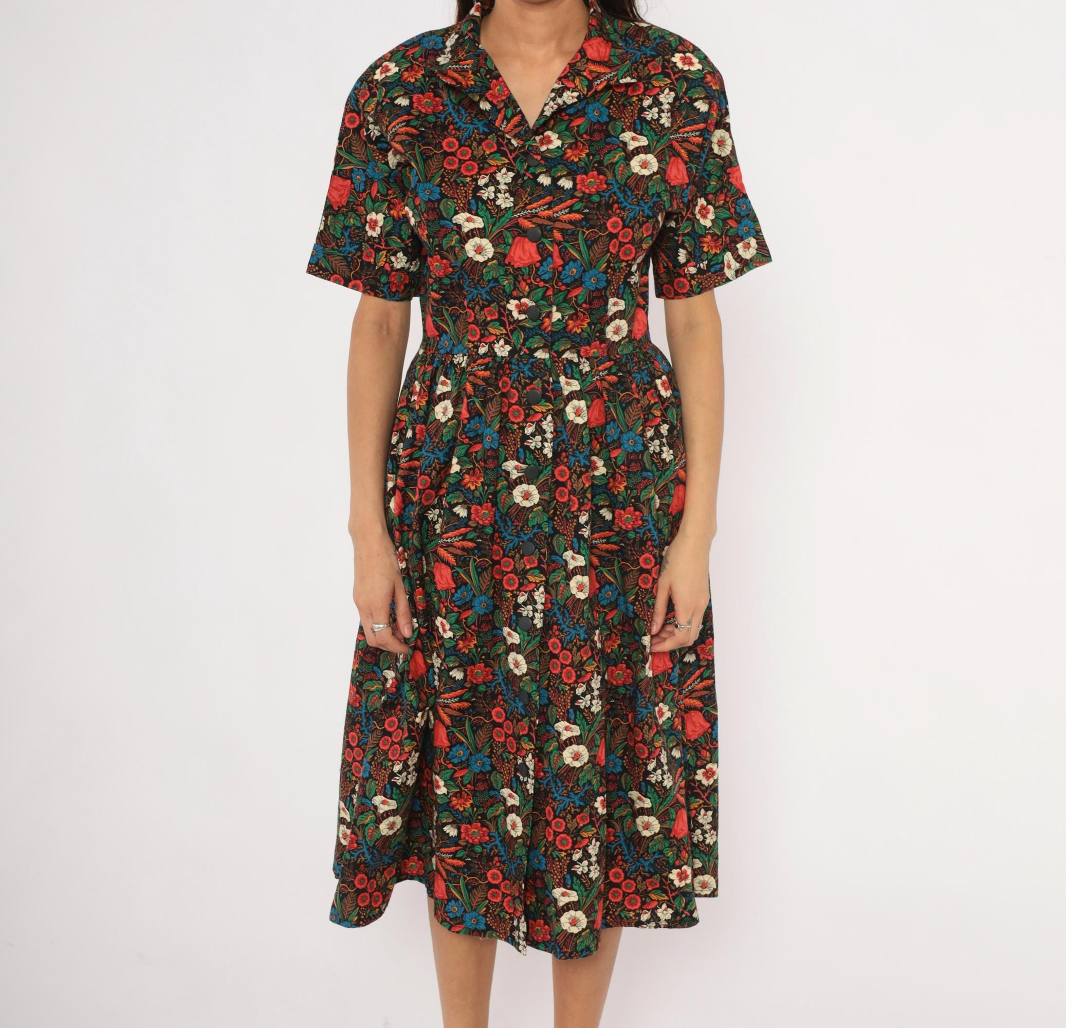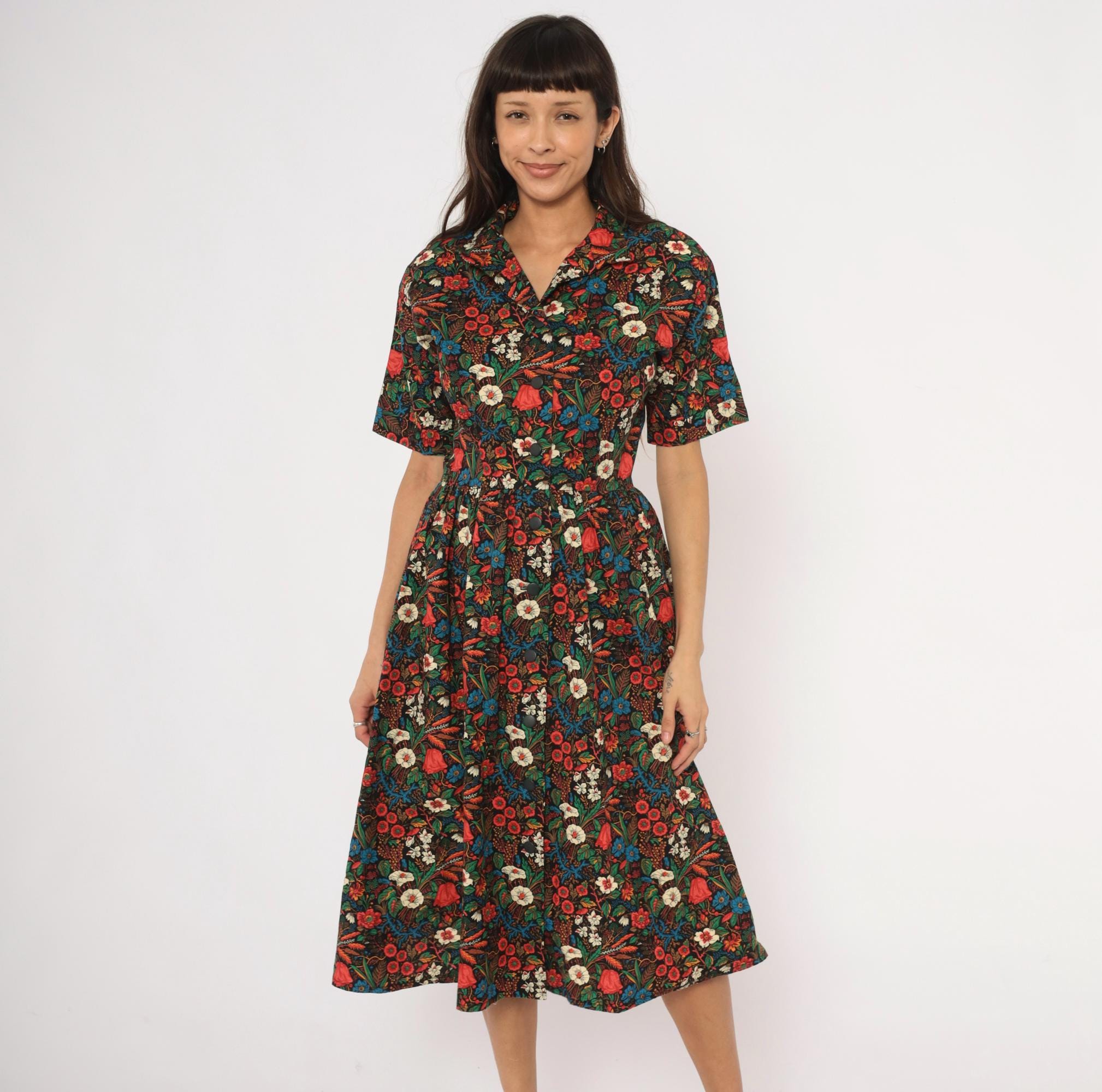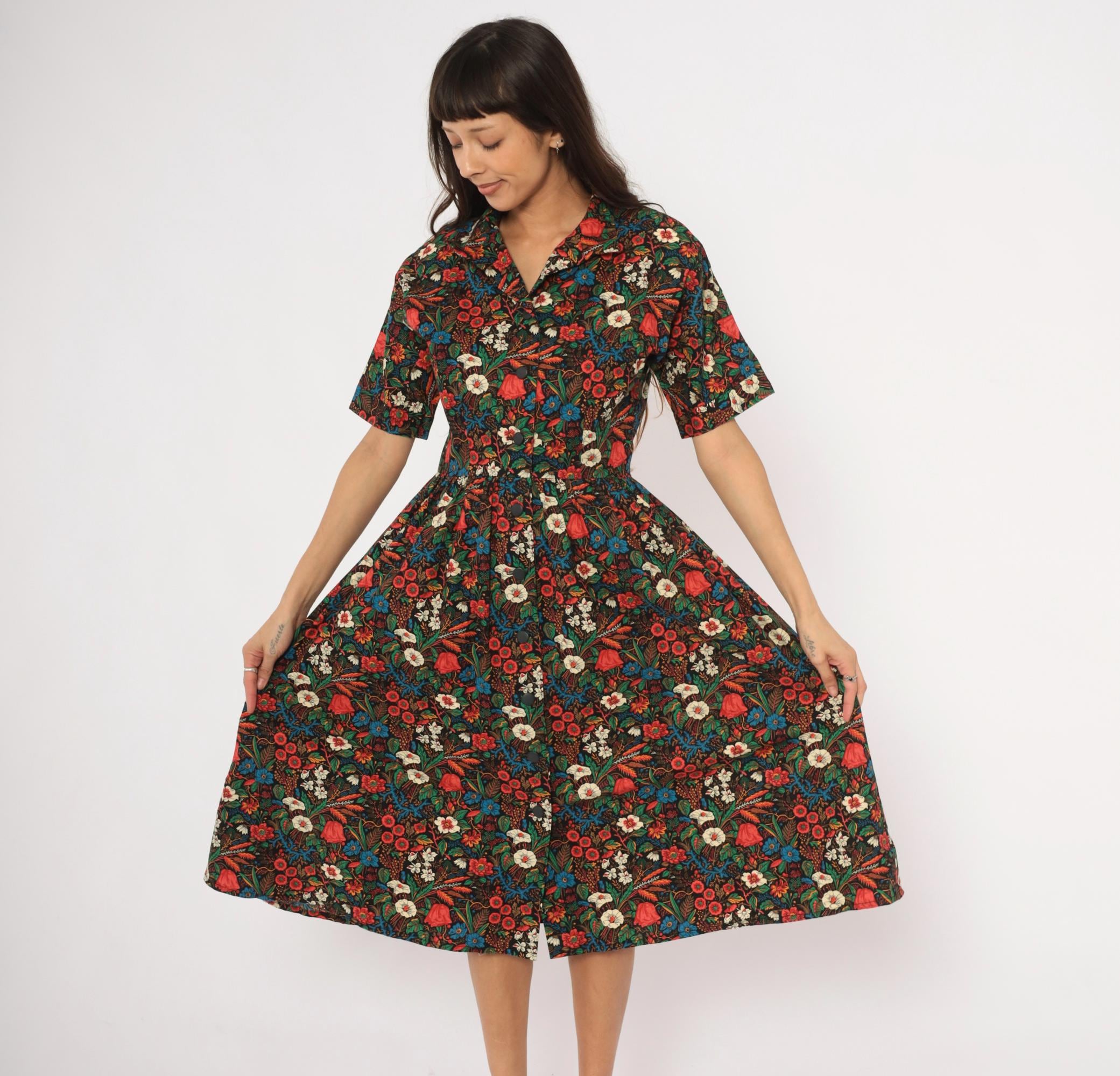 80s black floral shirtdress with a dense botanical print of red tulips, blue poppies, white blossoms, and green foliage across the entire garment. Notched lapel collar with V-neckline and dark button front closure down the bodice. Short sleeves, fitted waist with a full gathered skirt falling to mid-calf length, and side seam pockets.