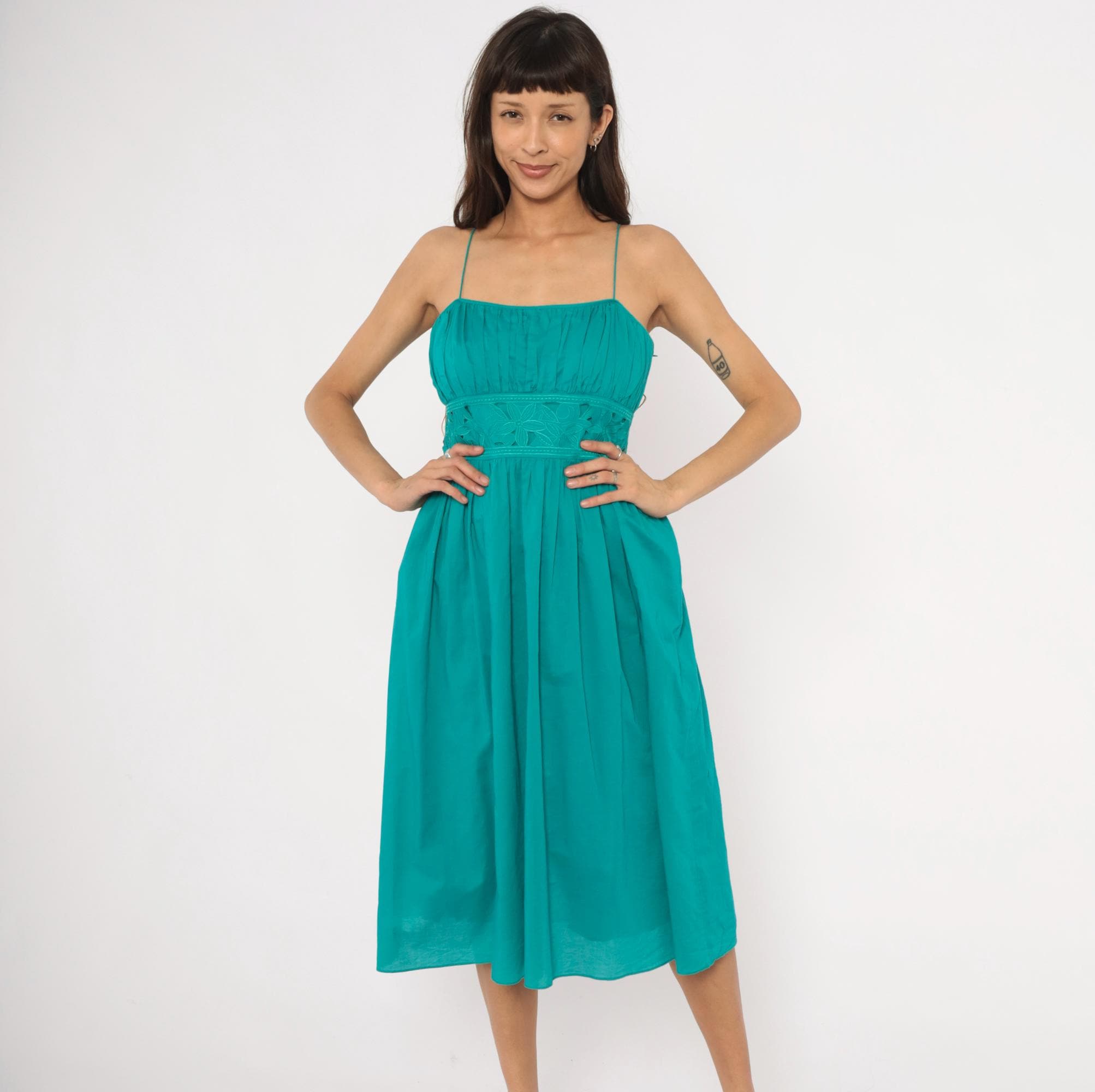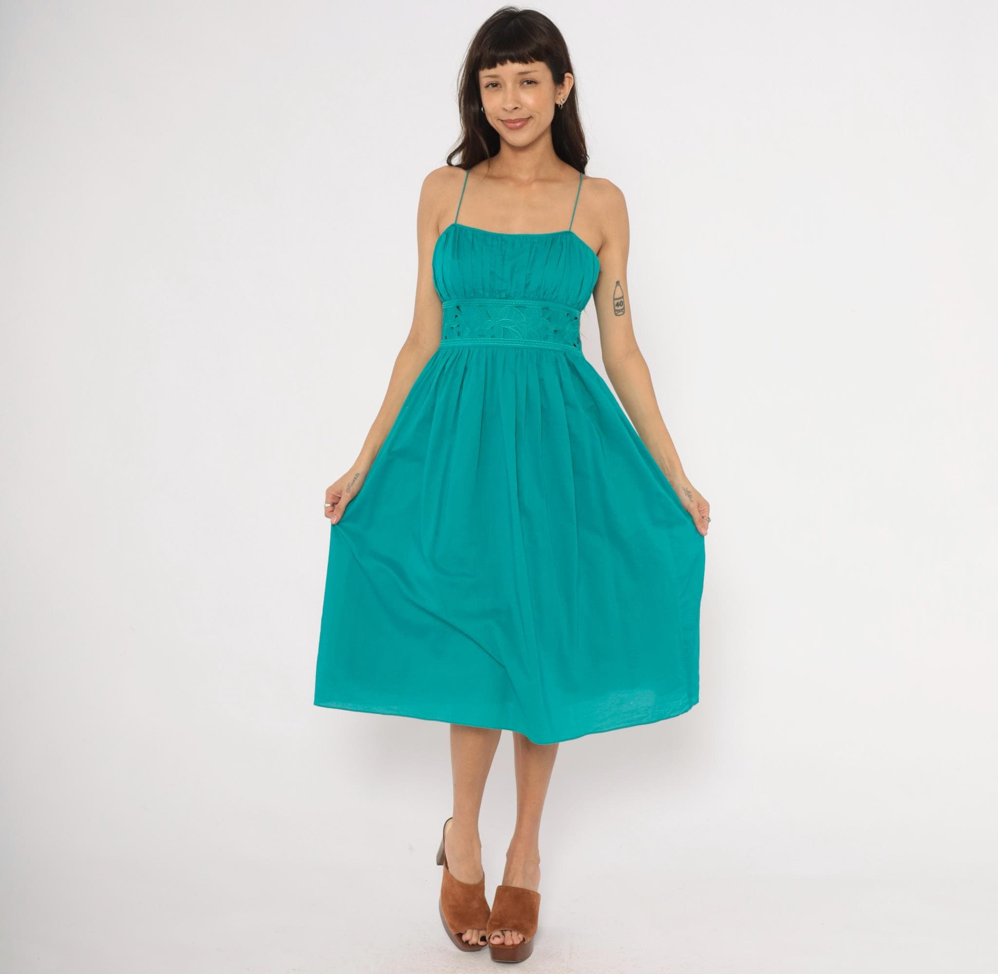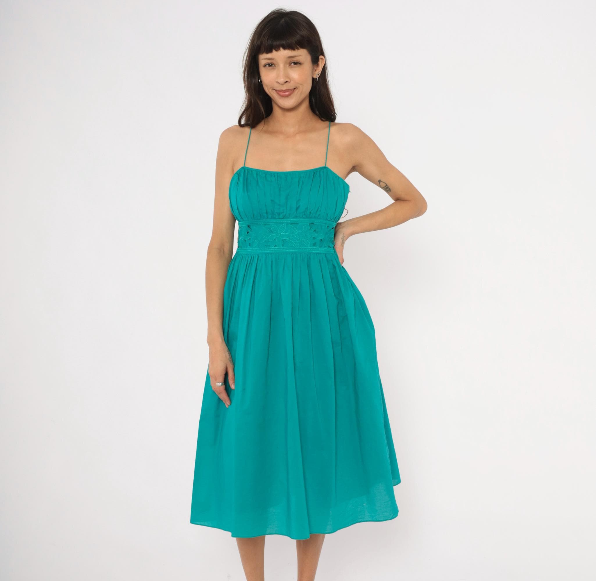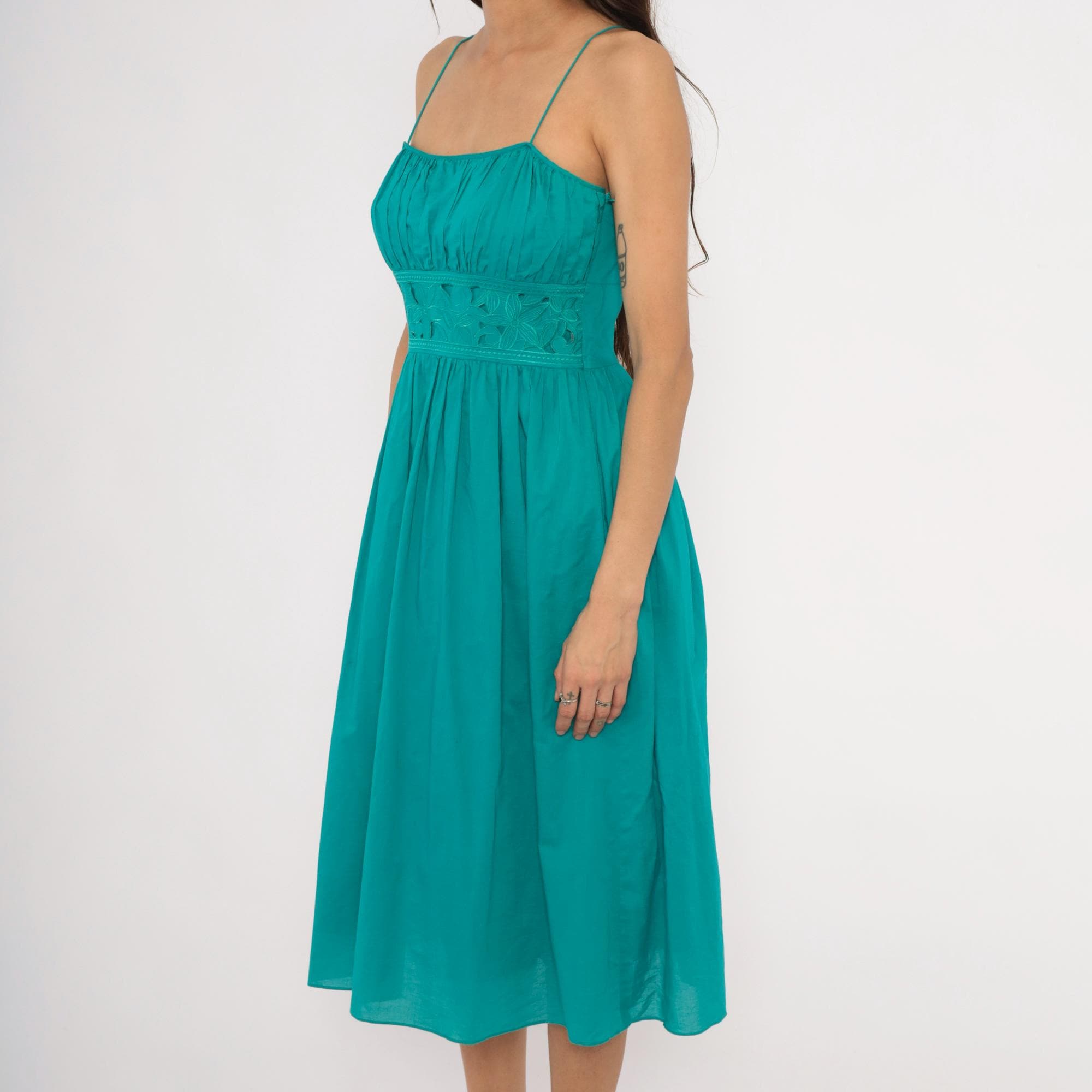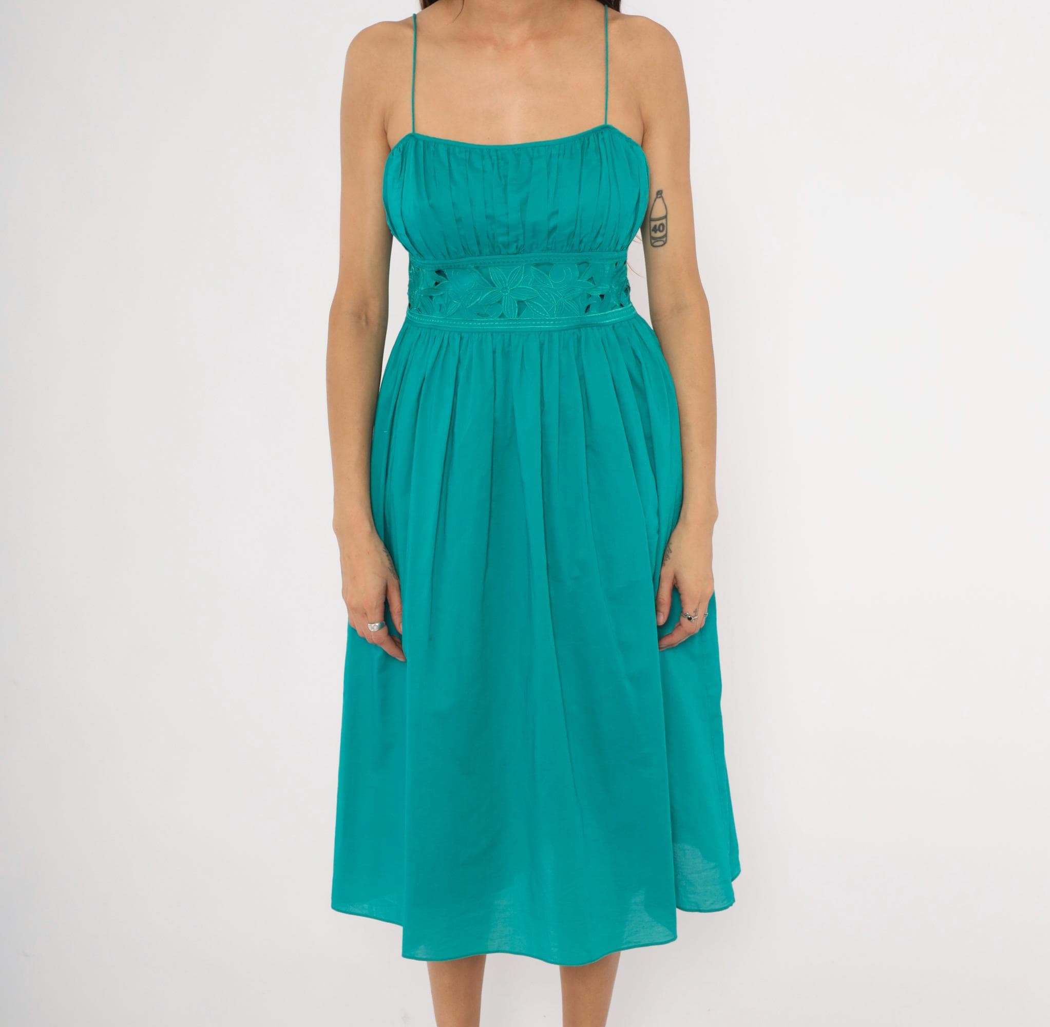 90s teal sundress from Jessica Howard with thin spaghetti straps and a gathered pleated bodice above a wide embroidered waistband. The waistband has a floral cutout eyelet design with stitched leaf and petal motifs. Pleated A-line skirt falls to mid-calf length, with a side zipper closure.