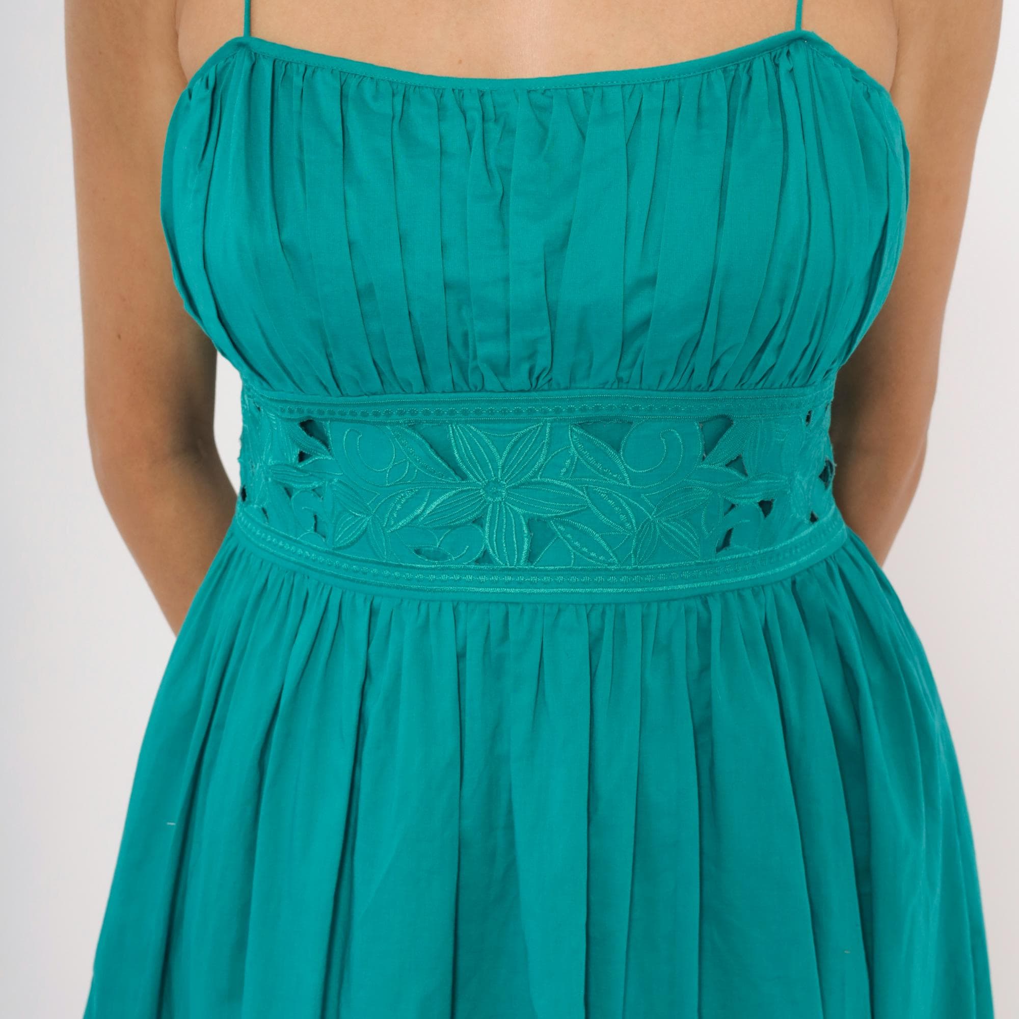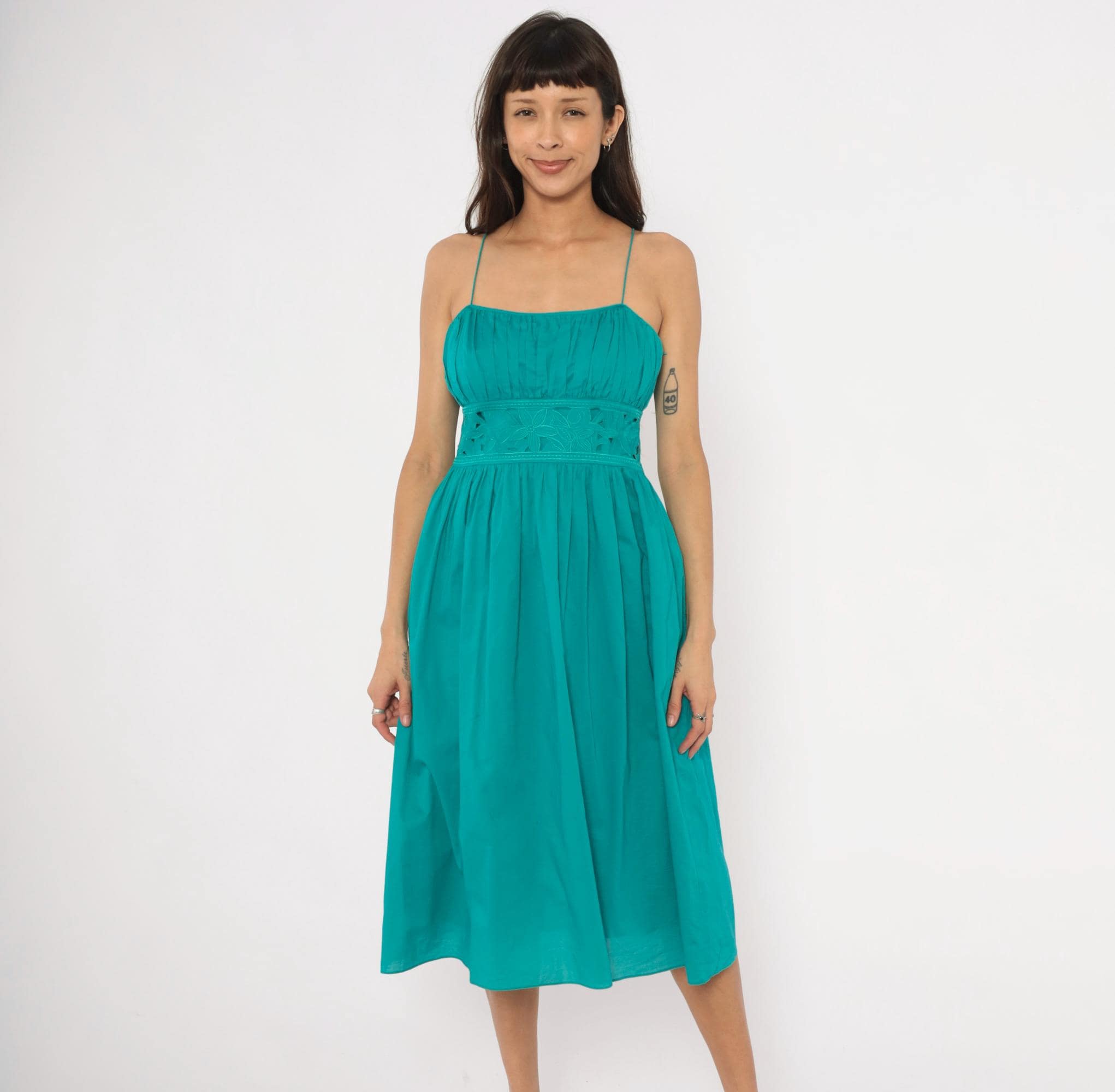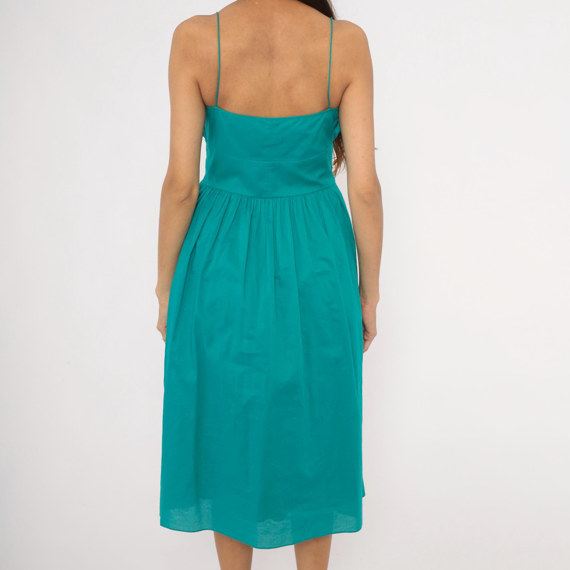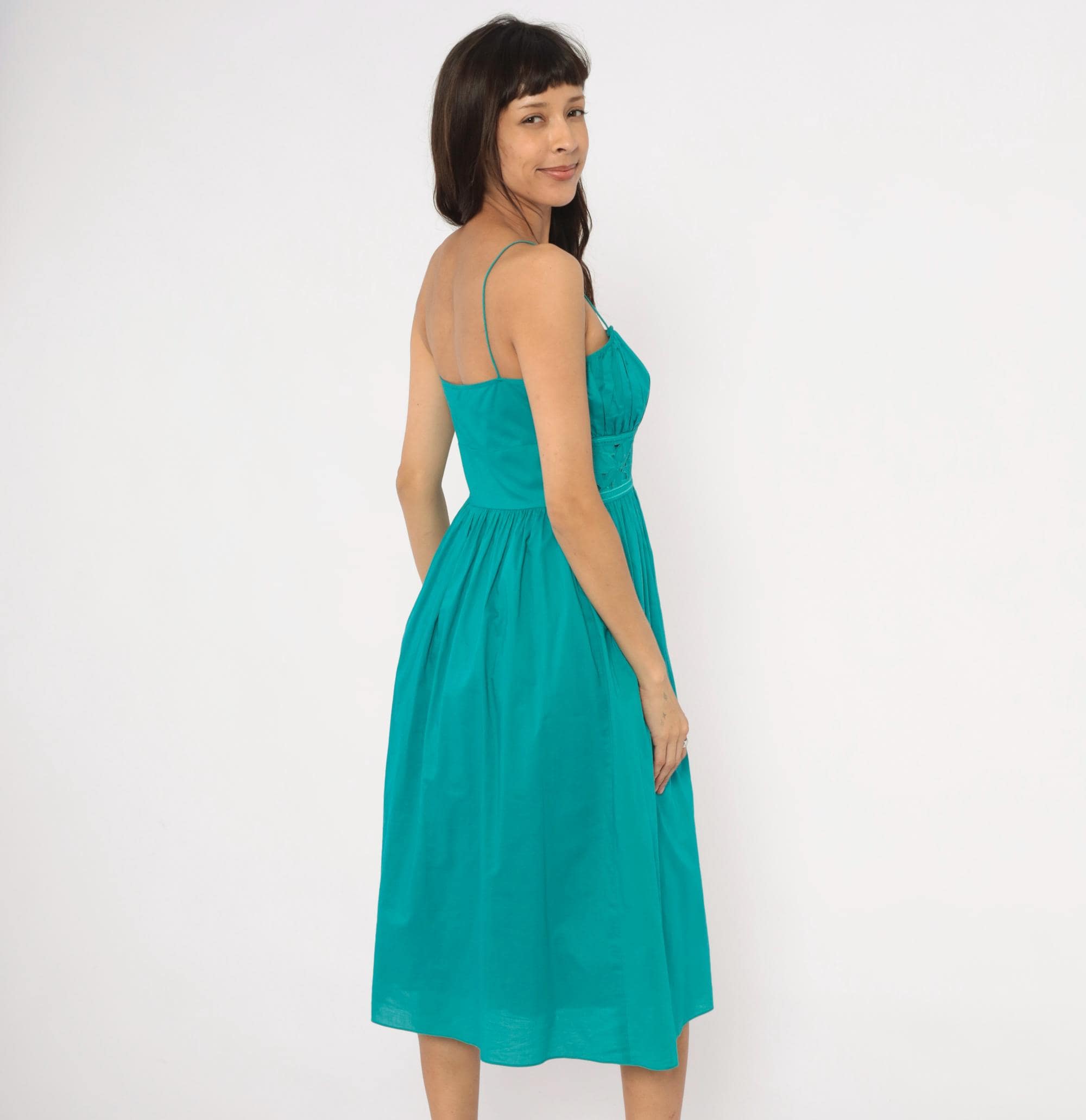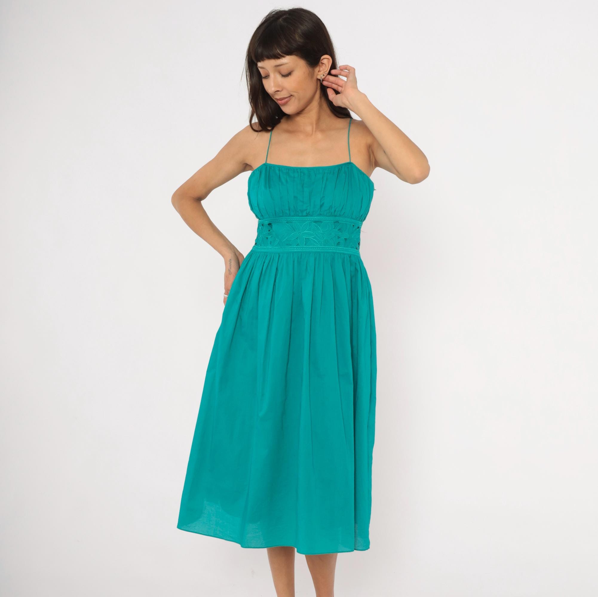 90s teal sundress from Jessica Howard with thin spaghetti straps and a gathered pleated bodice above a wide embroidered waistband. The waistband has a floral cutout eyelet design with stitched leaf and petal motifs. Pleated A-line skirt falls to mid-calf length, with a side zipper closure.
