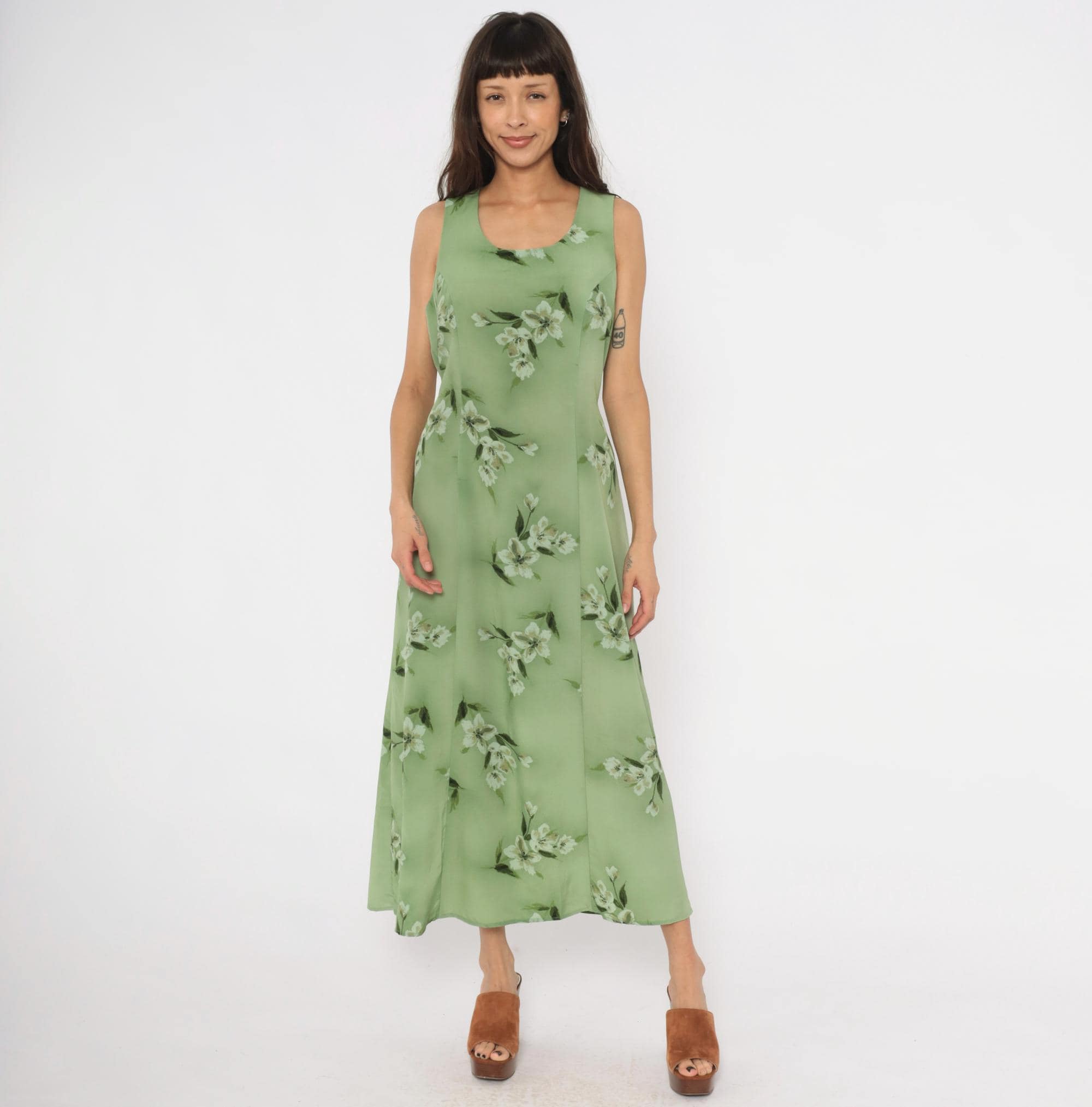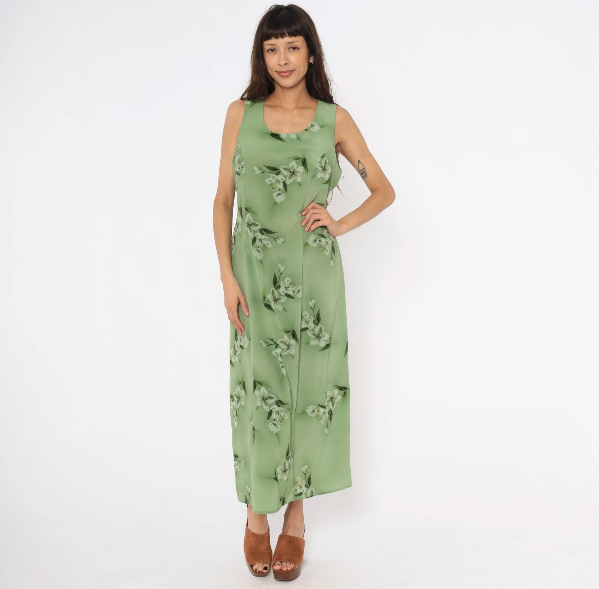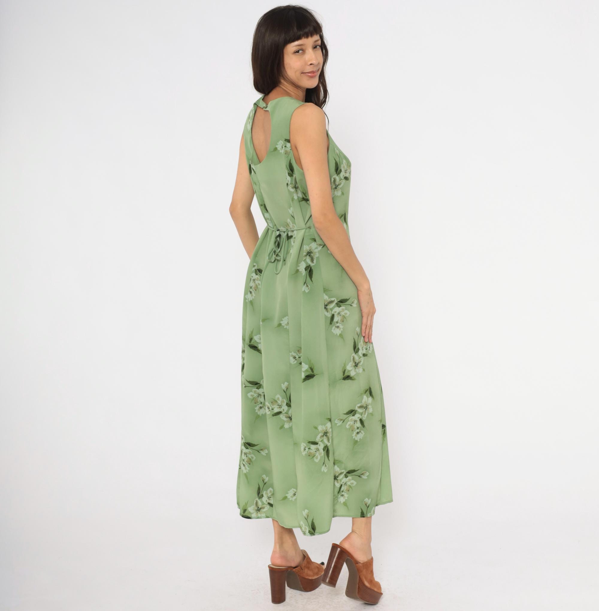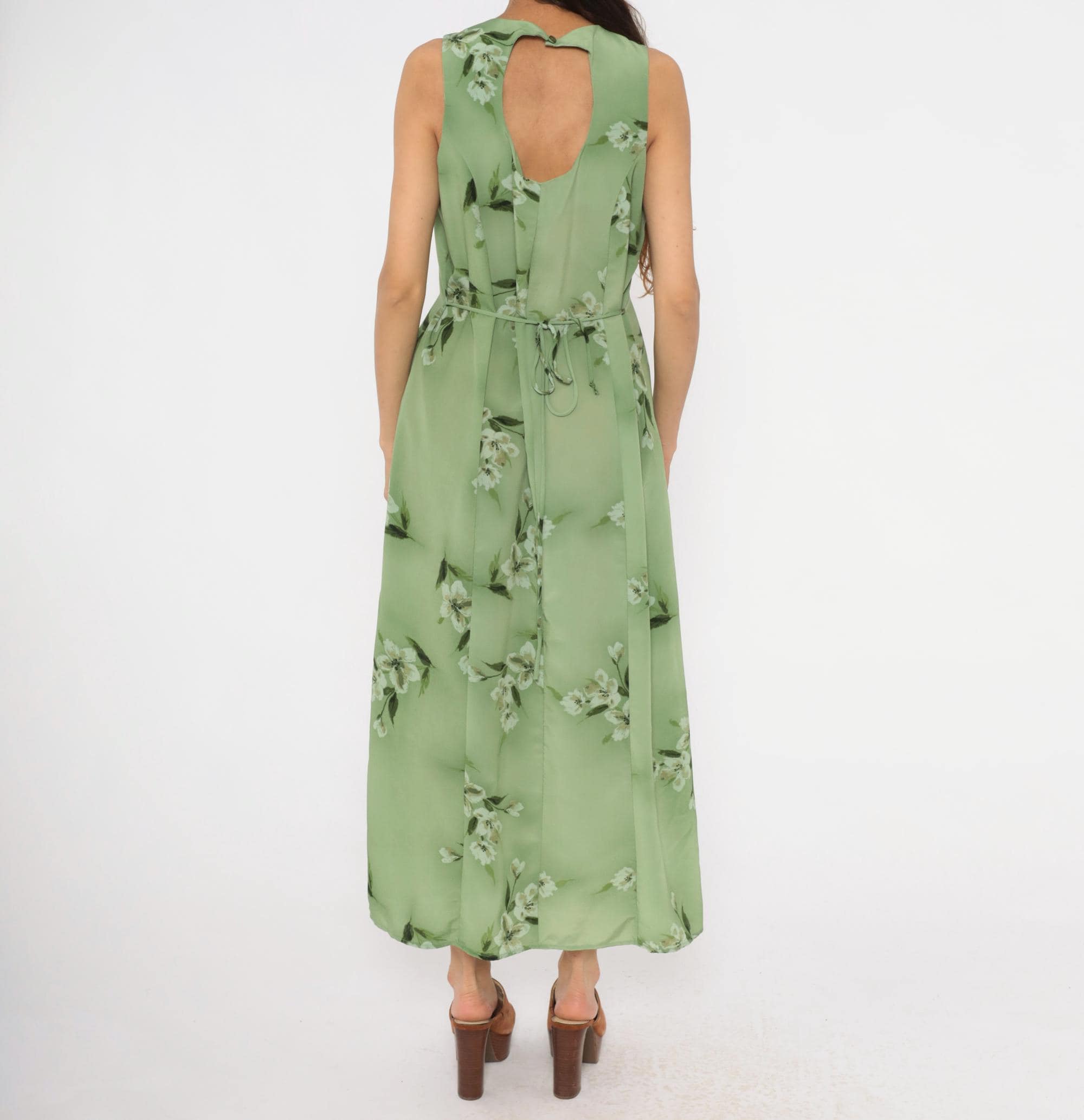 90s sage green floral maxi dress from Fashion Bug with a scoop neckline, sleeveless tank silhouette, and A-line skirt. White and cream flowers with dark green leaves scattered across the olive fabric. Open keyhole cutout at the upper back with a tie closure at the waist, and a small button at the nape of the neck.