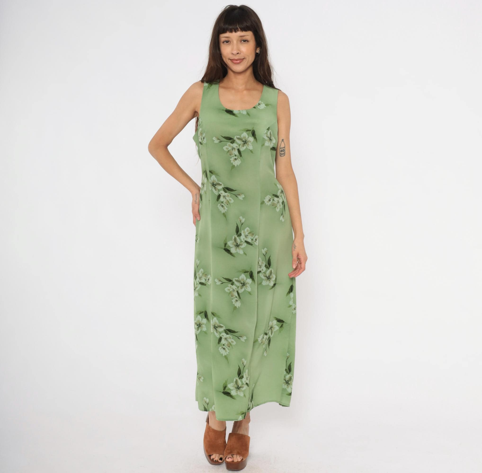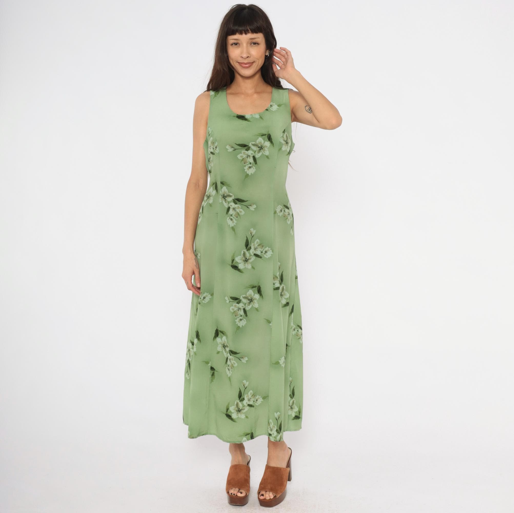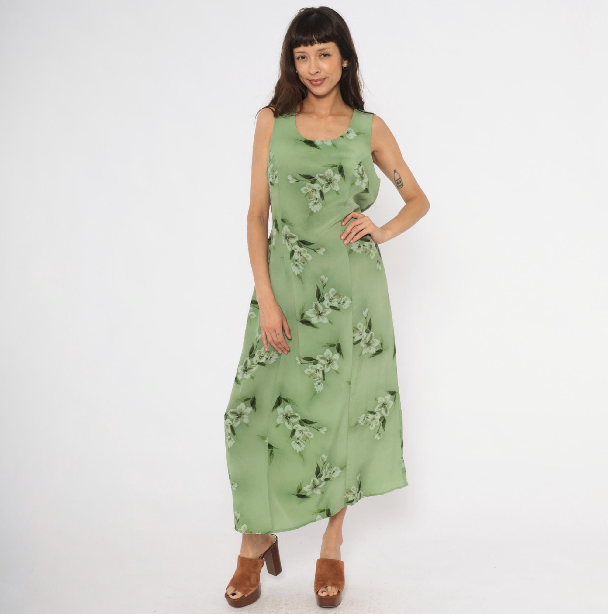 90s sage green floral maxi dress from Fashion Bug with a scoop neckline, sleeveless tank silhouette, and A-line skirt. White and cream flowers with dark green leaves scattered across the olive fabric. Open keyhole cutout at the upper back with a tie closure at the waist, and a small button at the nape of the neck.