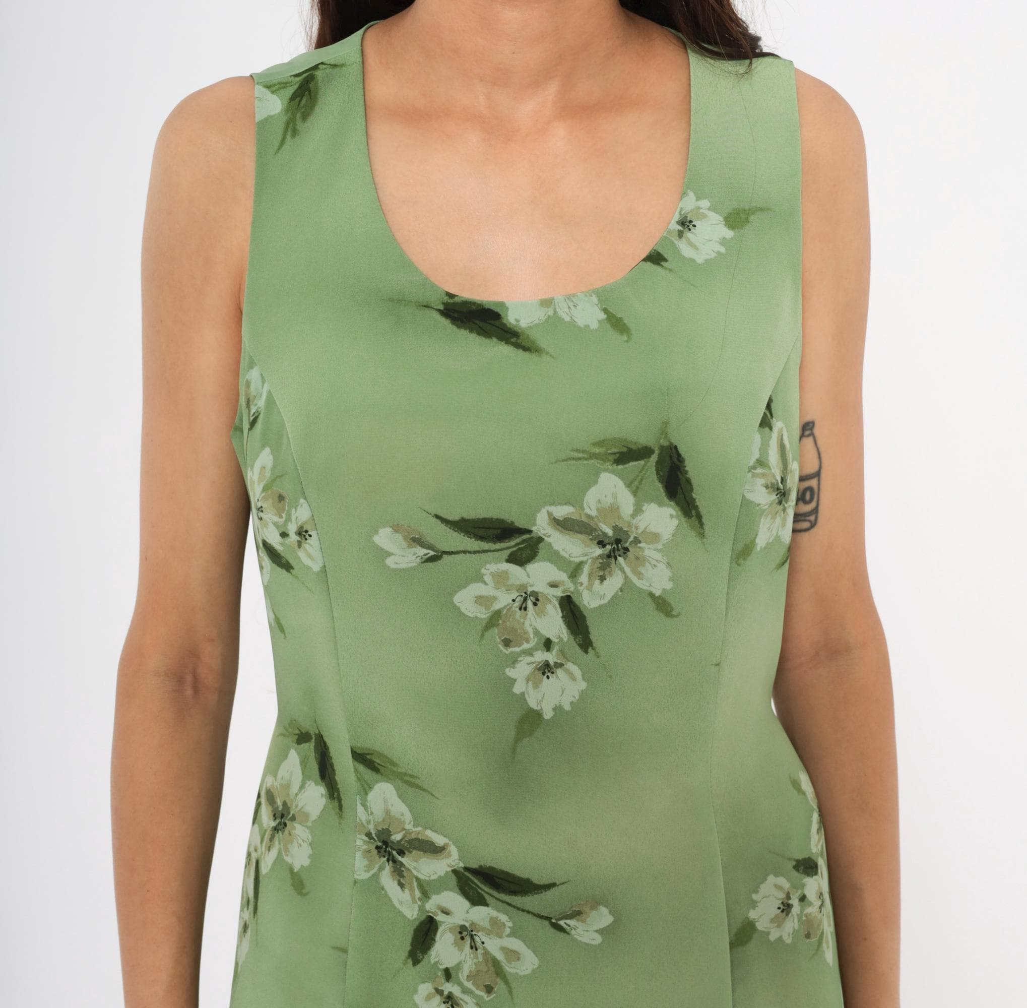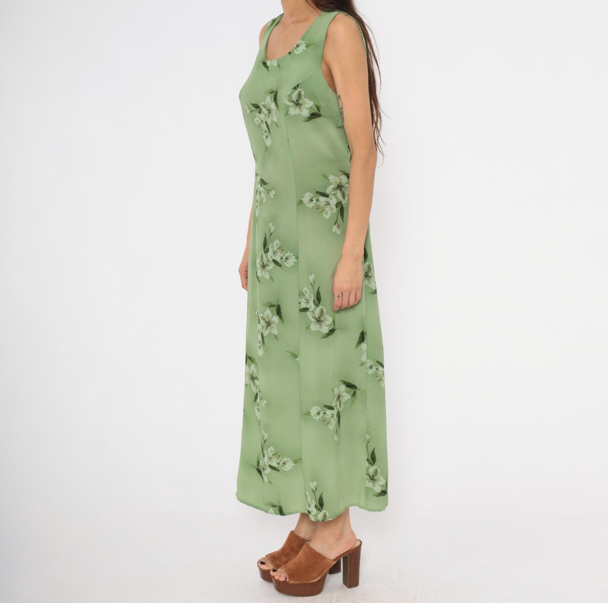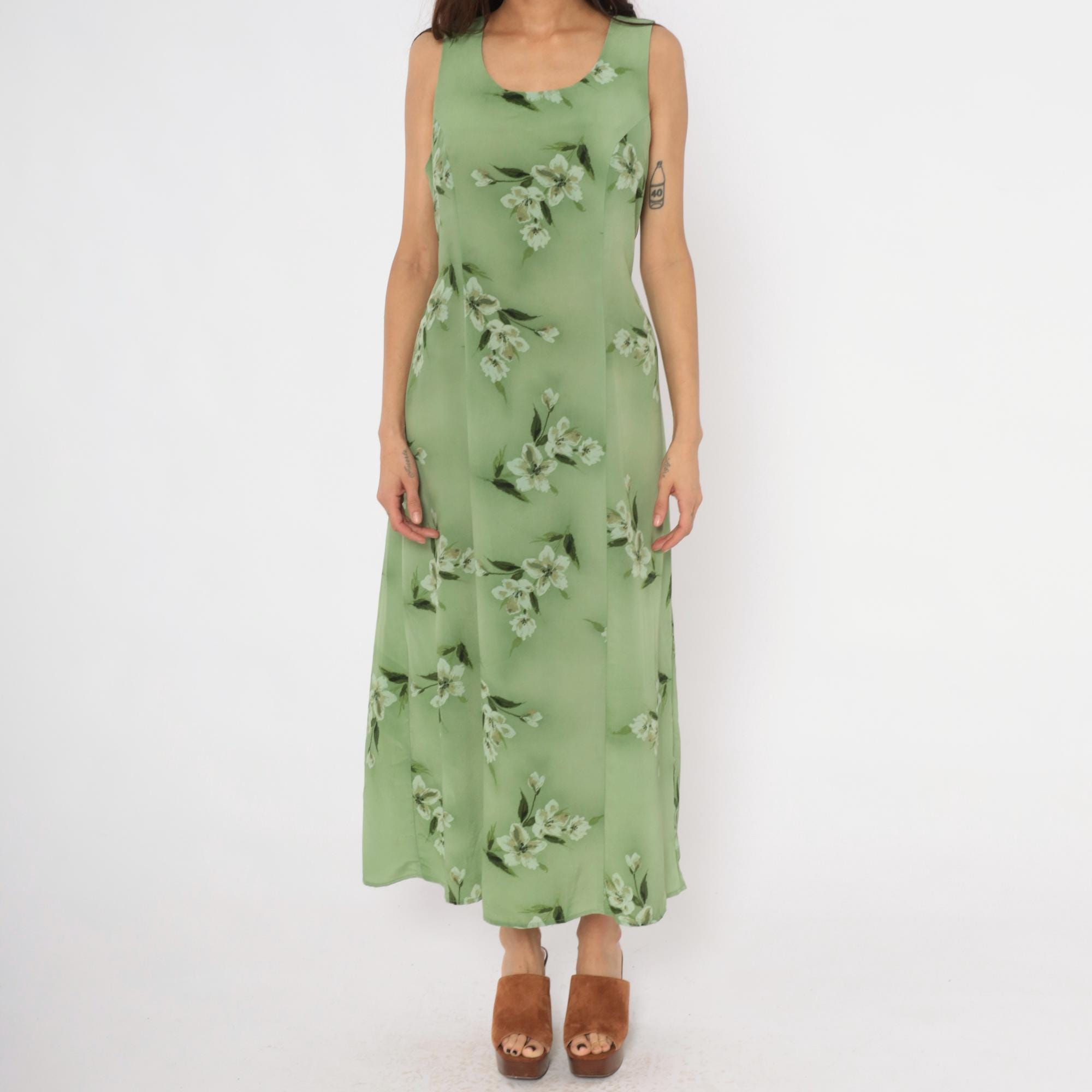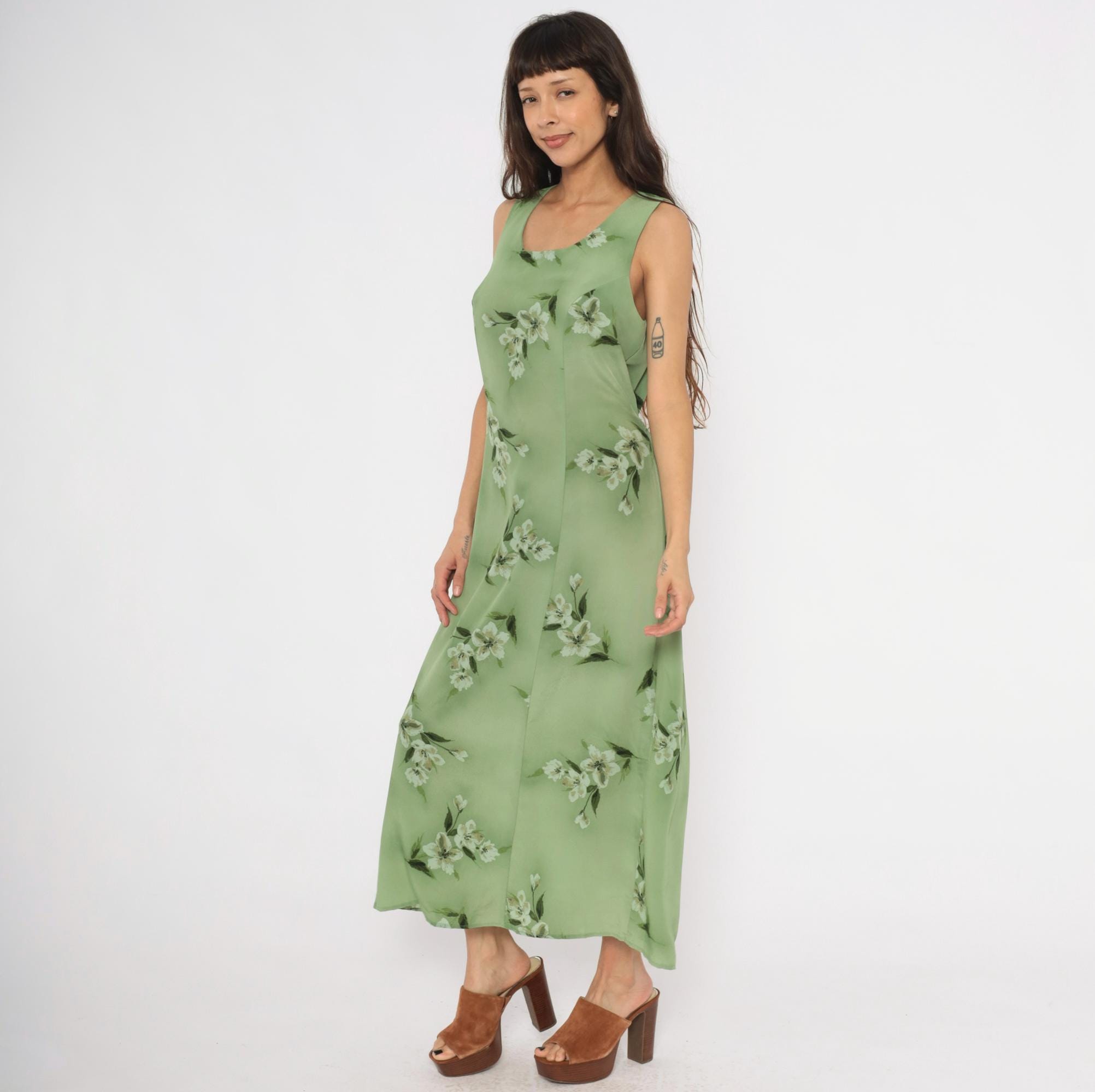 90s sage green floral maxi dress from Fashion Bug with a scoop neckline, sleeveless tank silhouette, and A-line skirt. White and cream flowers with dark green leaves scattered across the olive fabric. Open keyhole cutout at the upper back with a tie closure at the waist, and a small button at the nape of the neck.