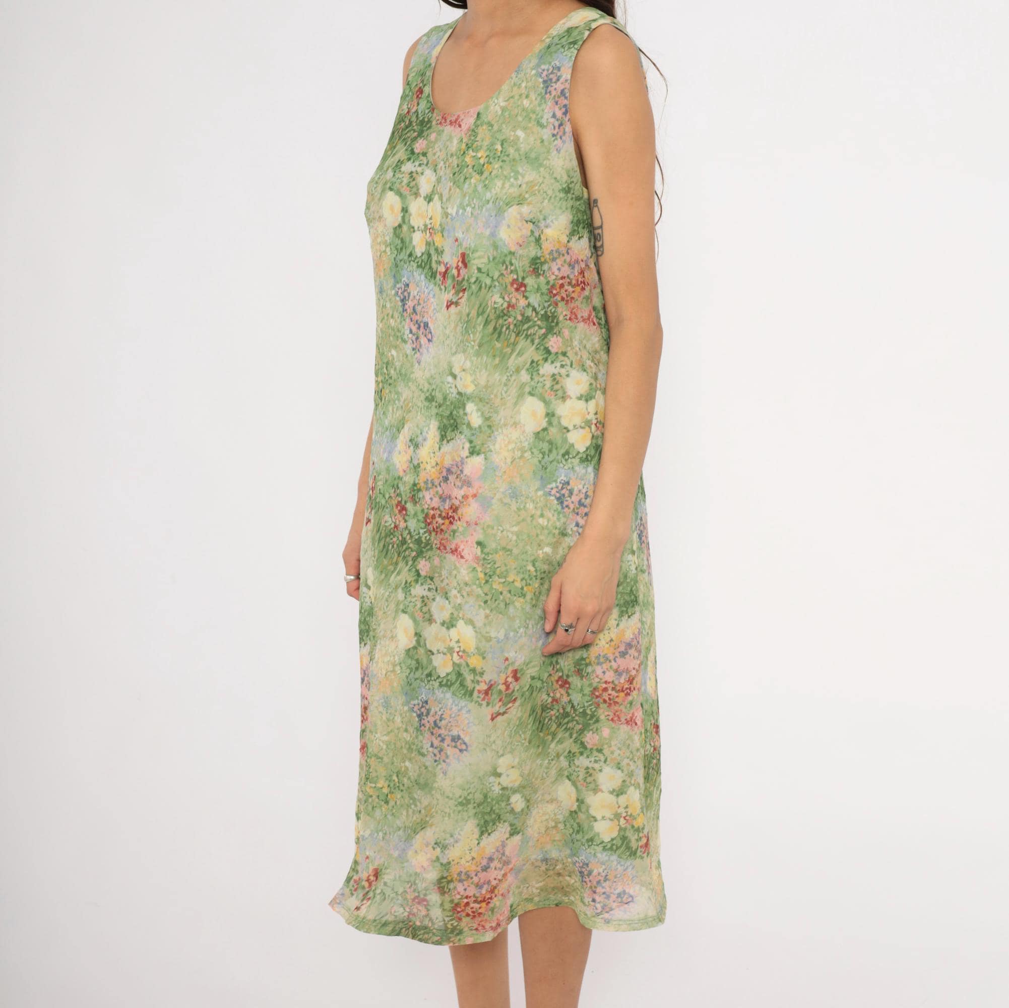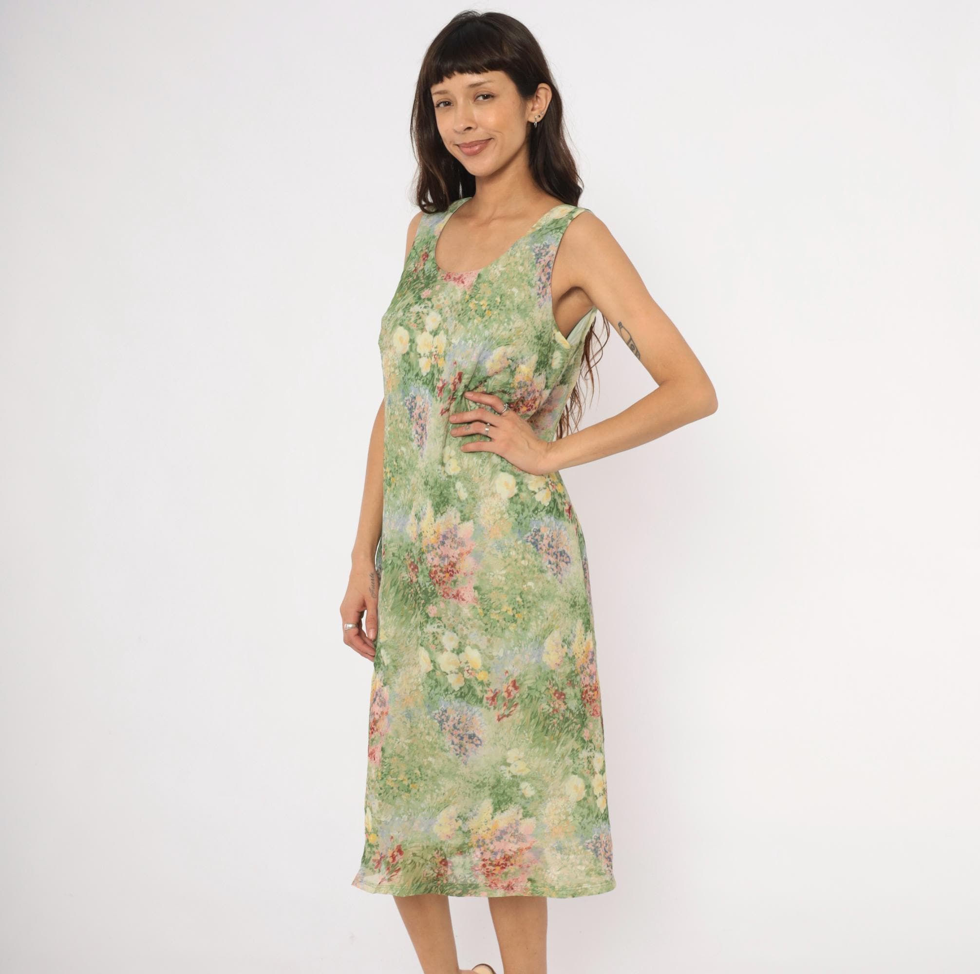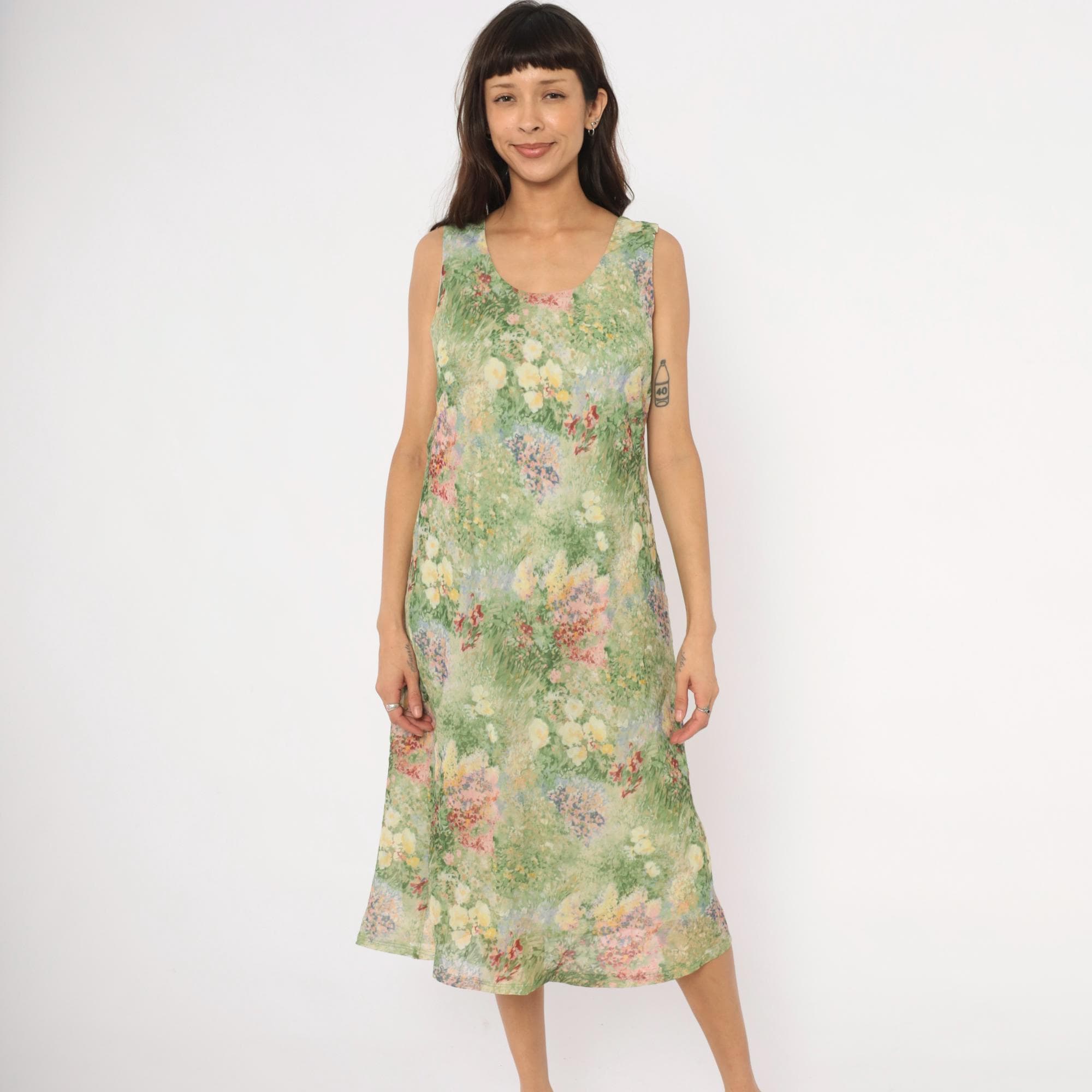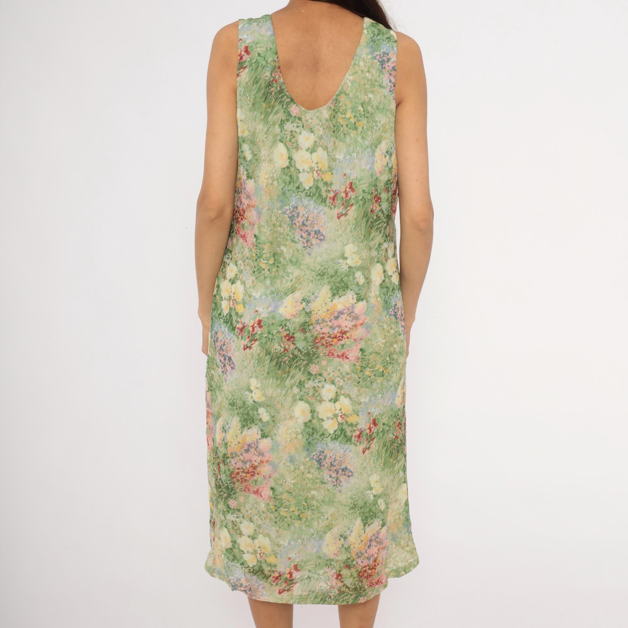 90s sleeveless midi dress from K Studio with an allover impressionist garden print in greens, pinks, yellows, lavender, and deep red. Scoop neckline on both front and back with wide shoulder straps and a straight, relaxed shift silhouette. Pullover construction with no closures or pockets. The watercolor-style floral pattern resembles a wildflower meadow painting with soft, blended brushstroke detail throughout.