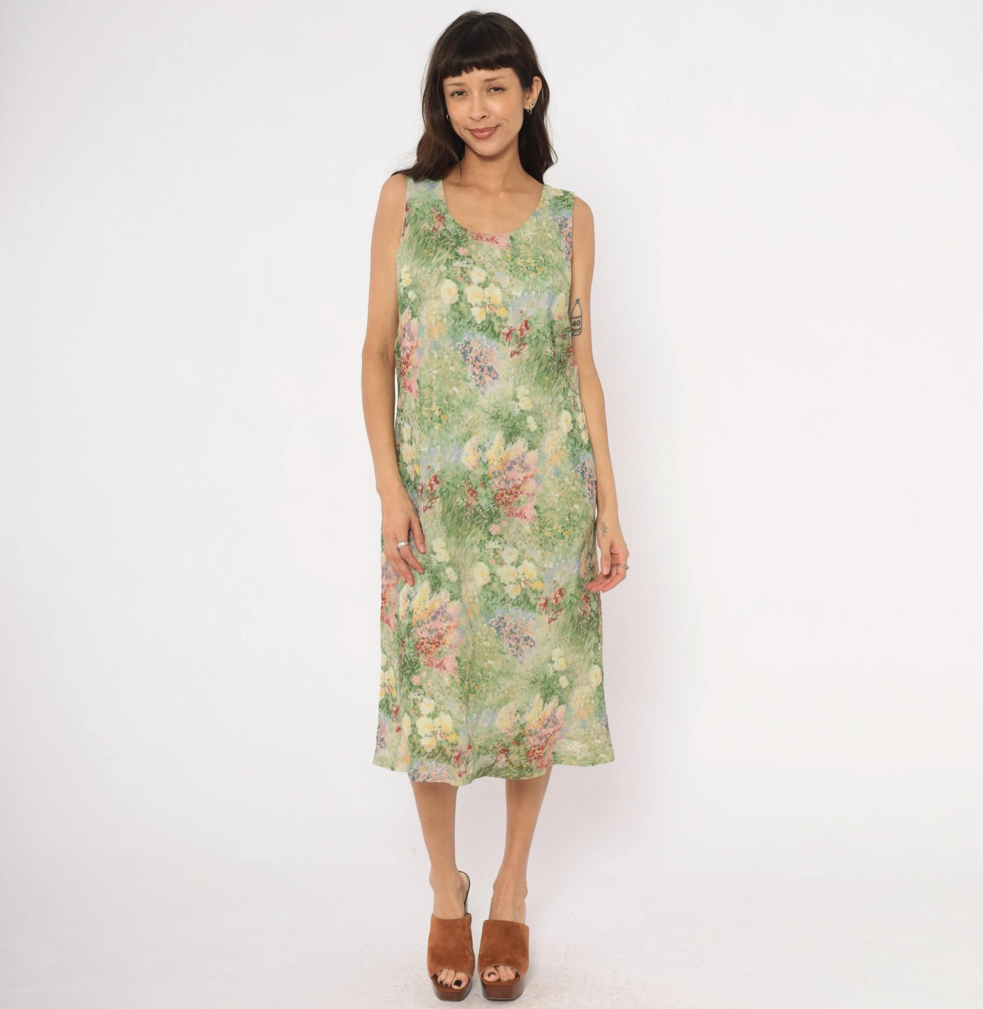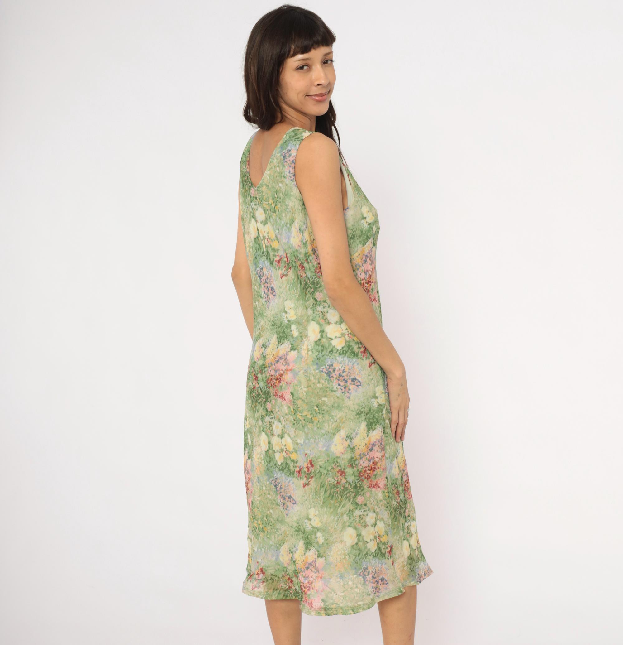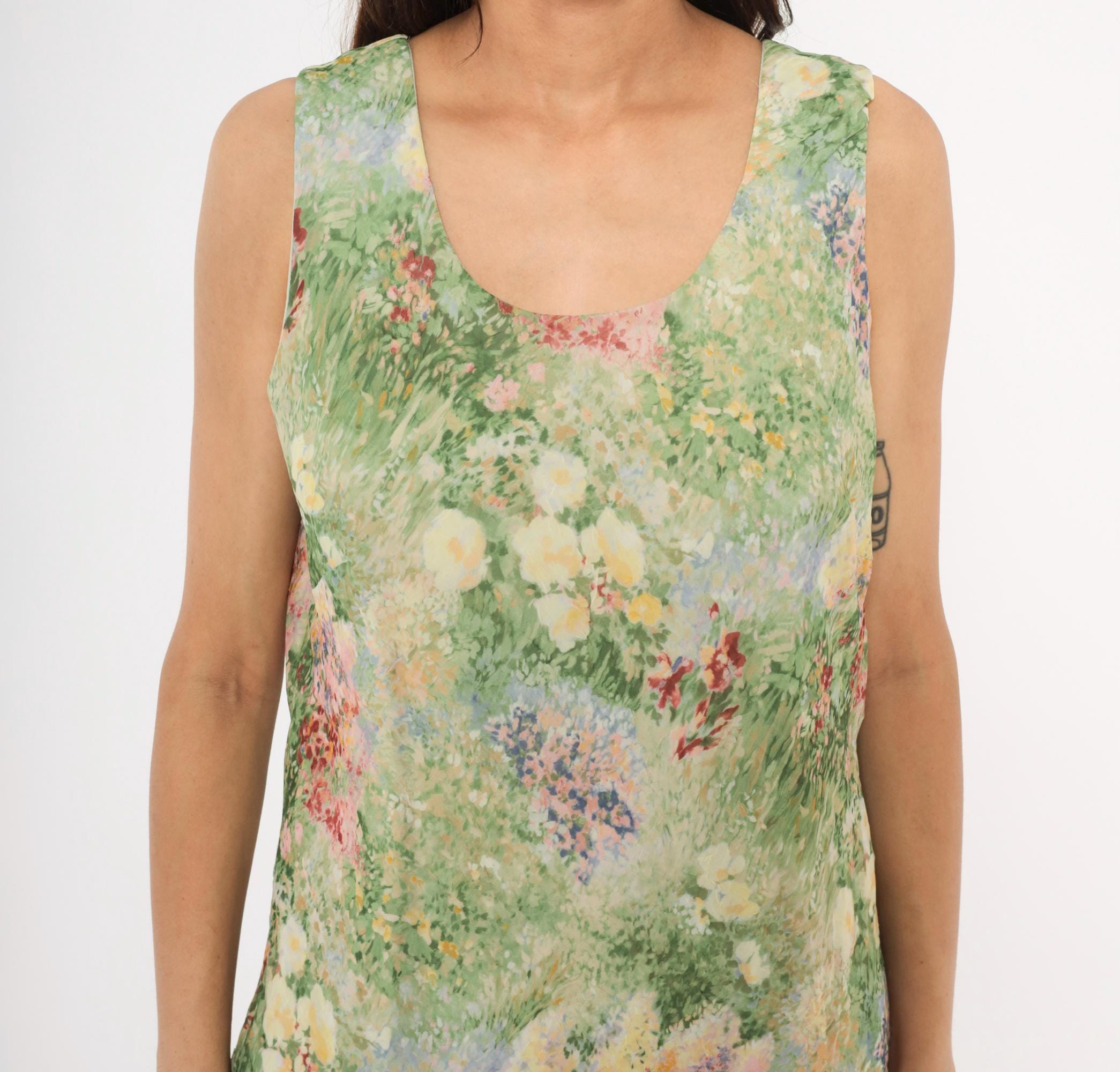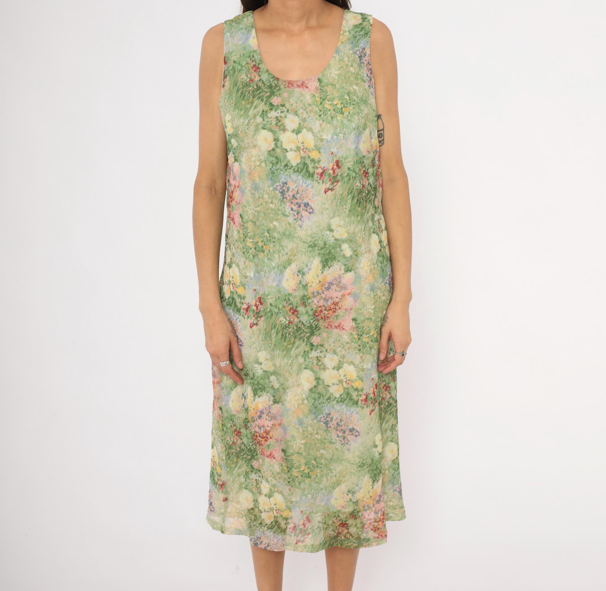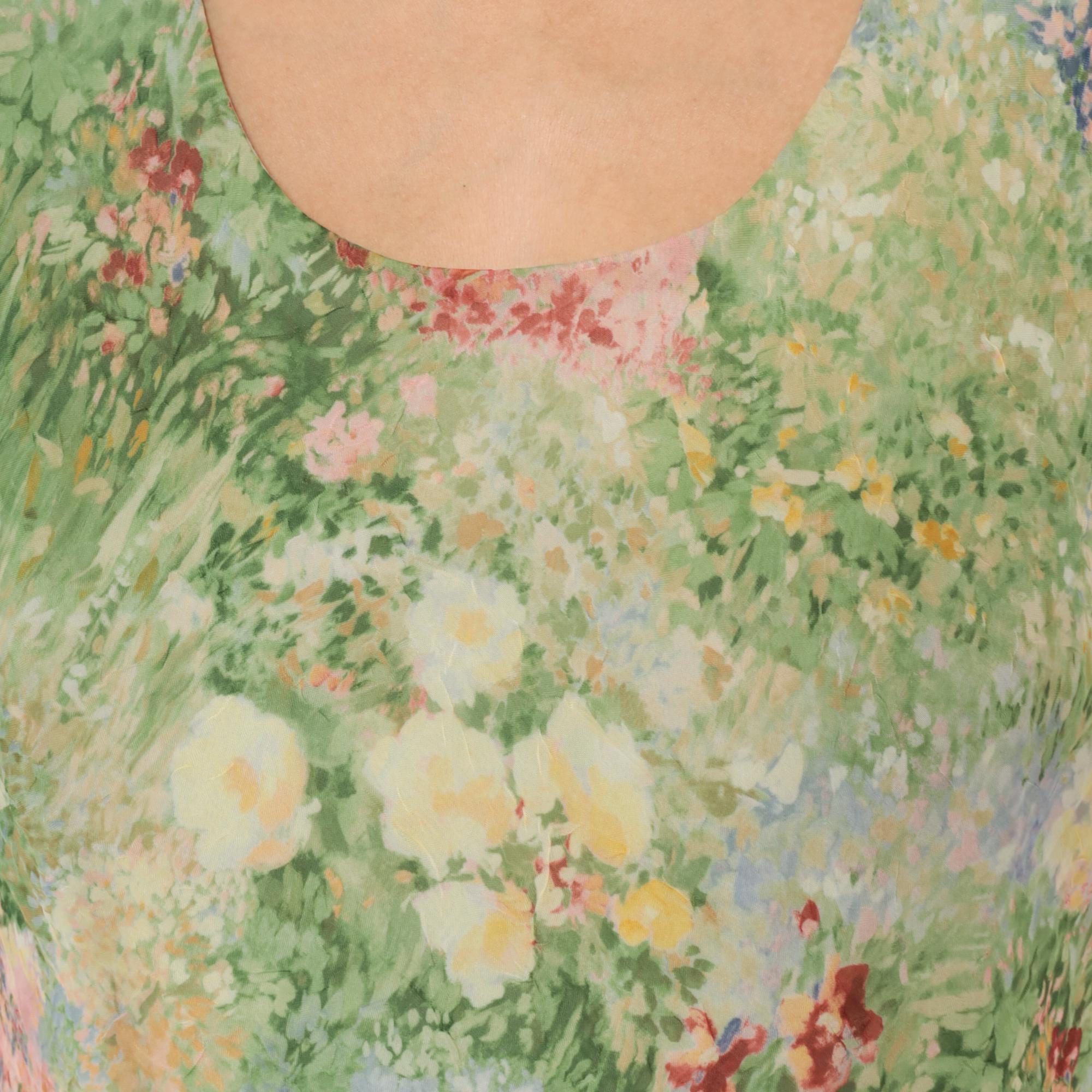 90s sleeveless midi dress from K Studio with an allover impressionist garden print in greens, pinks, yellows, lavender, and deep red. Scoop neckline on both front and back with wide shoulder straps and a straight, relaxed shift silhouette. Pullover construction with no closures or pockets. The watercolor-style floral pattern resembles a wildflower meadow painting with soft, blended brushstroke detail throughout.