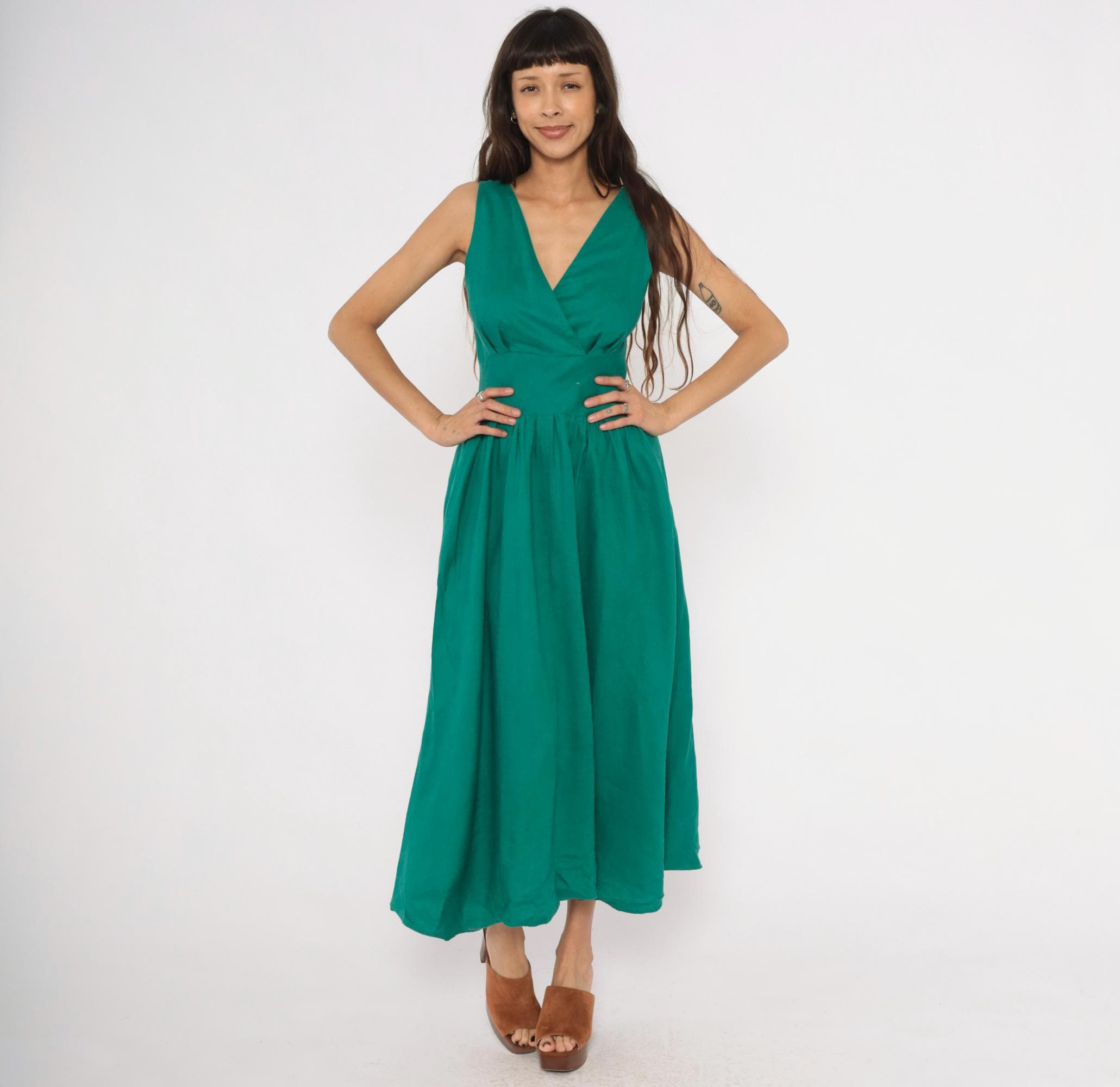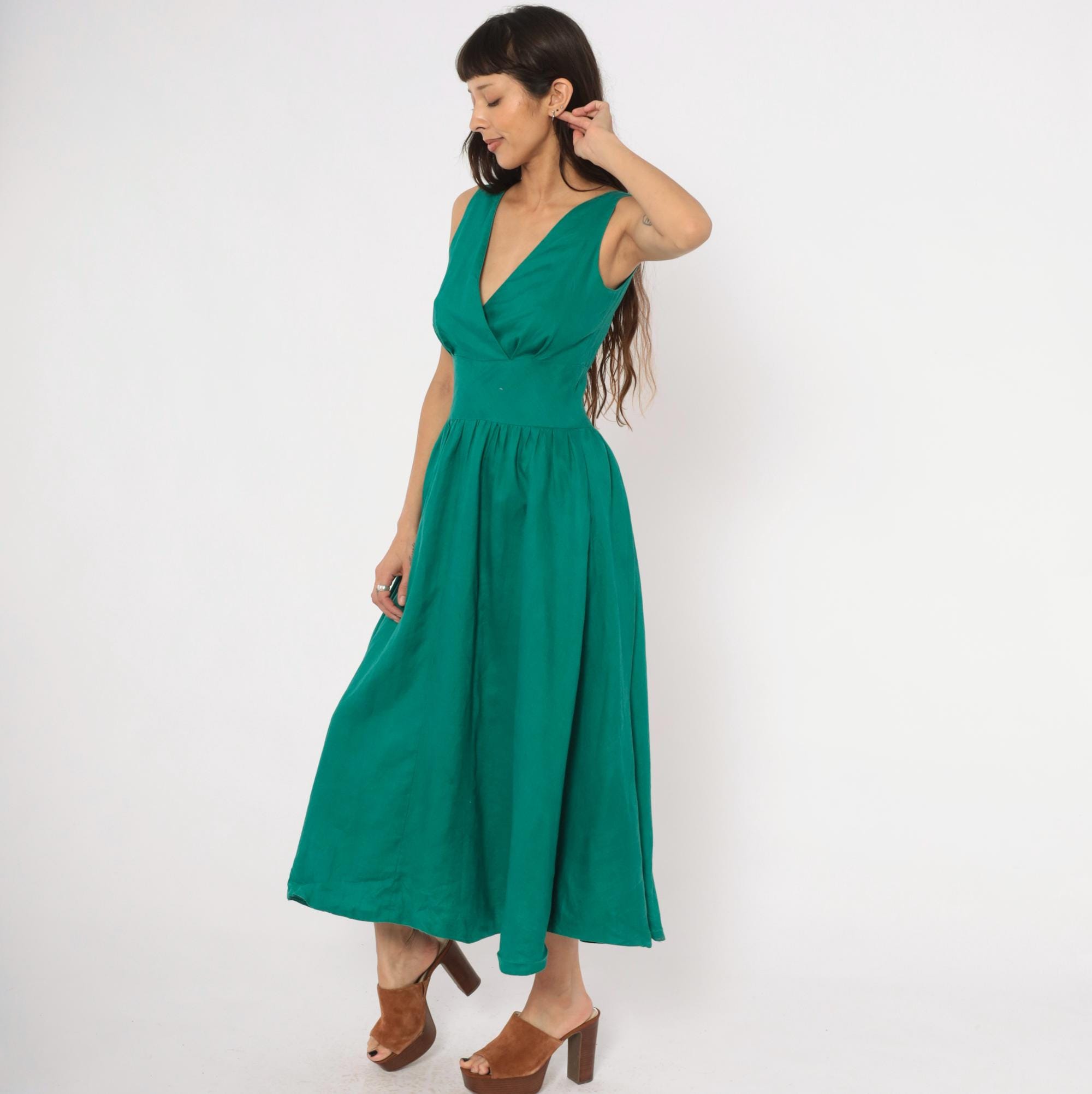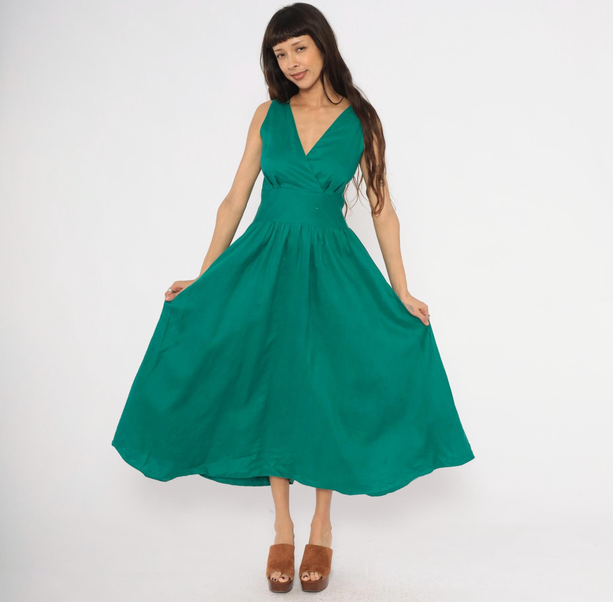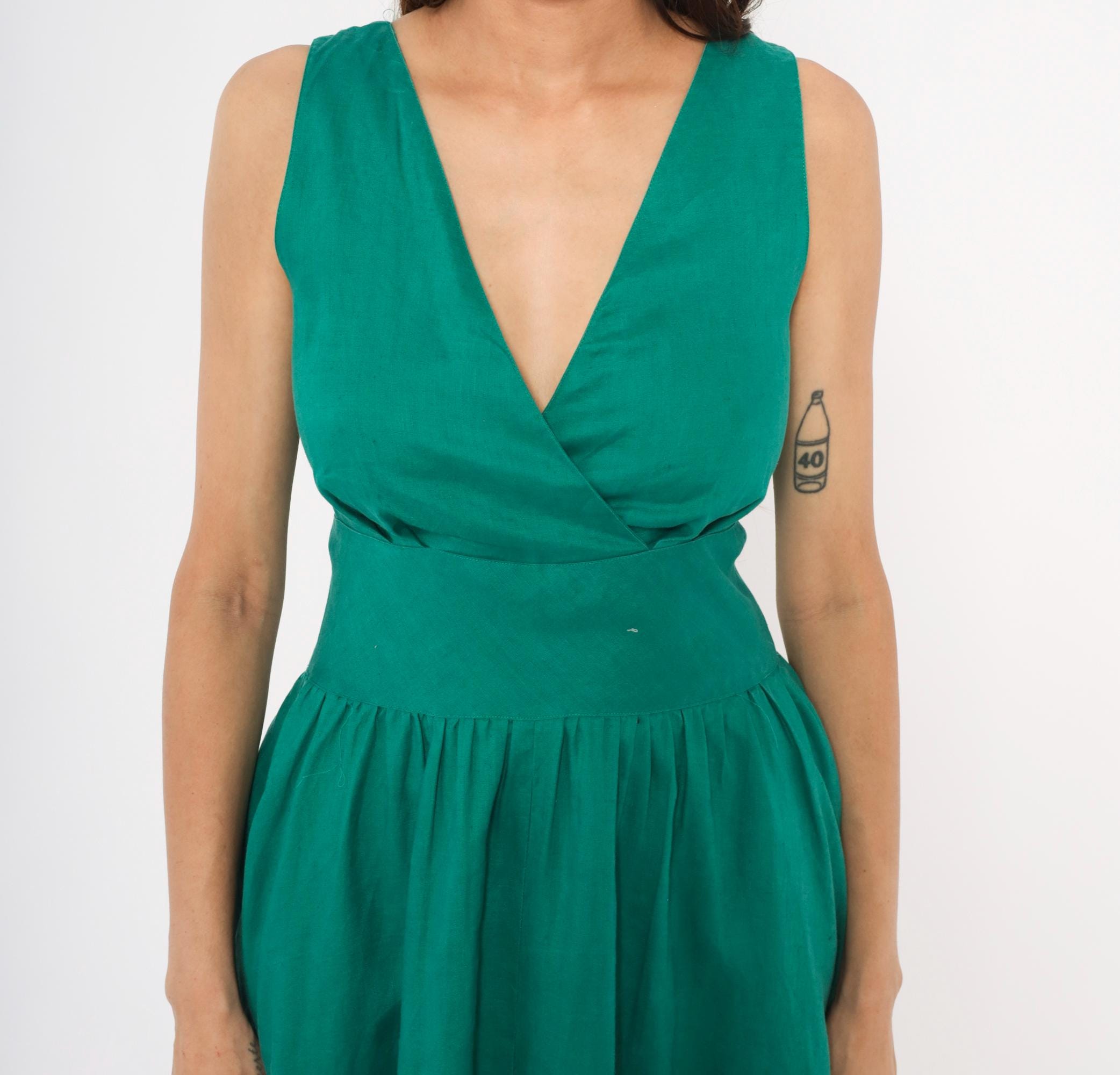 80s teal linen dress from Kenar 2 with a deep surplice V-neckline and wide gathered waistband. Sleeveless bodice with wide shoulder straps and a scoop back. Full gathered skirt with side seam pockets, falling to midi length. Back button closure running from neckline to hem with dark round buttons.