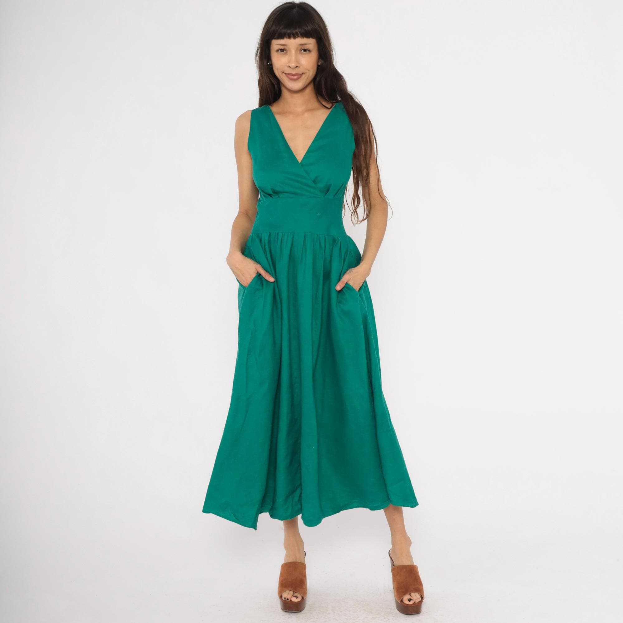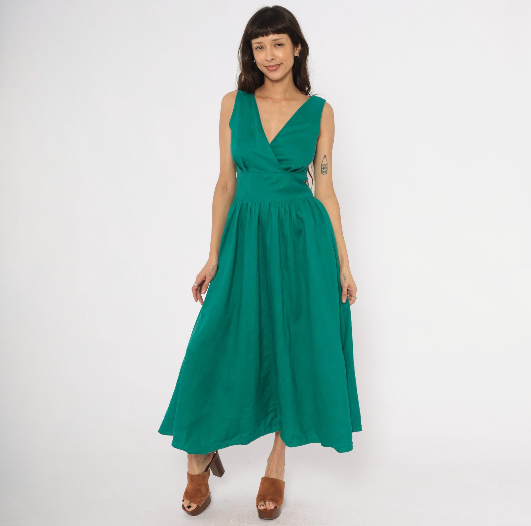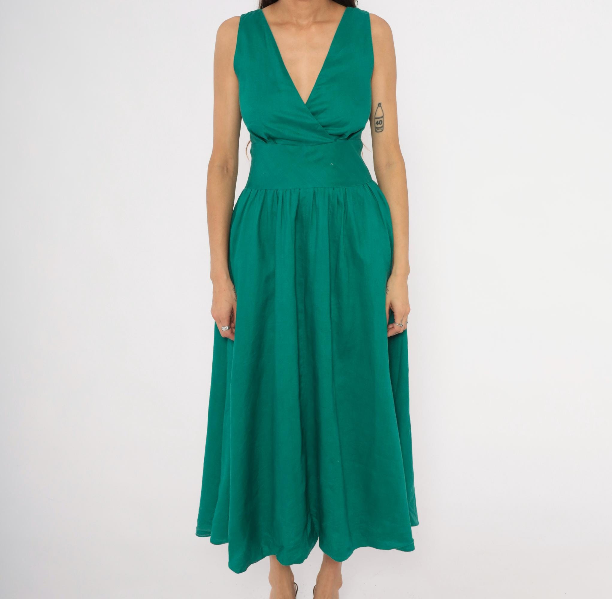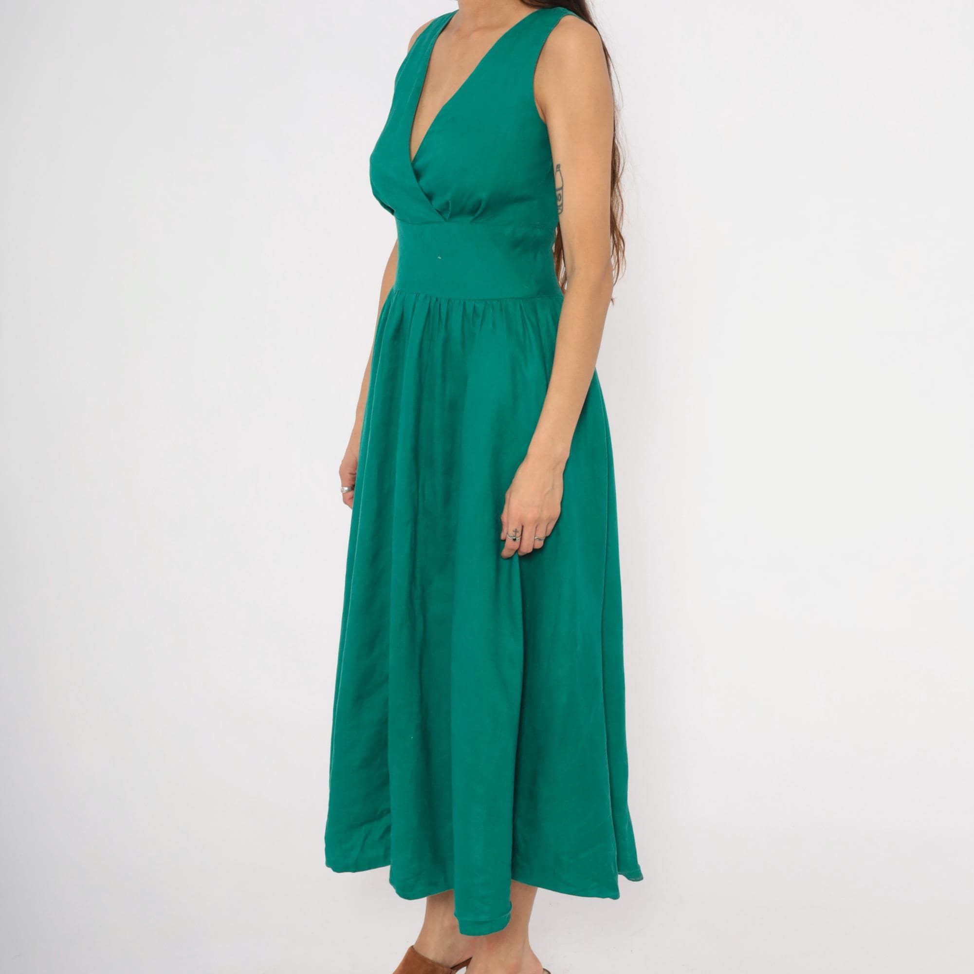 80s teal linen dress from Kenar 2 with a deep surplice V-neckline and wide gathered waistband. Sleeveless bodice with wide shoulder straps and a scoop back. Full gathered skirt with side seam pockets, falling to midi length. Back button closure running from neckline to hem with dark round buttons.