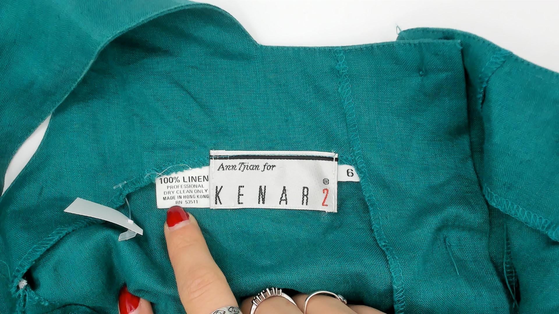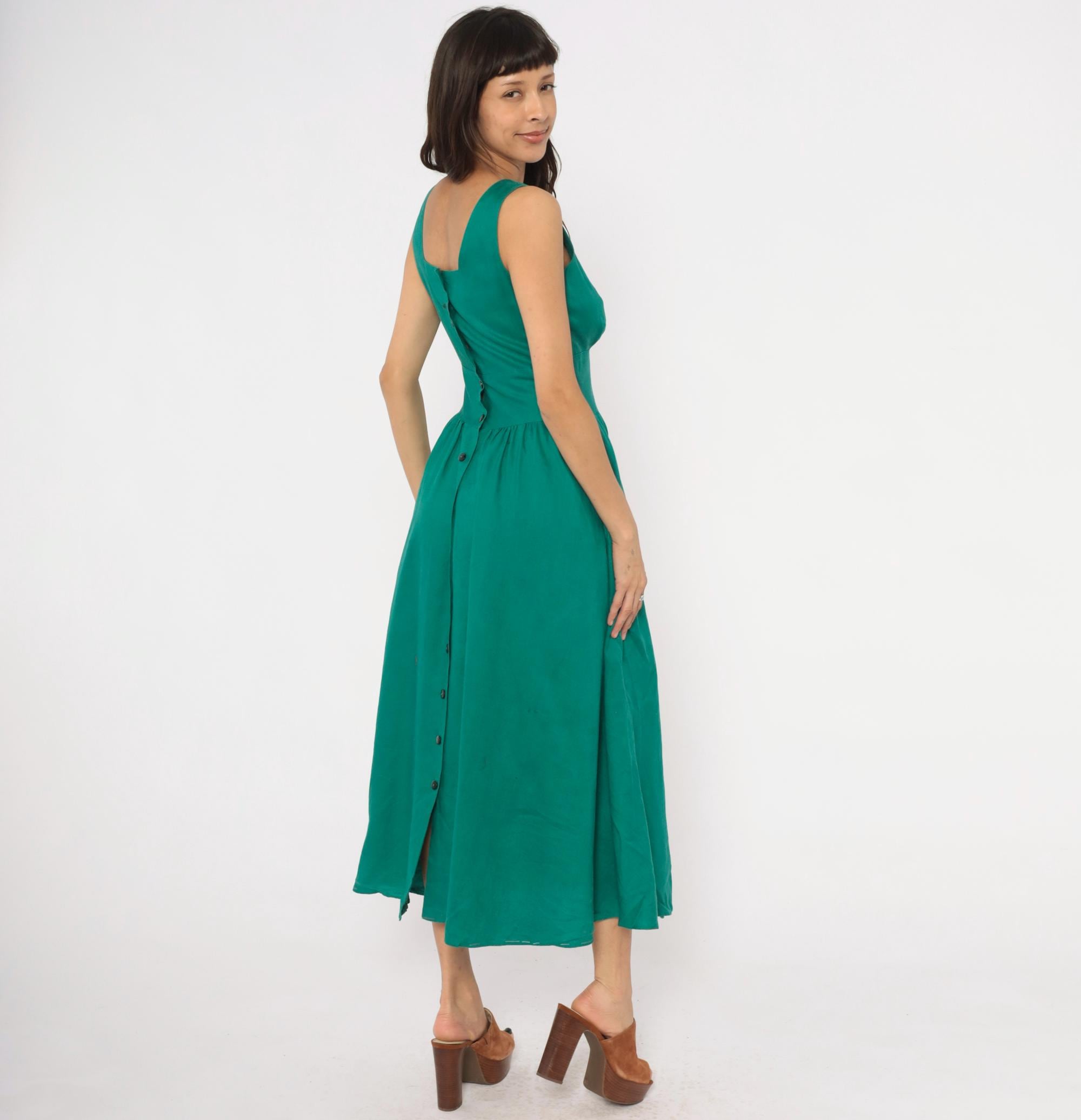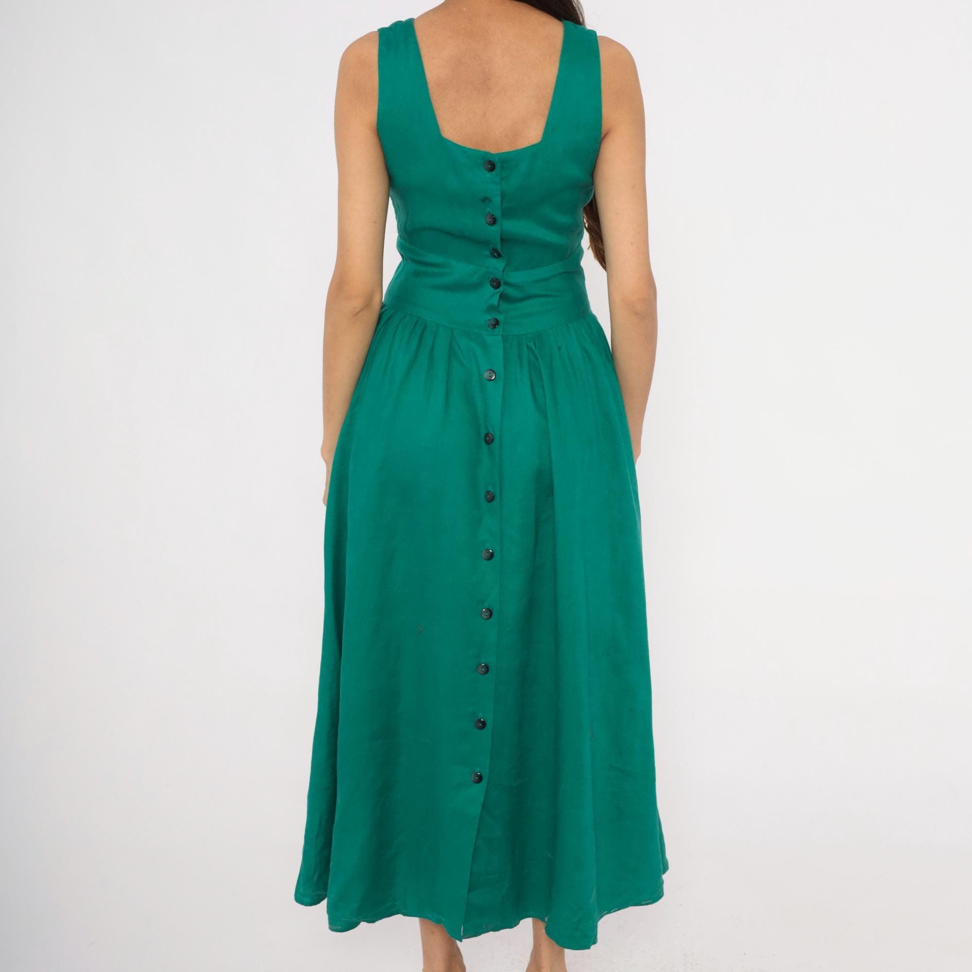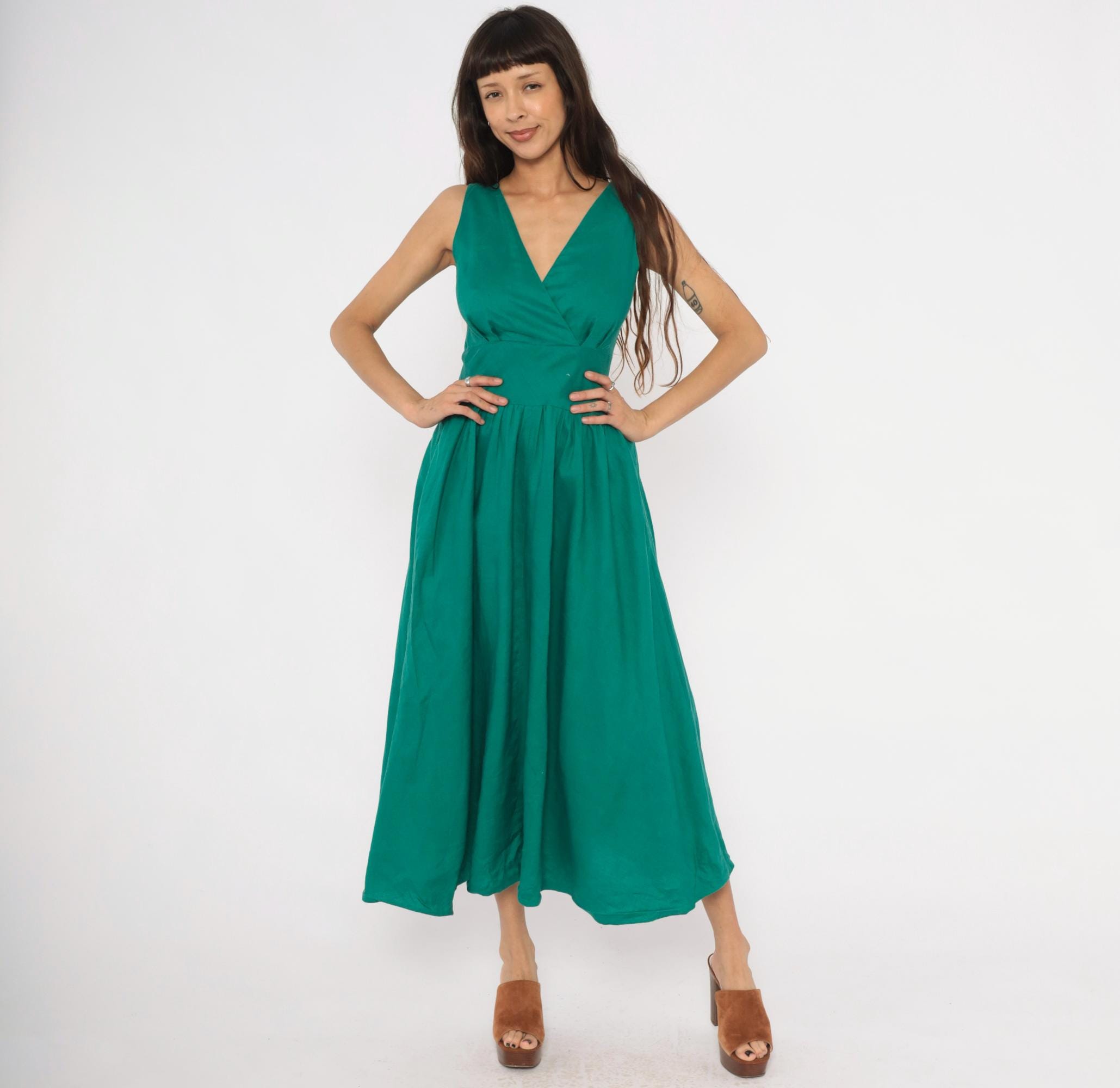 80s teal linen dress from Kenar 2 with a deep surplice V-neckline and wide gathered waistband. Sleeveless bodice with wide shoulder straps and a scoop back. Full gathered skirt with side seam pockets, falling to midi length. Back button closure running from neckline to hem with dark round buttons.