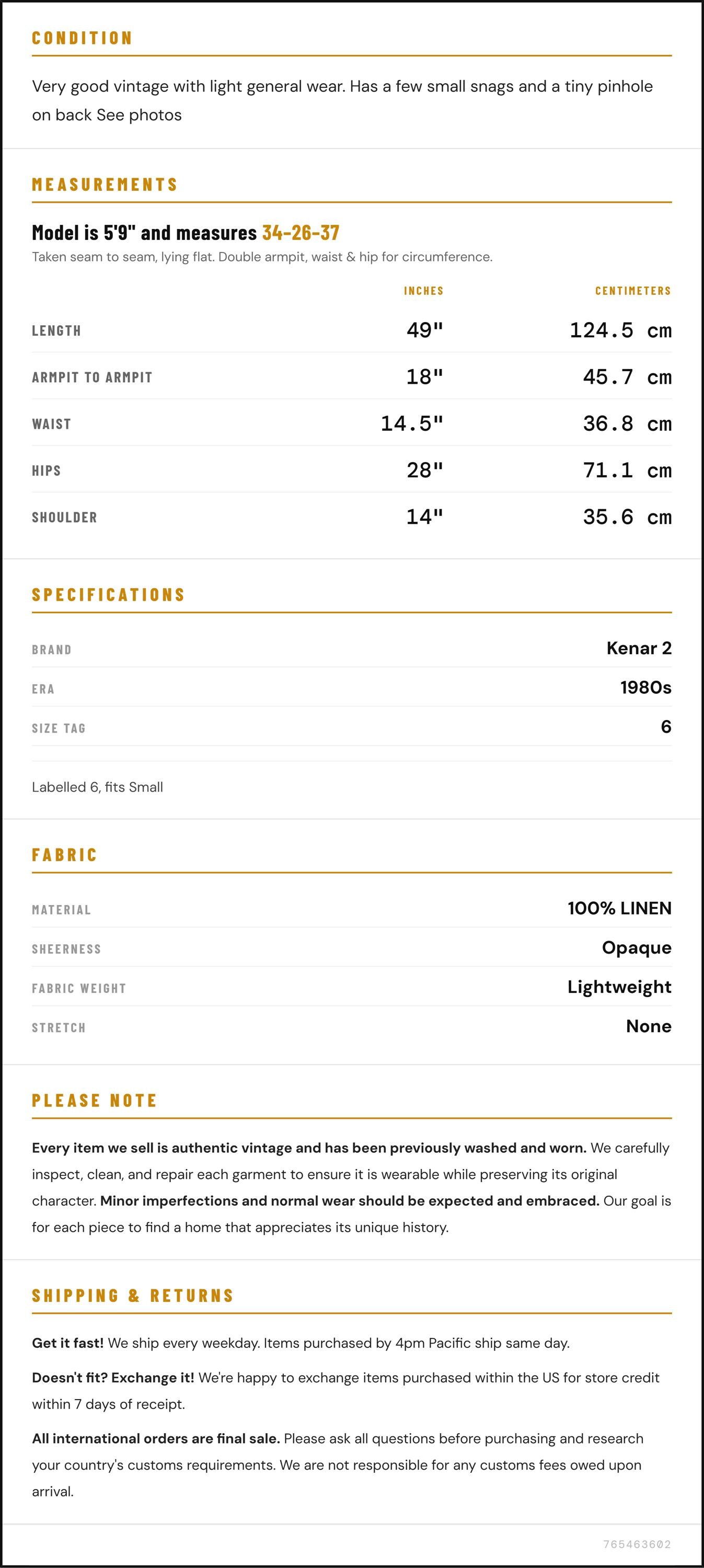 Condition: Very good vintage with light general wear. Has a few small snags and a tiny pinhole on back See photos
