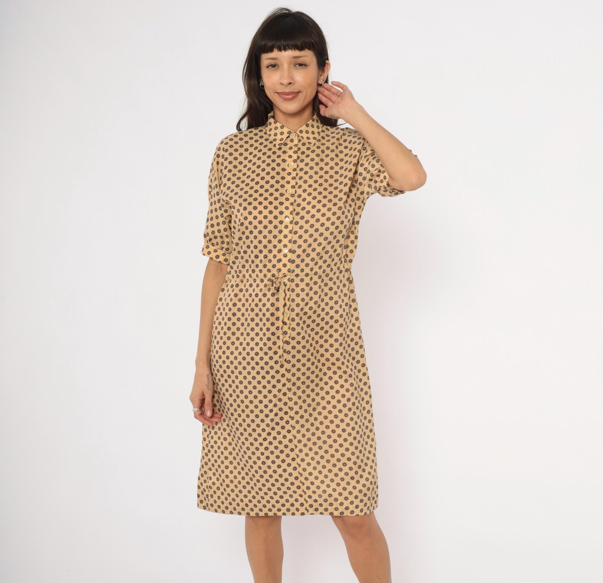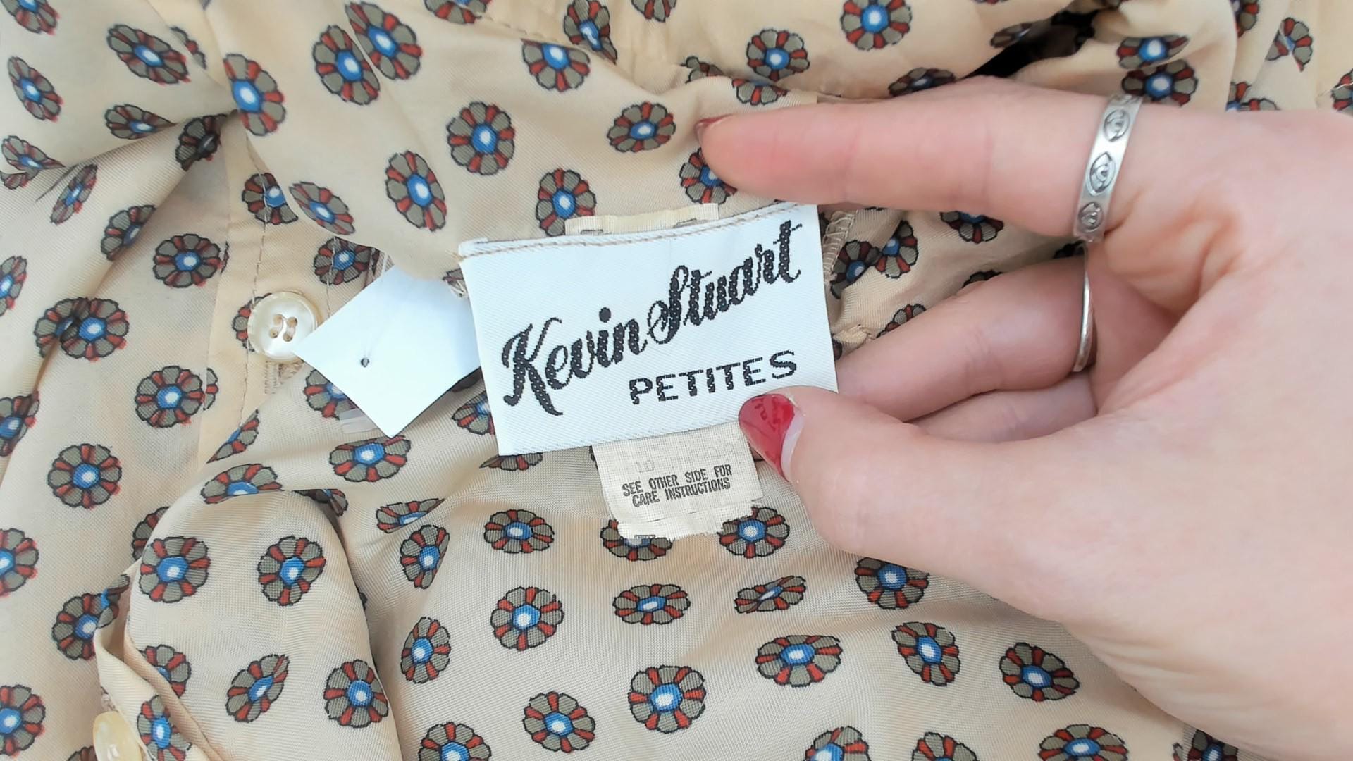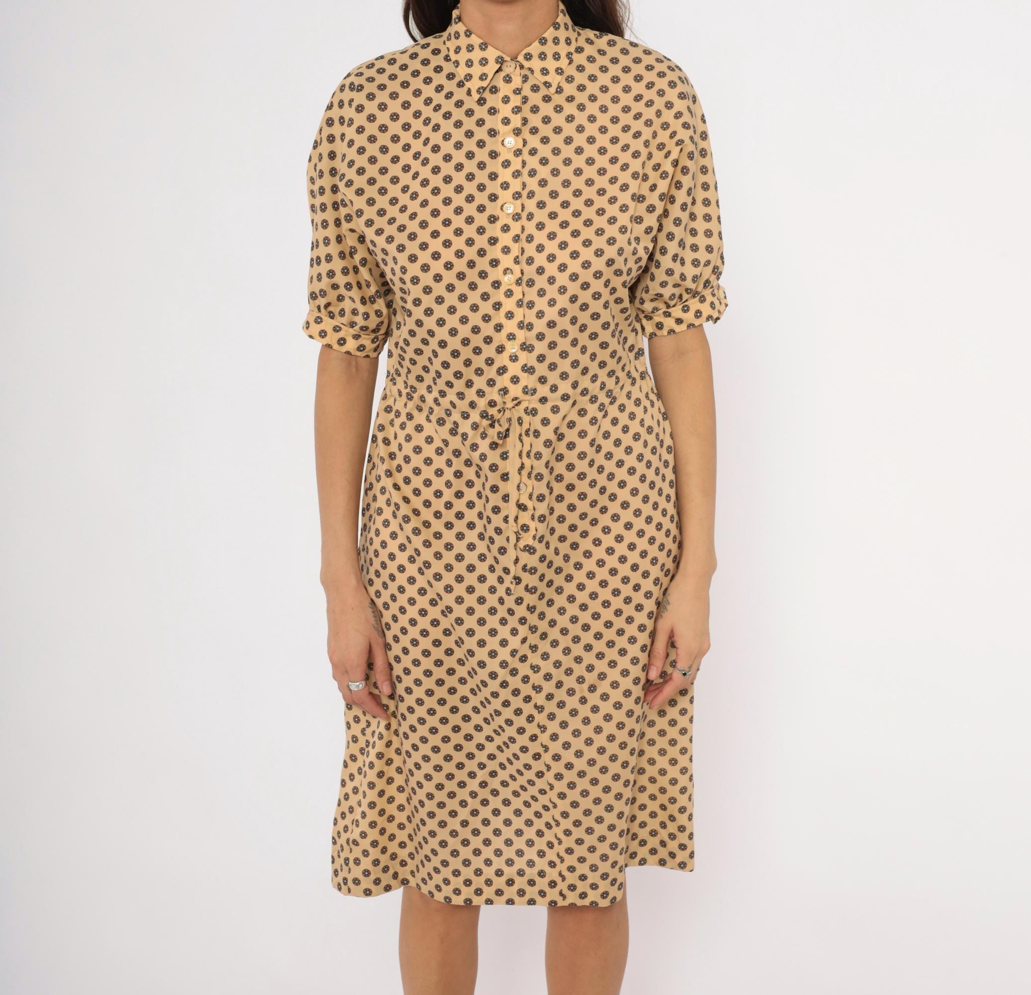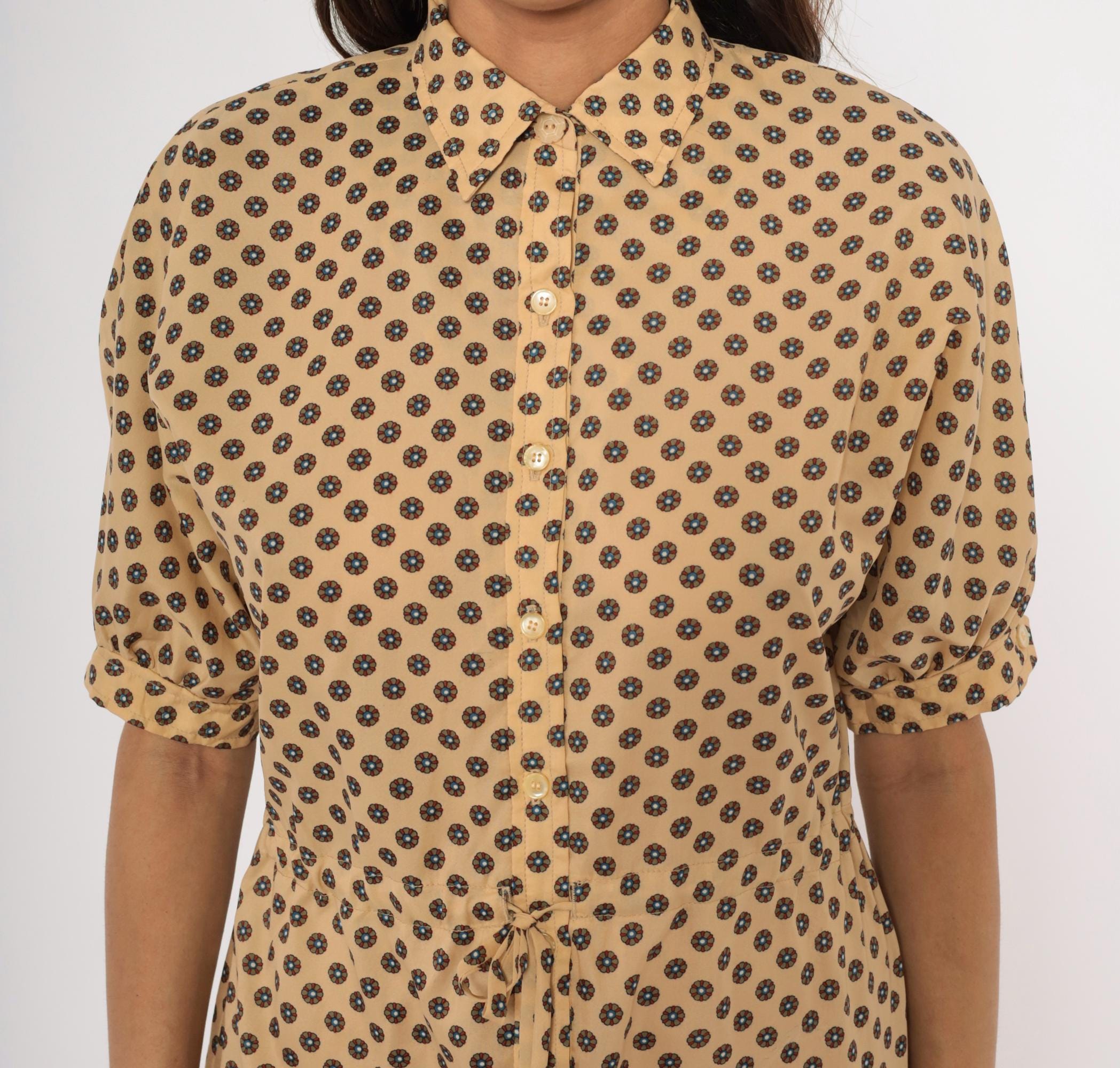 80s tan shirtdress from Kevin Stuart Petites with an allover medallion floral print in brown, blue, and rust tones on a sand-colored ground. Pointed collar, button front closure from neckline to hem, and drawstring tie waist.
