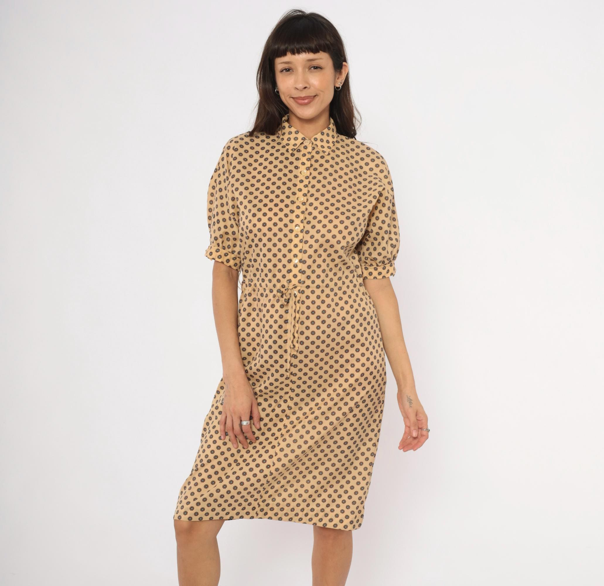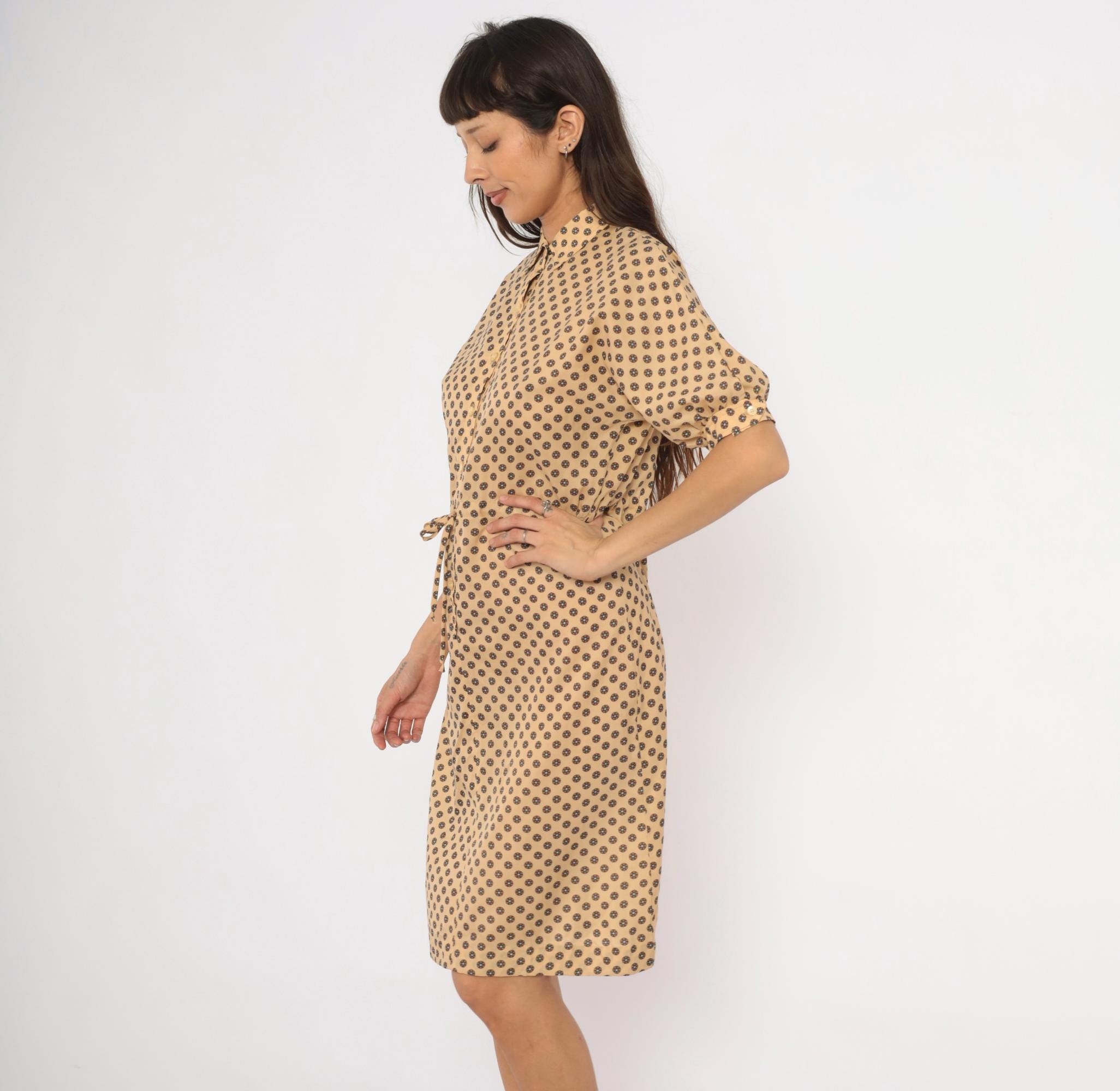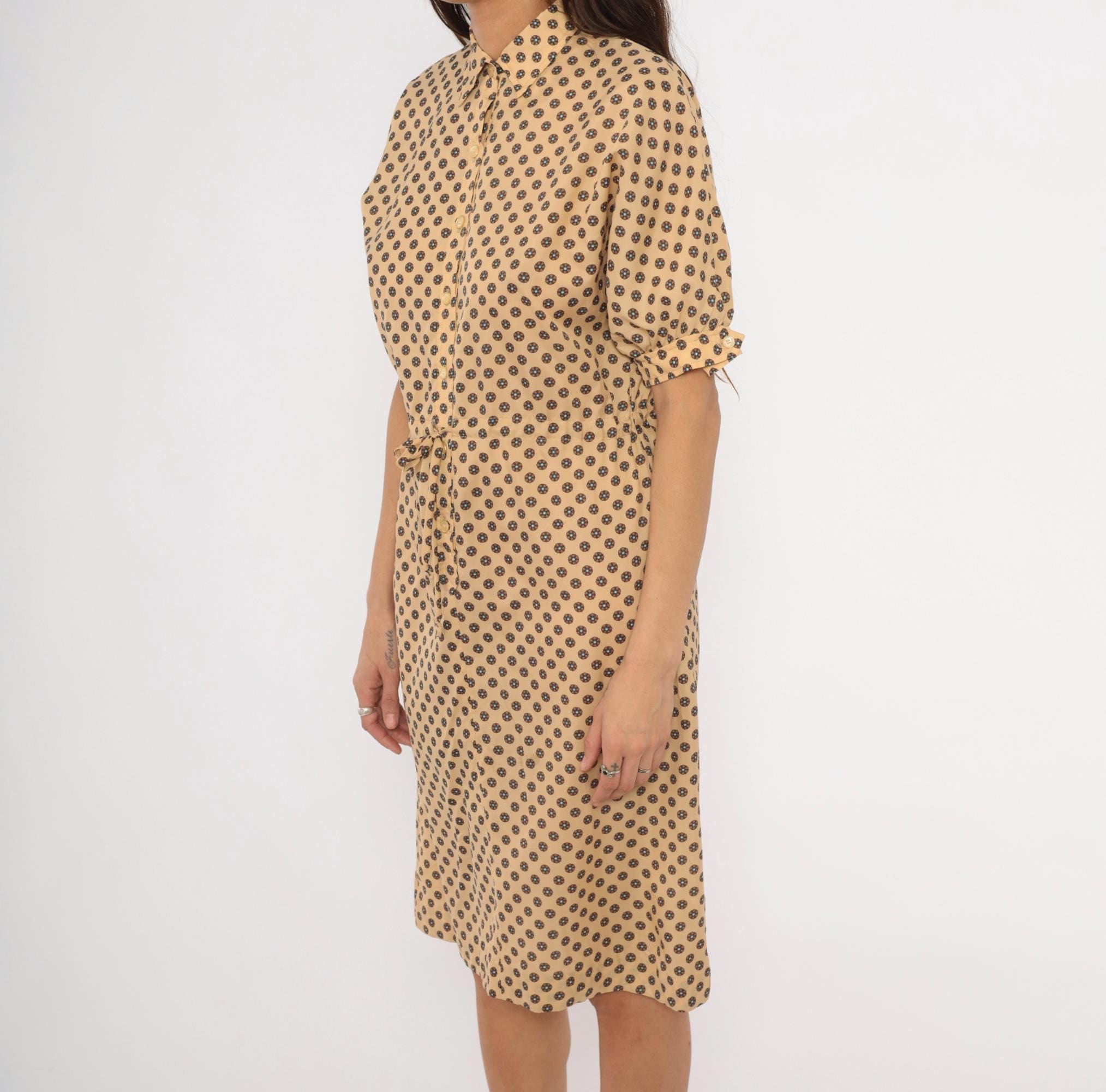 80s tan shirtdress from Kevin Stuart Petites with an allover medallion floral print in brown, blue, and rust tones on a sand-colored ground. Pointed collar, button front closure from neckline to hem, and drawstring tie waist.