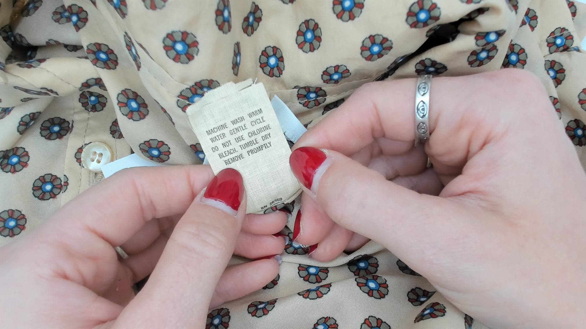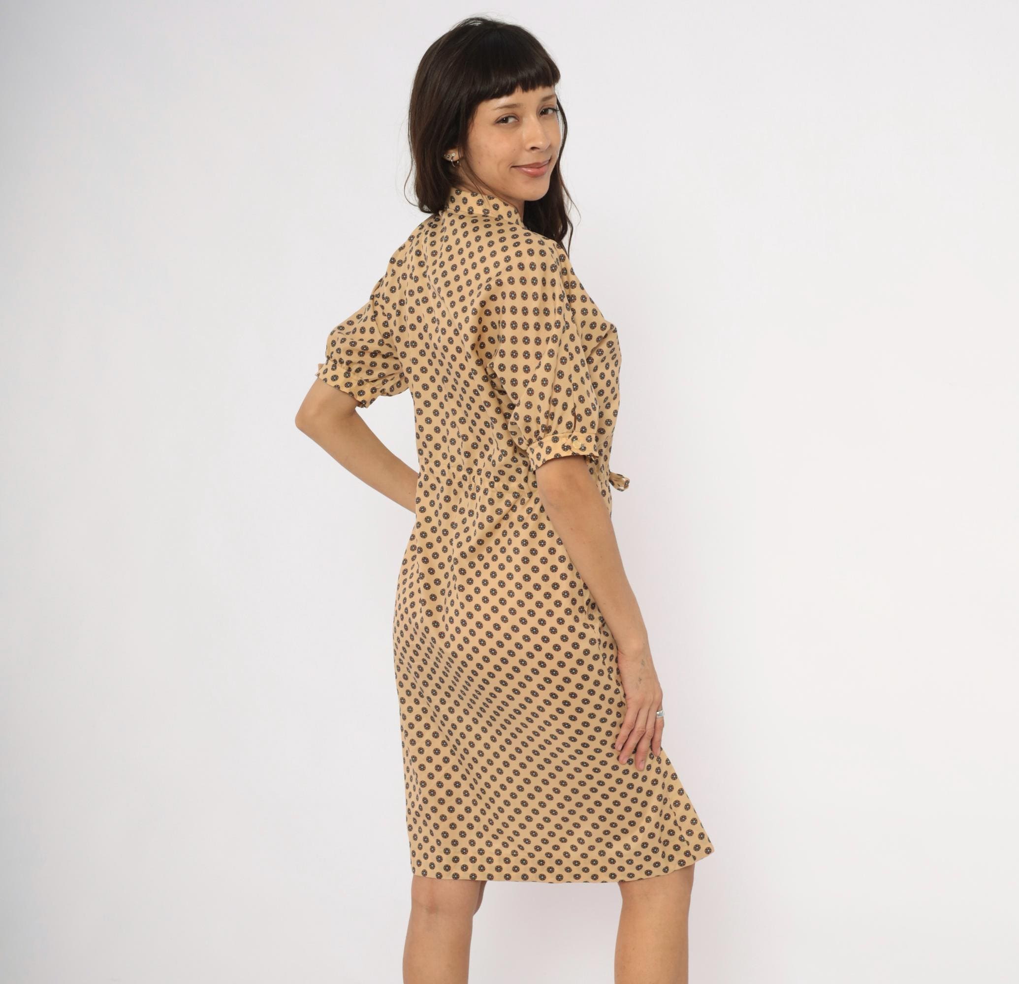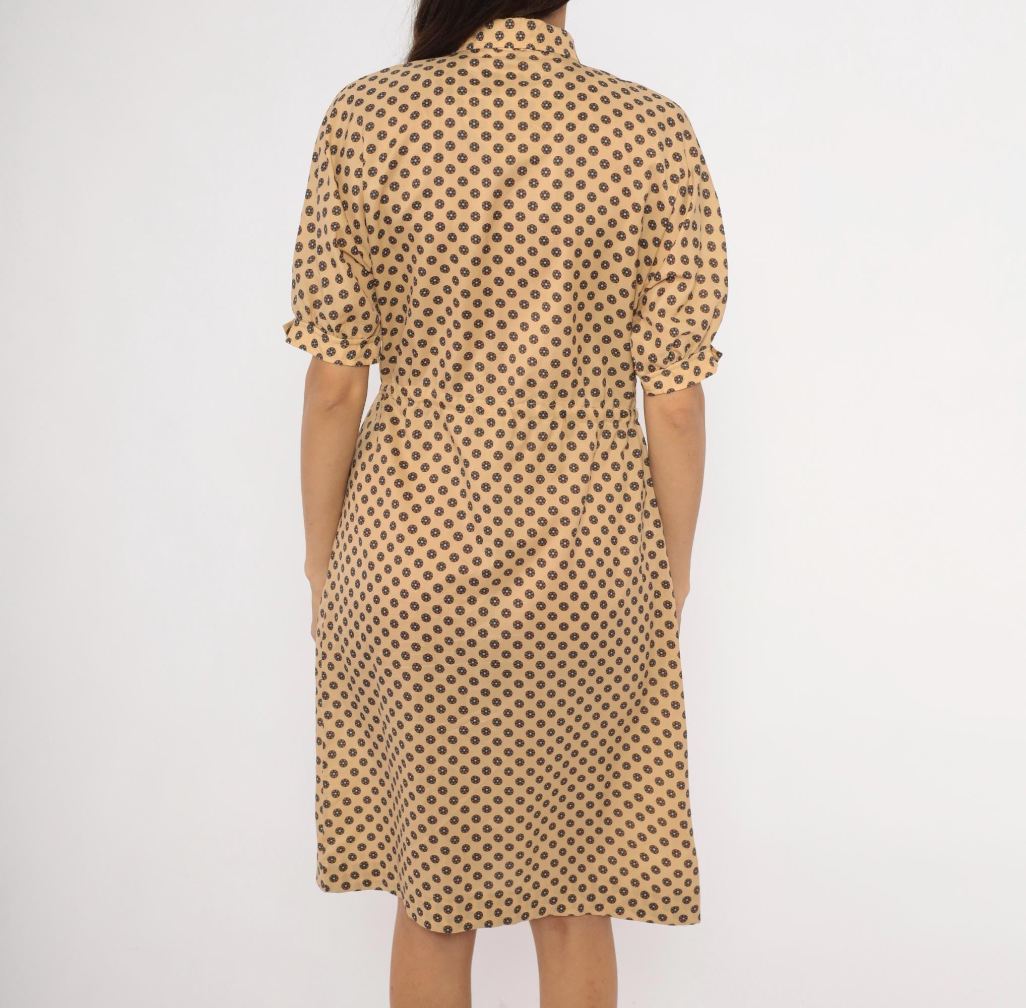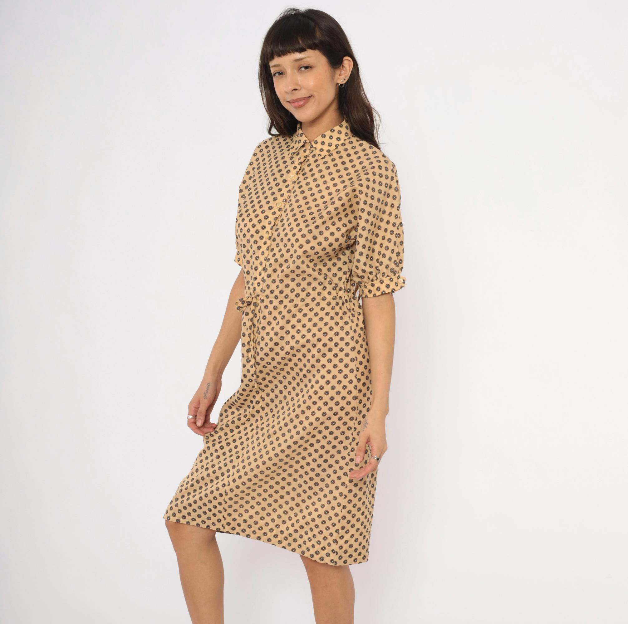 80s tan shirtdress from Kevin Stuart Petites with an allover medallion floral print in brown, blue, and rust tones on a sand-colored ground. Pointed collar, button front closure from neckline to hem, and drawstring tie waist.