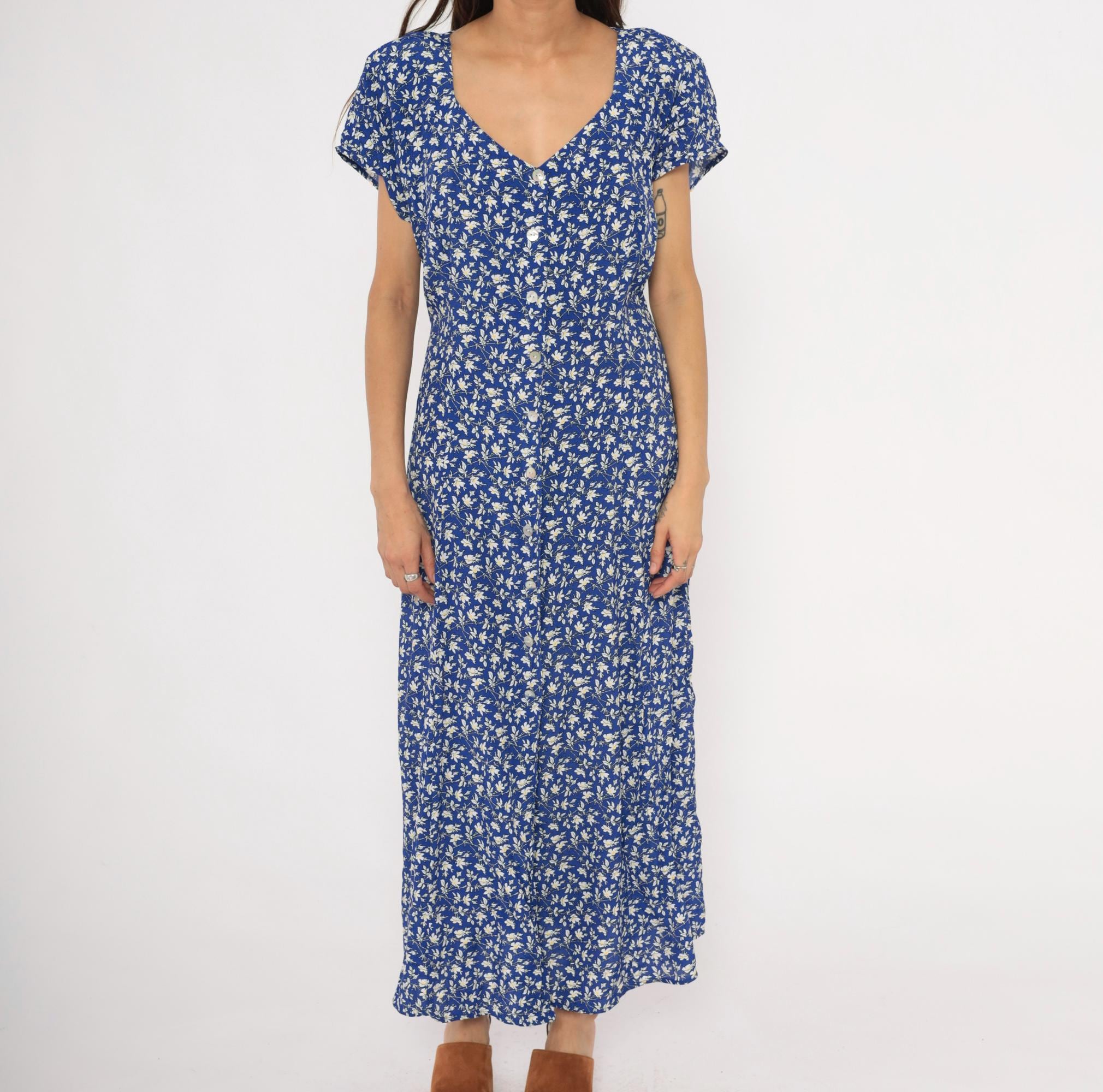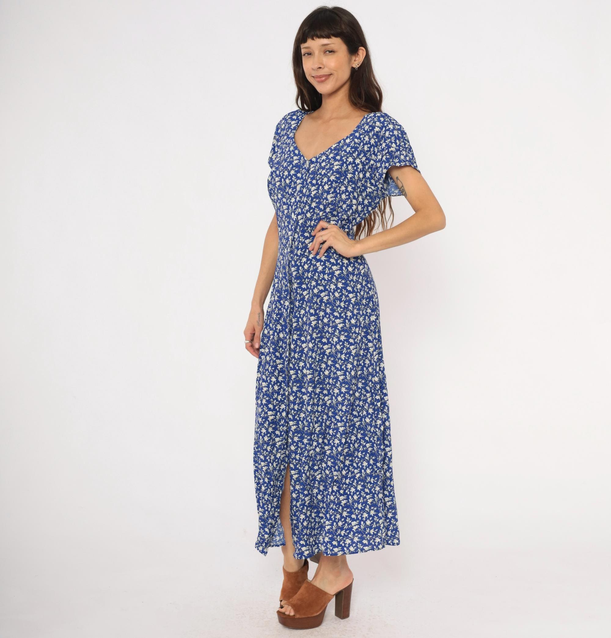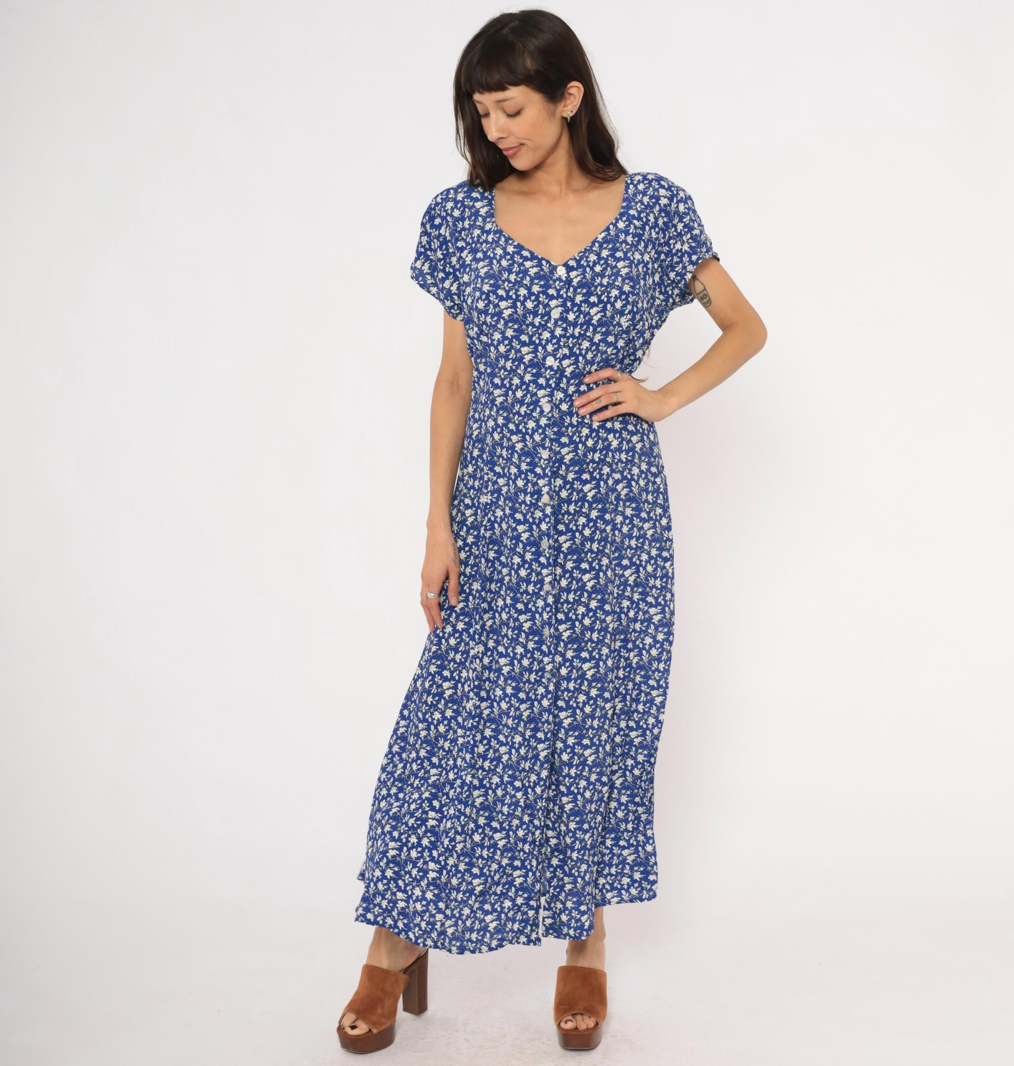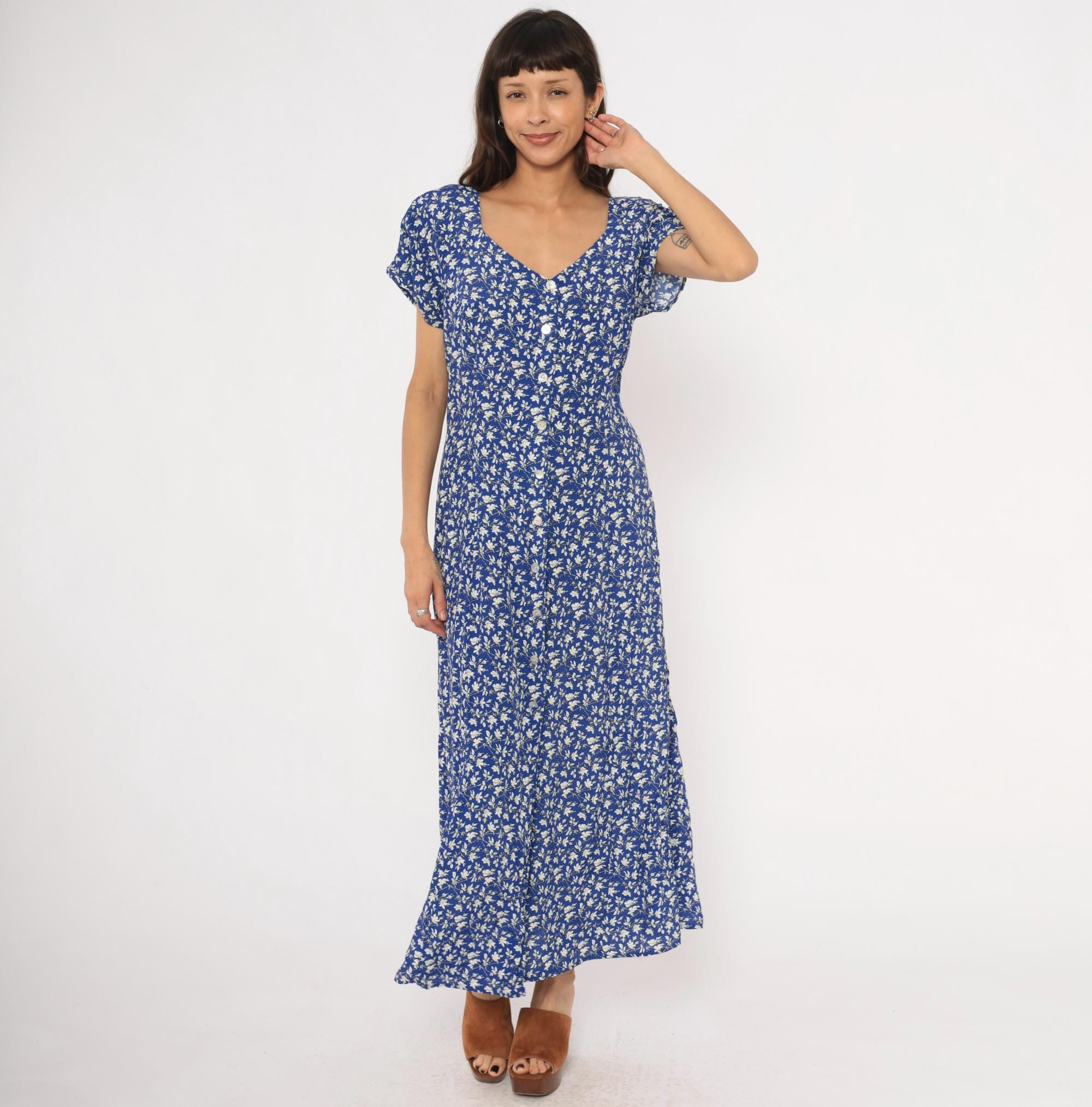 90s blue and white ditsy floral maxi dress from Sheri Martin with a V-neckline and button front closure from bodice to hem. Short flutter sleeves, fitted waist with a tie-back detail, and a full-length A-line skirt. Small white and yellow flowers on stems scattered across a cobalt blue background, with iridescent shell buttons down the center front.