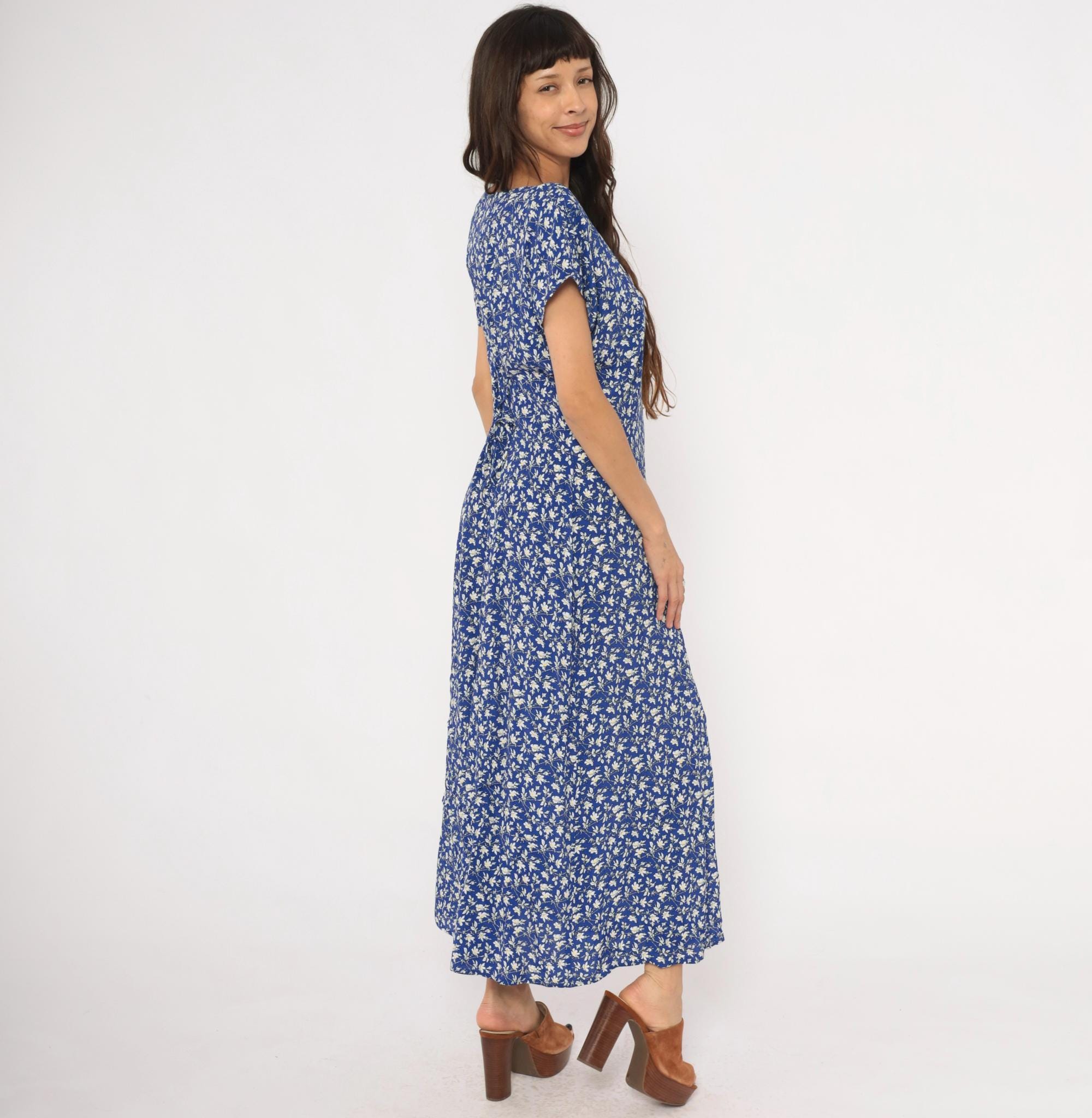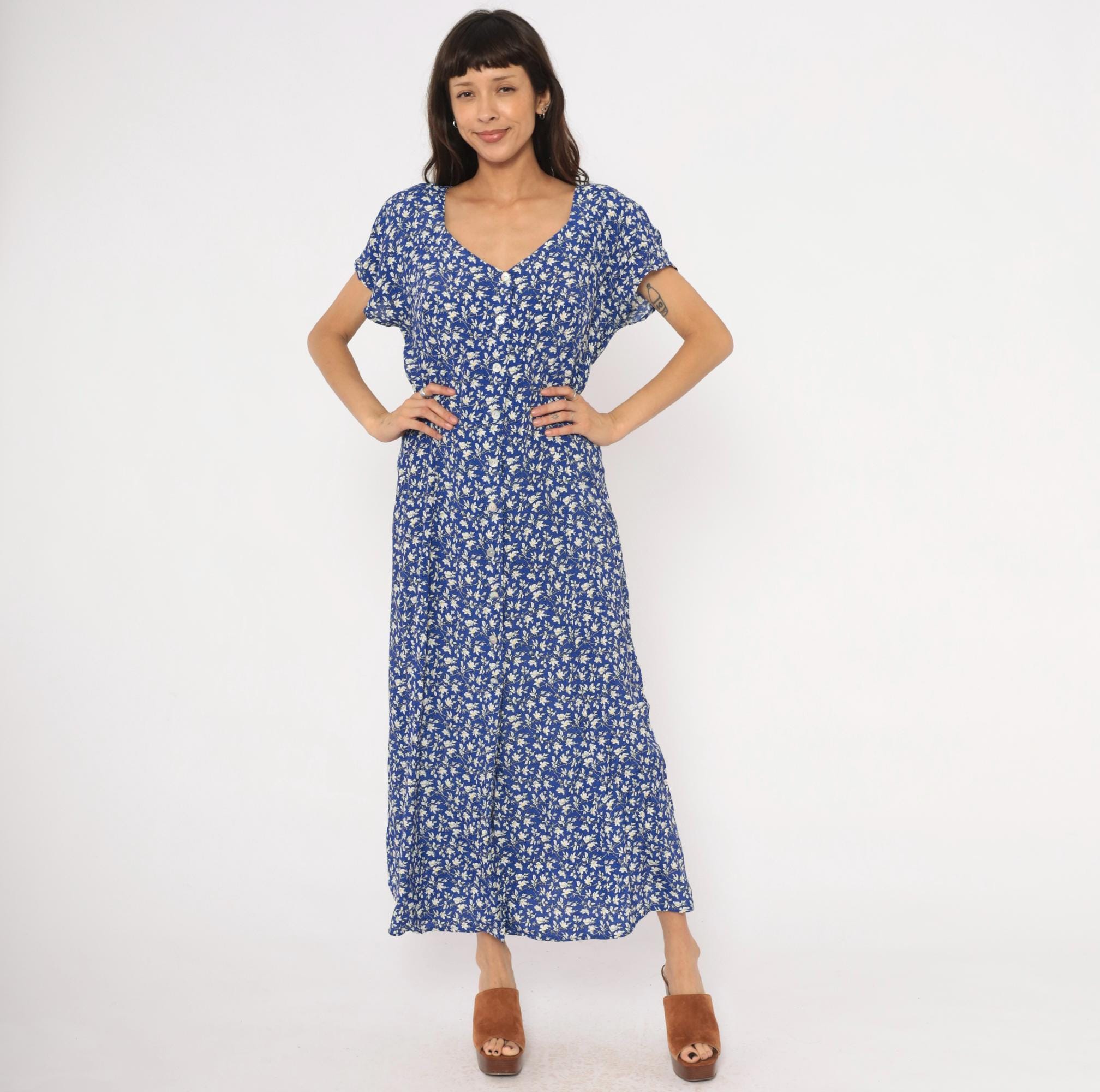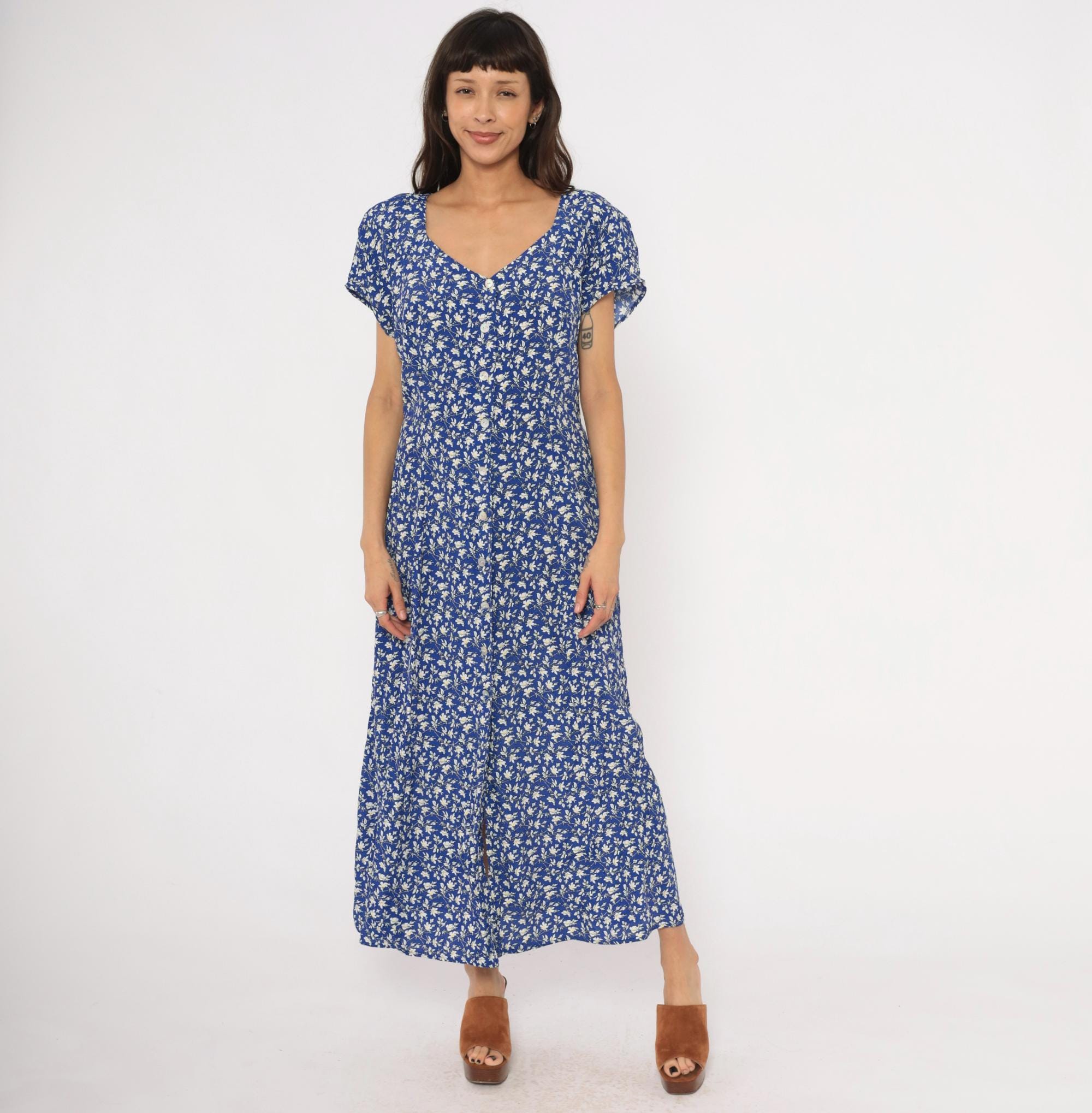 90s blue and white ditsy floral maxi dress from Sheri Martin with a V-neckline and button front closure from bodice to hem. Short flutter sleeves, fitted waist with a tie-back detail, and a full-length A-line skirt. Small white and yellow flowers on stems scattered across a cobalt blue background, with iridescent shell buttons down the center front.