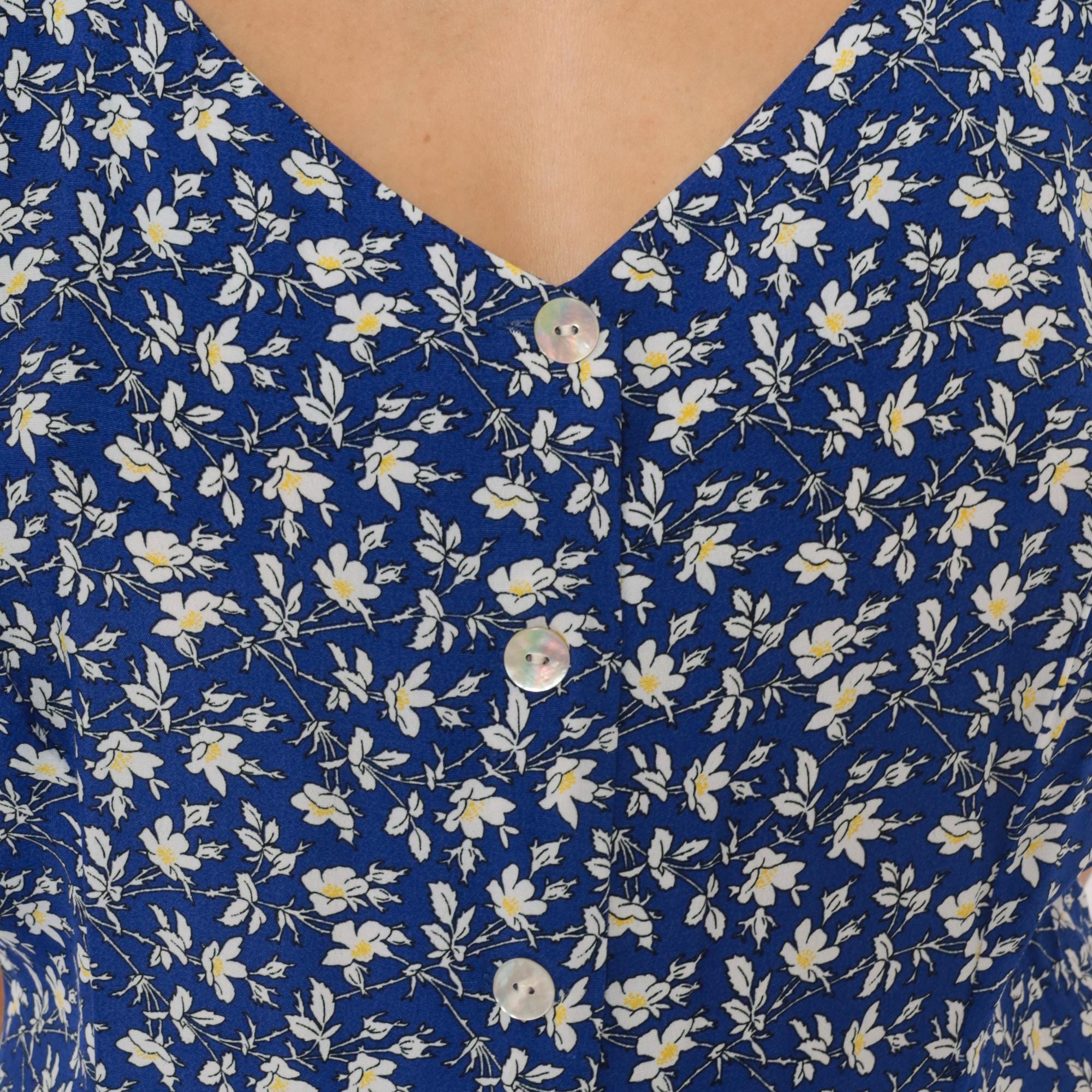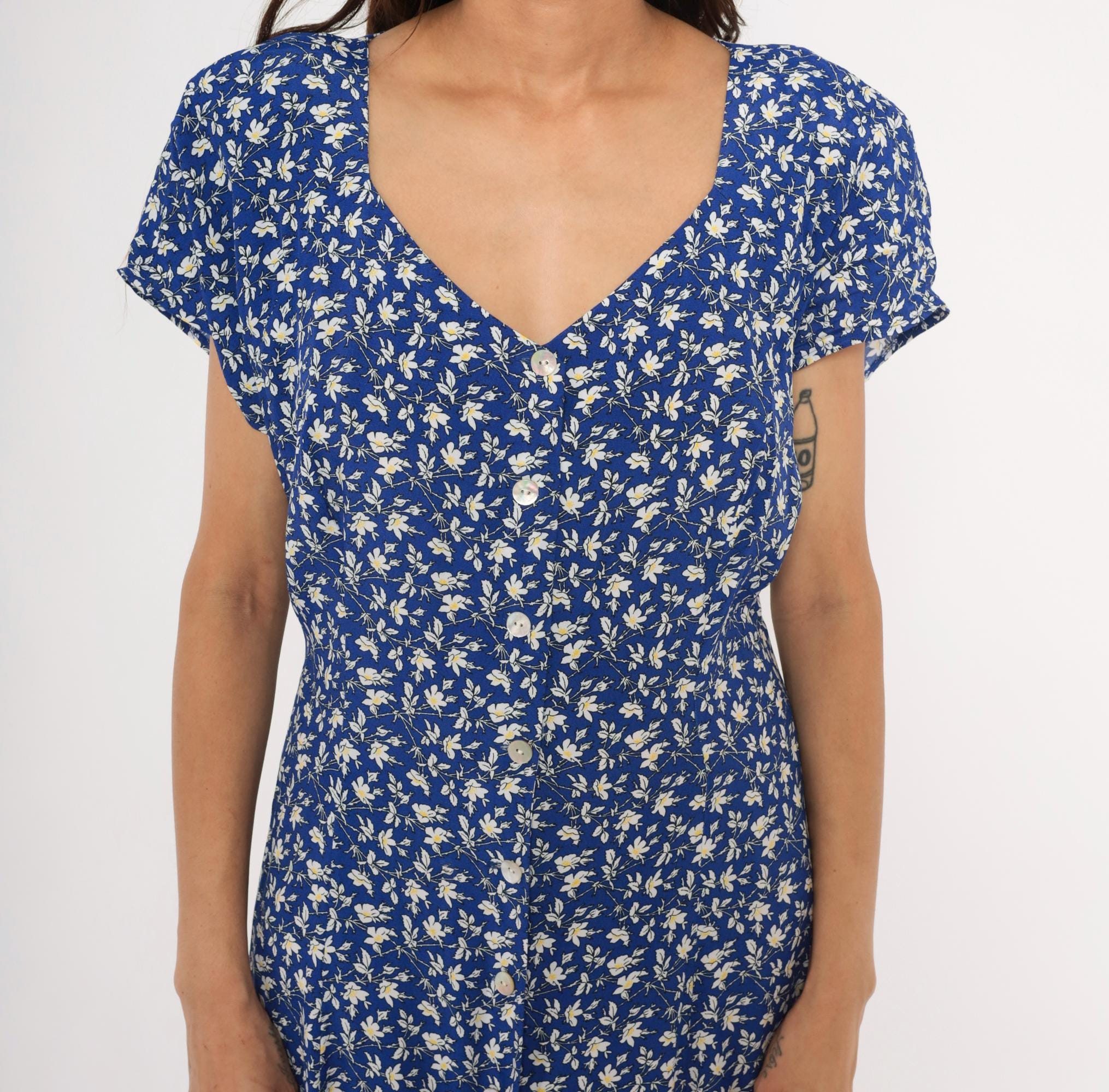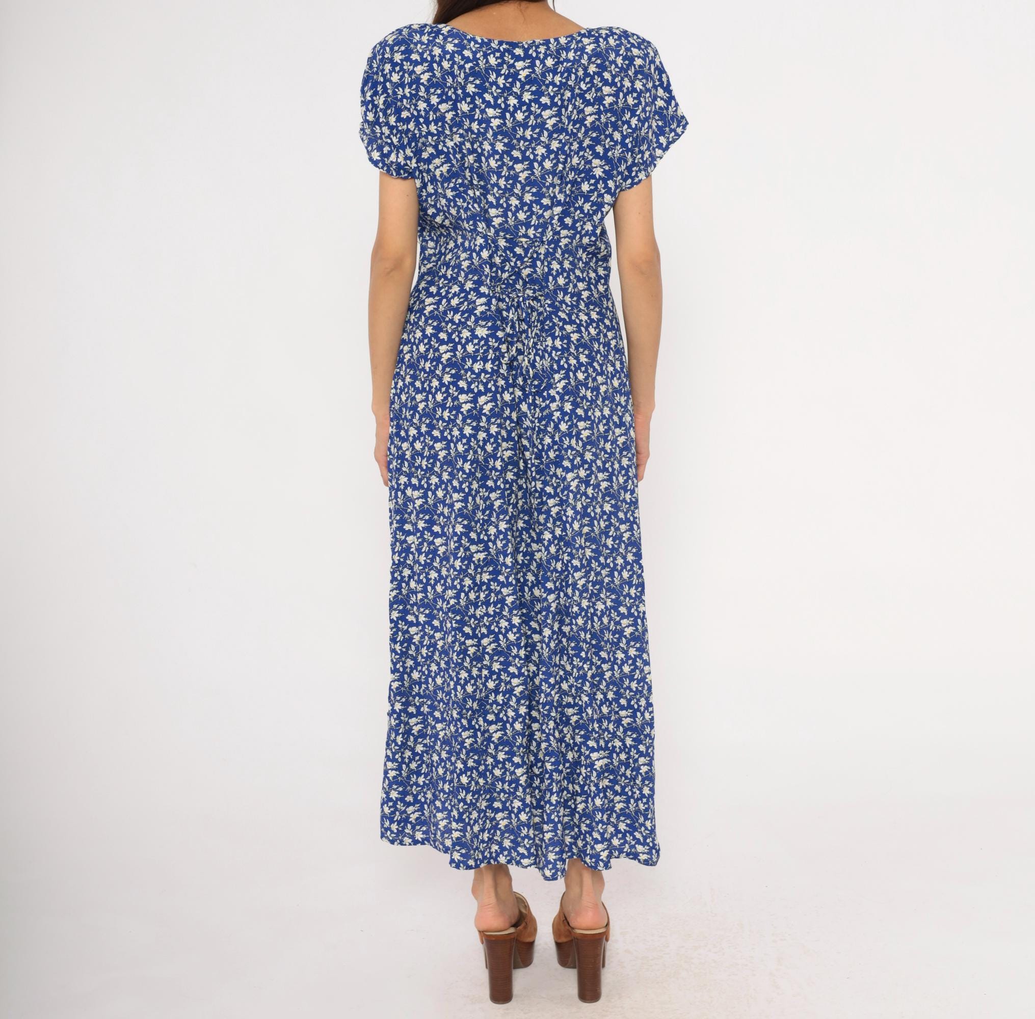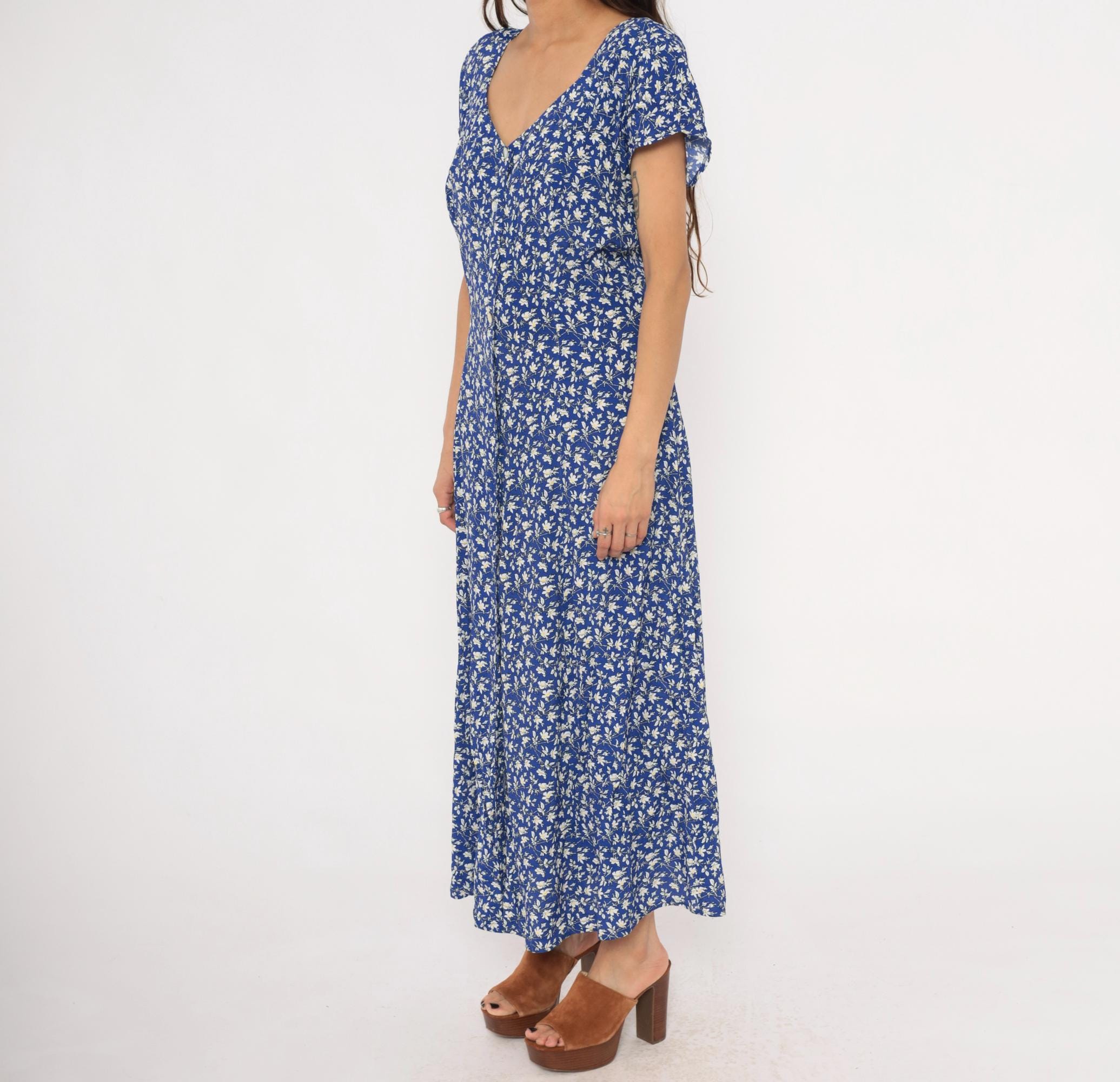 90s blue and white ditsy floral maxi dress from Sheri Martin with a V-neckline and button front closure from bodice to hem. Short flutter sleeves, fitted waist with a tie-back detail, and a full-length A-line skirt. Small white and yellow flowers on stems scattered across a cobalt blue background, with iridescent shell buttons down the center front.
