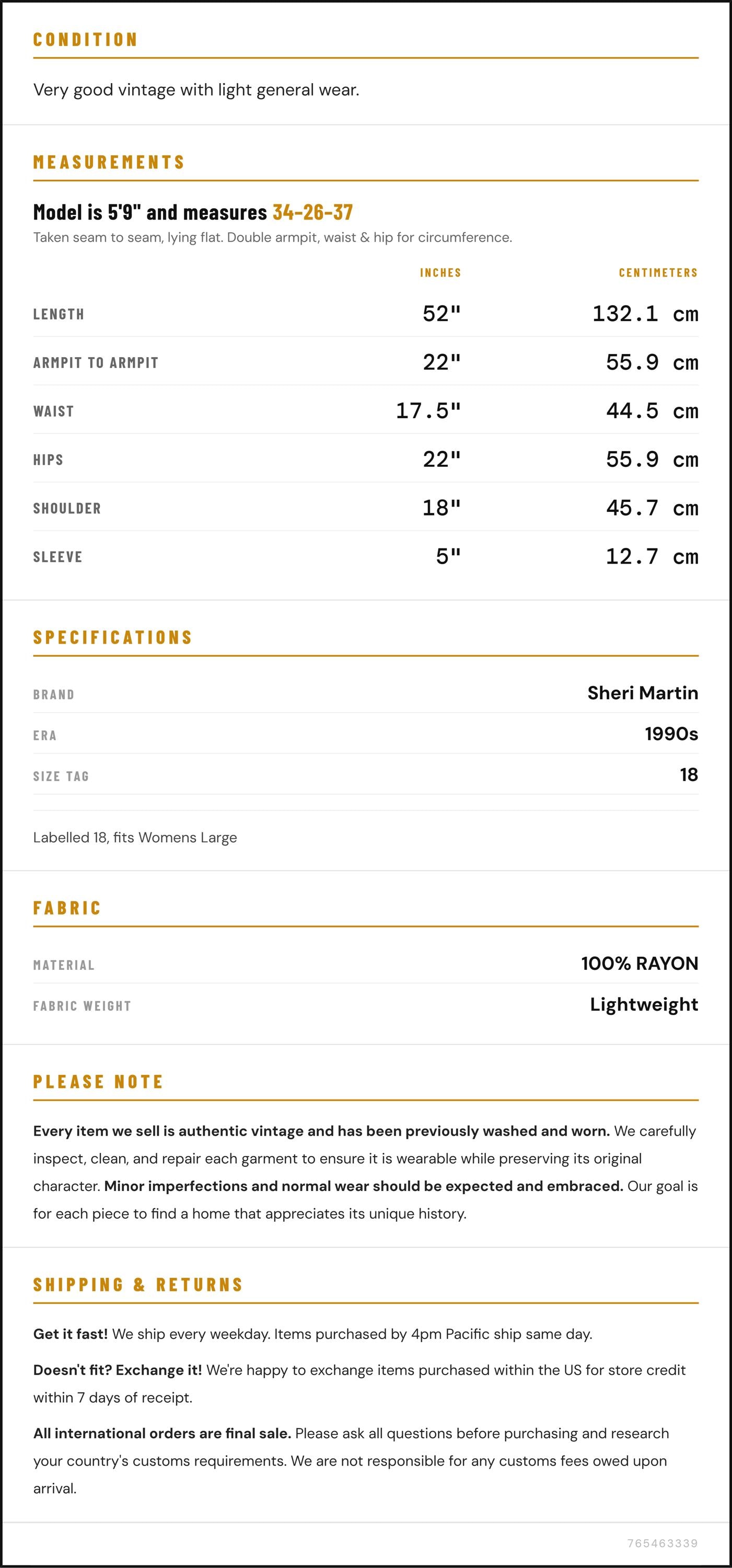 Taken from seam to seam while the garment is lying flat. Double the armpit, waist, and hip measurements.