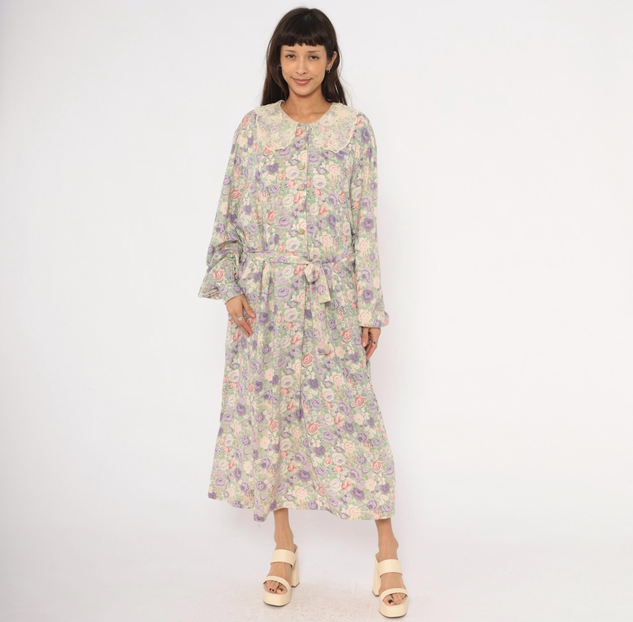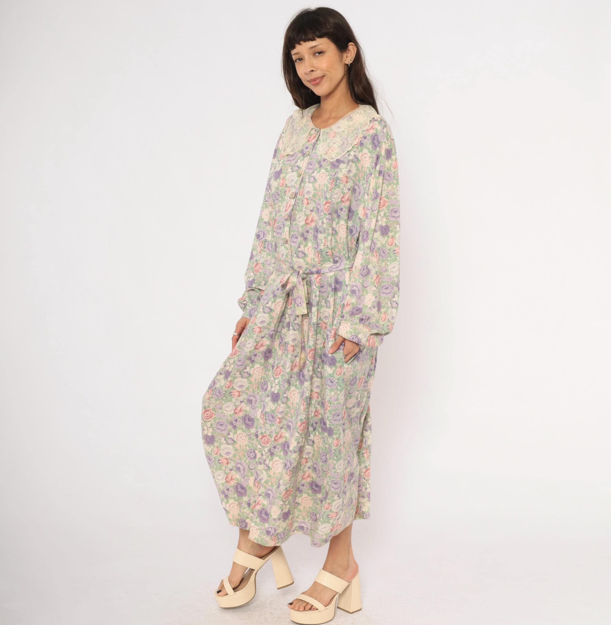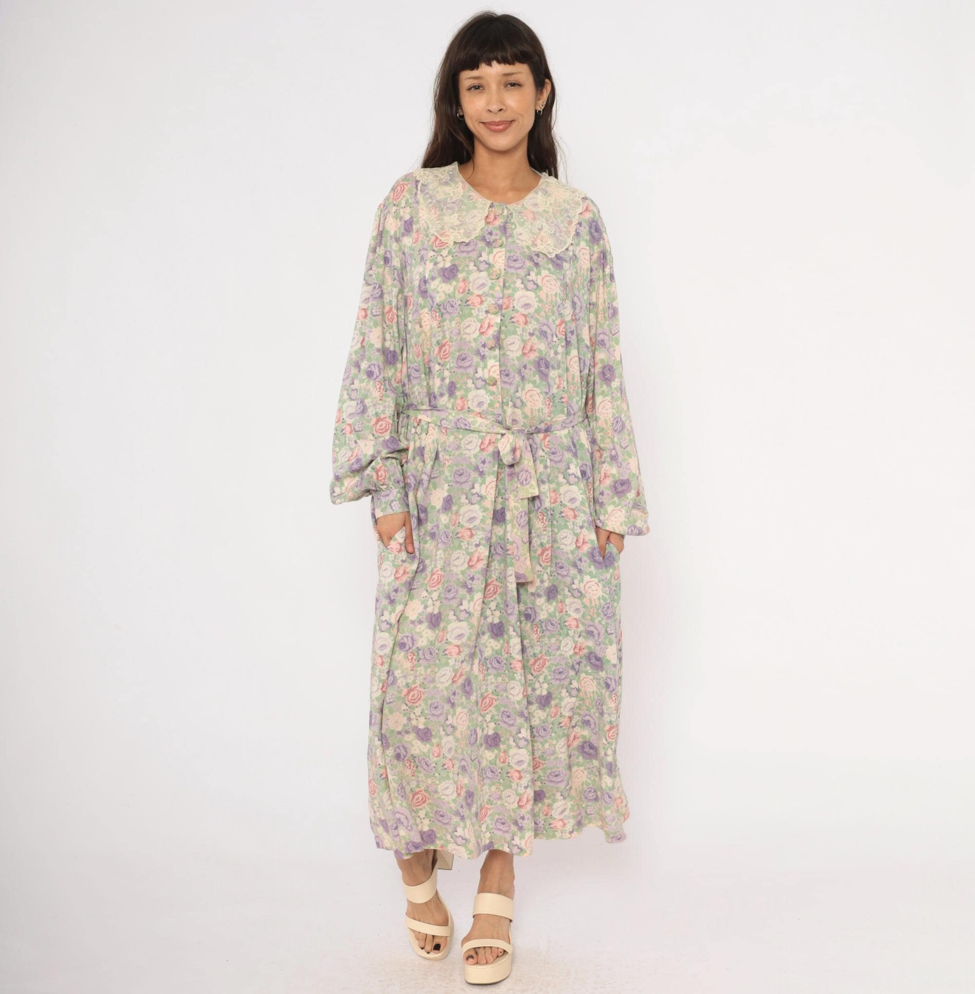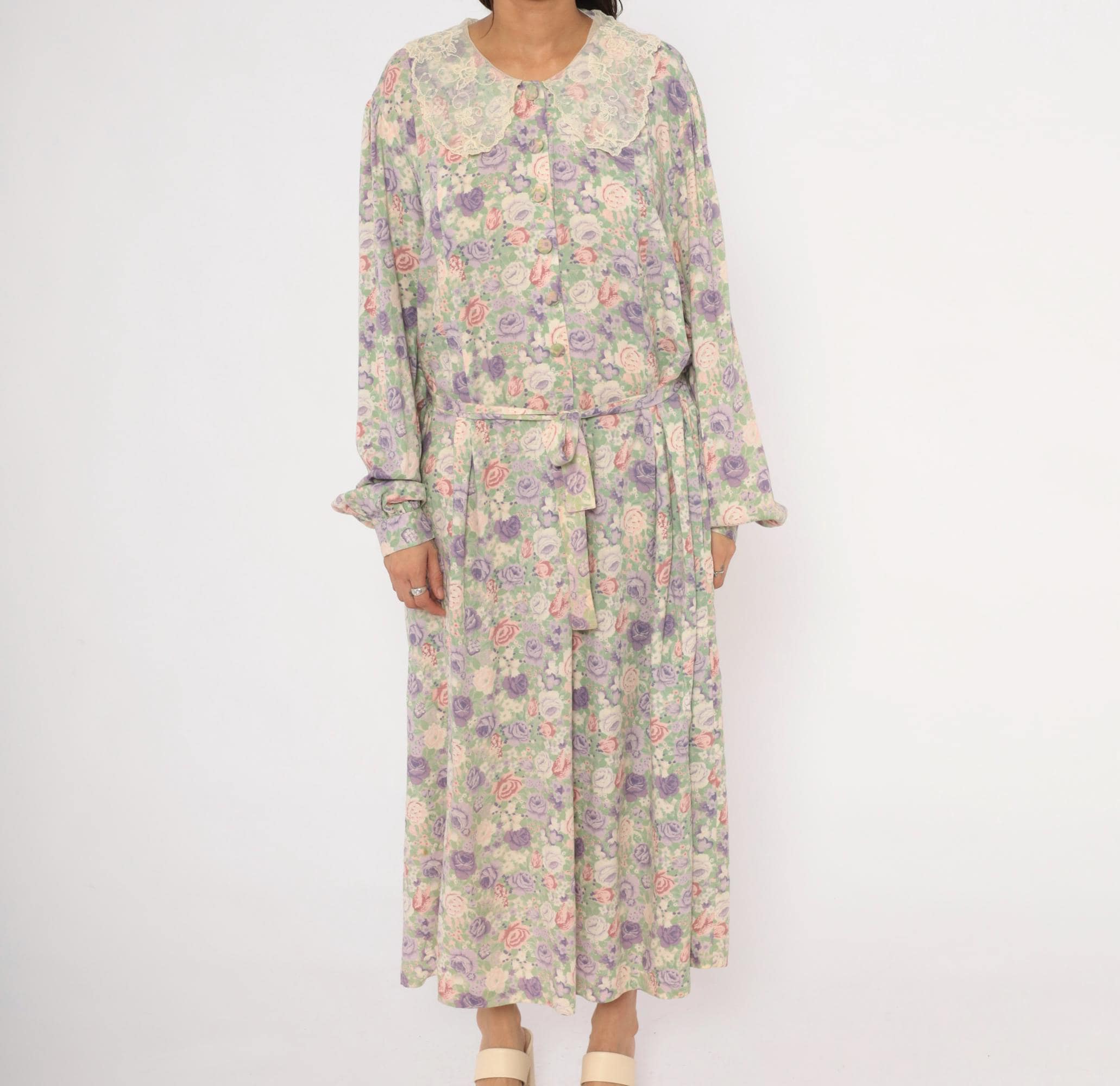 90s floral maxi dress from J Jill LTD with a large lace Peter Pan collar in cream and a full button front closure. Purple, pink, rose, and sage green flower print on a cream ground, with long gathered sleeves finished in ruffled cuffs. Matching fabric belt ties at the natural waist, and side seam pockets sit at the hips. Dropped waist seam with a gathered, flowing skirt below.