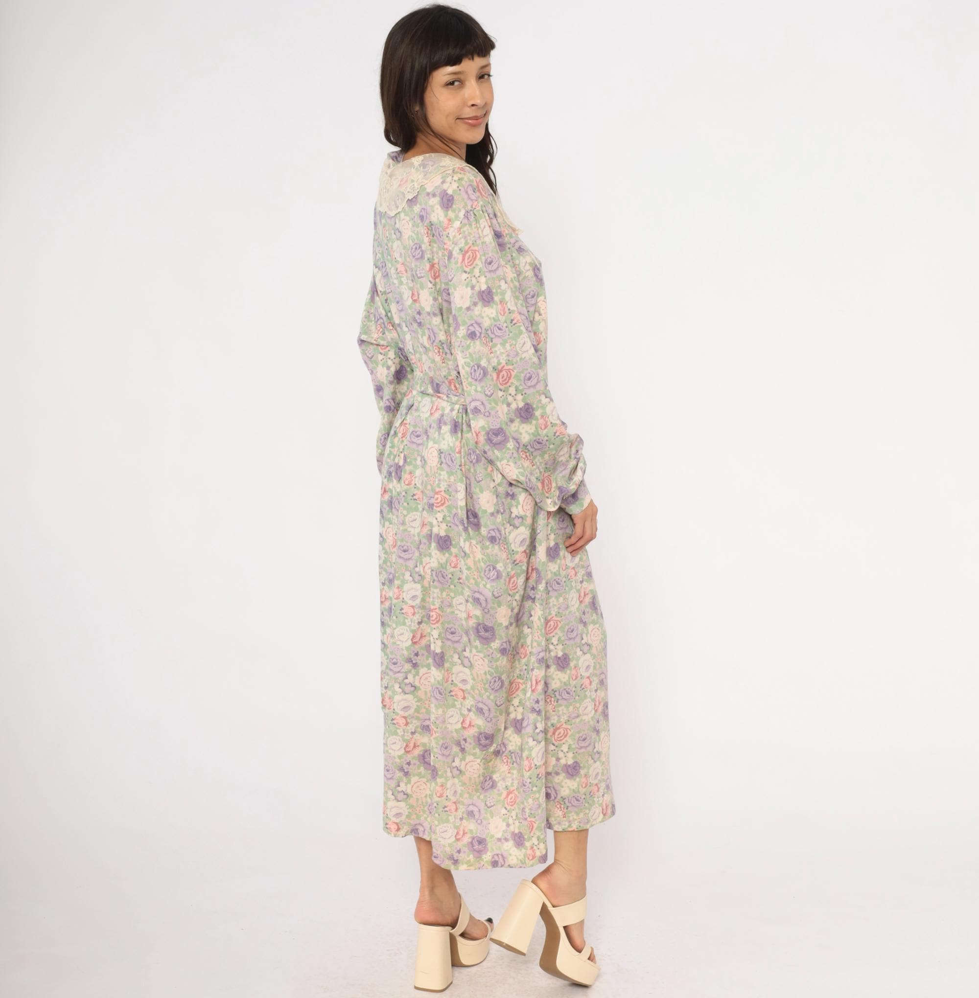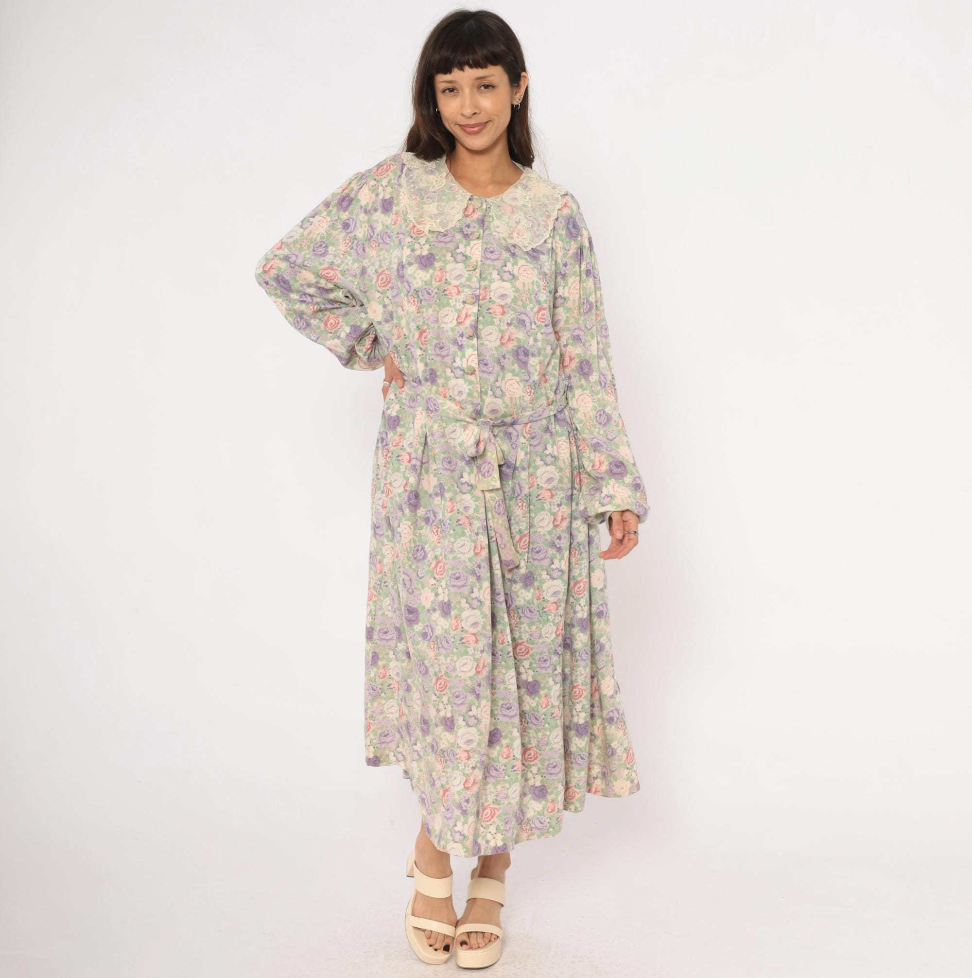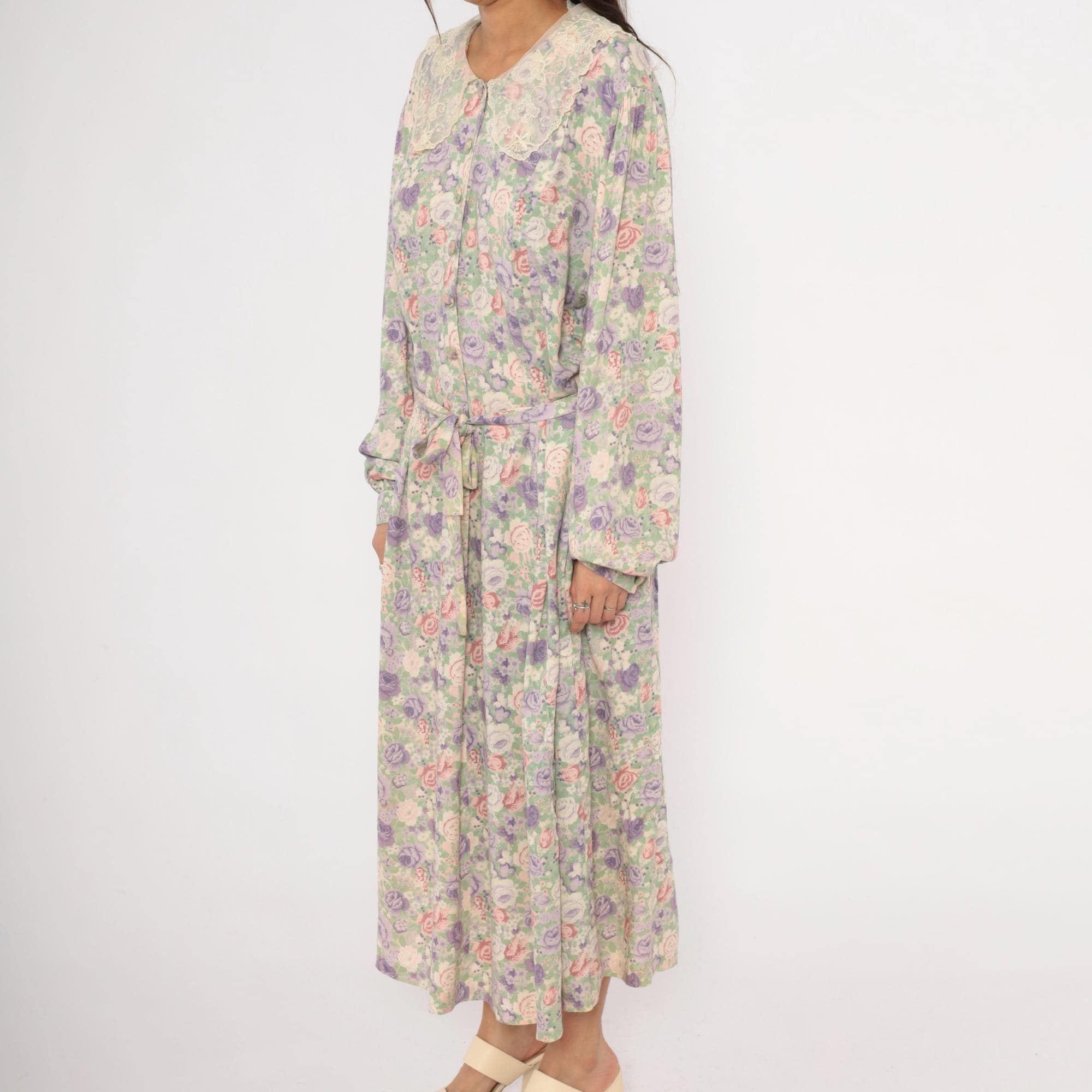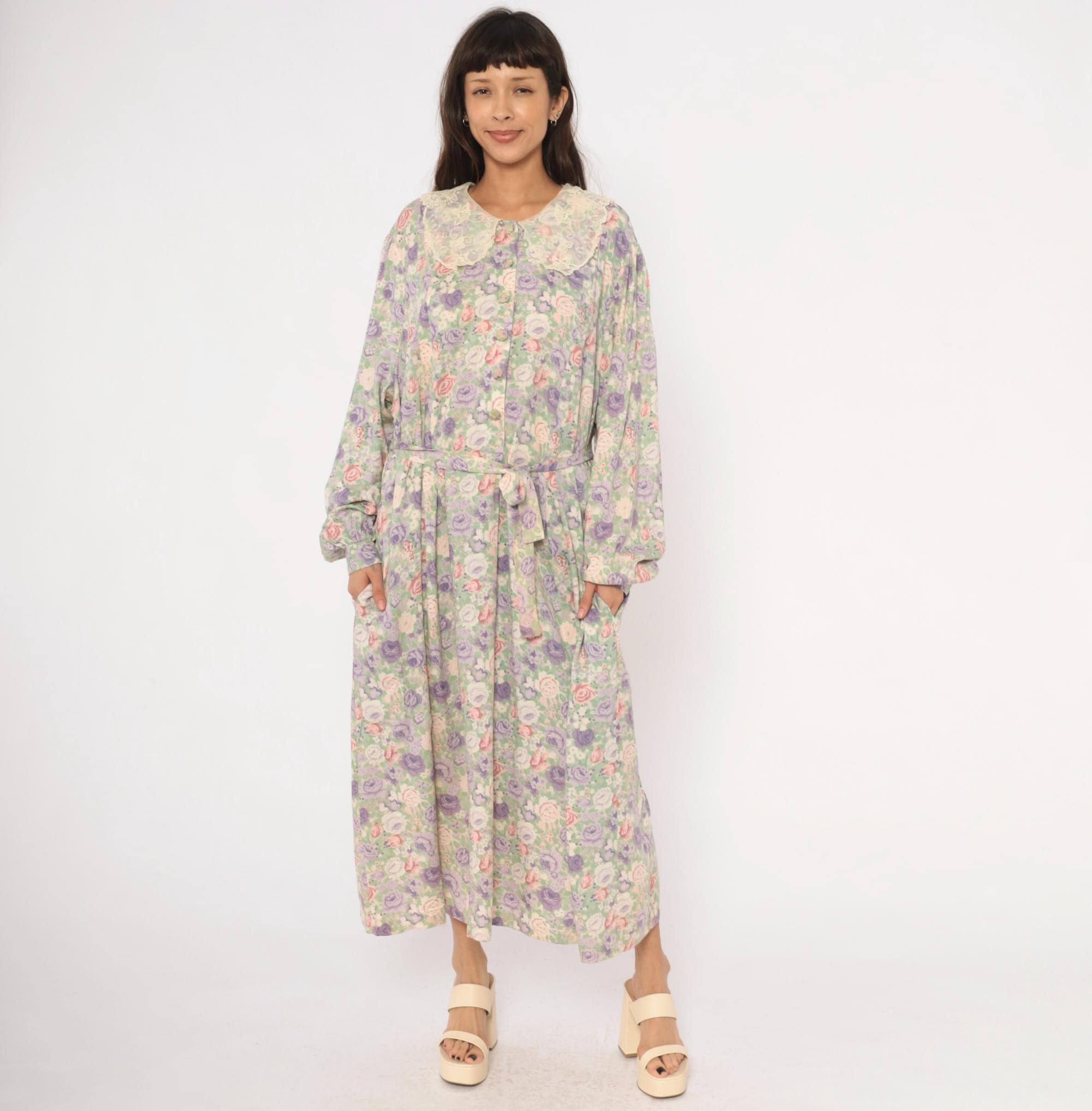 90s floral maxi dress from J Jill LTD with a large lace Peter Pan collar in cream and a full button front closure. Purple, pink, rose, and sage green flower print on a cream ground, with long gathered sleeves finished in ruffled cuffs. Matching fabric belt ties at the natural waist, and side seam pockets sit at the hips. Dropped waist seam with a gathered, flowing skirt below.