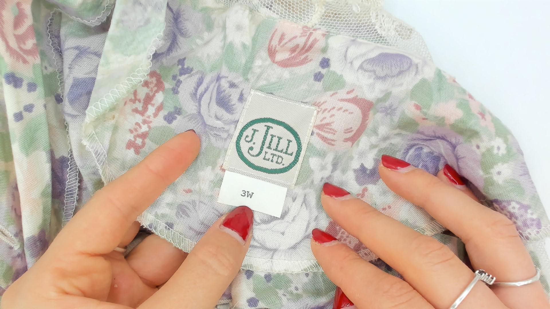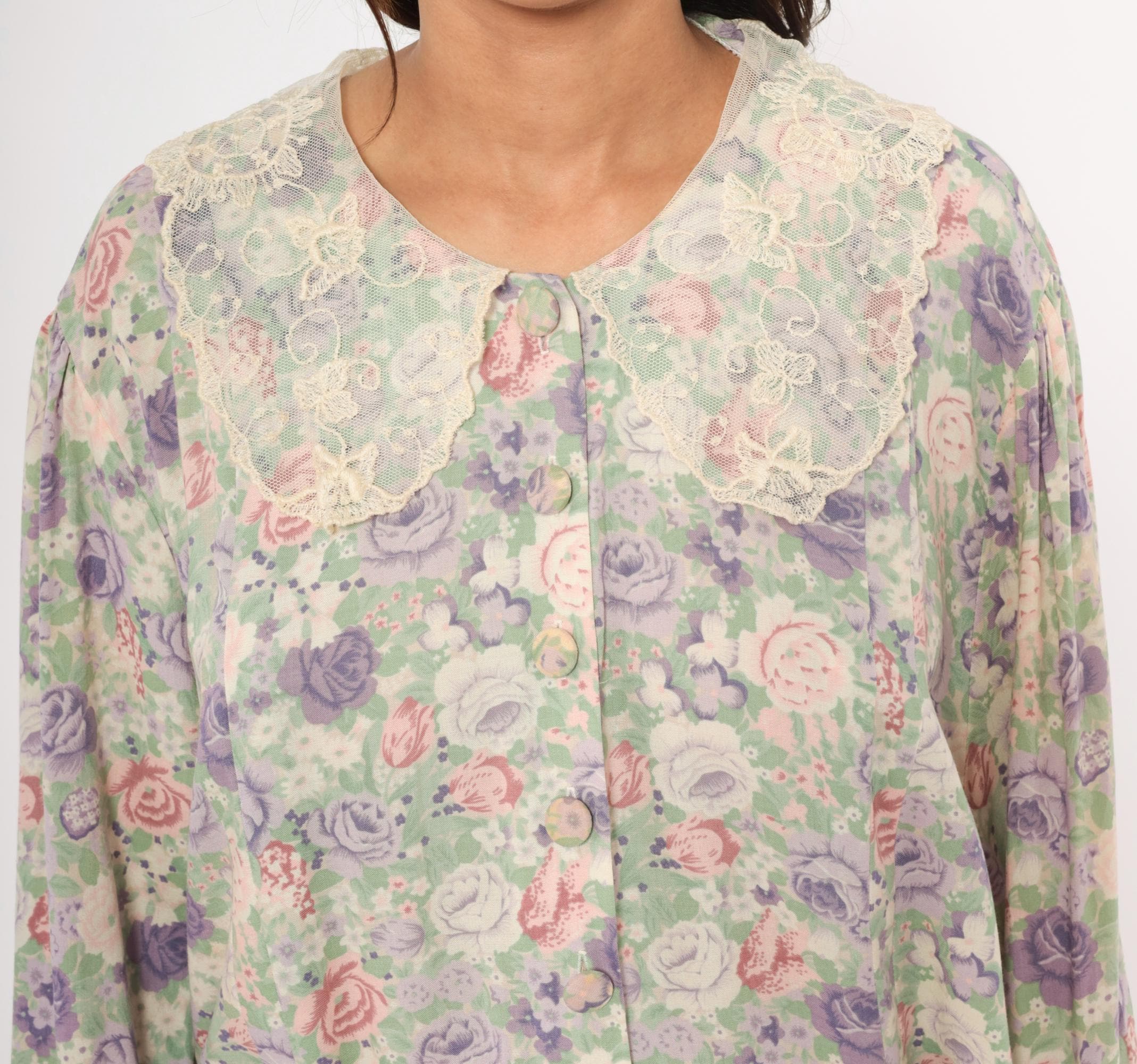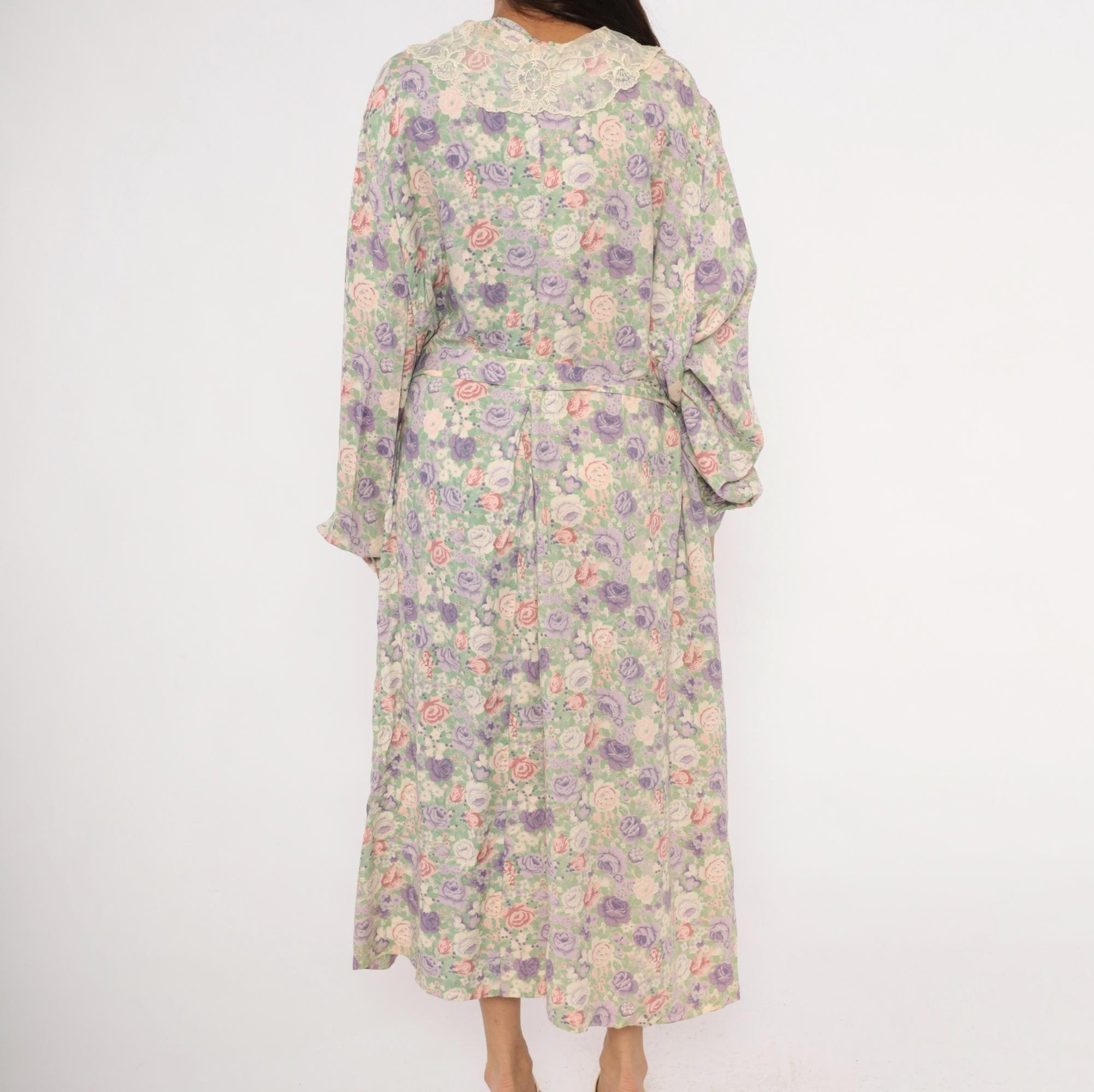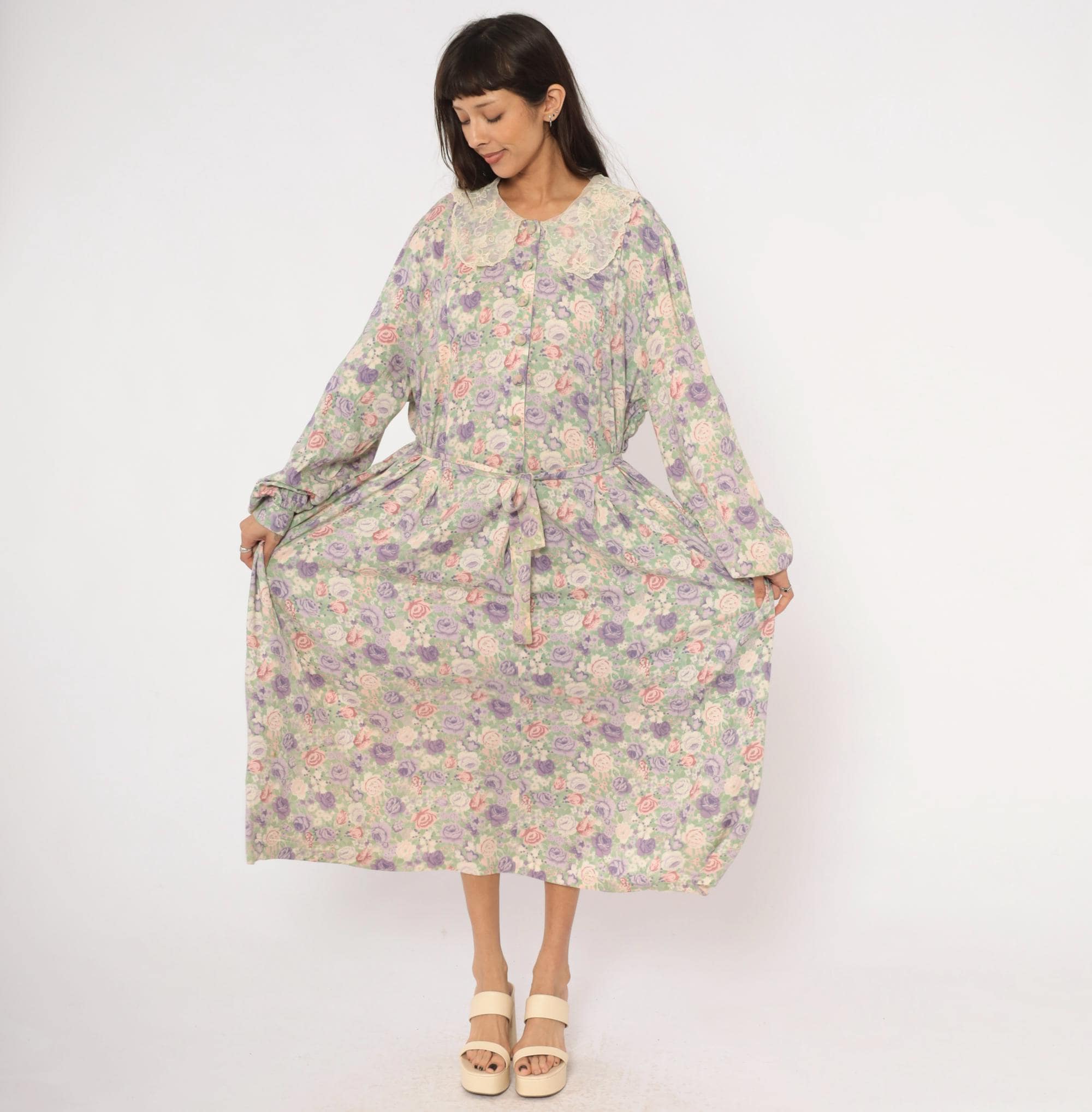 90s floral maxi dress from J Jill LTD with a large lace Peter Pan collar in cream and a full button front closure. Purple, pink, rose, and sage green flower print on a cream ground, with long gathered sleeves finished in ruffled cuffs. Matching fabric belt ties at the natural waist, and side seam pockets sit at the hips. Dropped waist seam with a gathered, flowing skirt below.