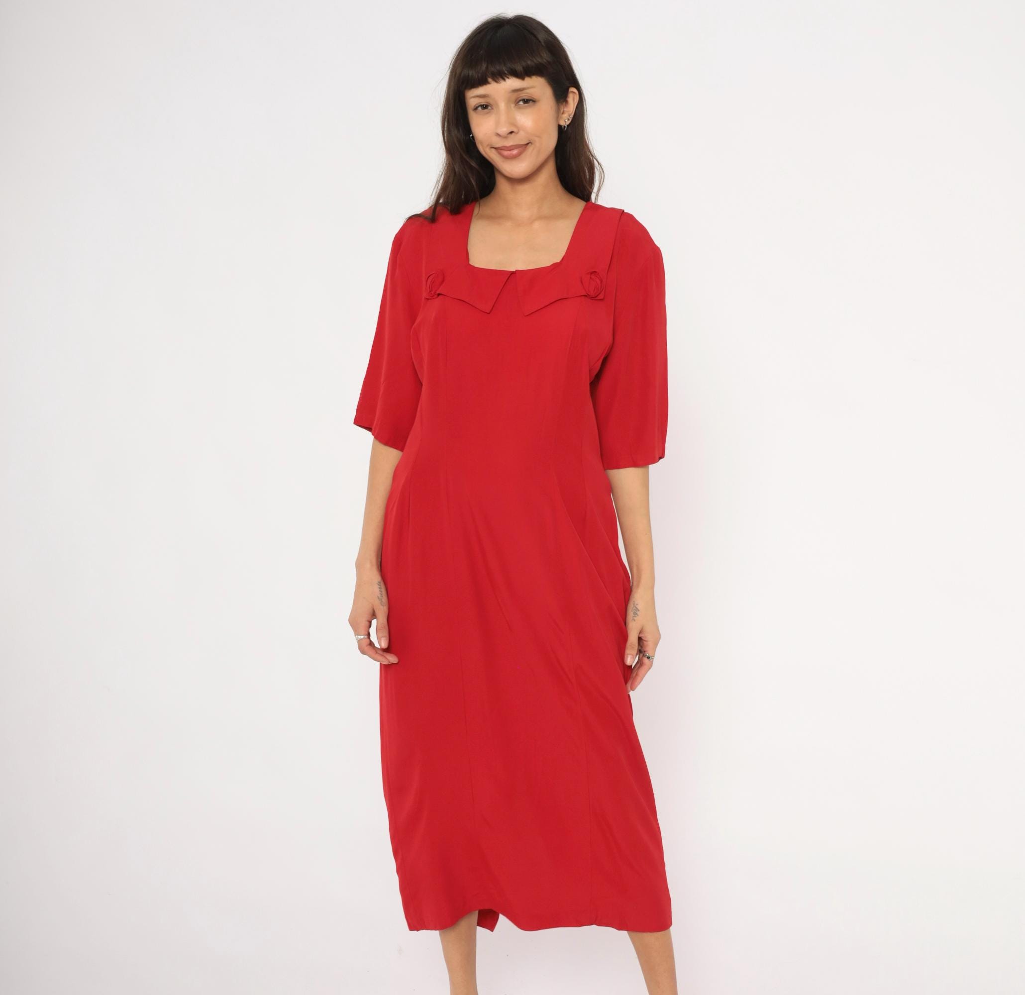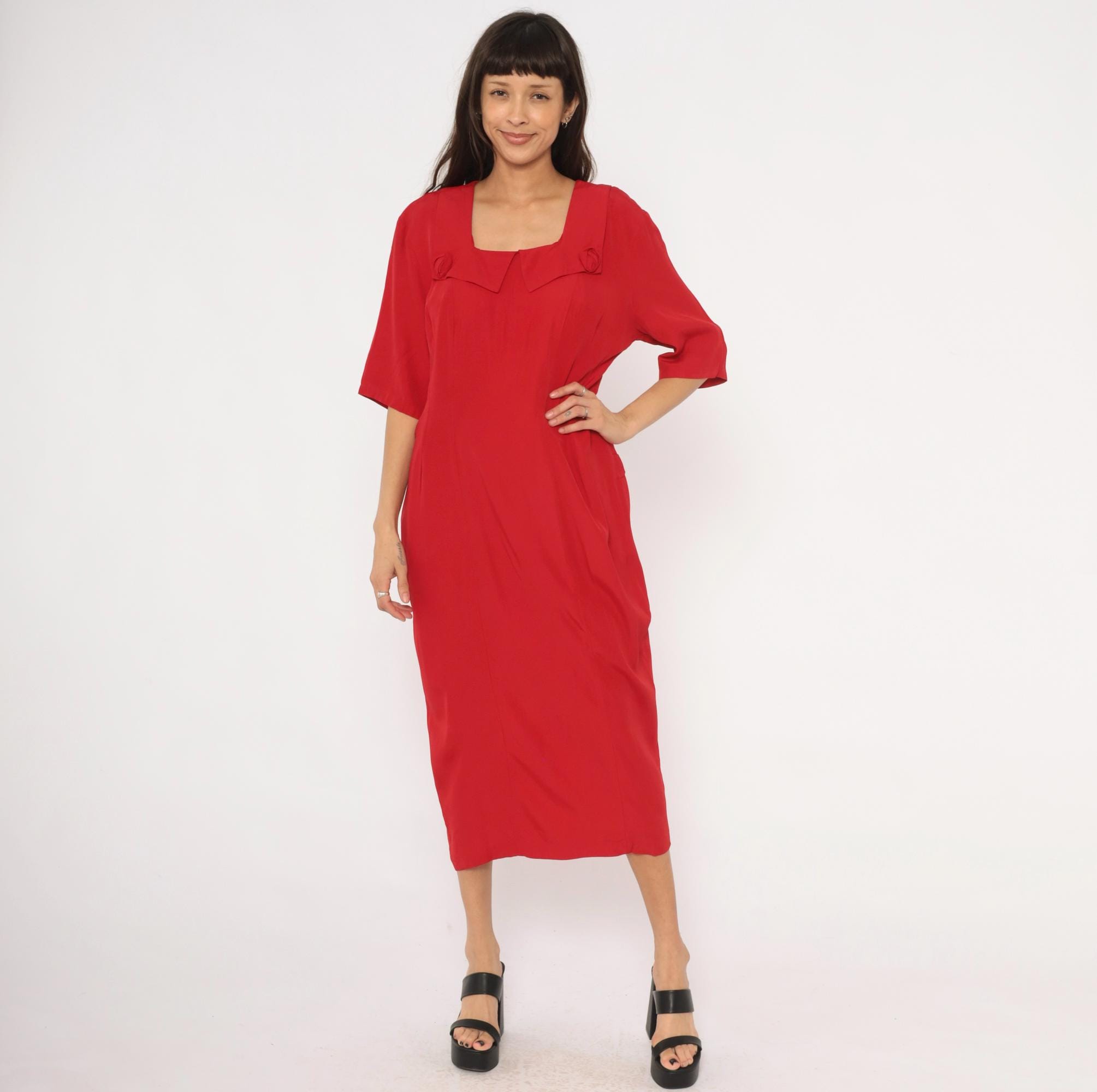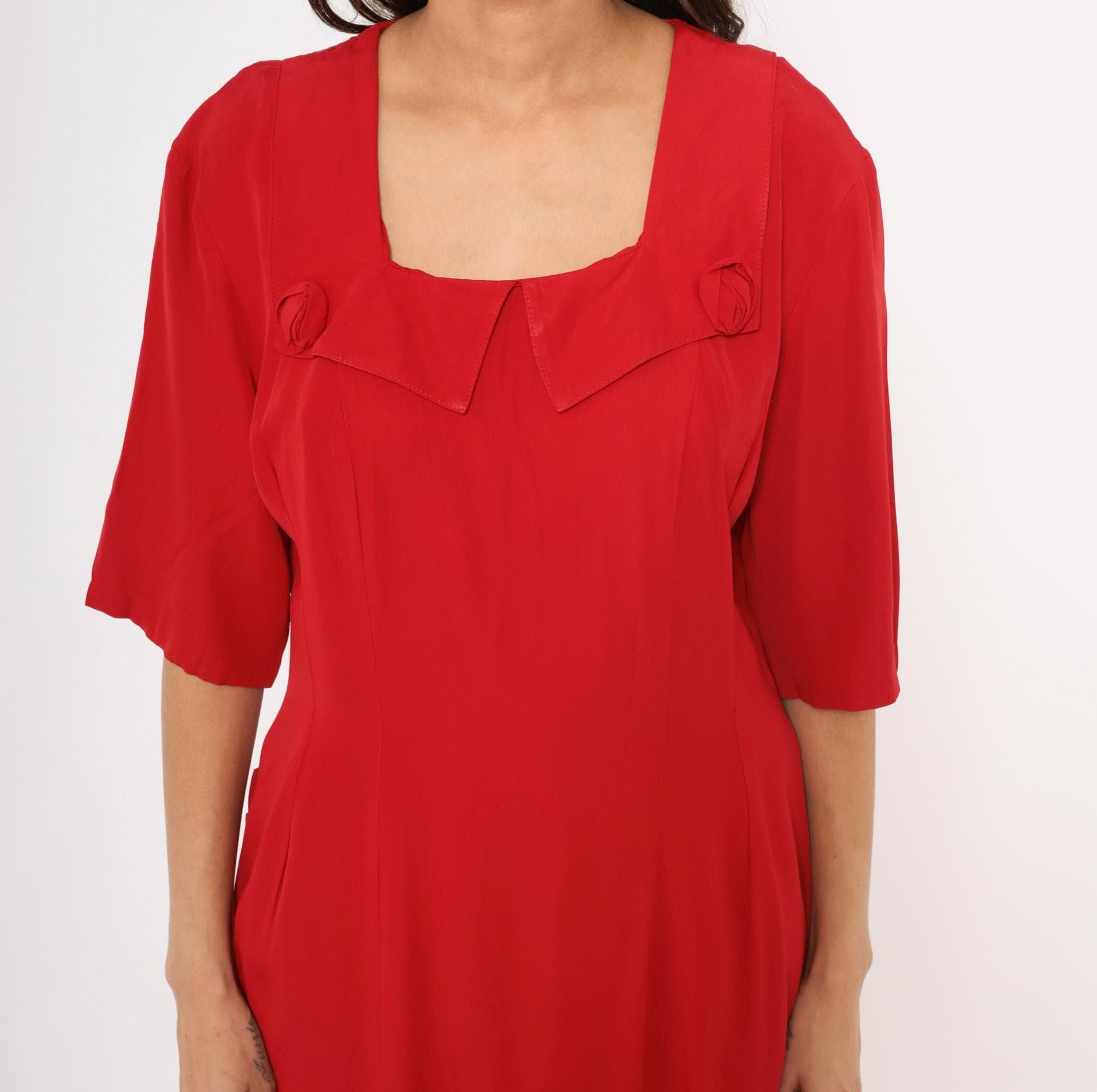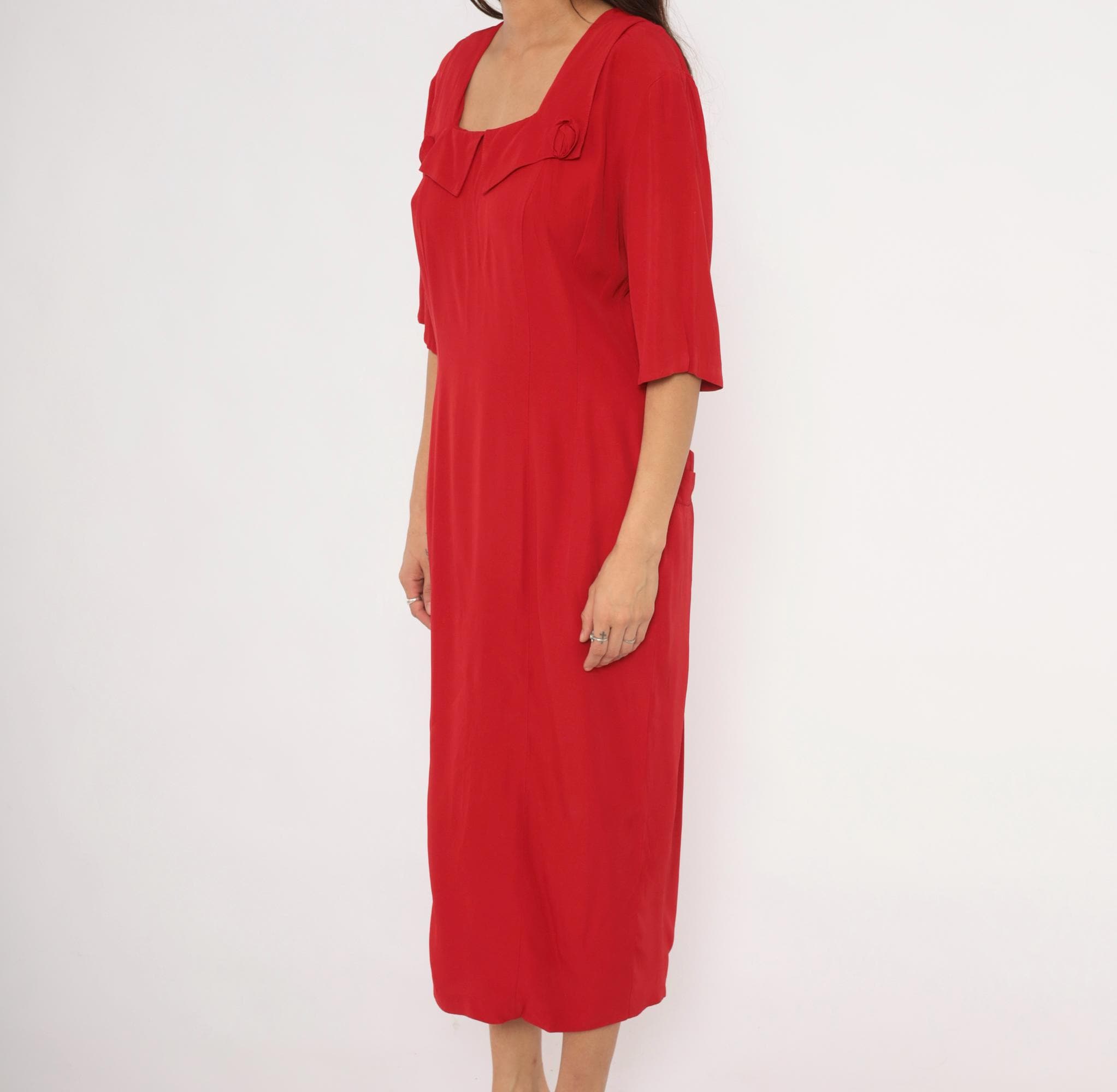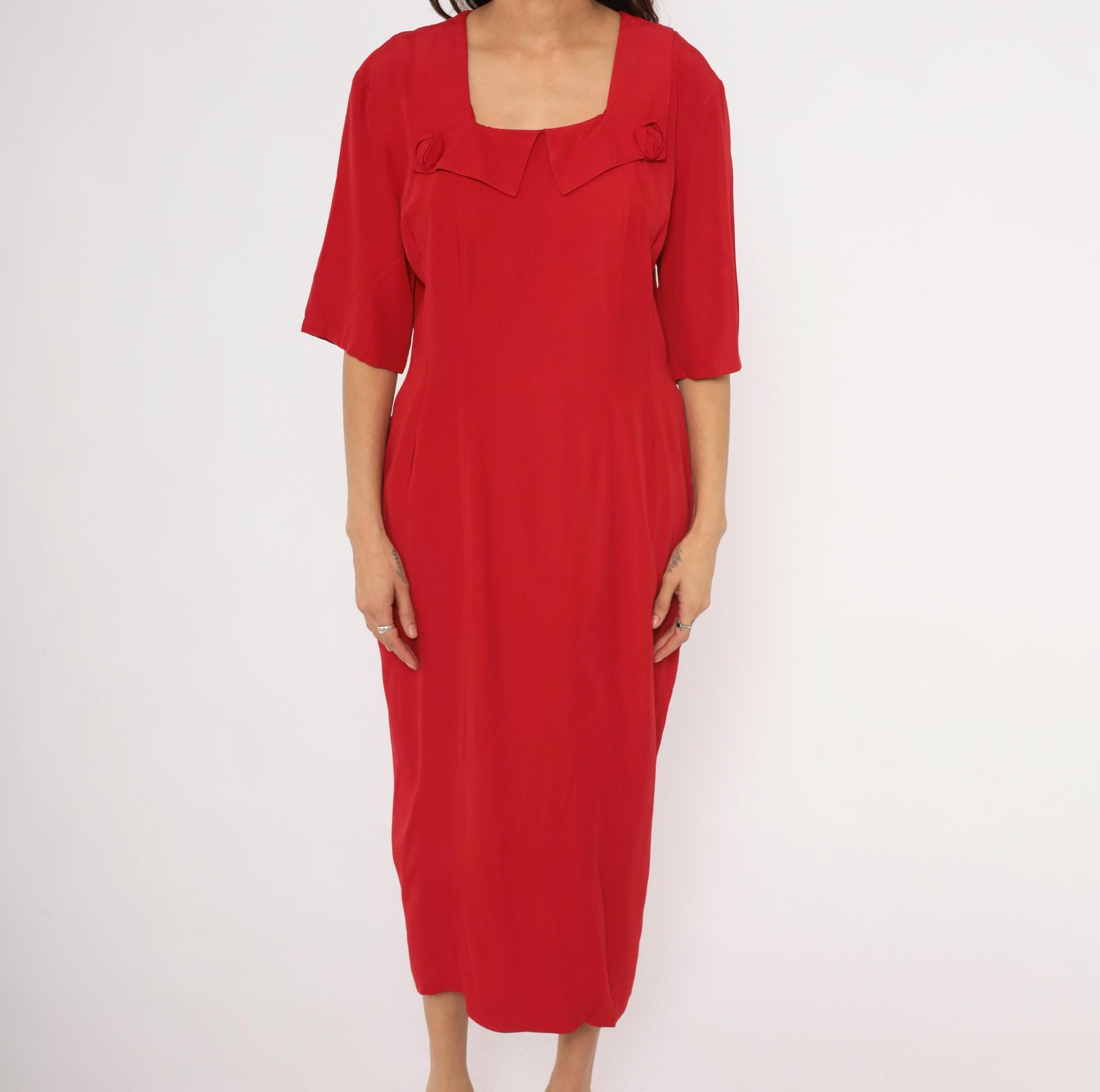 90s crimson midi dress from Atina with a square neckline and decorative rosette accents at the chest and lower back waist. Half-length sleeves with a straight column silhouette, back zipper closure, and a pointed overlay panel at the neckline. The back waist has a horizontal band with two matching rosette details and soft pleating below.