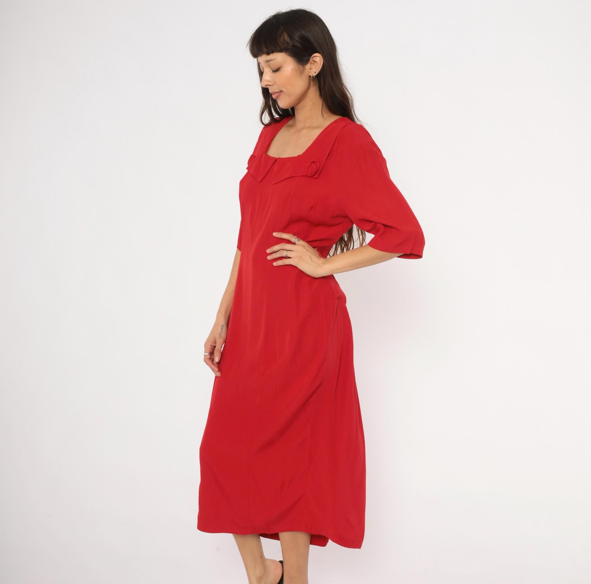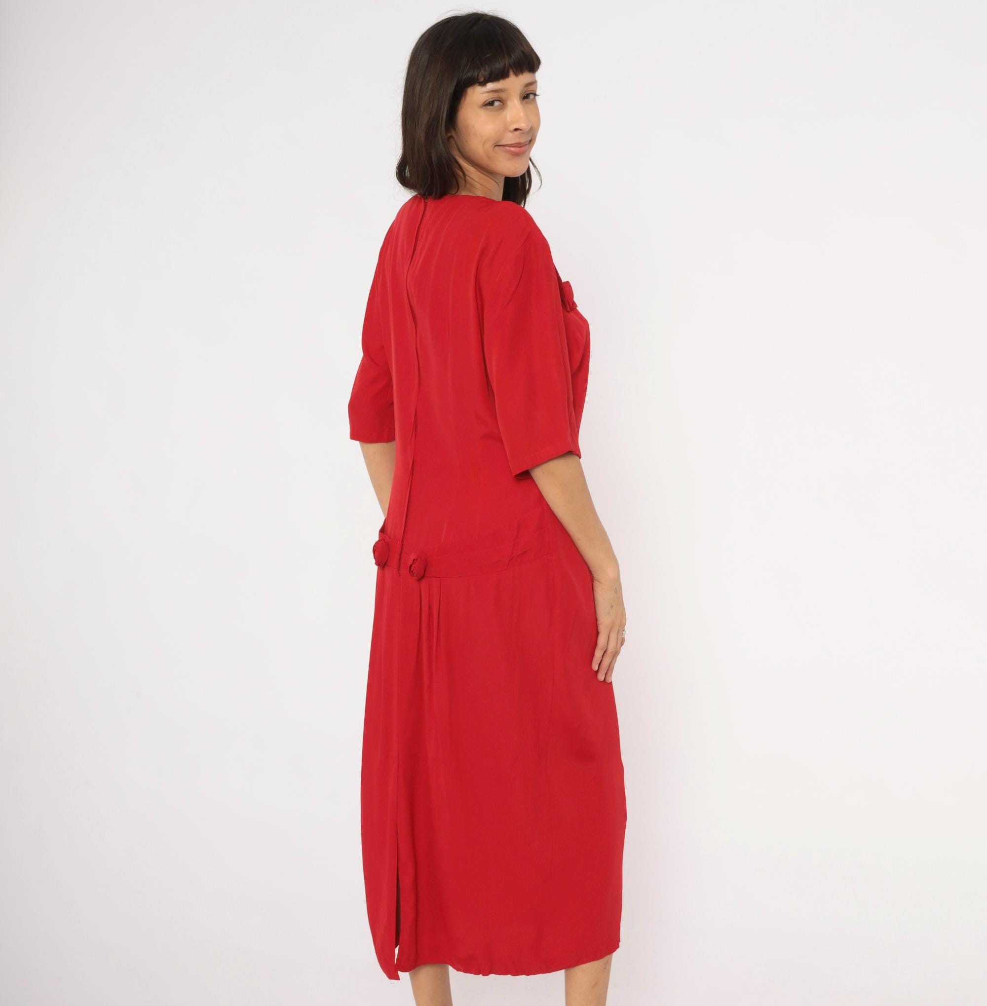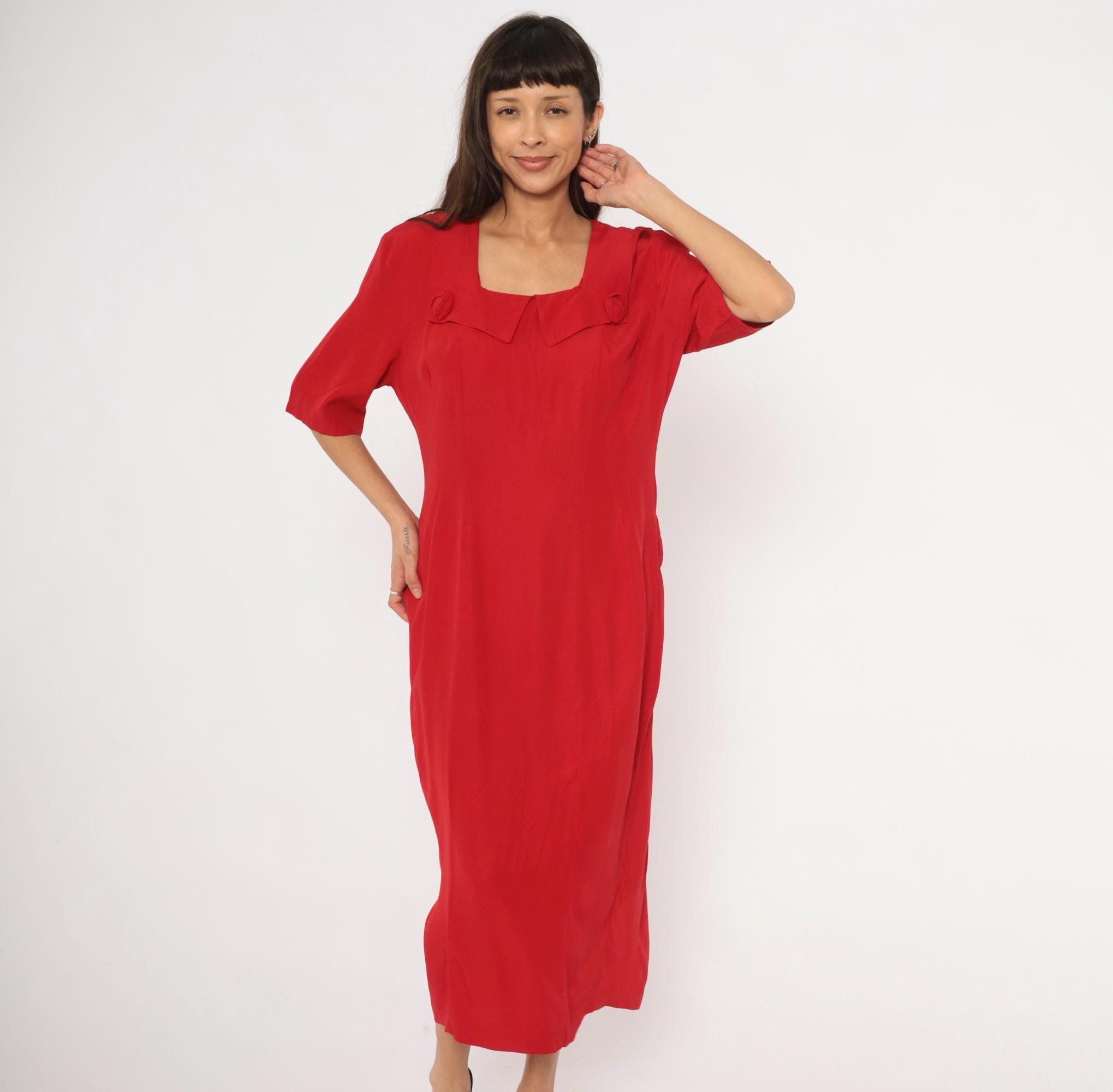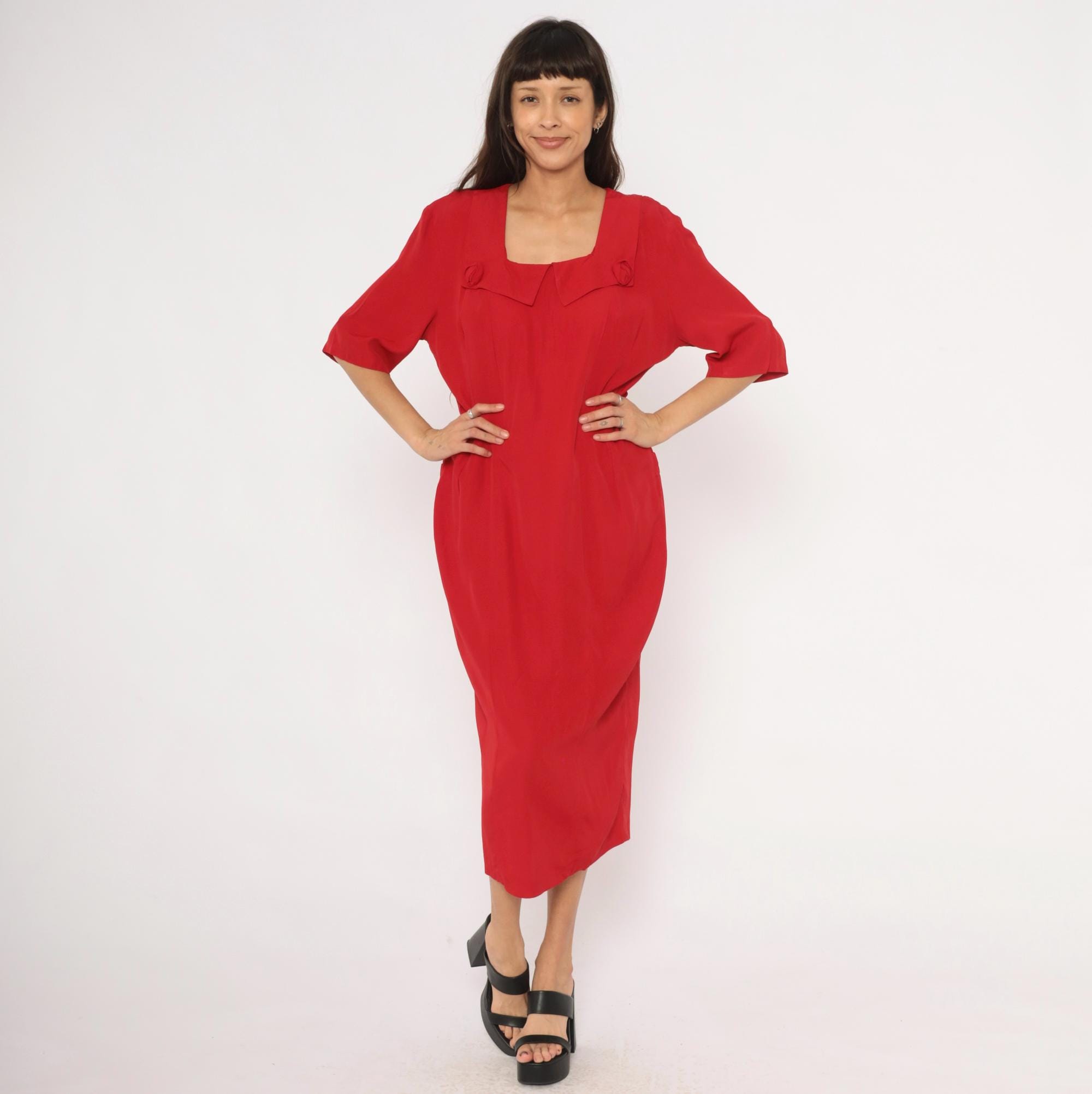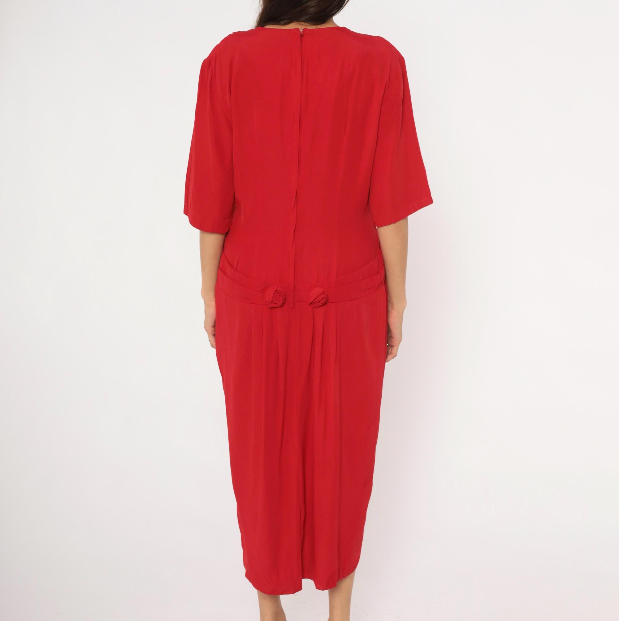 90s crimson midi dress from Atina with a square neckline and decorative rosette accents at the chest and lower back waist. Half-length sleeves with a straight column silhouette, back zipper closure, and a pointed overlay panel at the neckline. The back waist has a horizontal band with two matching rosette details and soft pleating below.